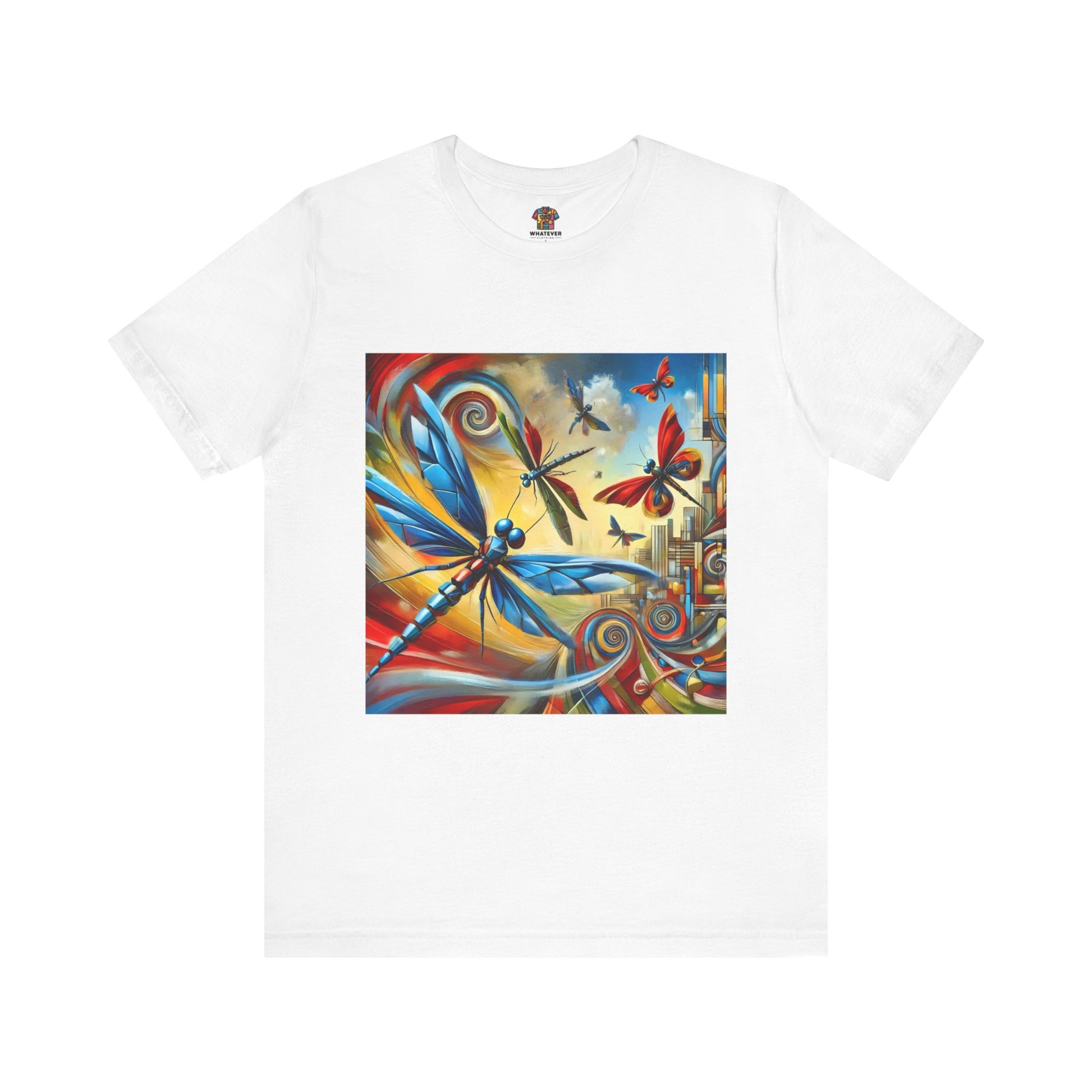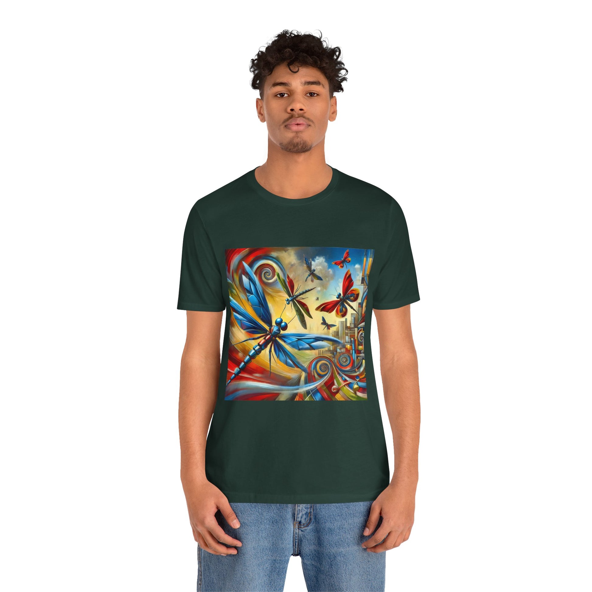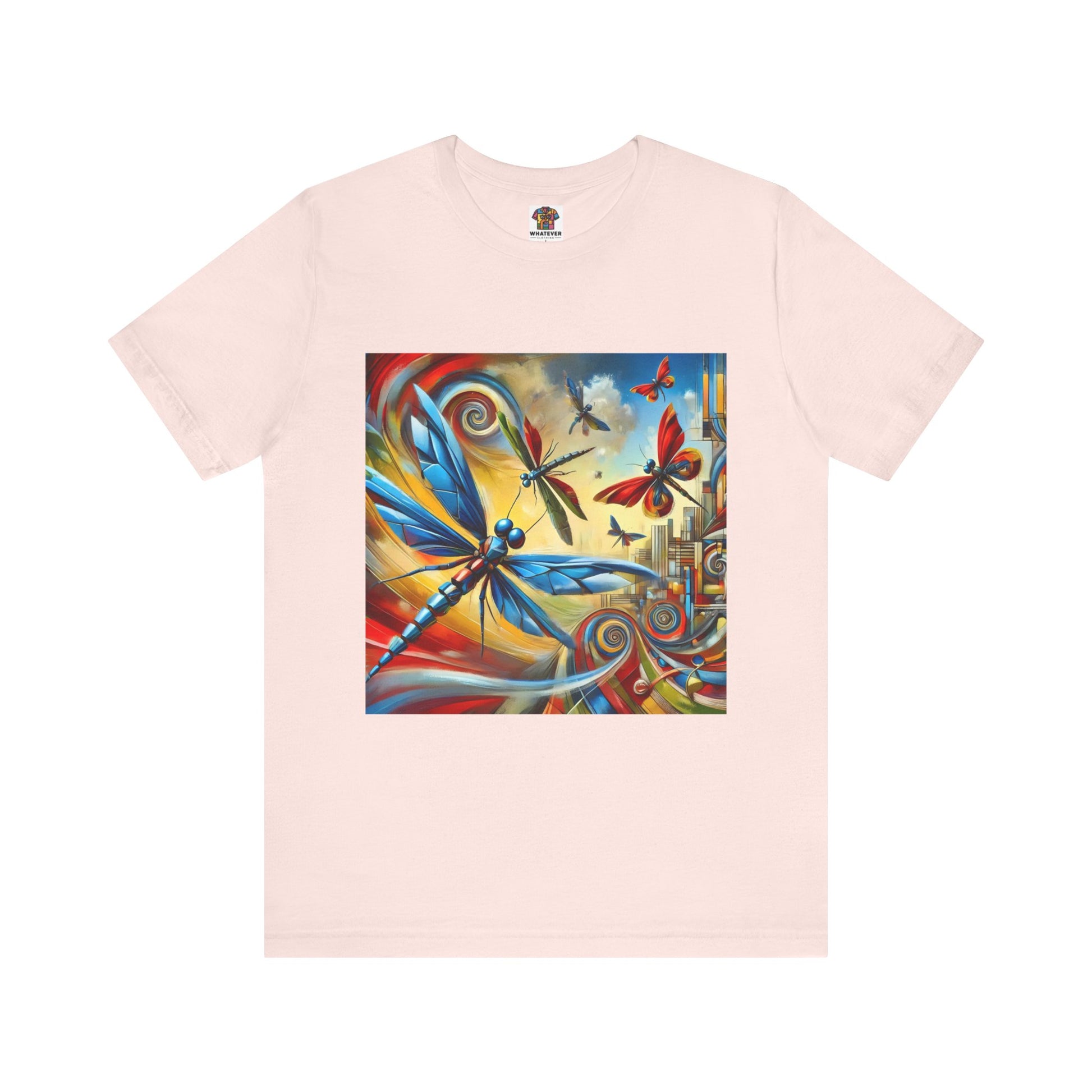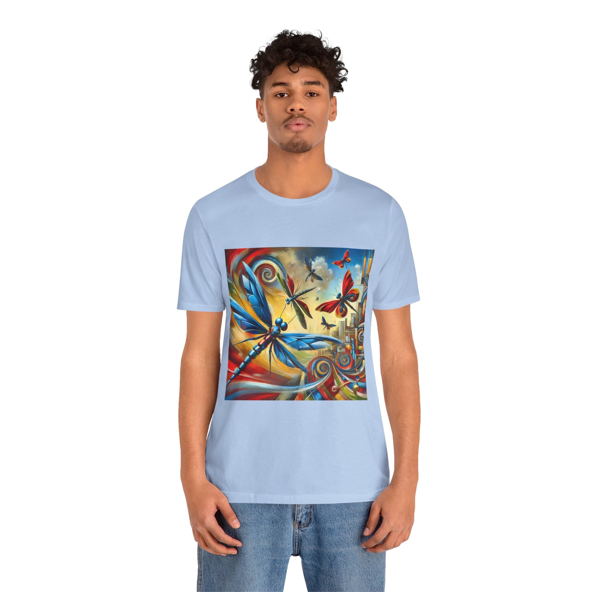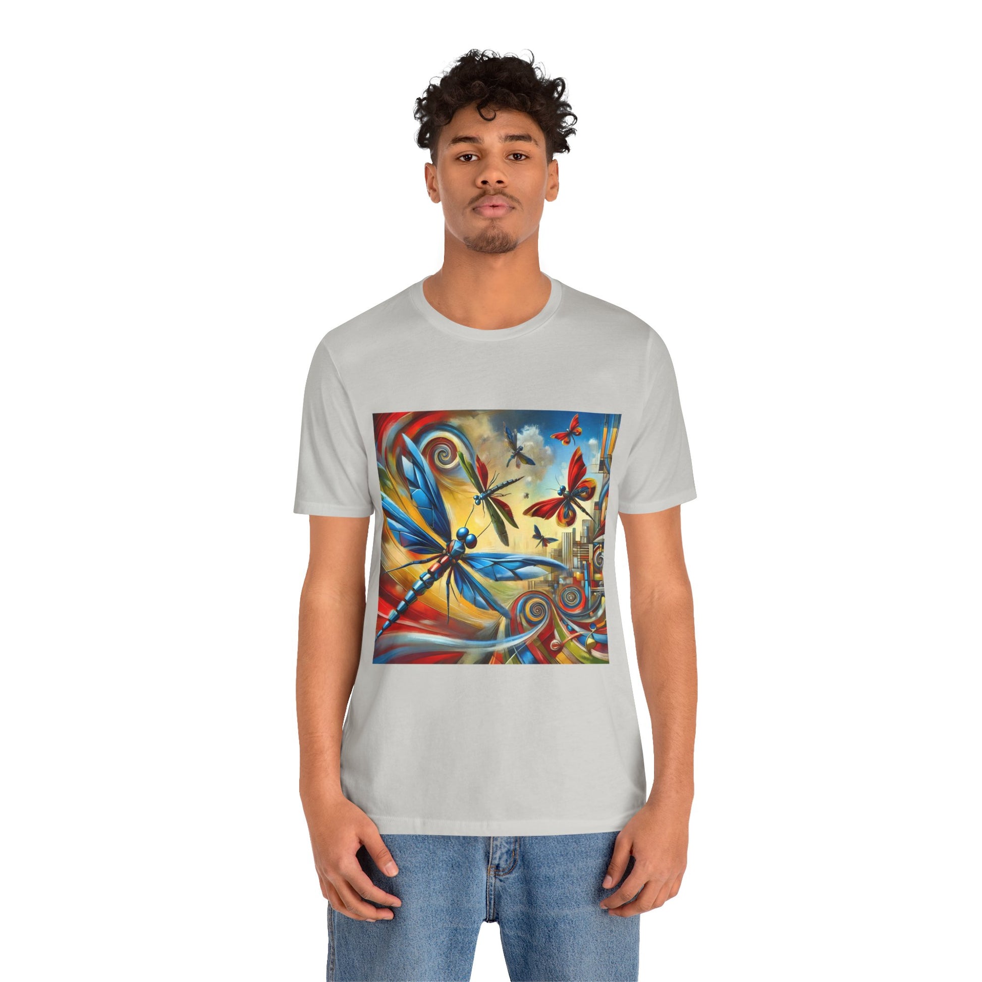 Stylized dragonflies and butterflies with angular, mechanical wings flying through a vibrant cityscape, merging organic and mechanical elements.