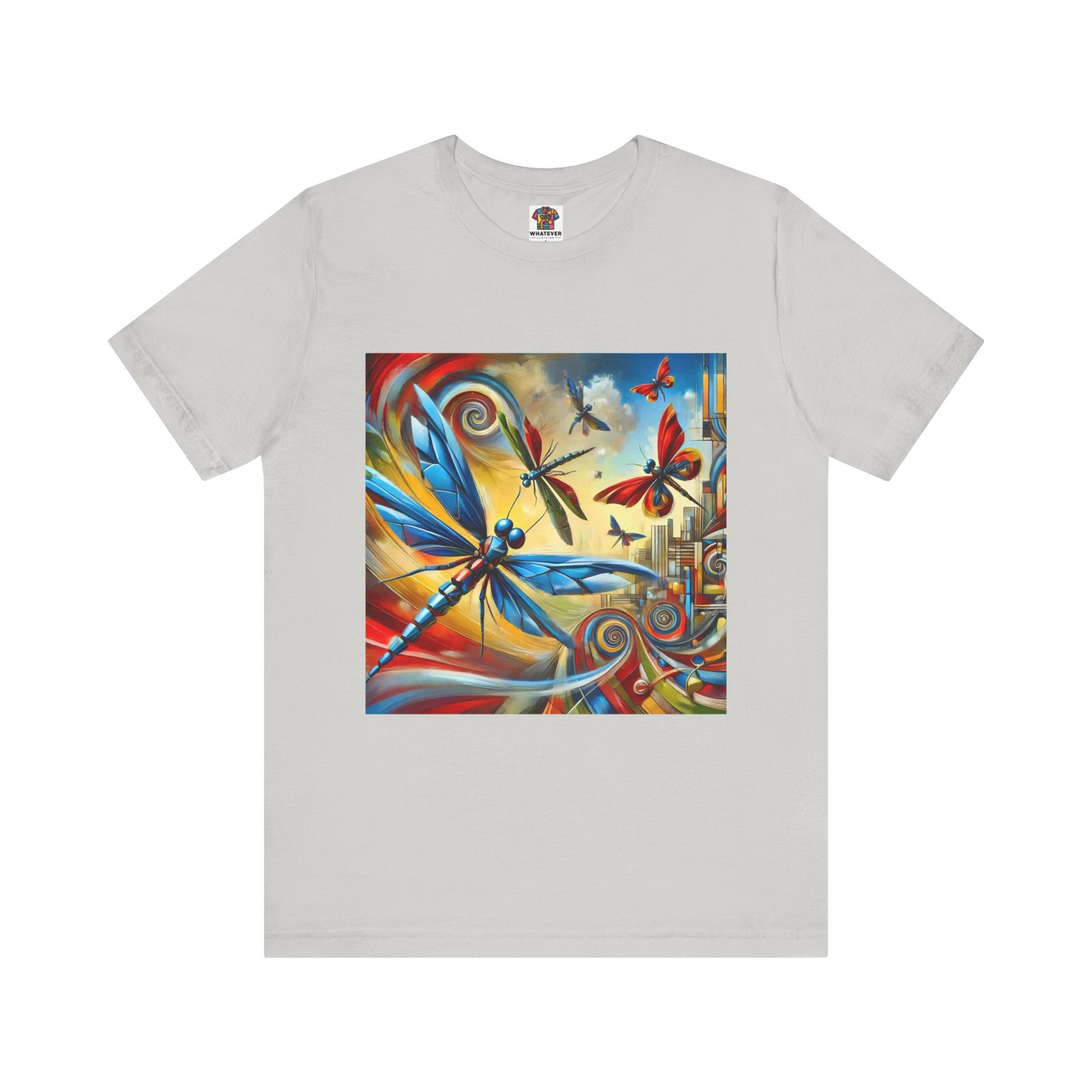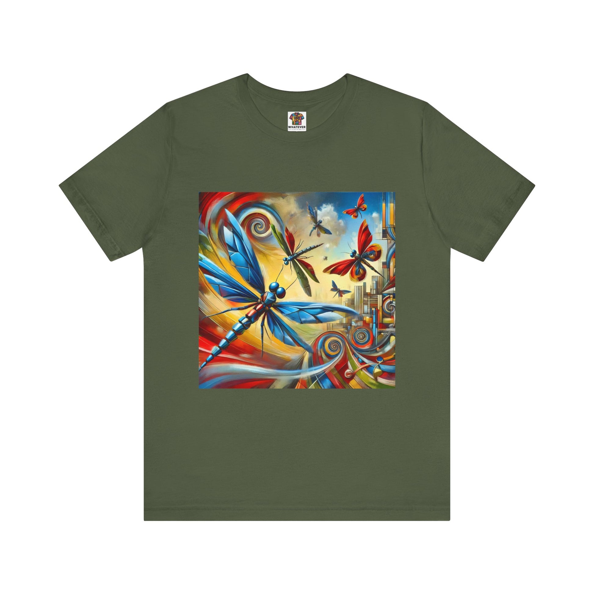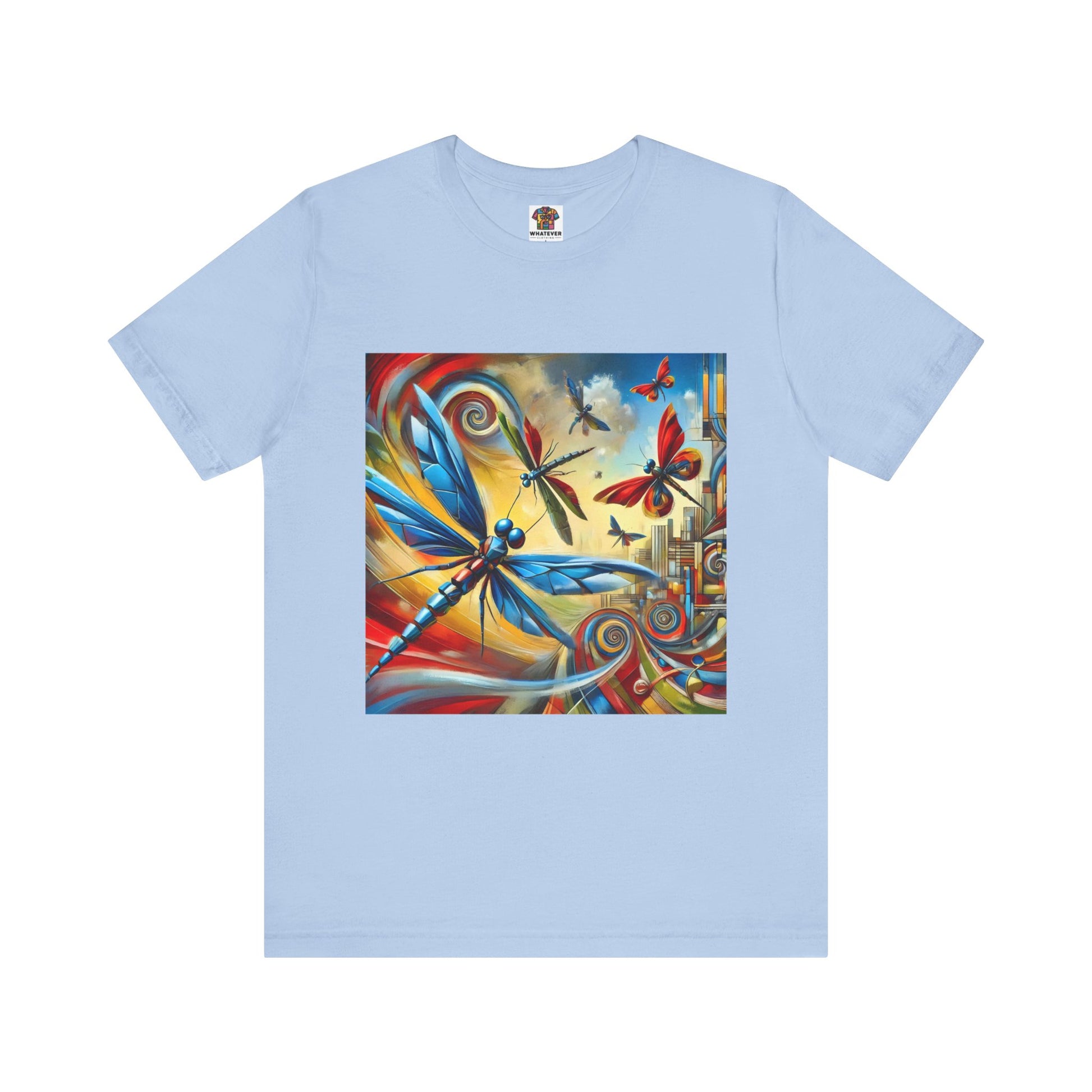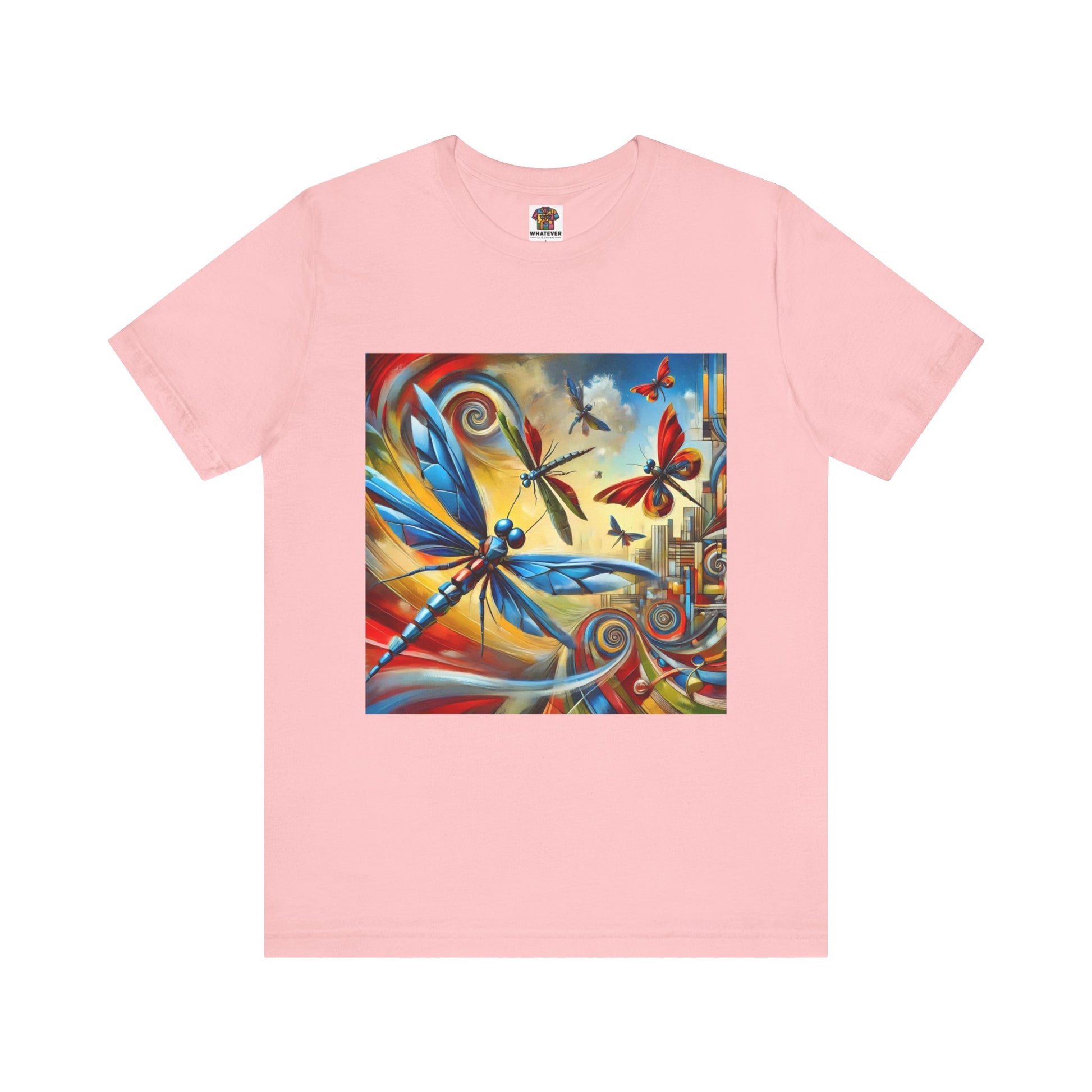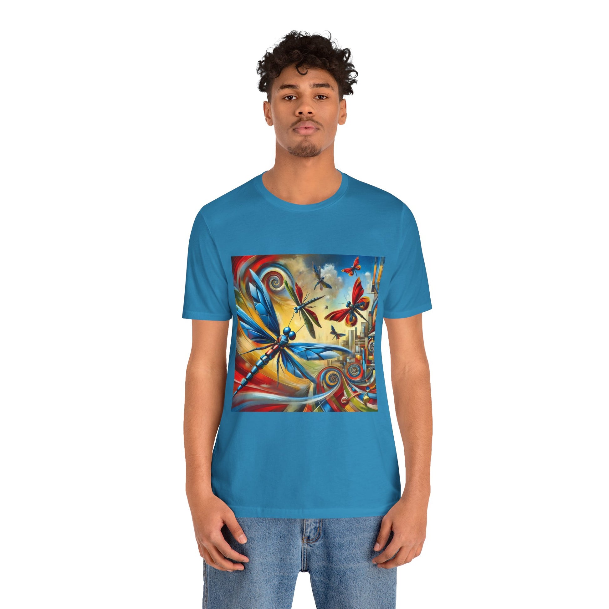 Stylized dragonflies and butterflies with angular, mechanical wings flying through a vibrant cityscape, merging organic and mechanical elements.
