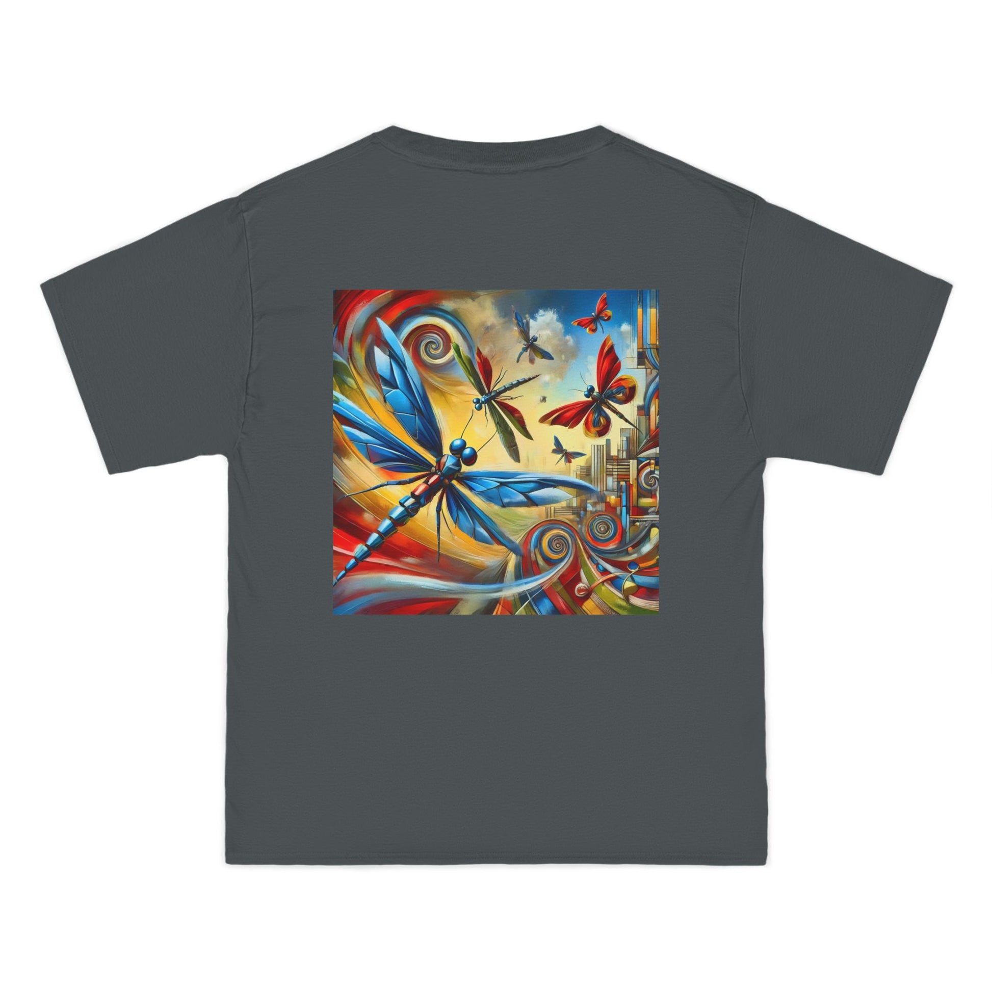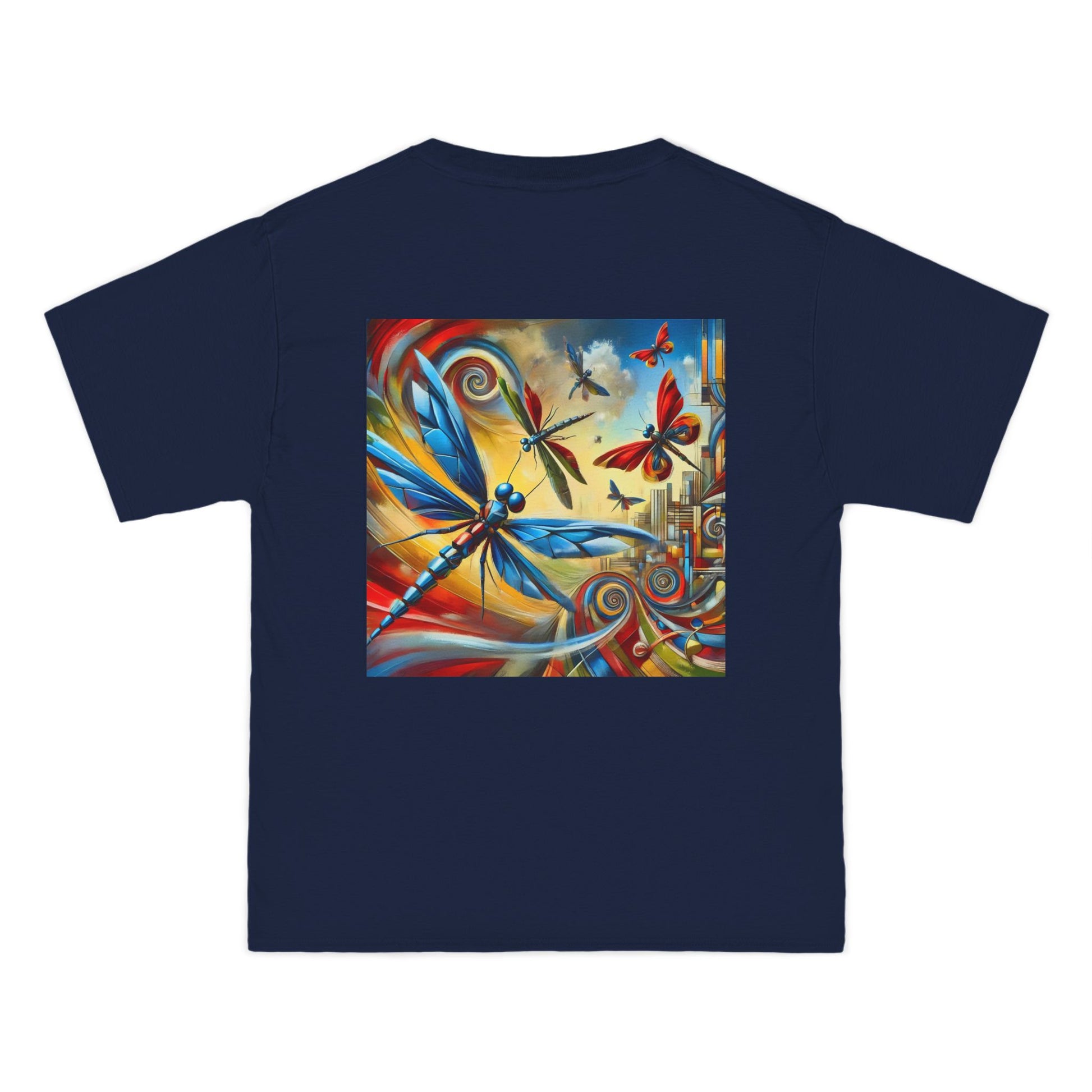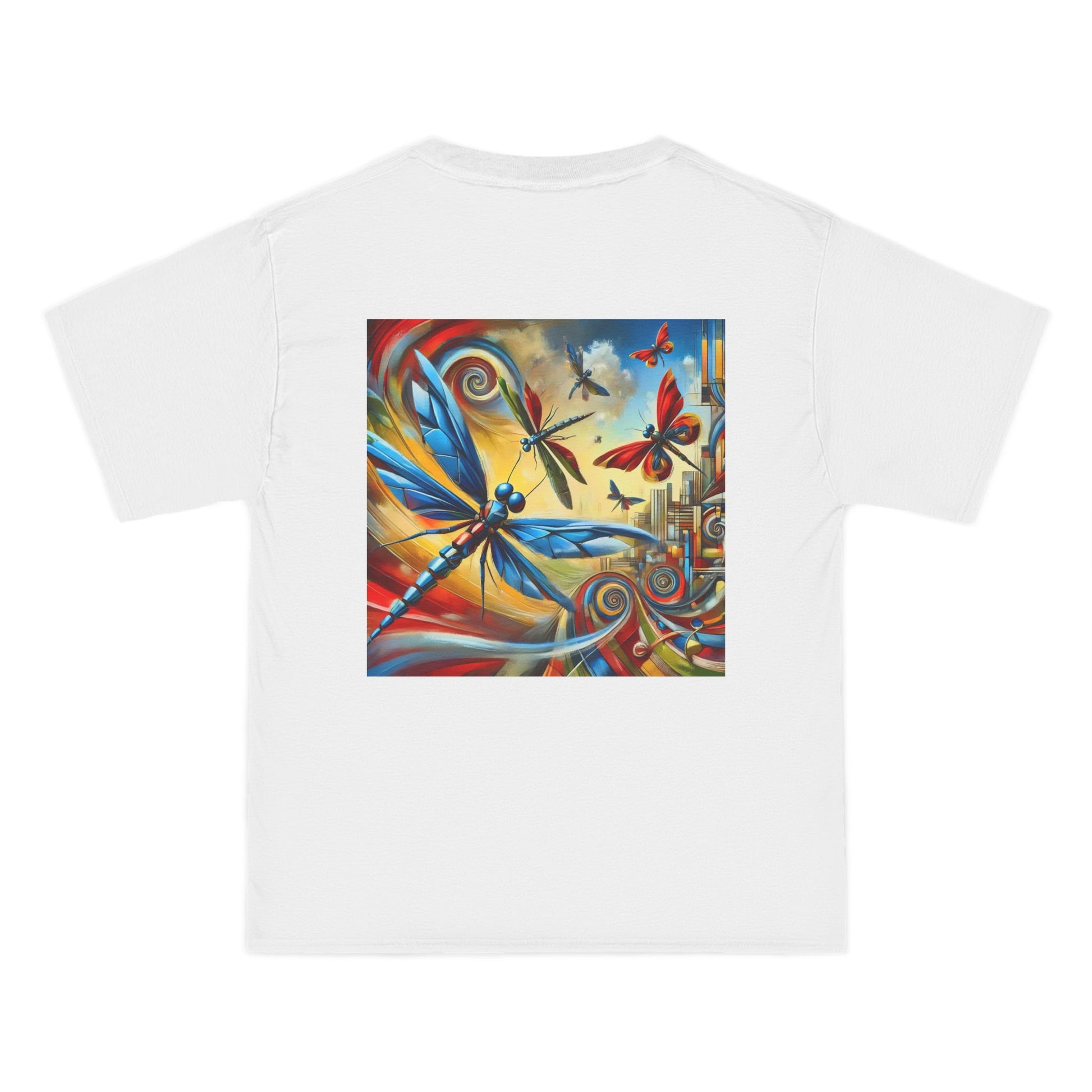Step into a world of wonder with our Mechanical Insects: Futurist Expressionism tee. This unique specimen from the Whatever Clothing collection, is your chance to 'Wear your World', and let your style soar. Crisp, stylized dragonflies and butterflies playfully flit across a vibrant cityscape backdrop, their angular, mechanical wings a testament to the seamless blend of organic and mechanical elements.