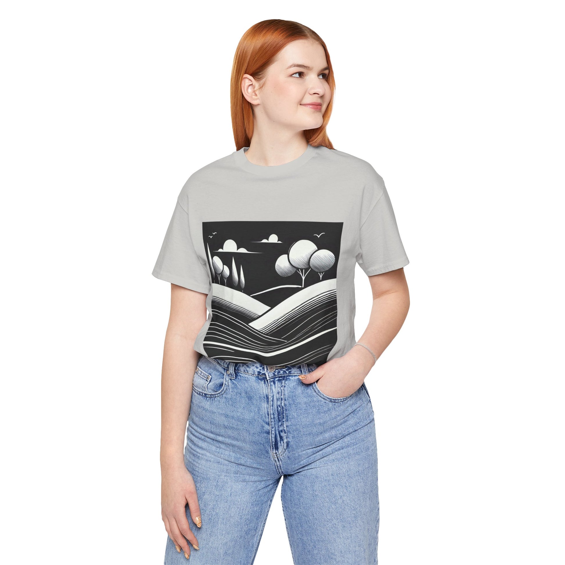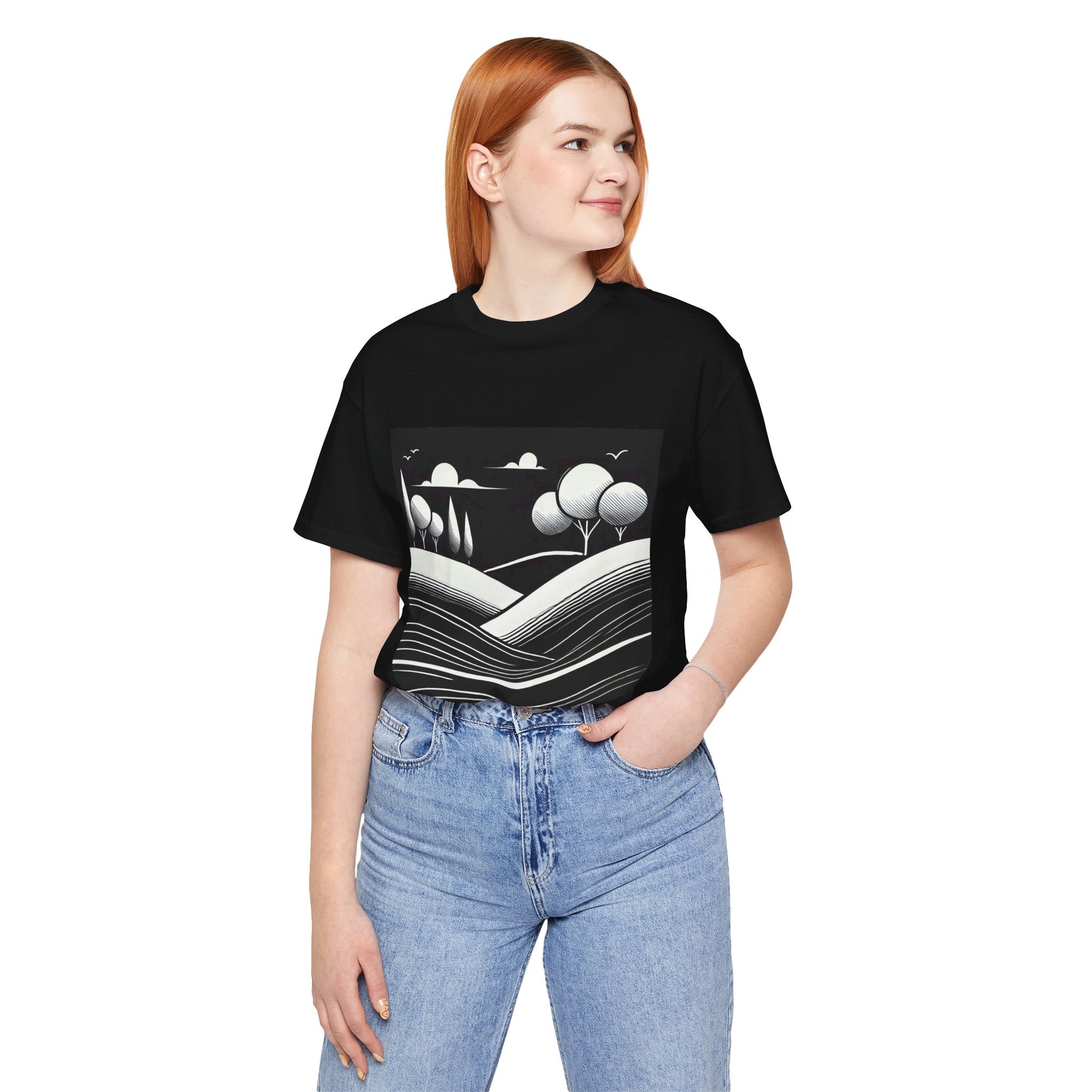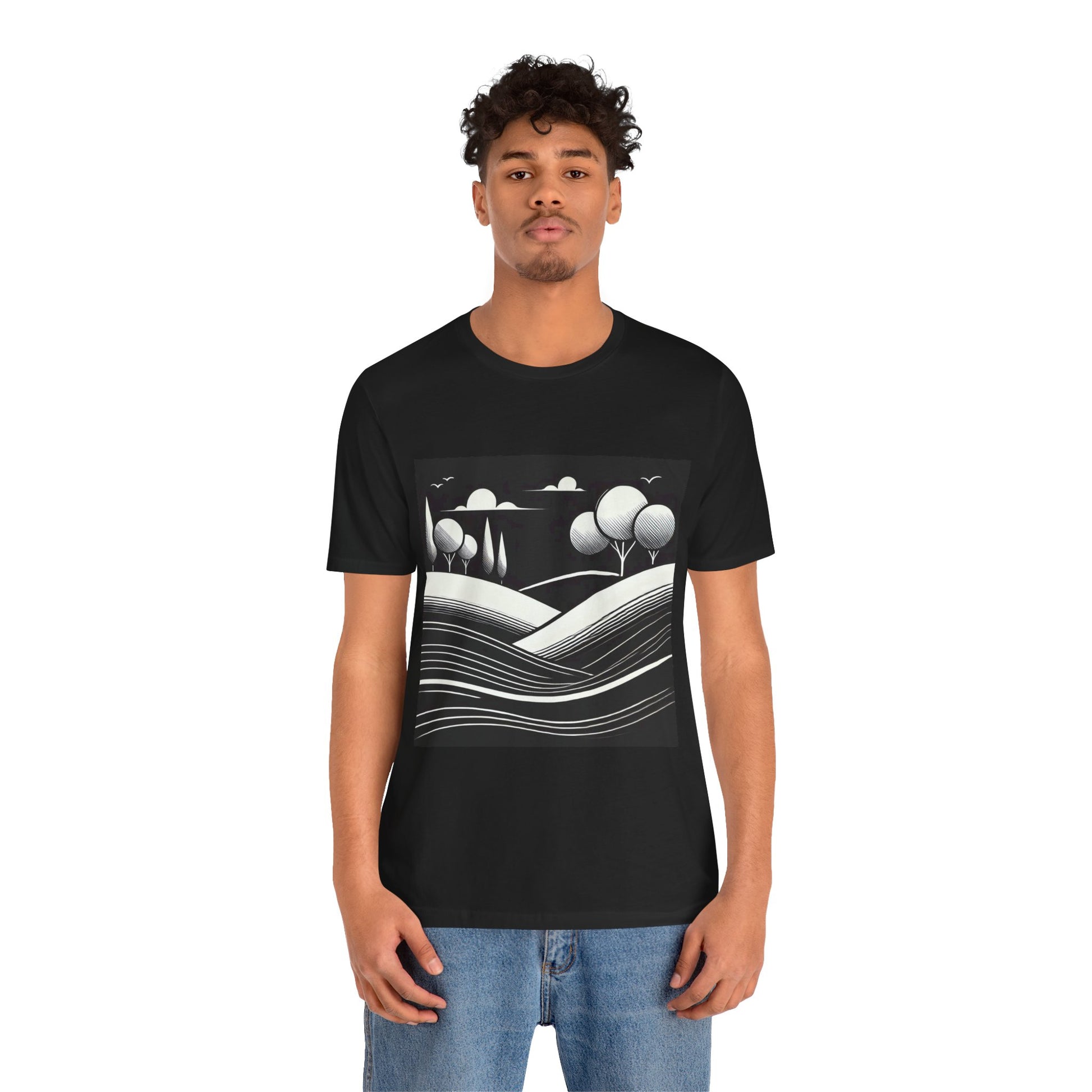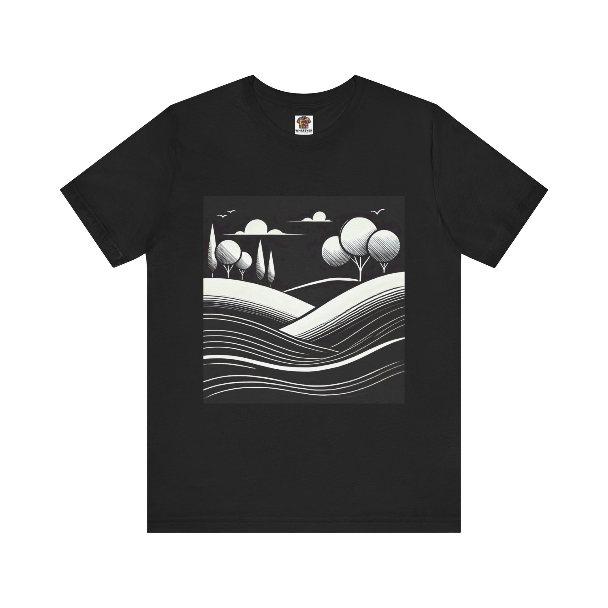 A minimalist landscape with rolling hills and stylized trees, featuring smooth lines in a high-contrast monochrome design.