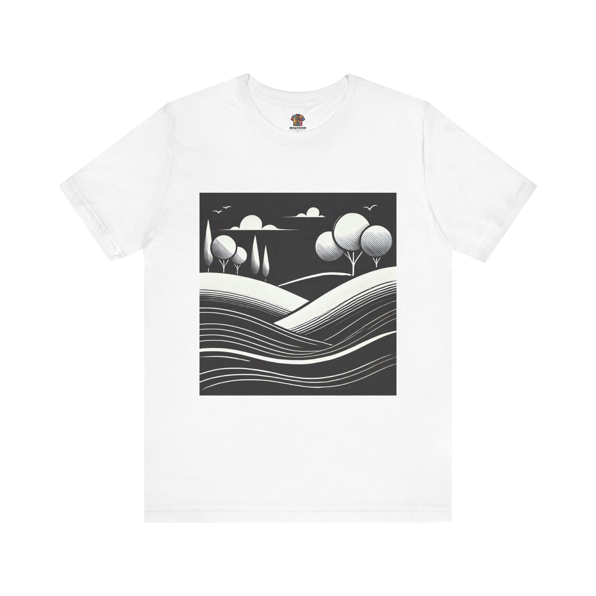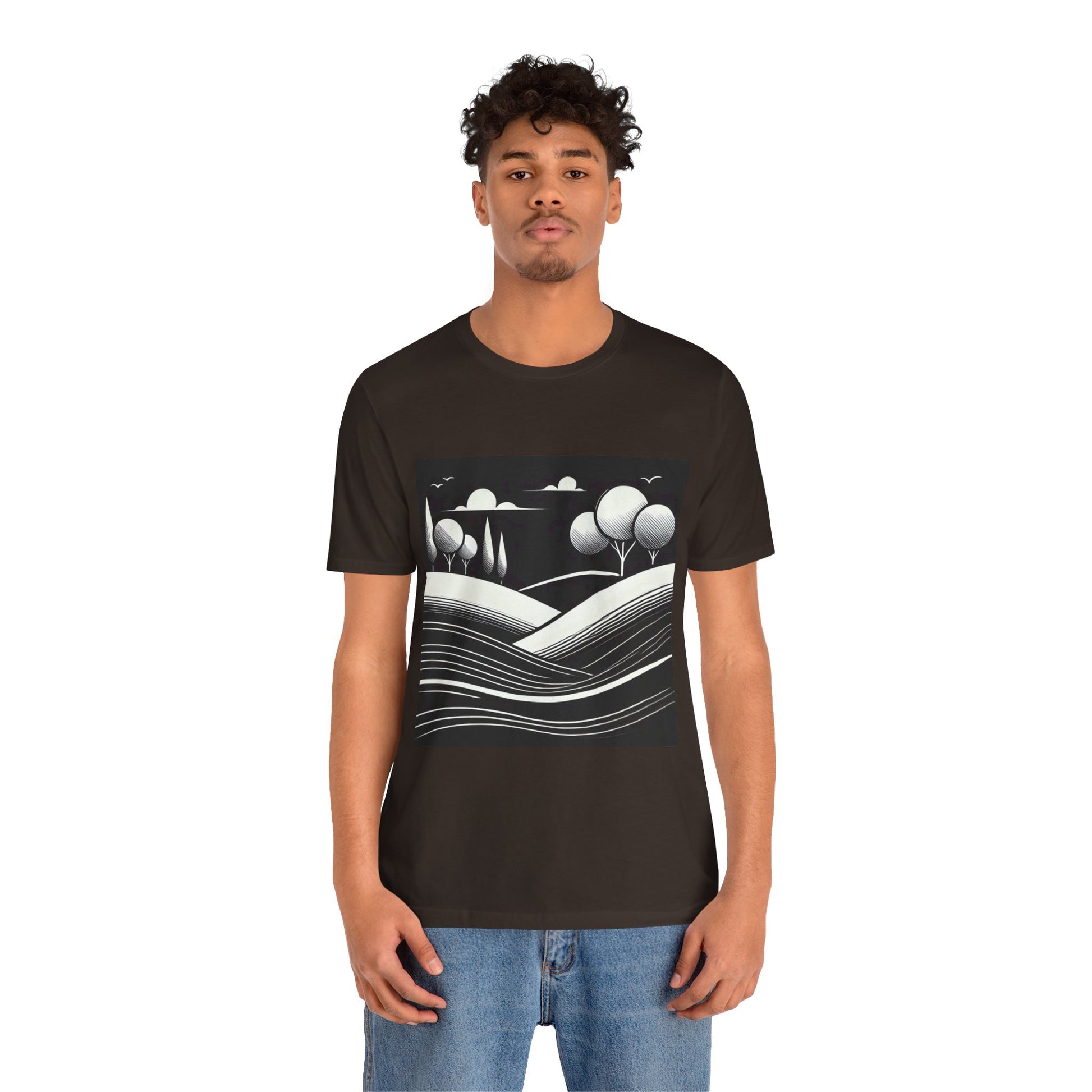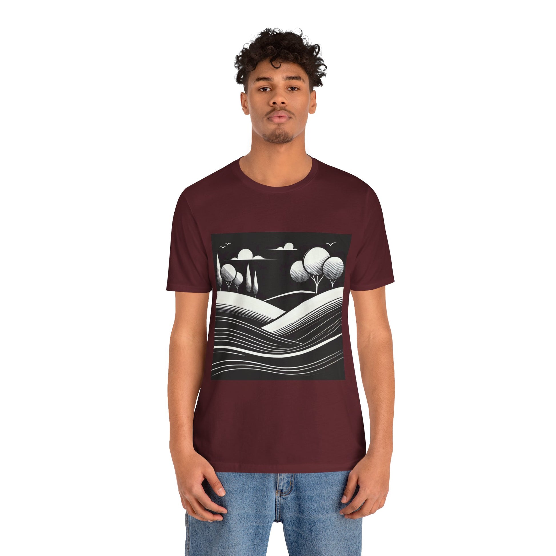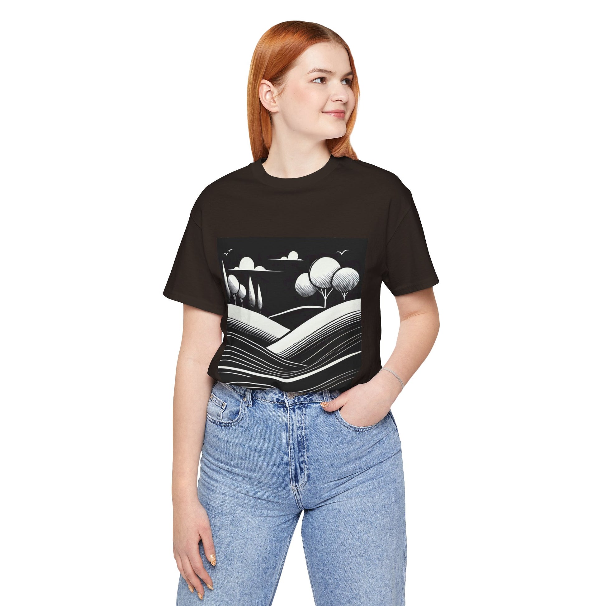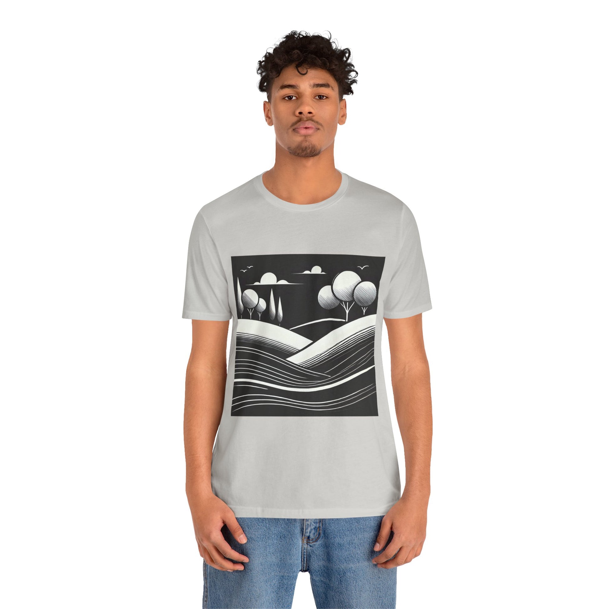 A minimalist landscape with rolling hills and stylized trees, featuring smooth lines in a high-contrast monochrome design.