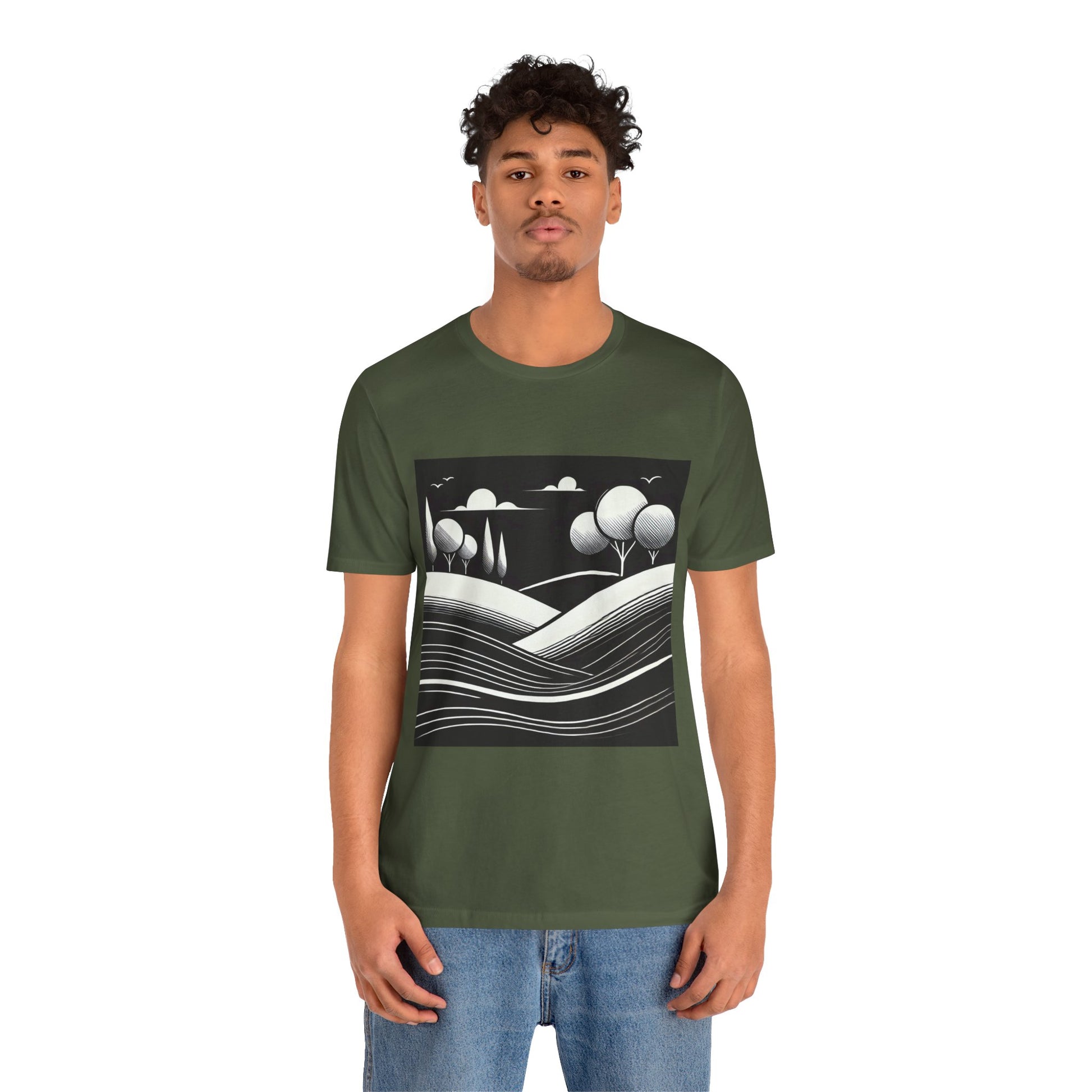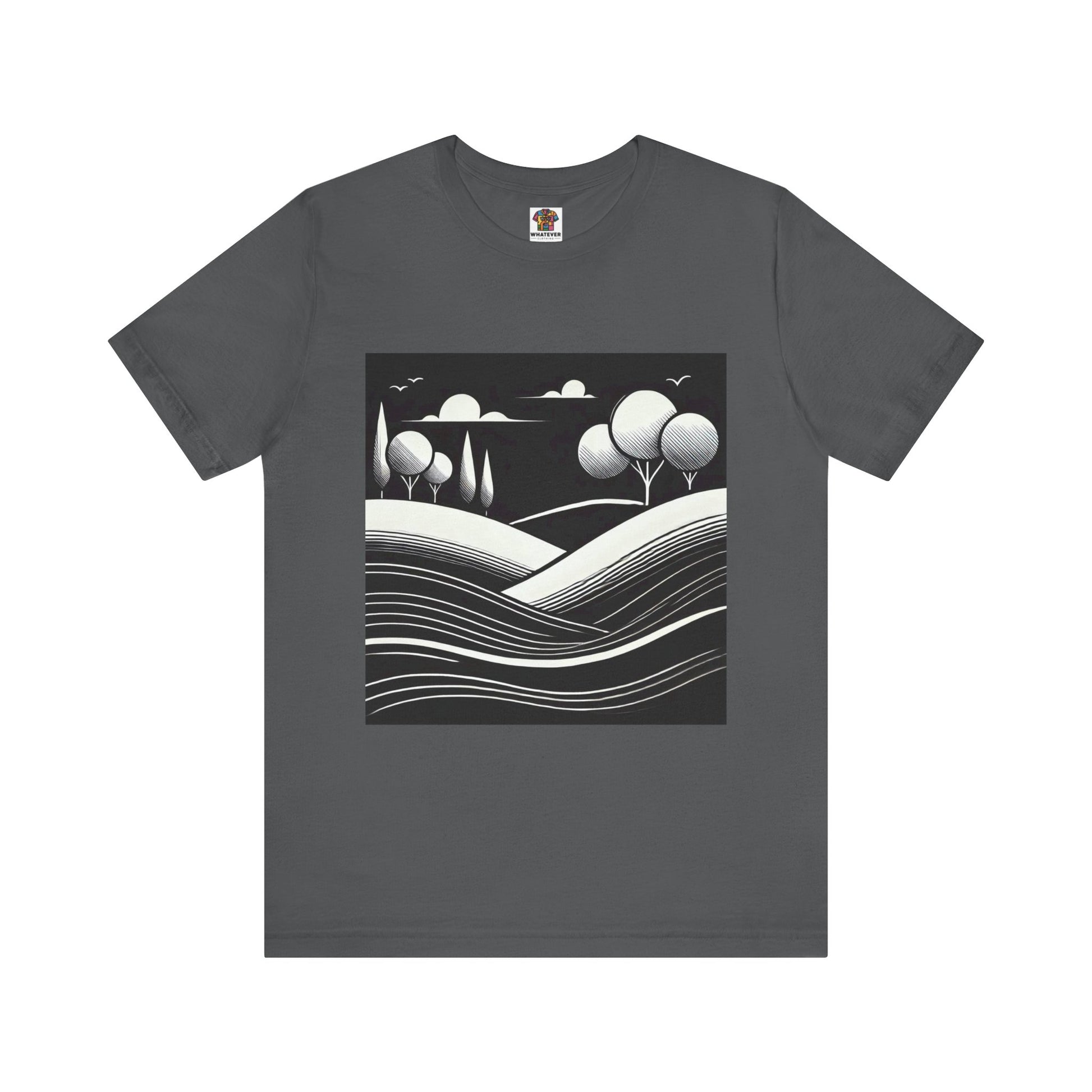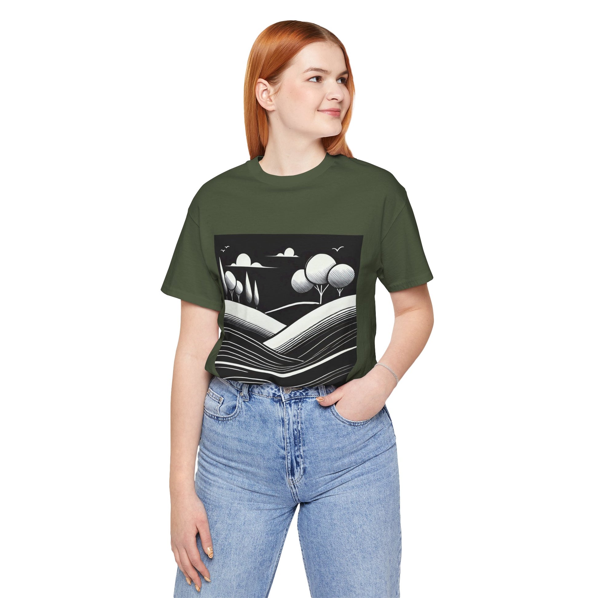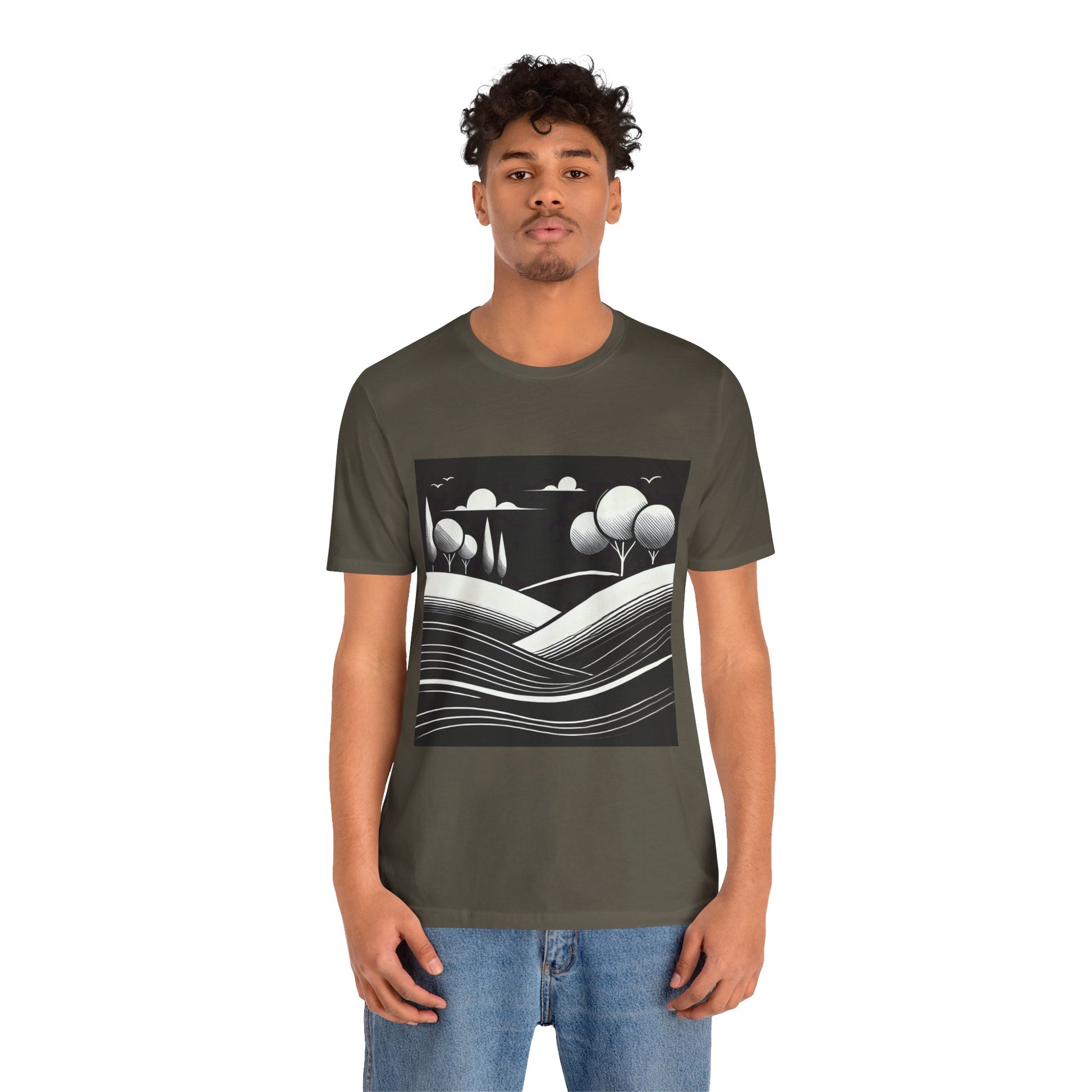A minimalist landscape with rolling hills and stylized trees, featuring smooth lines in a high-contrast monochrome design.