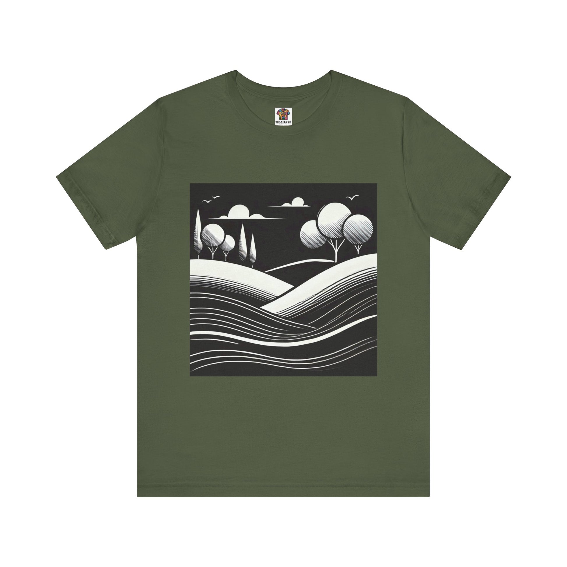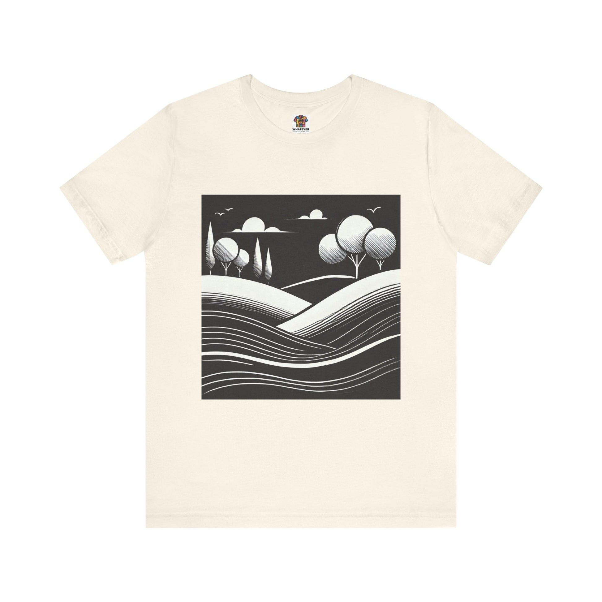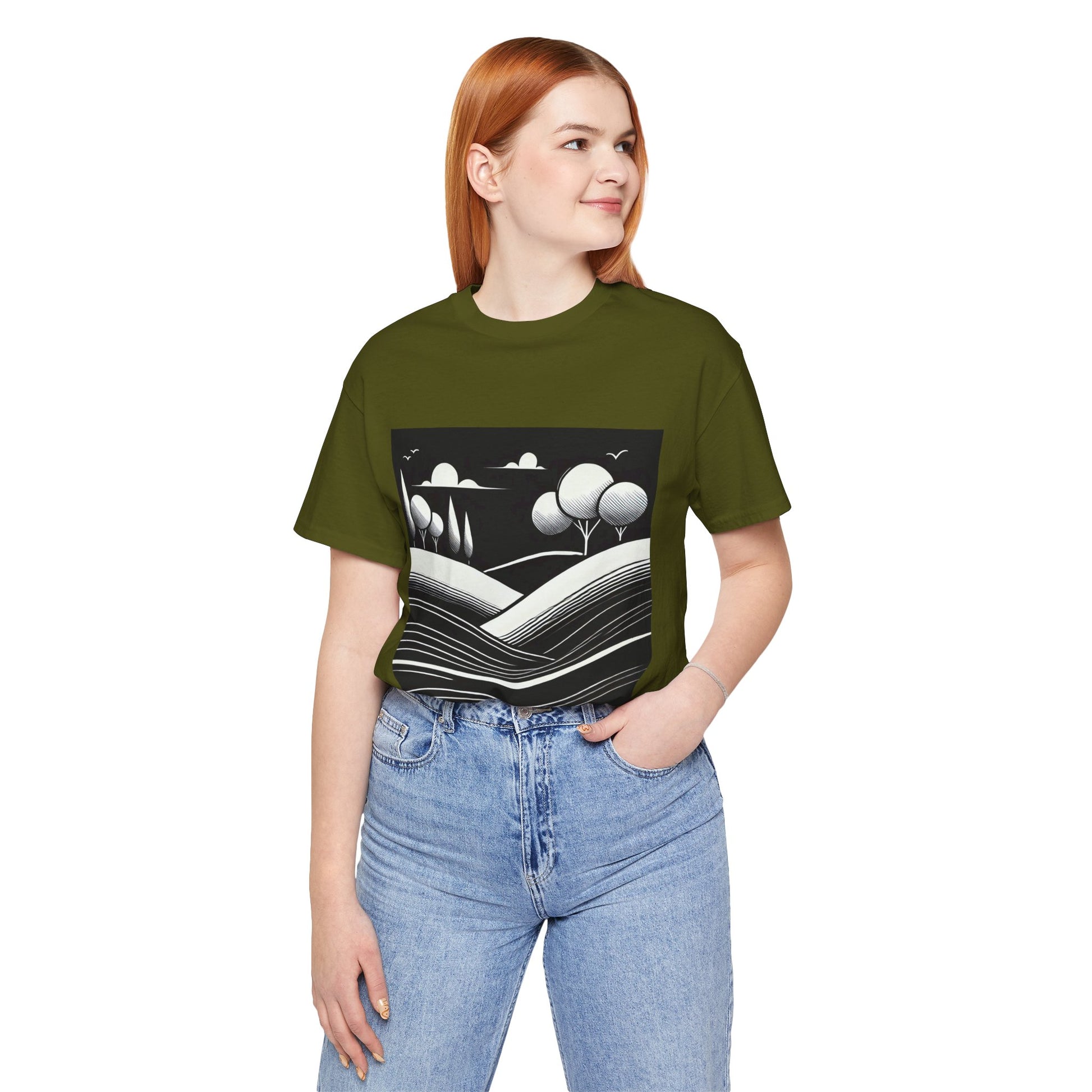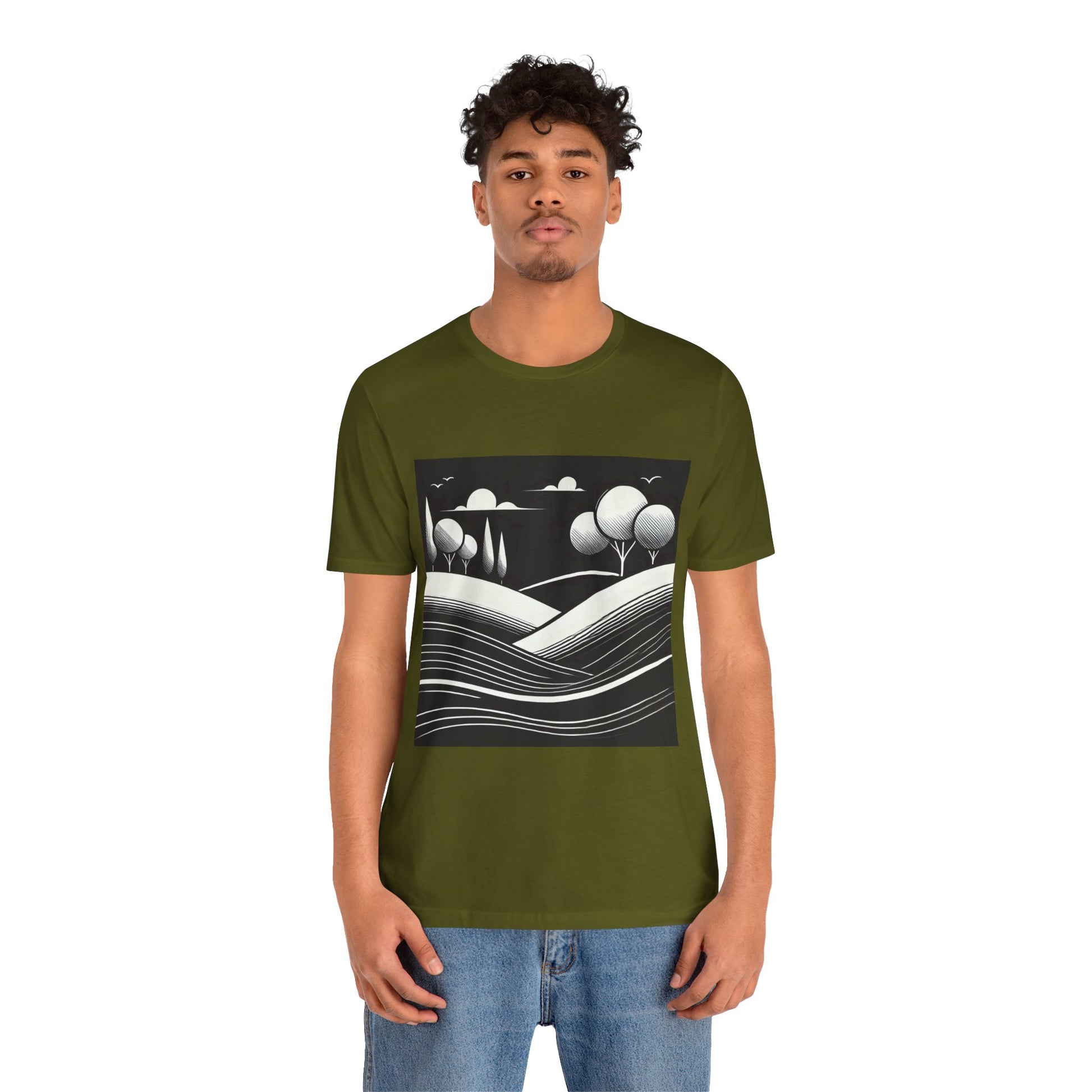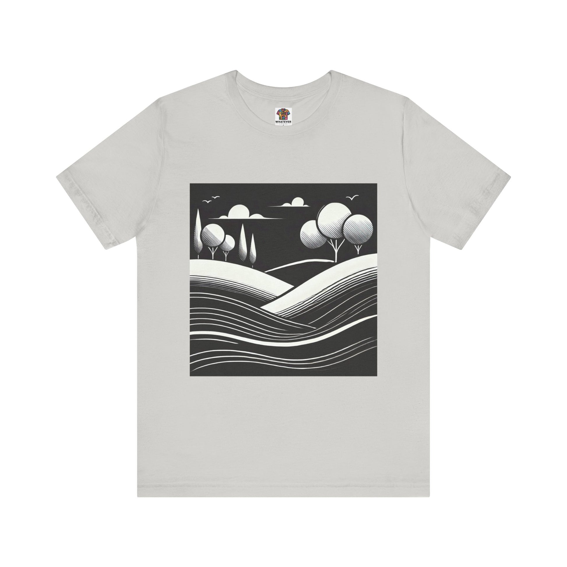 A minimalist landscape with rolling hills and stylized trees, featuring smooth lines in a high-contrast monochrome design.