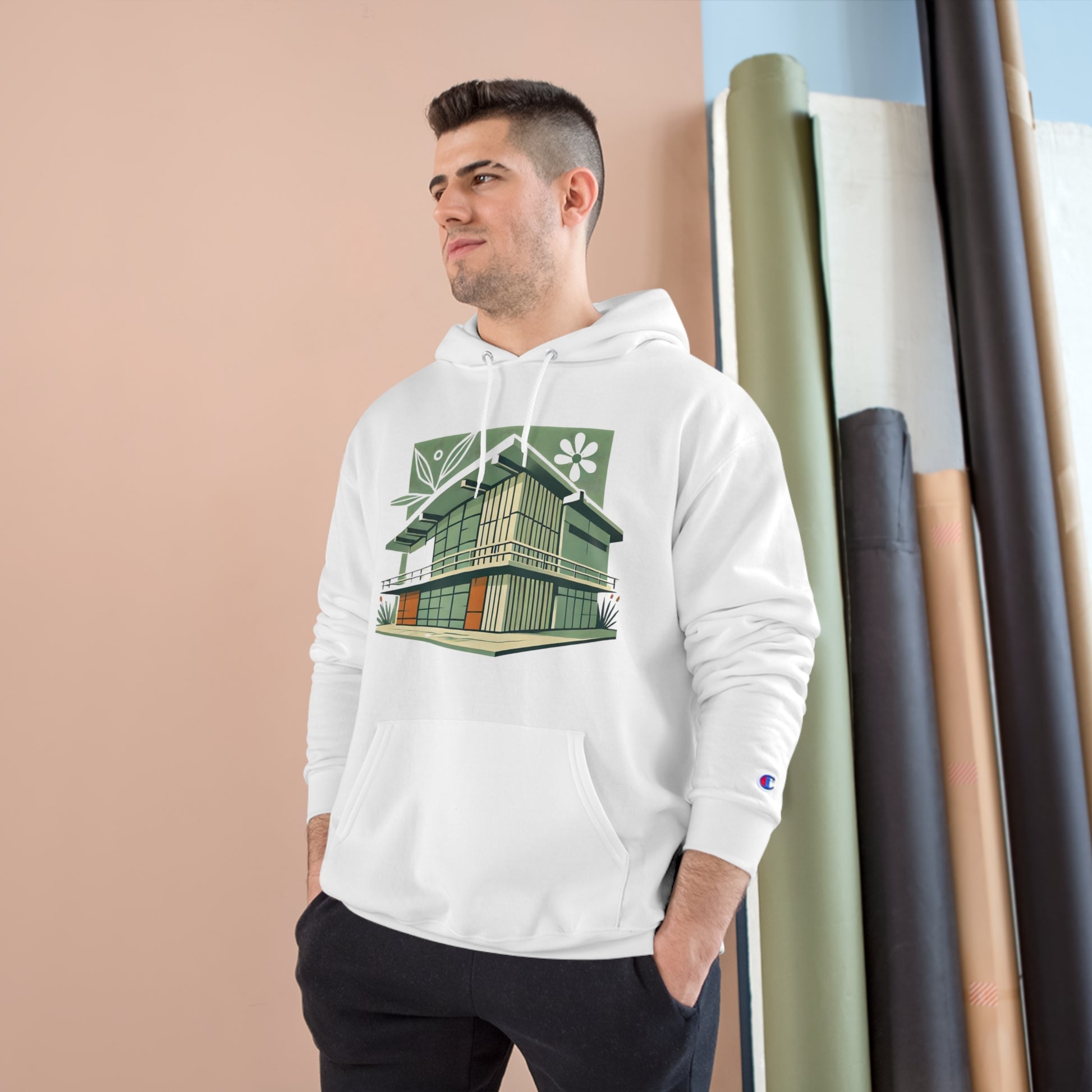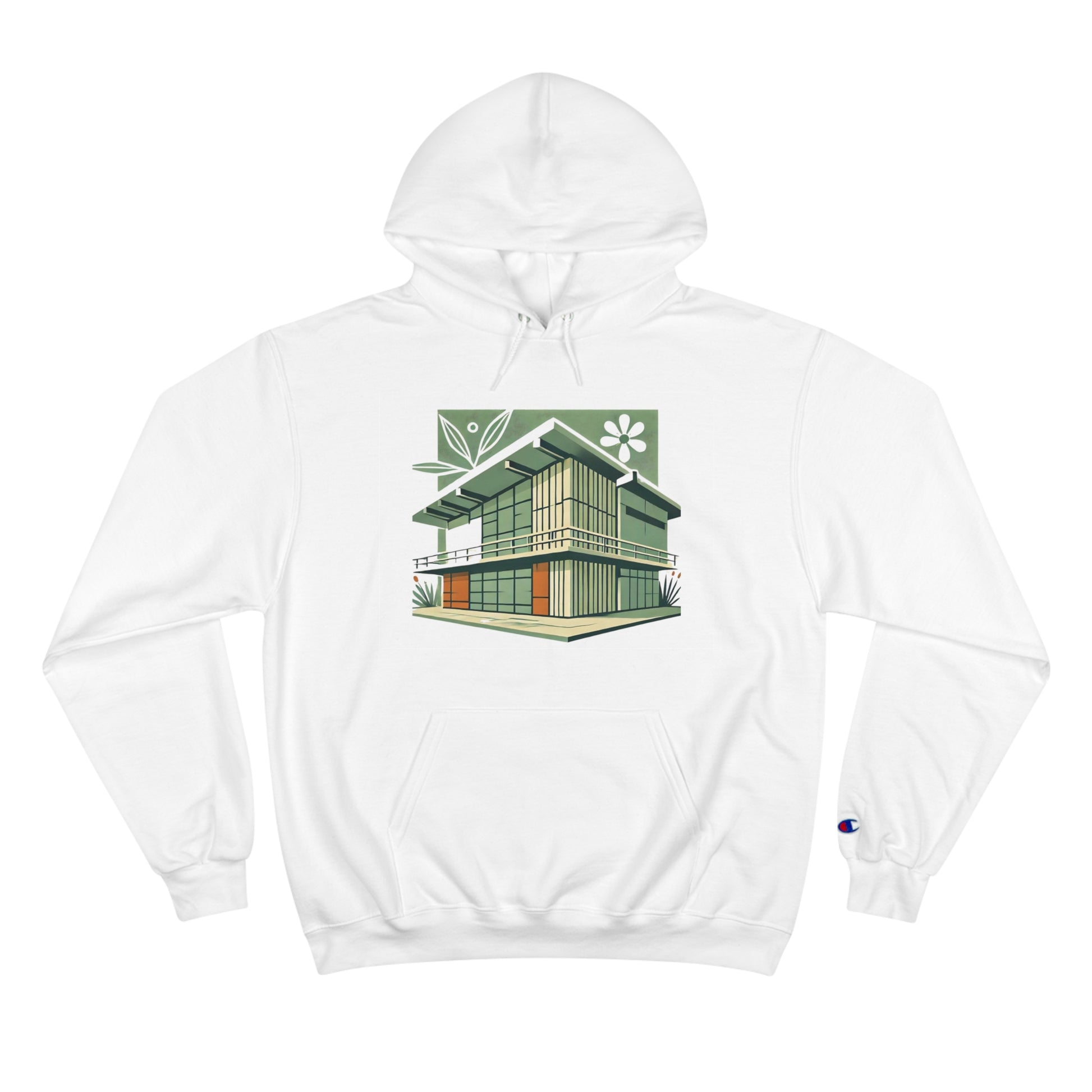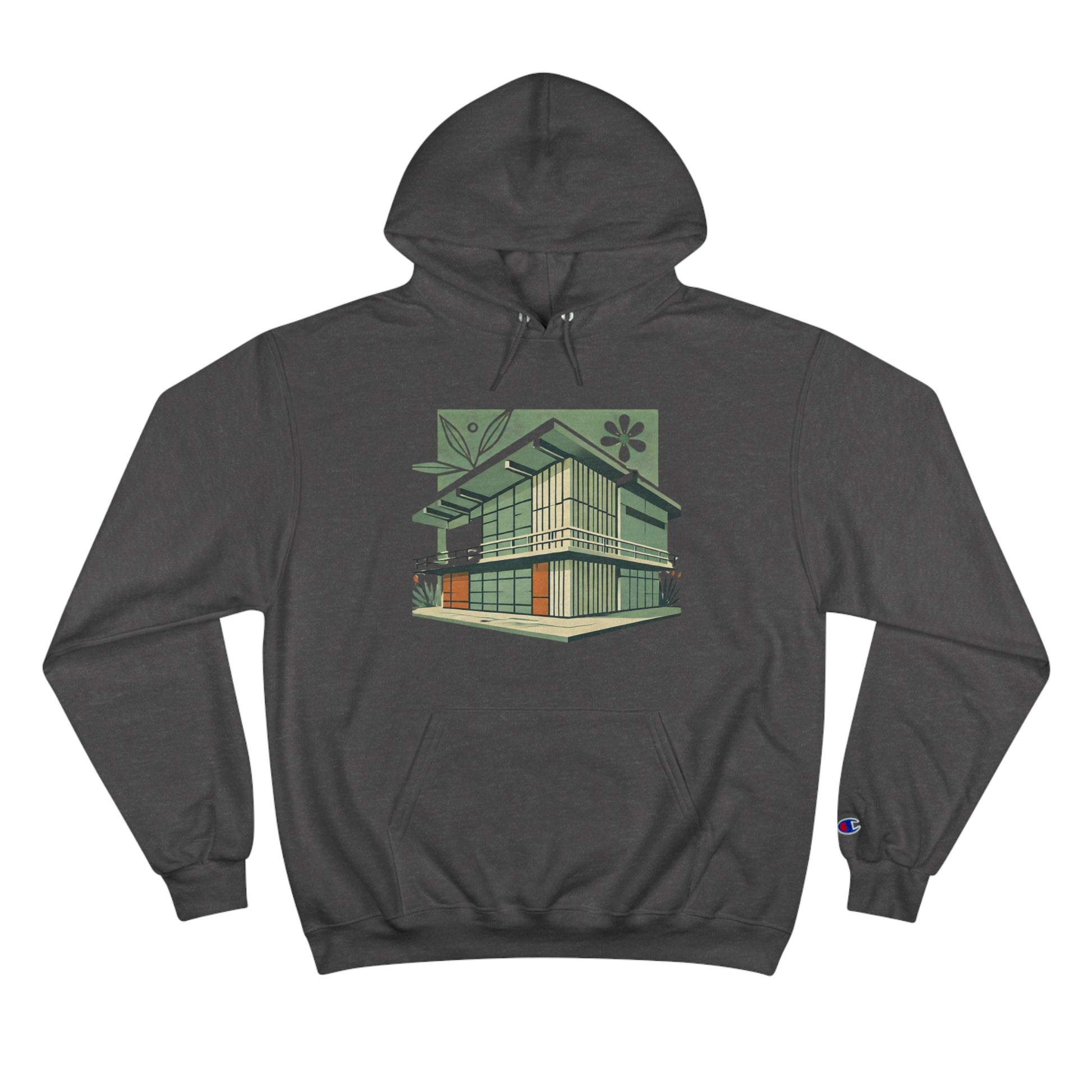 On this wearable canvas, a charming graphic of a mid-century modern building is rendered in refreshing green shades, with orange window highlights adding a trendy pop of color. It's a homage to clean architectural lines, creating a look that's both retro and modern.