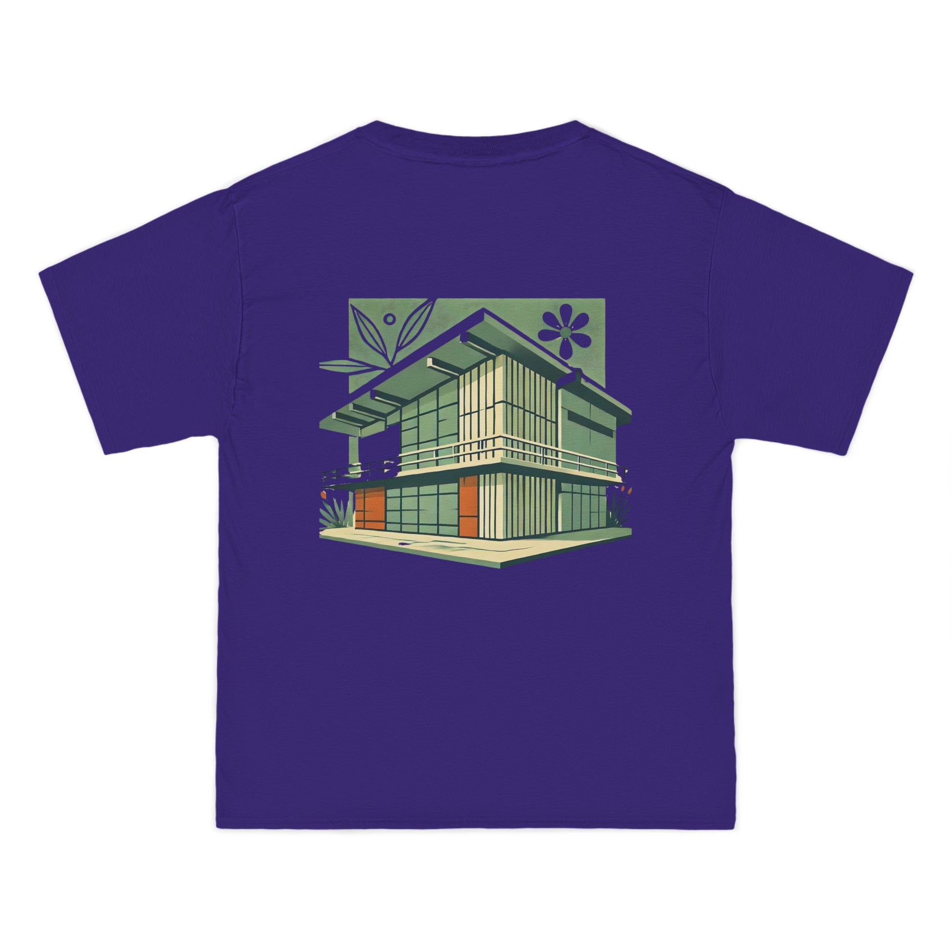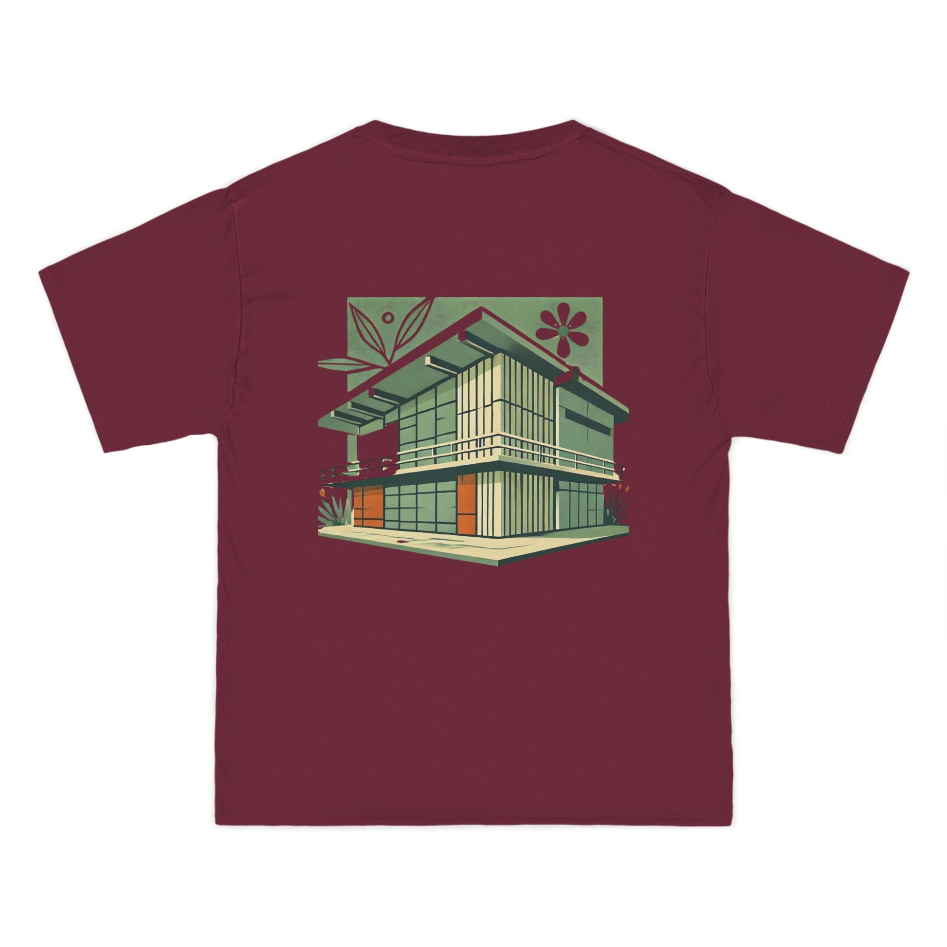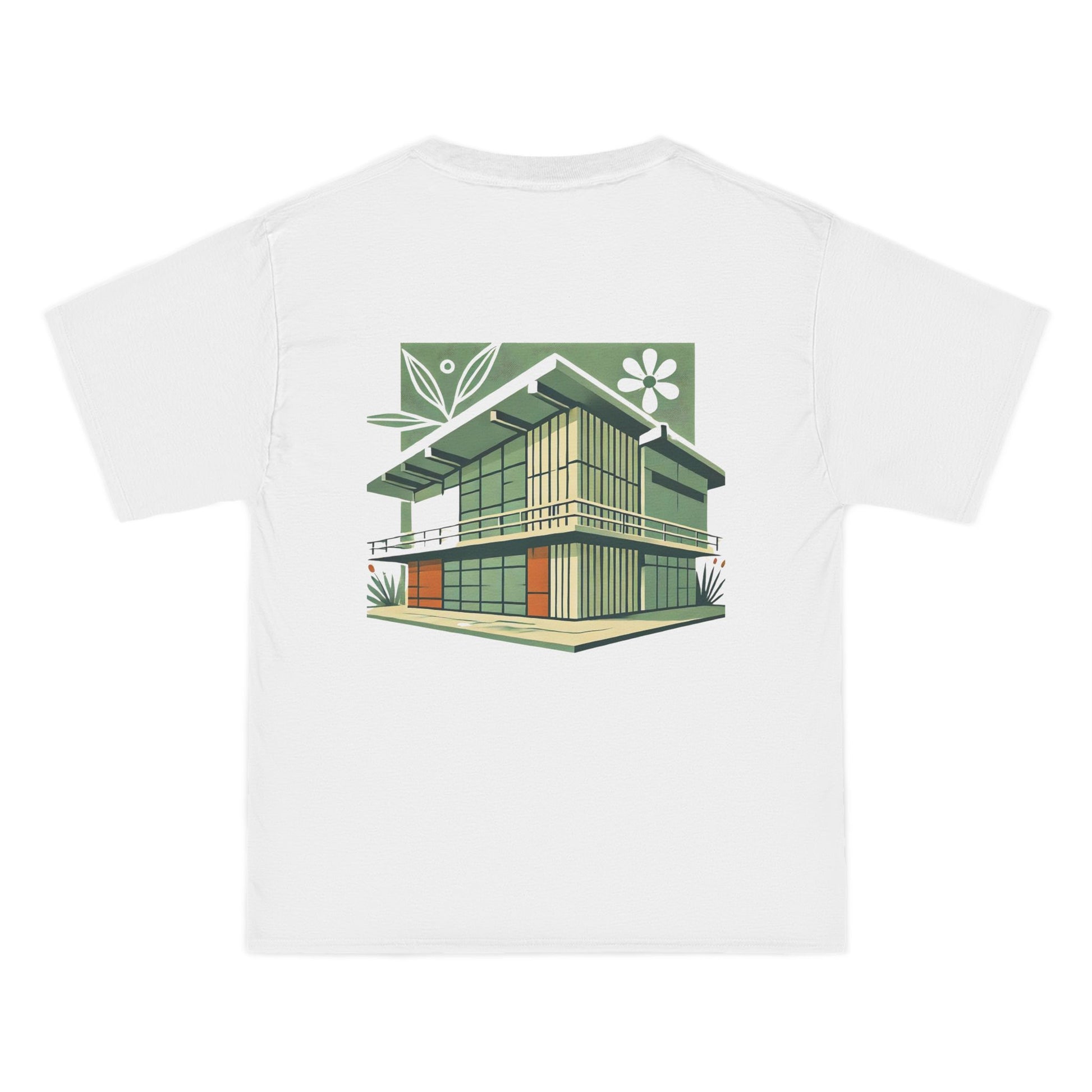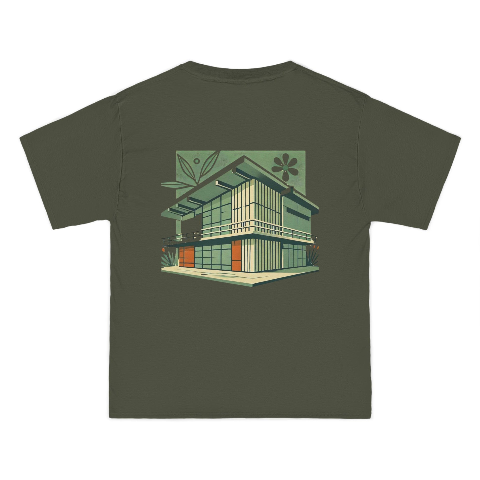 Welcome to the world of Whatever Clothing where 'Wearable Art' is not just a phrase, but an everyday reality! Dive into a world of creativity and express yourself with our 'Modern Building: Floral Orange Vibe.' This unique design, depicting a mid-century modern building in vibrant green shades with playful orange window highlights, brings a splash of joy, nostalgia, and flair to your wardrobe.
