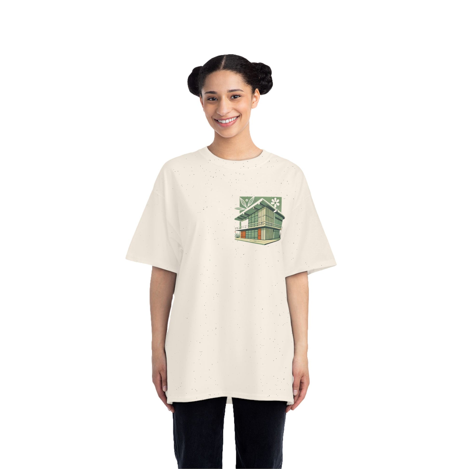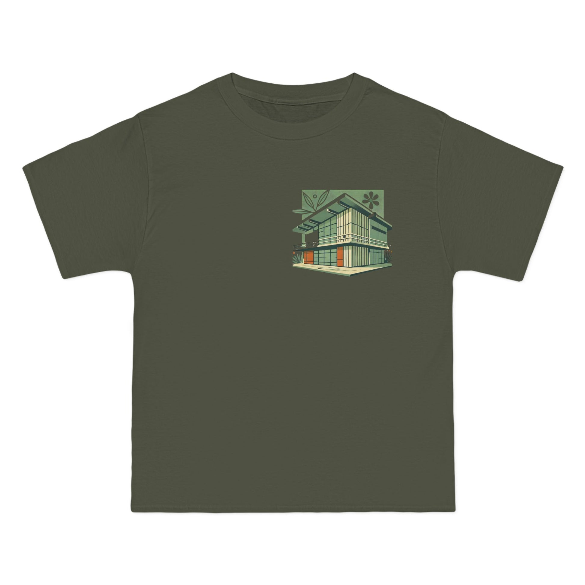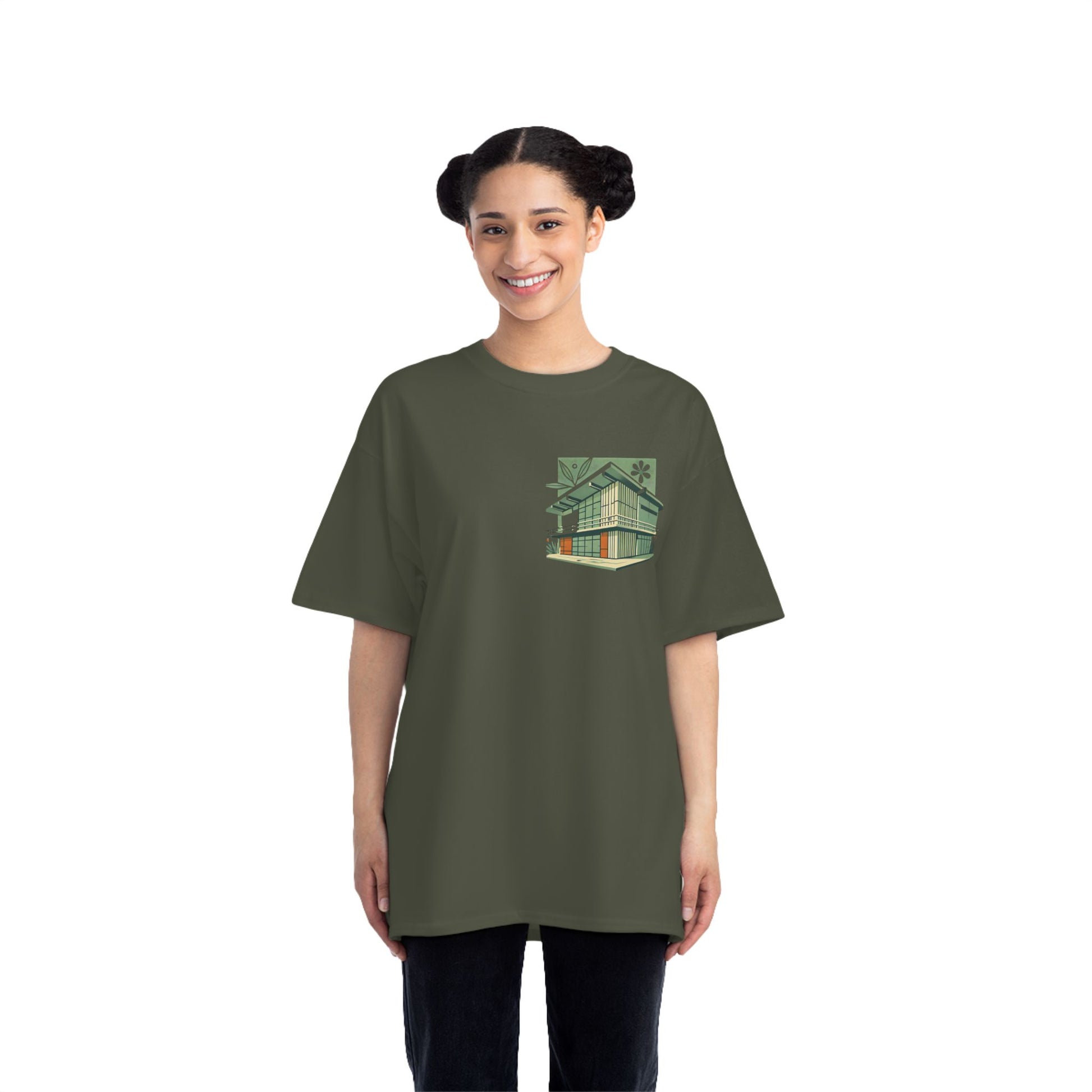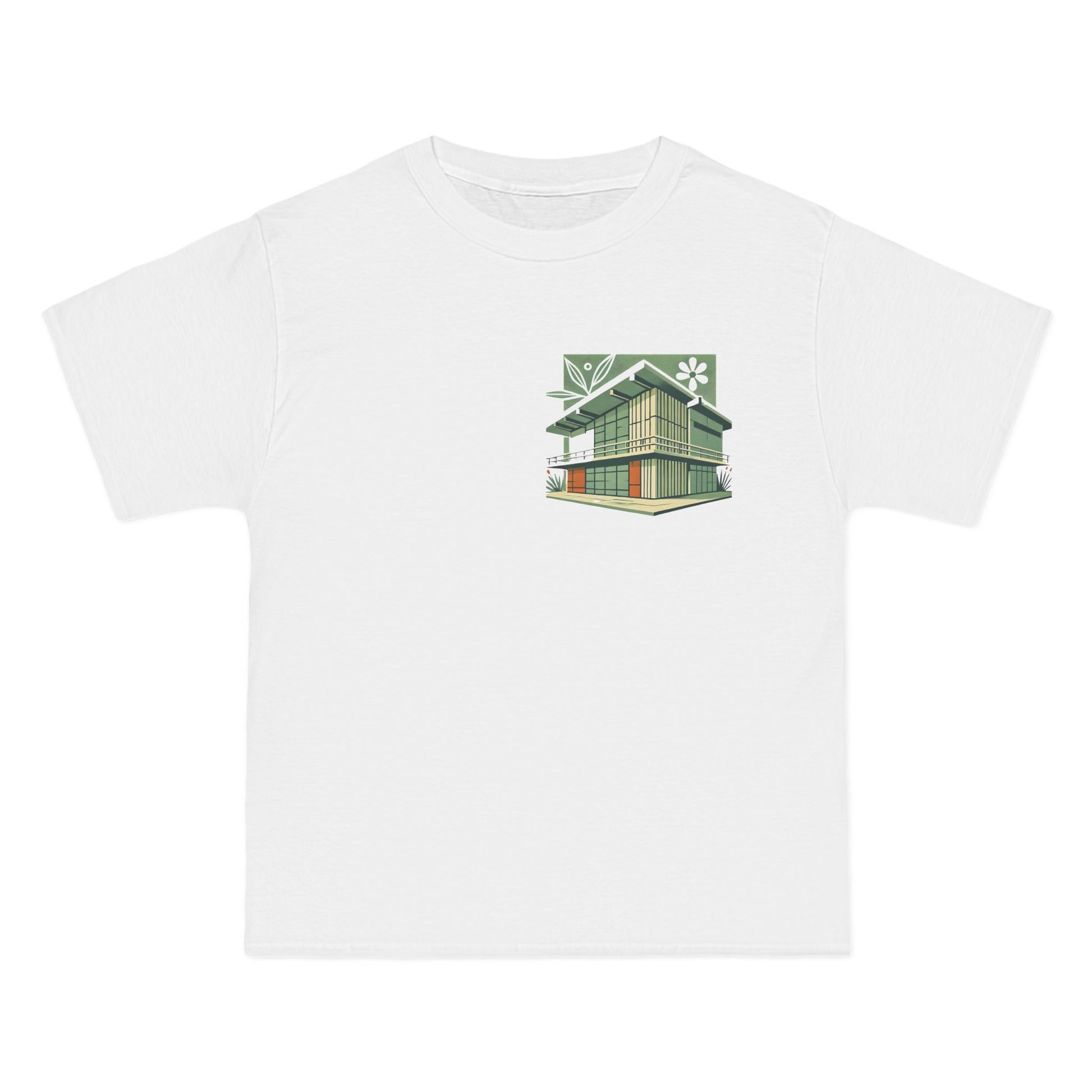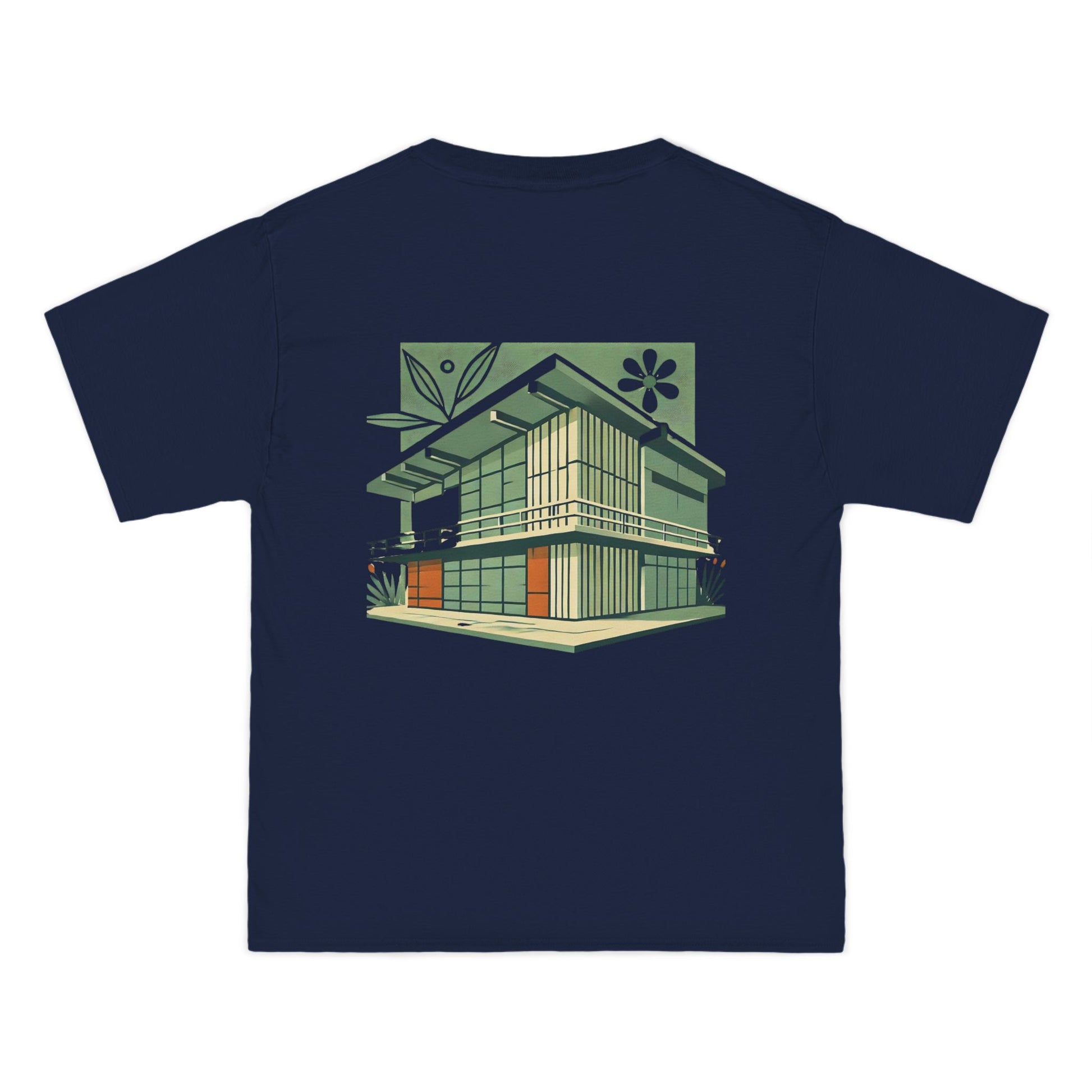 Welcome to the world of Whatever Clothing where 'Wearable Art' is not just a phrase, but an everyday reality! Dive into a world of creativity and express yourself with our 'Modern Building: Floral Orange Vibe.' This unique design, depicting a mid-century modern building in vibrant green shades with playful orange window highlights, brings a splash of joy, nostalgia, and flair to your wardrobe.