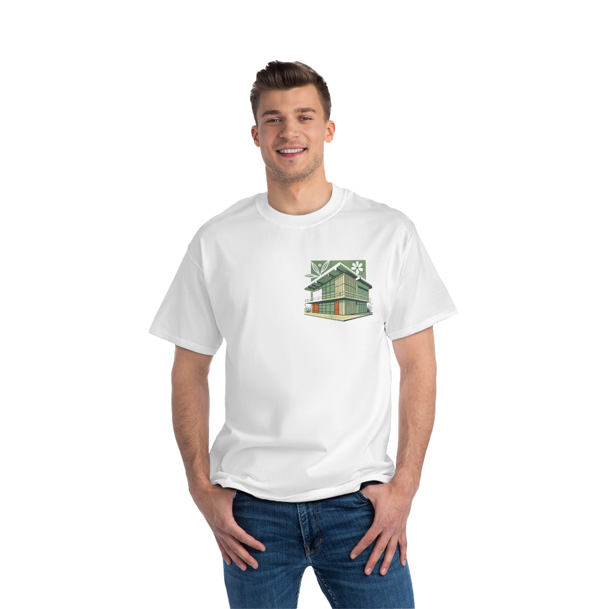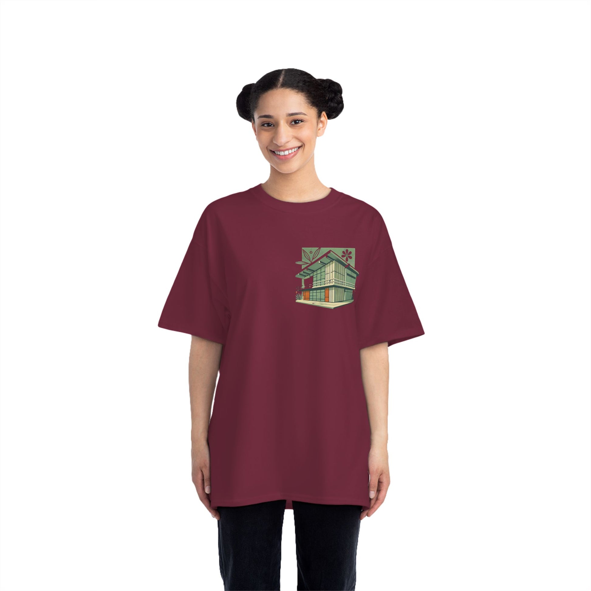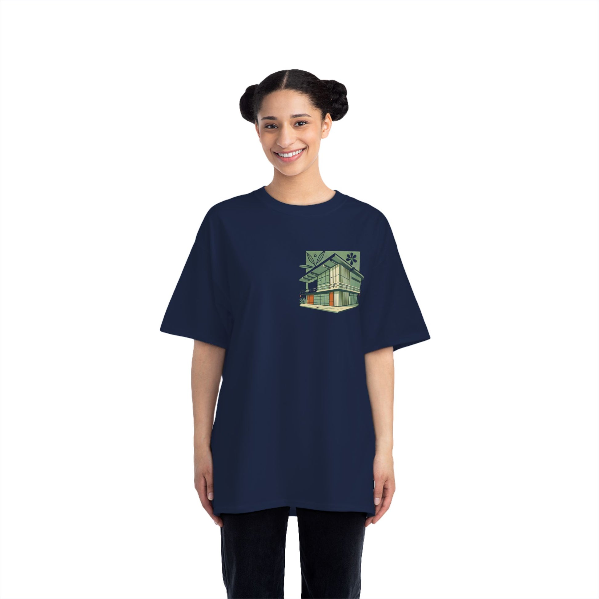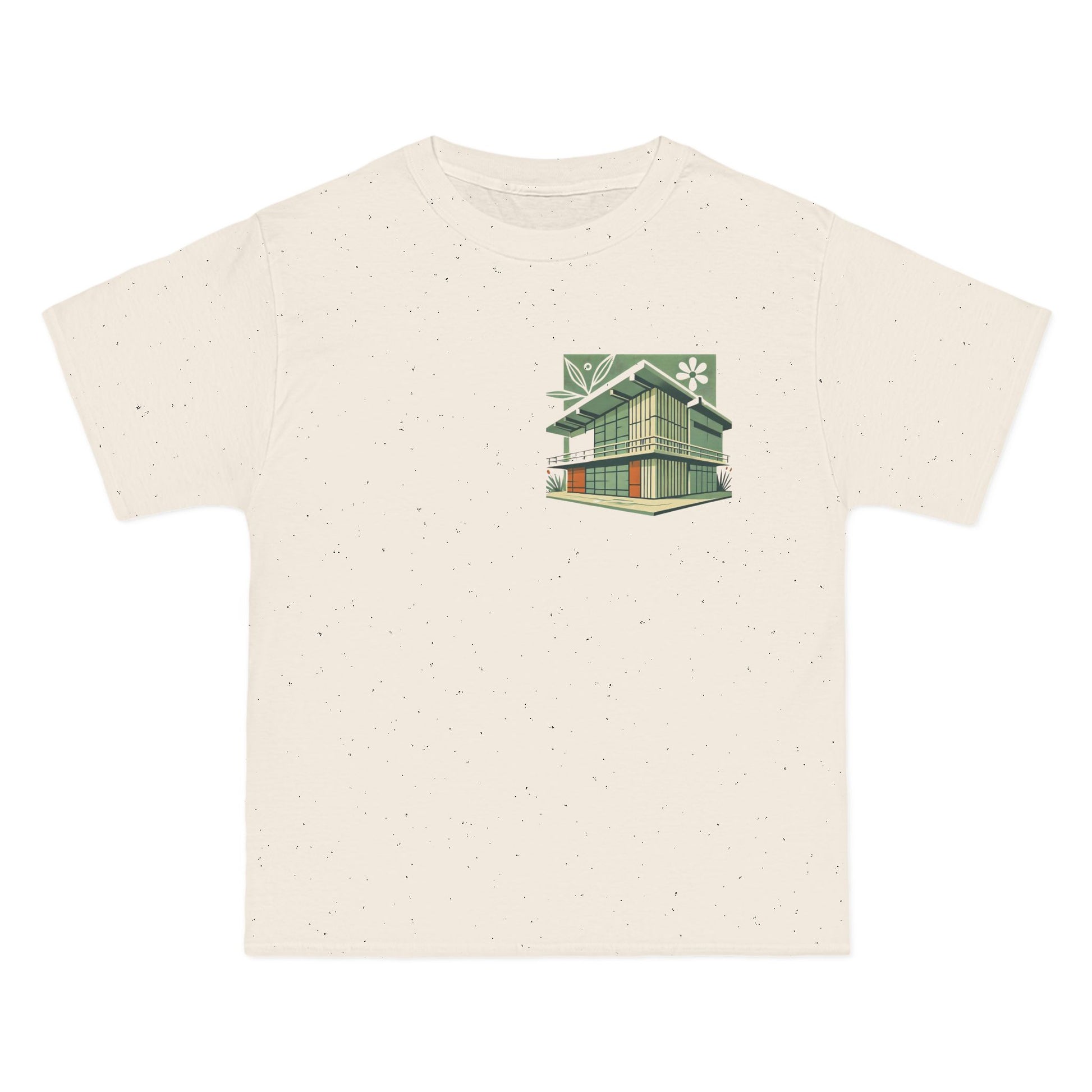 Welcome to the world of Whatever Clothing where 'Wearable Art' is not just a phrase, but an everyday reality! Dive into a world of creativity and express yourself with our 'Modern Building: Floral Orange Vibe.' This unique design, depicting a mid-century modern building in vibrant green shades with playful orange window highlights, brings a splash of joy, nostalgia, and flair to your wardrobe.
