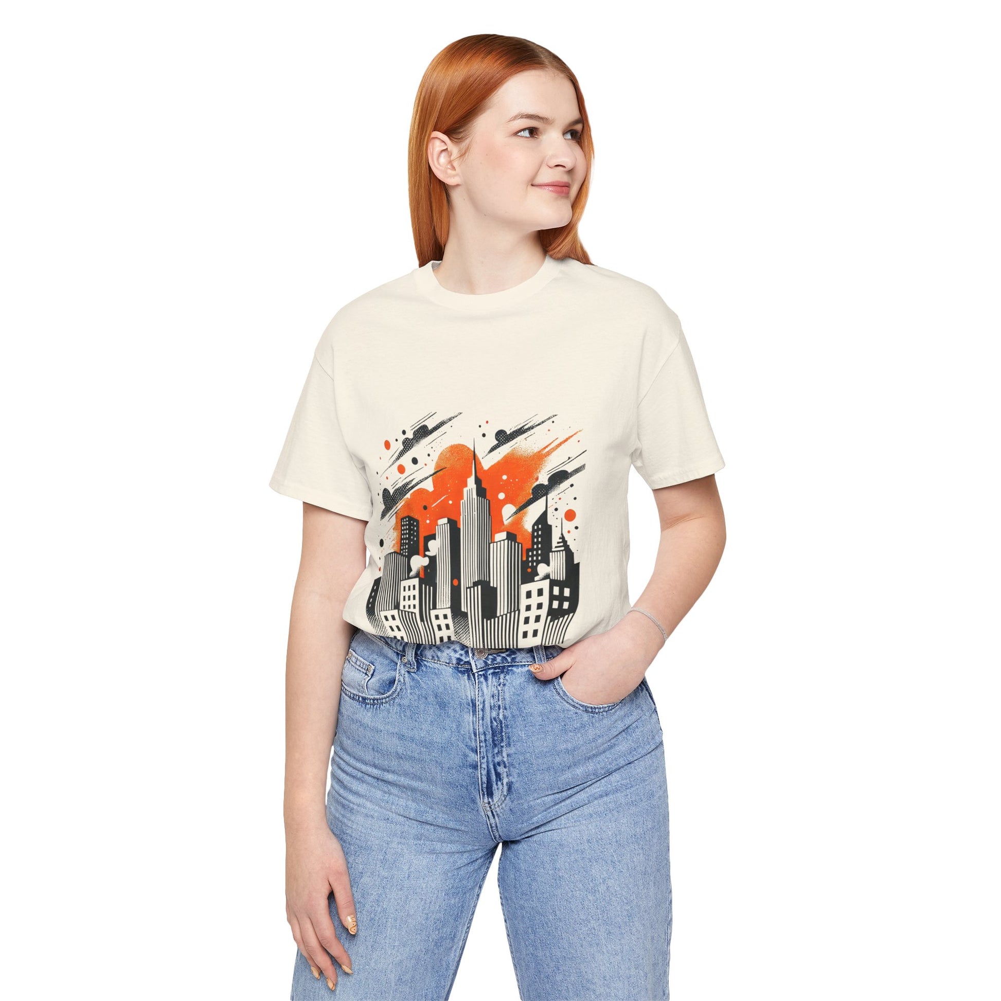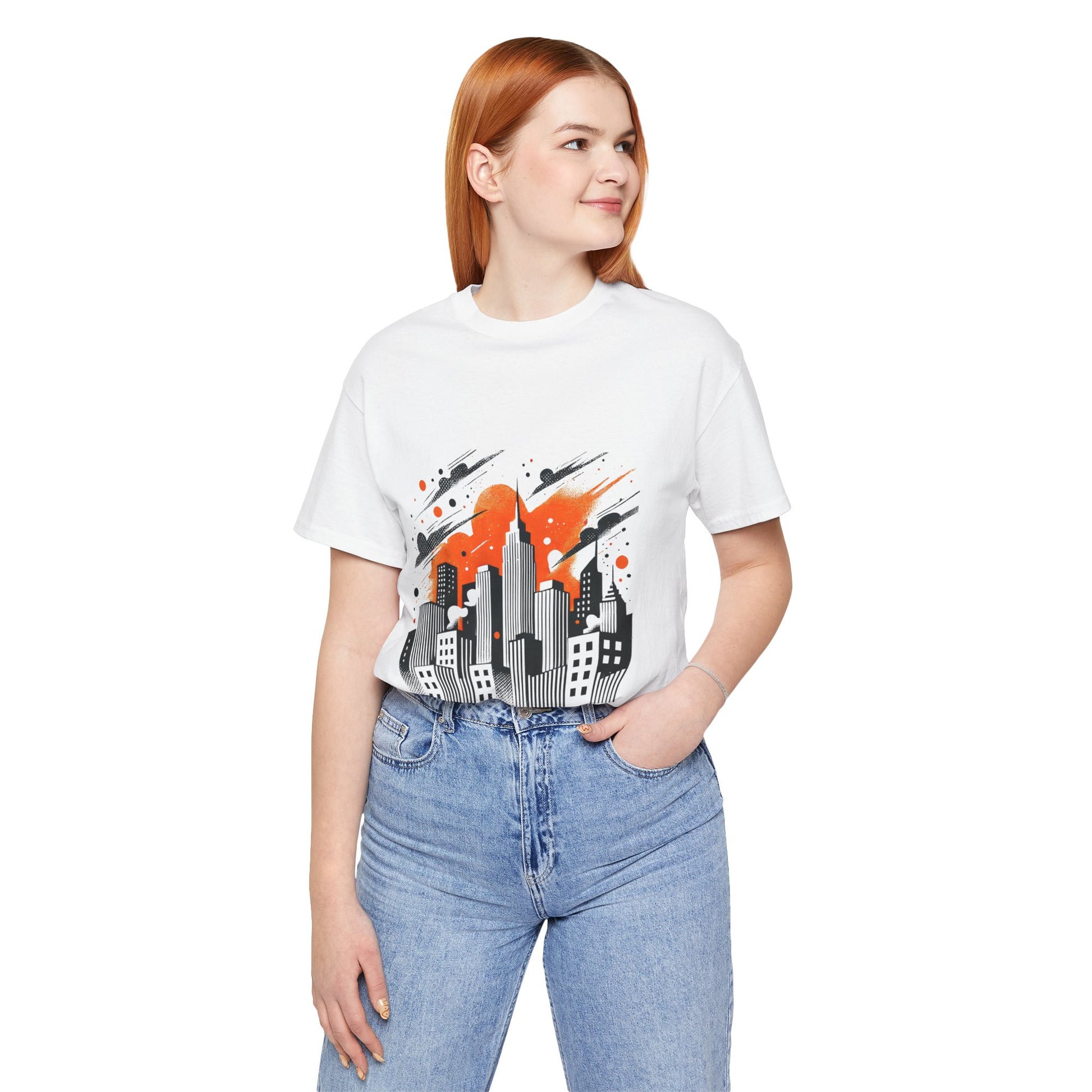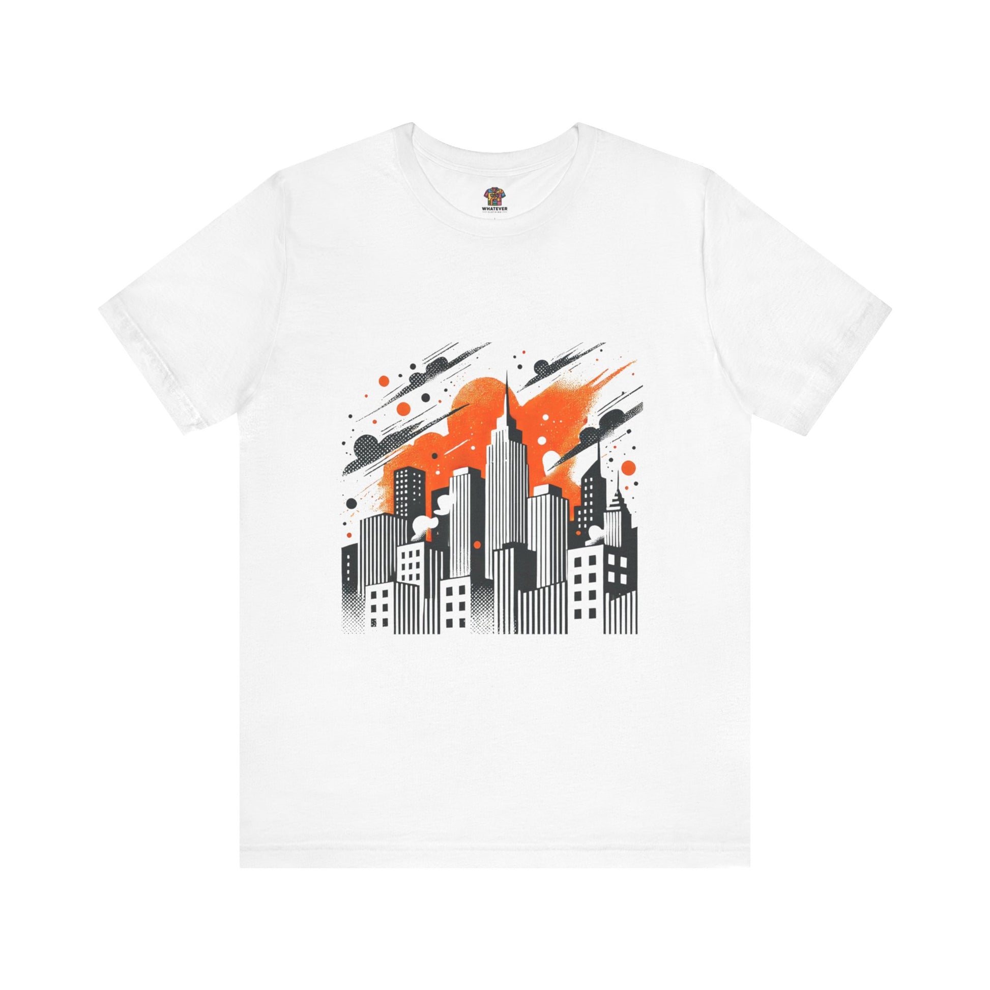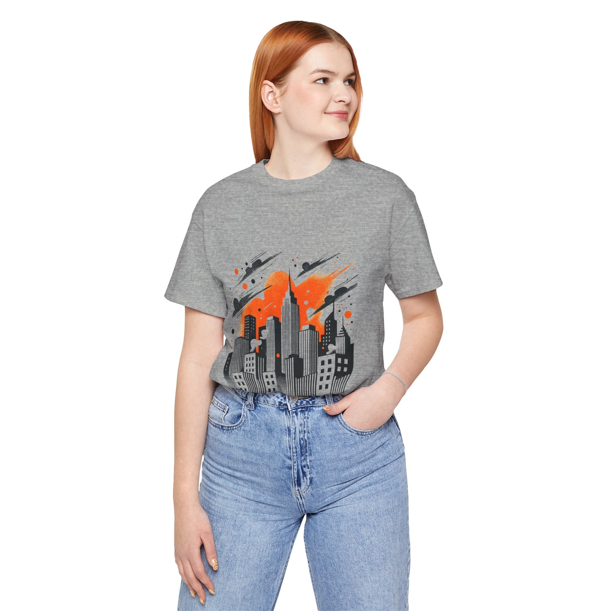 A sharp, geometric city skyline in black with an orange splatter effect in the sky for a dynamic feel.