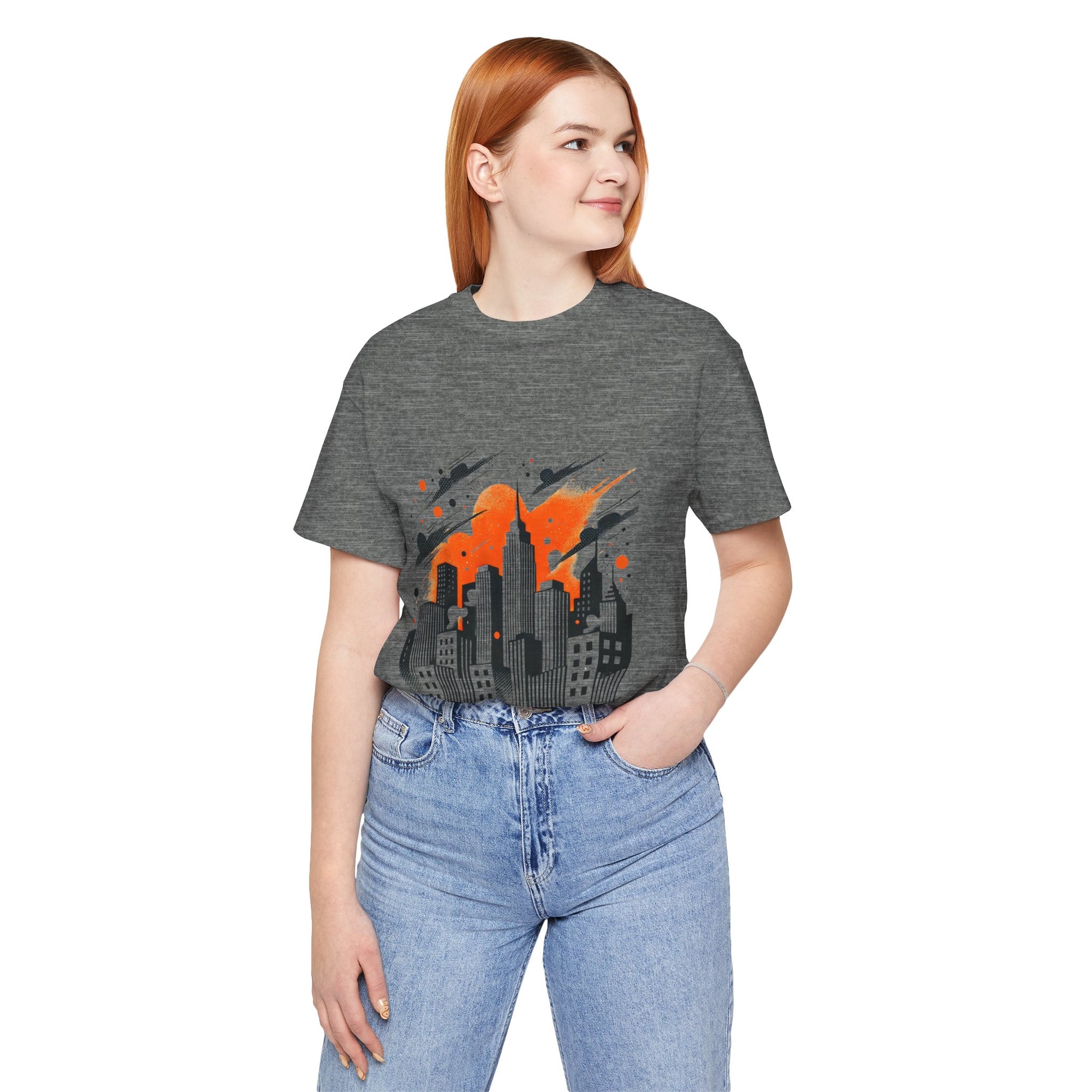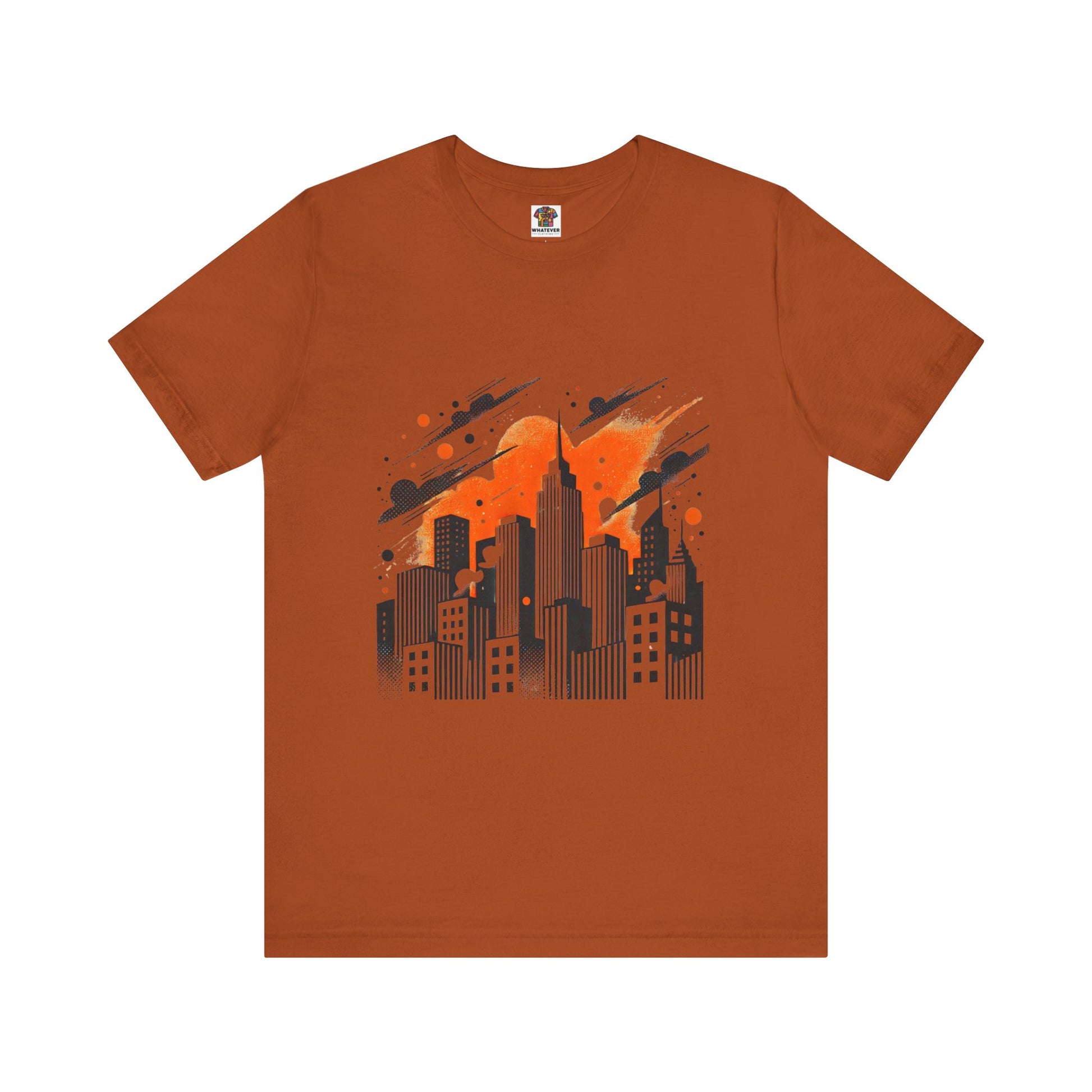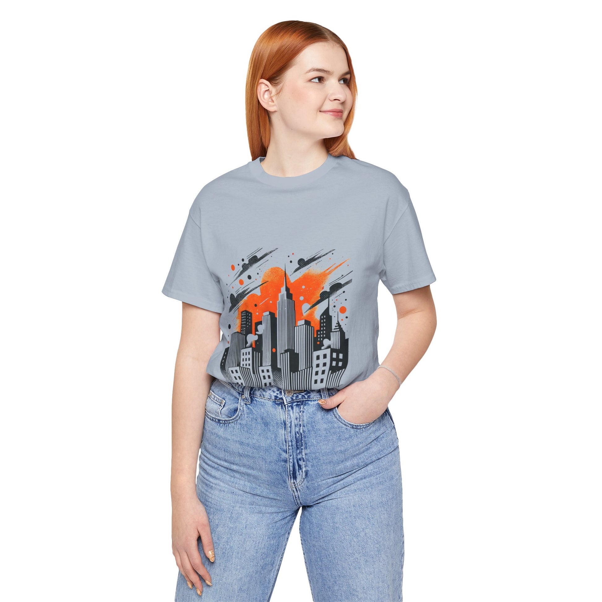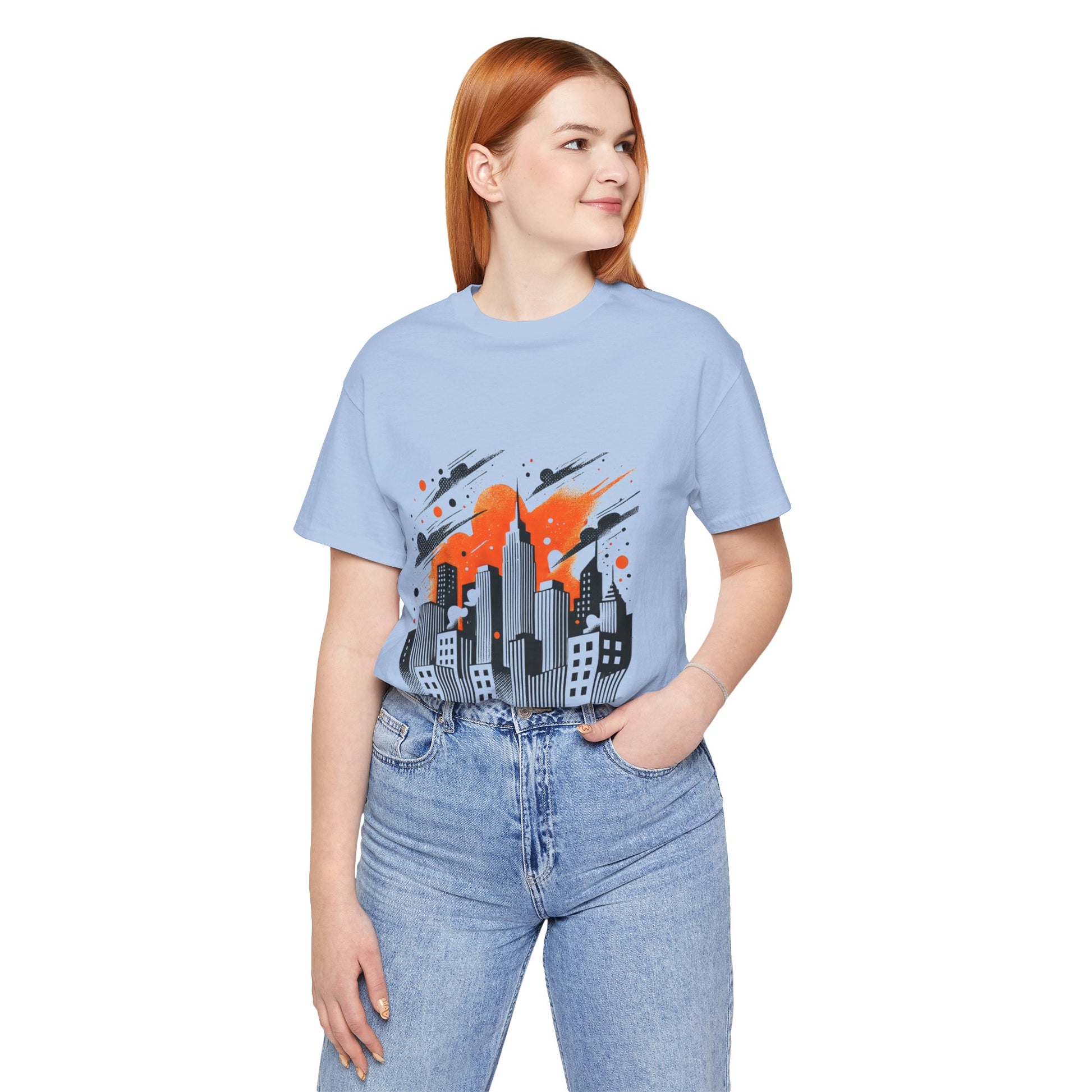 A sharp, geometric city skyline in black with an orange splatter effect in the sky for a dynamic feel.