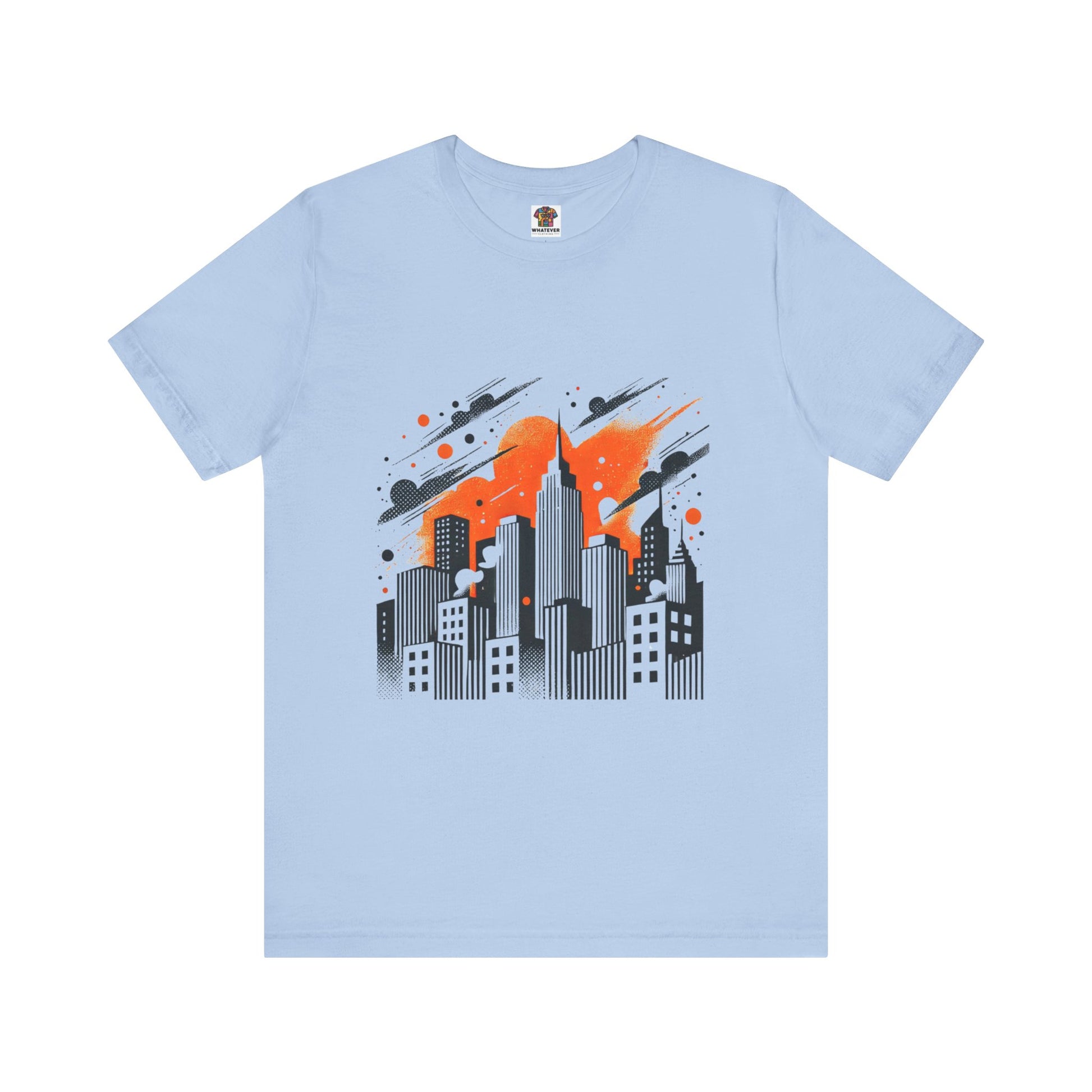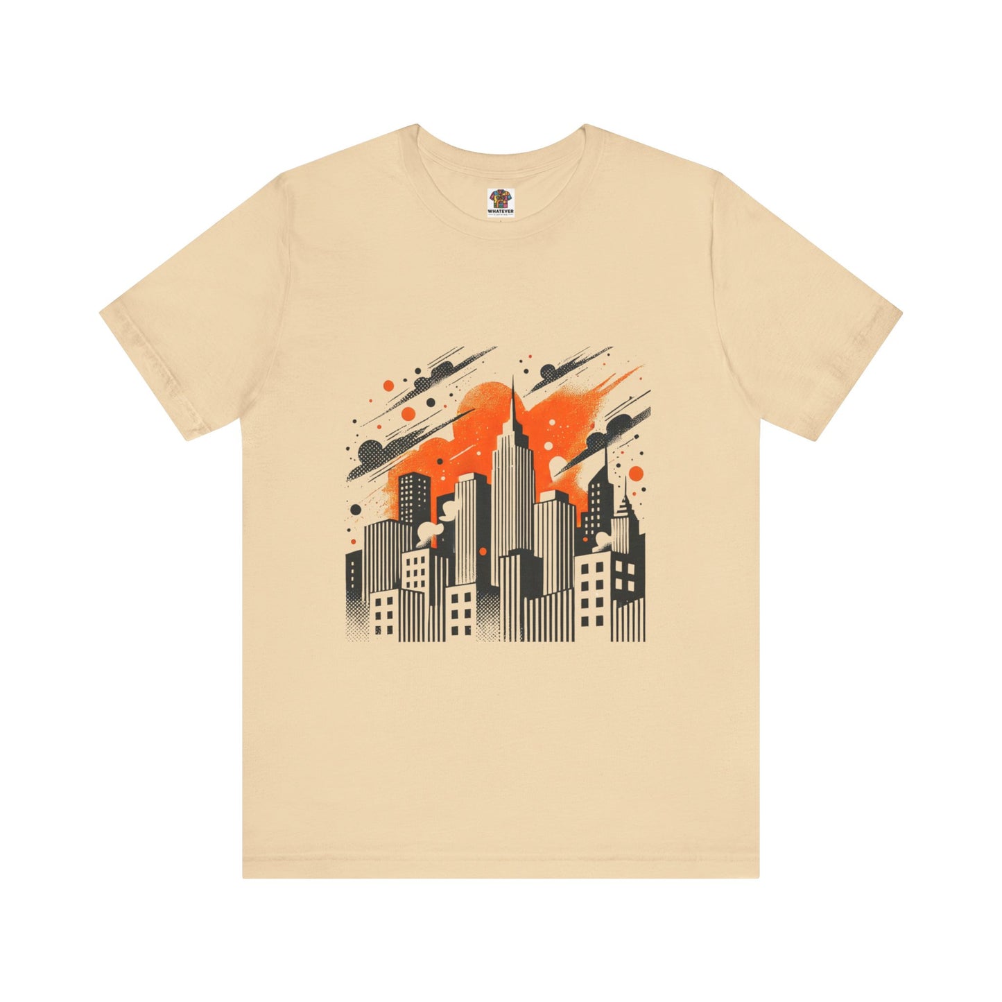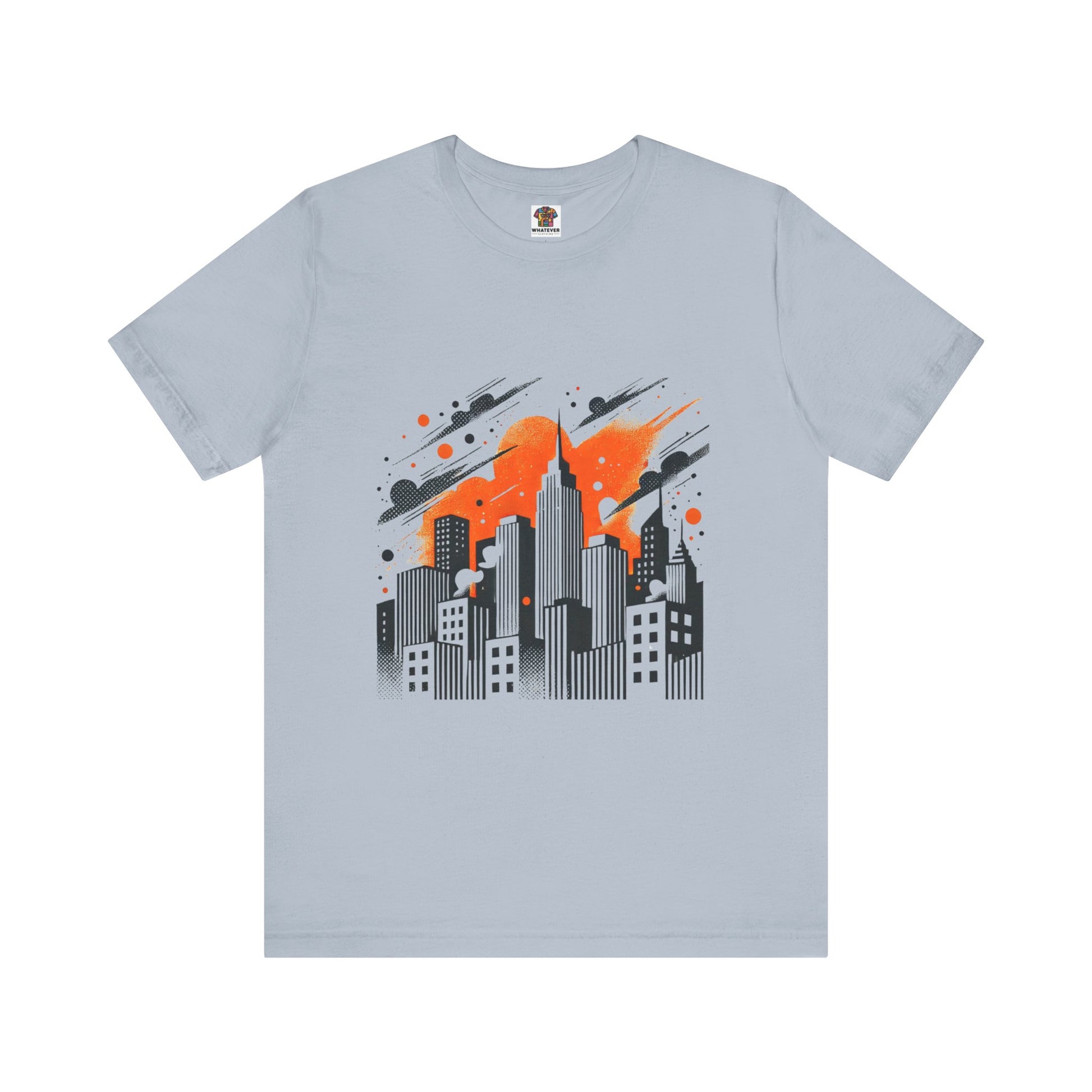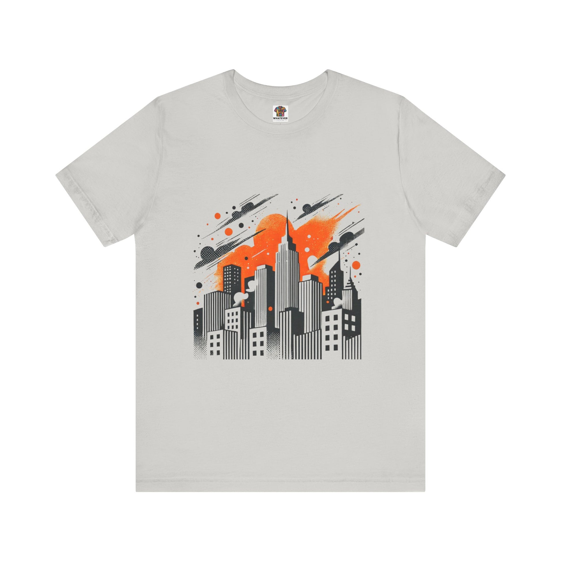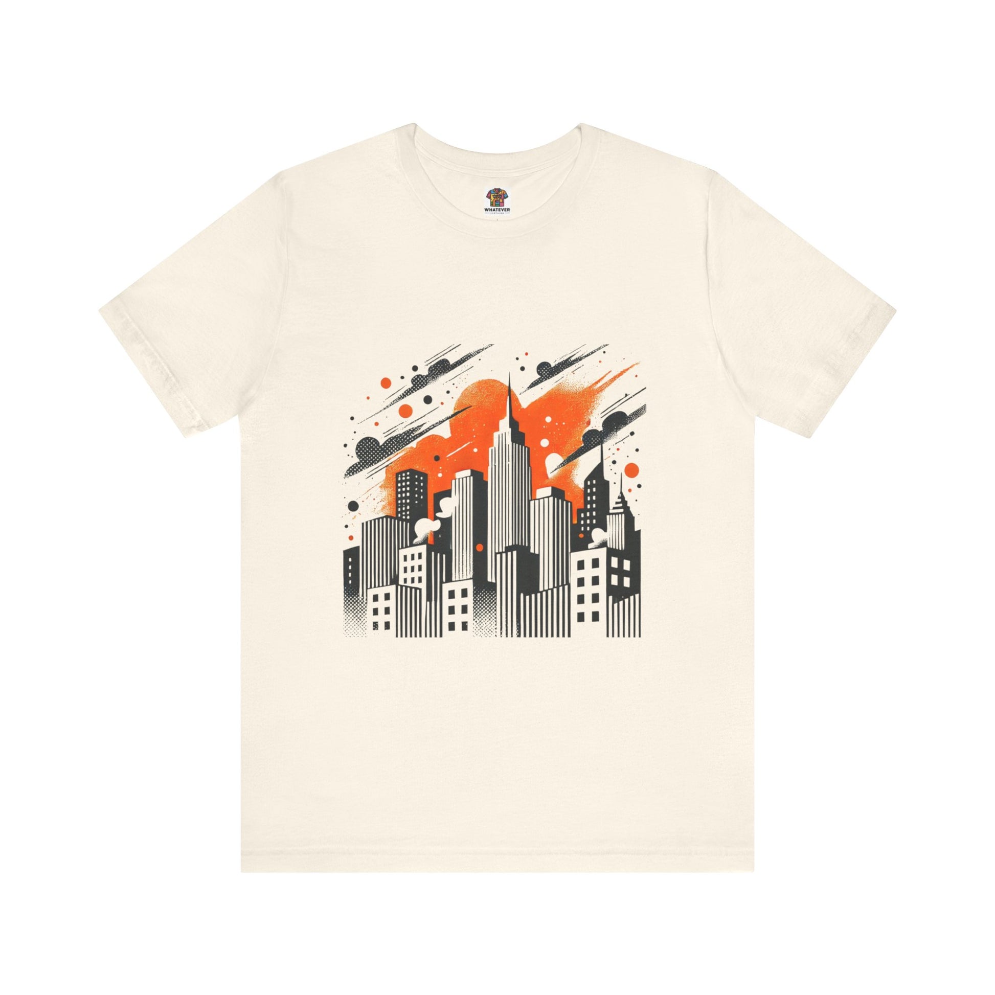 A sharp, geometric city skyline in black with an orange splatter effect in the sky for a dynamic feel.