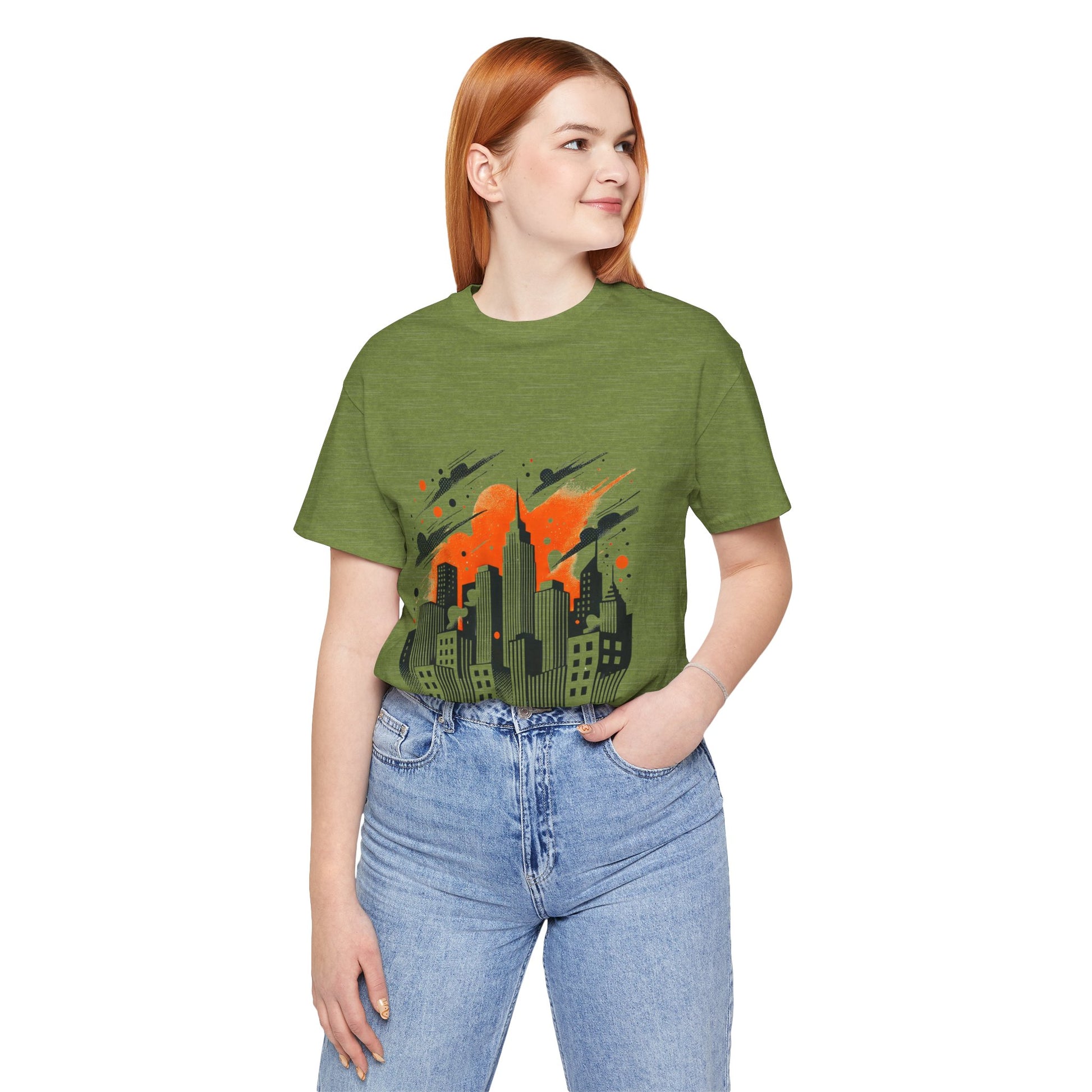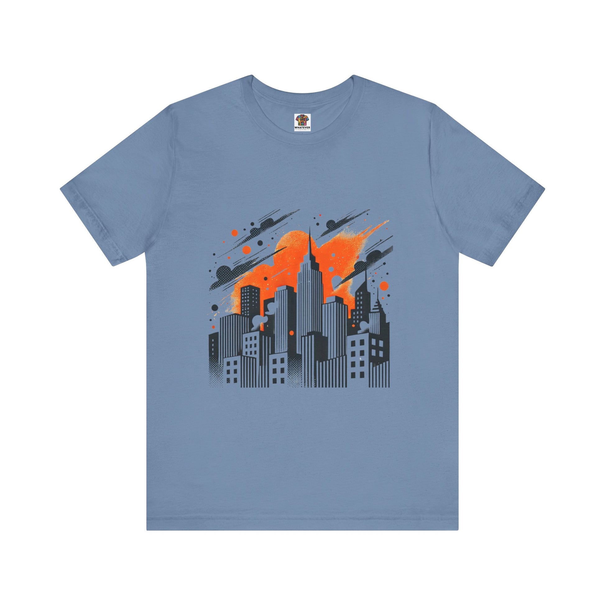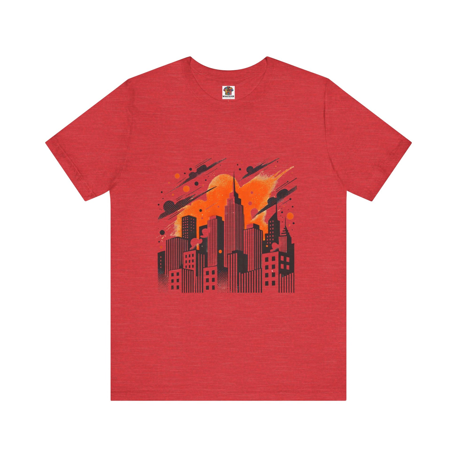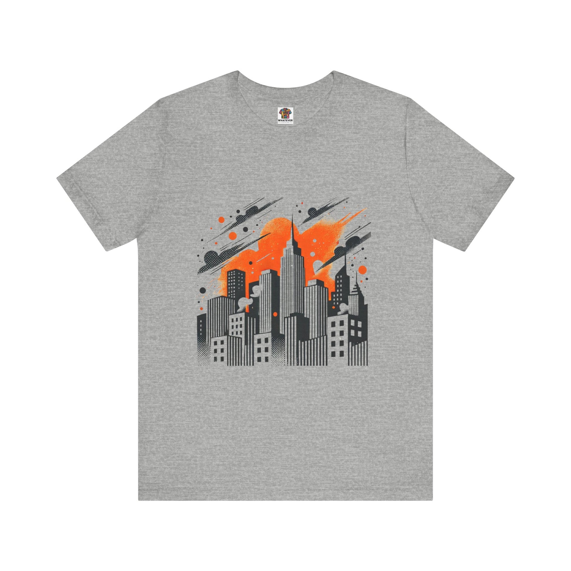 A sharp, geometric city skyline in black with an orange splatter effect in the sky for a dynamic feel.