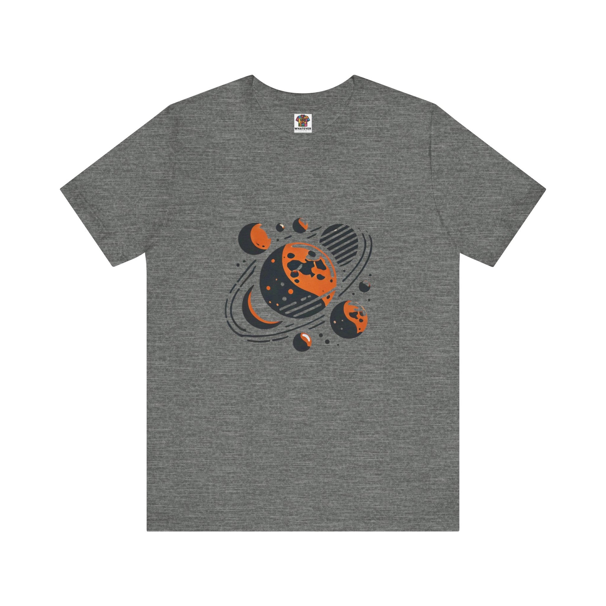 Simplified moons in various phases, orbiting a central object with bold orange highlights.