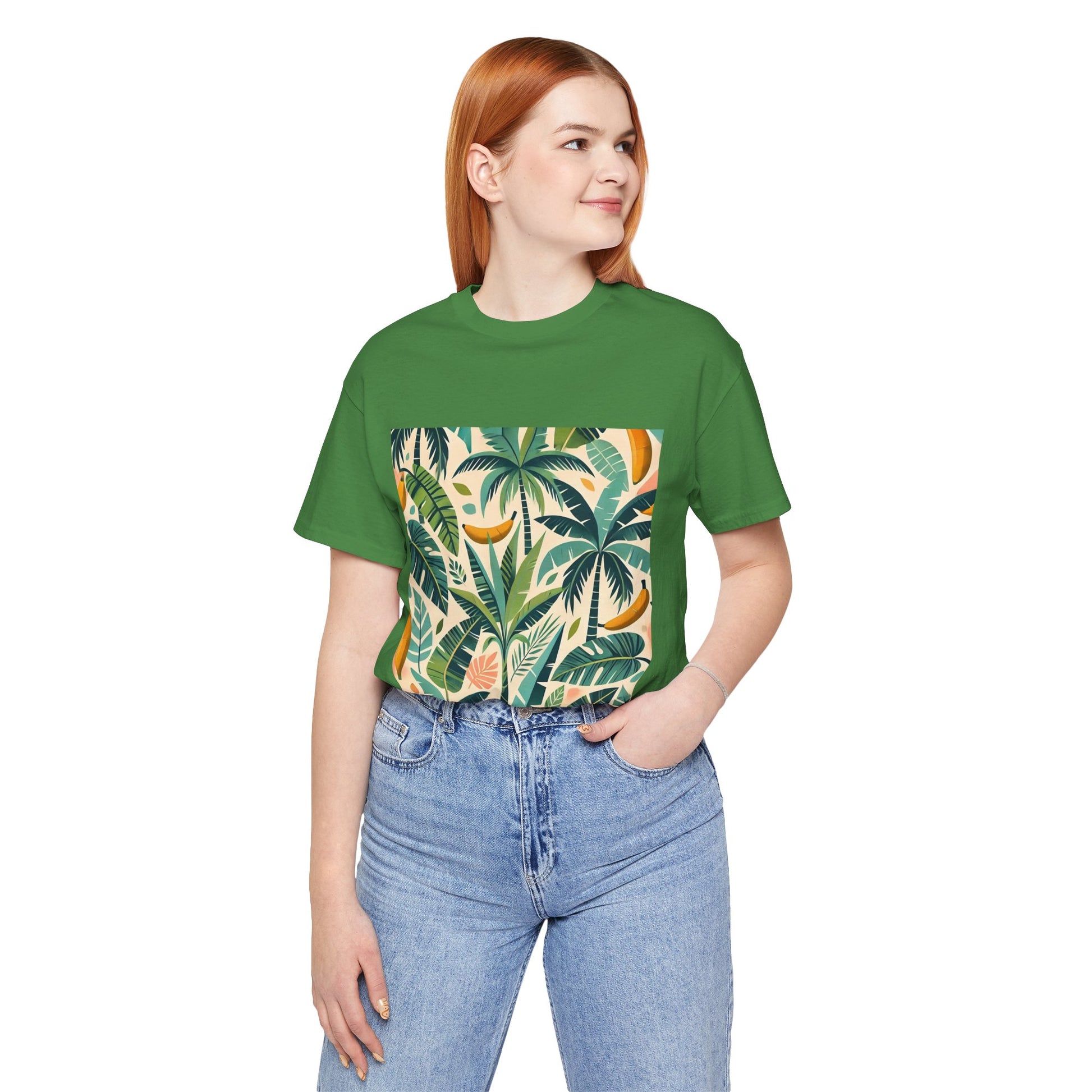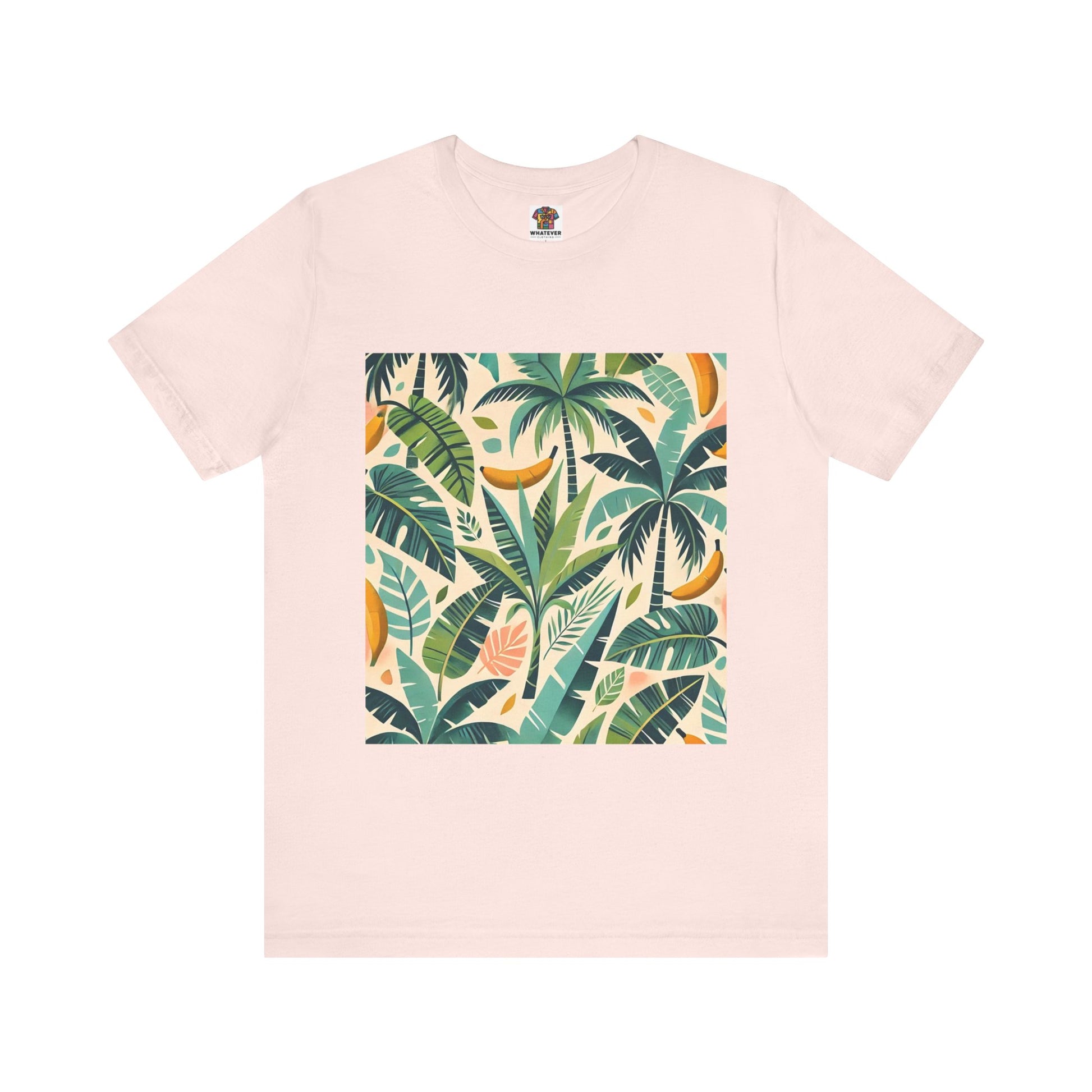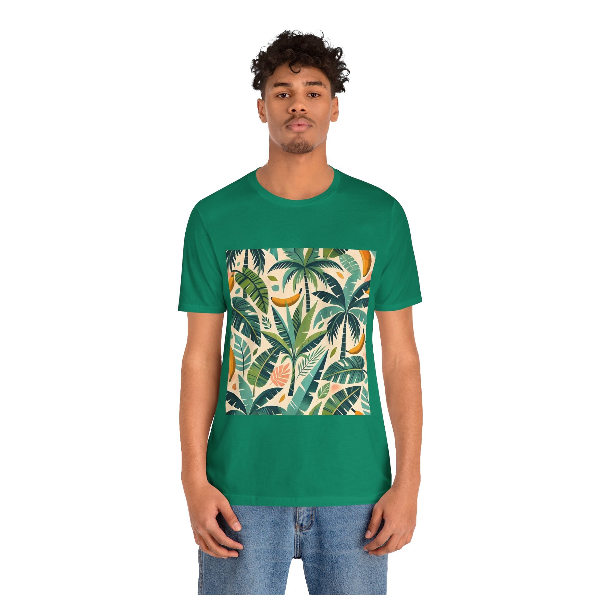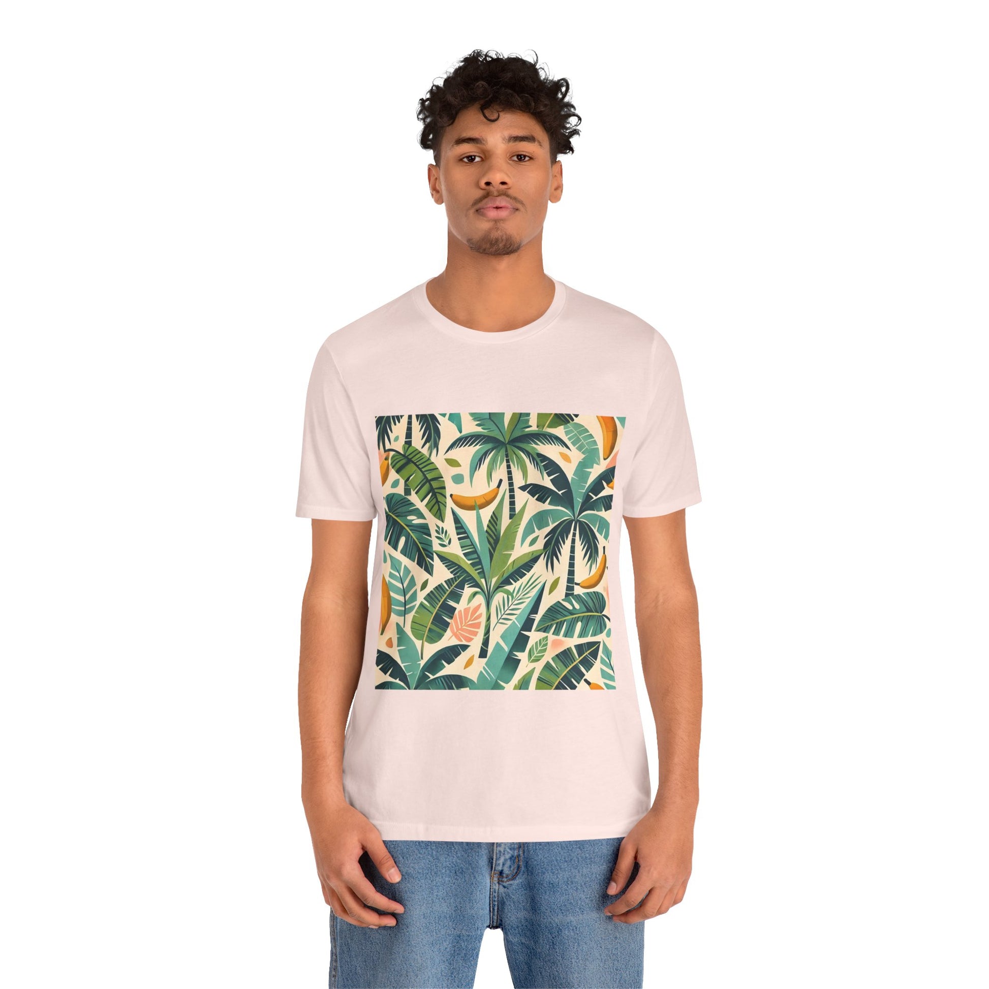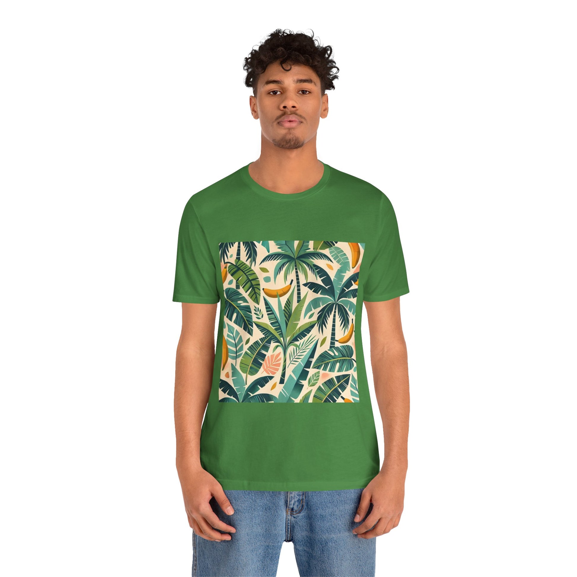 A vibrant pattern of stylized palm trees and banana leaves in bold shades of green, scattered across a soft pastel background, perfect for tropical clothing.