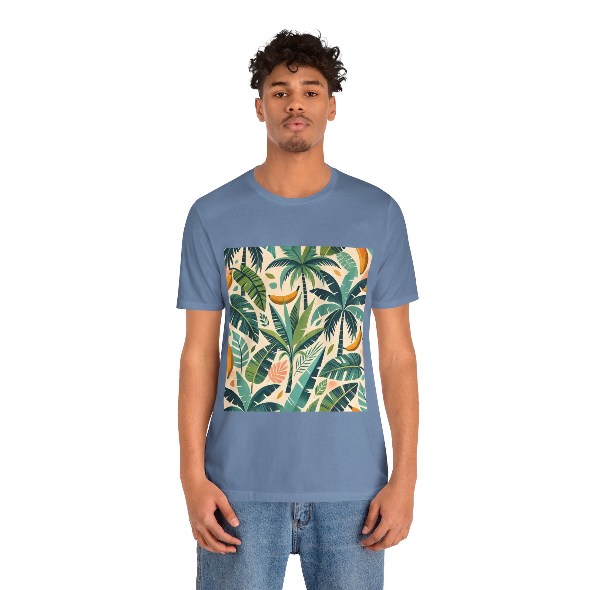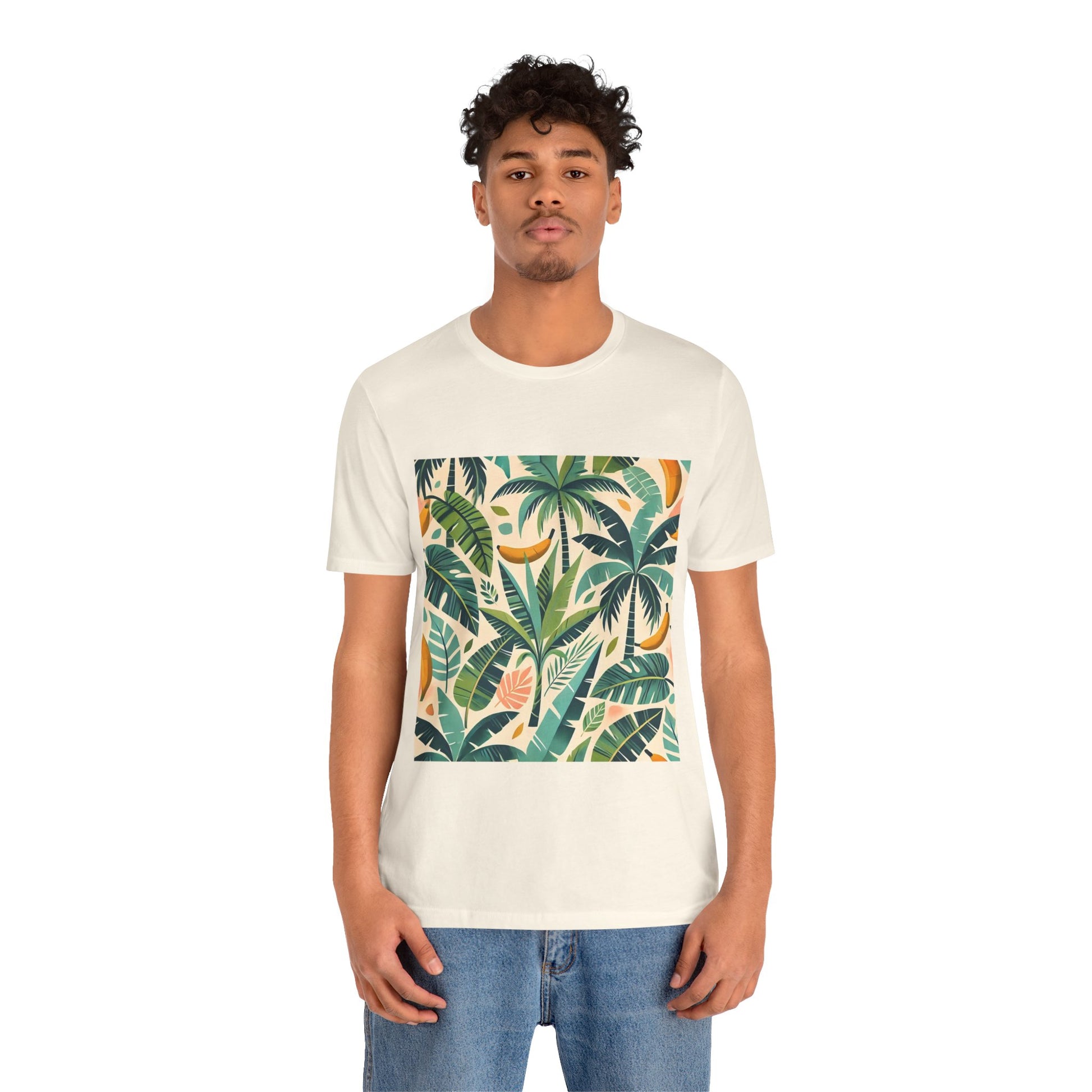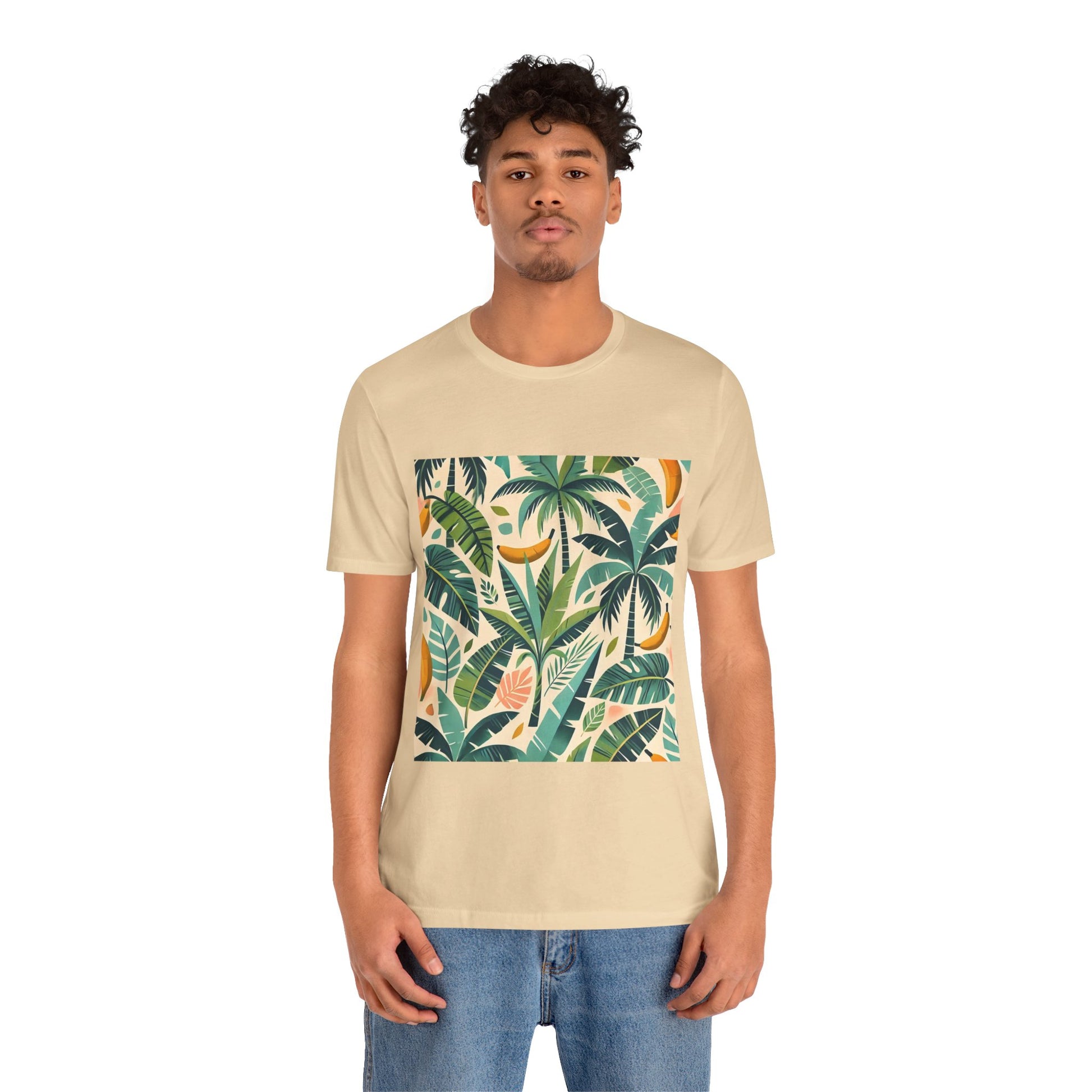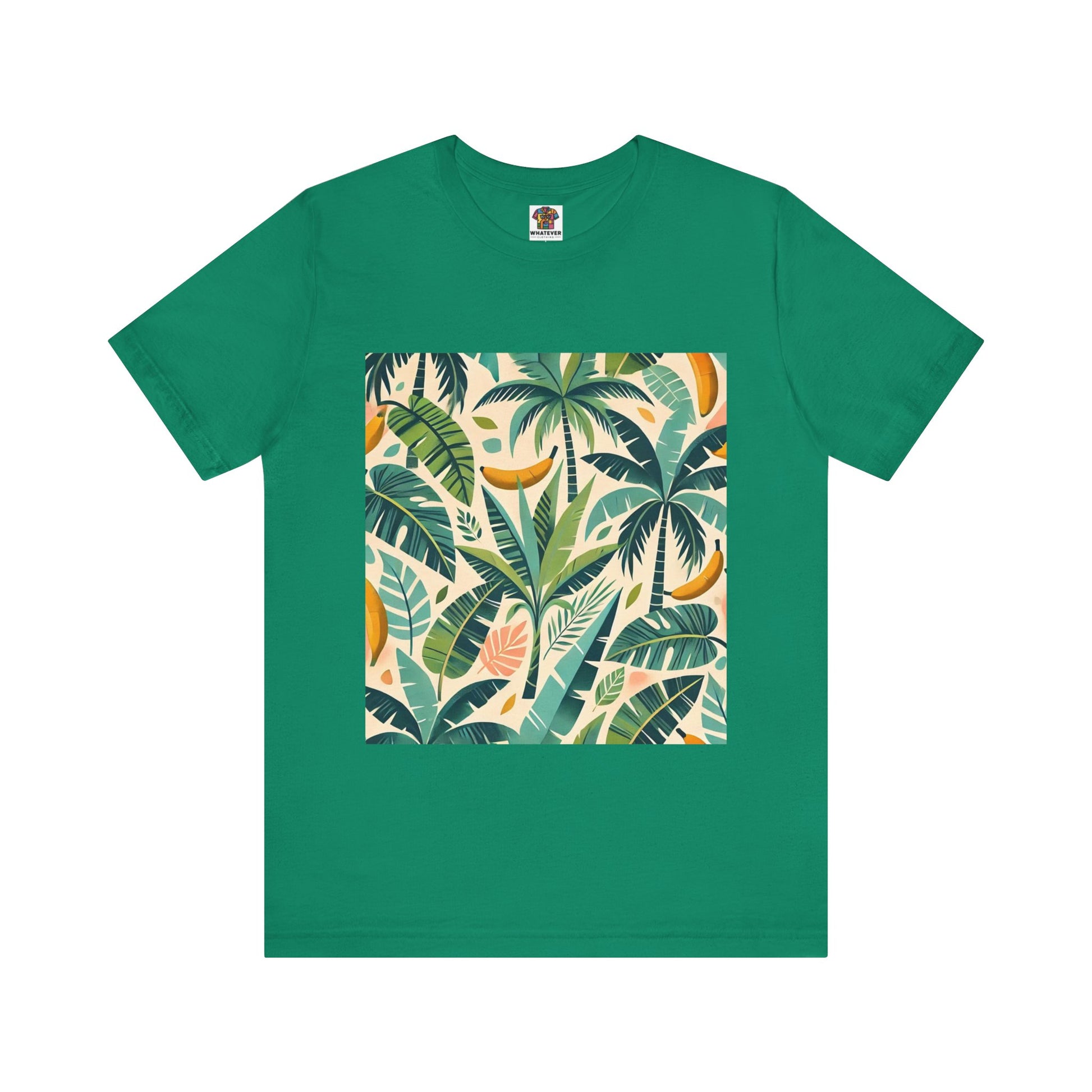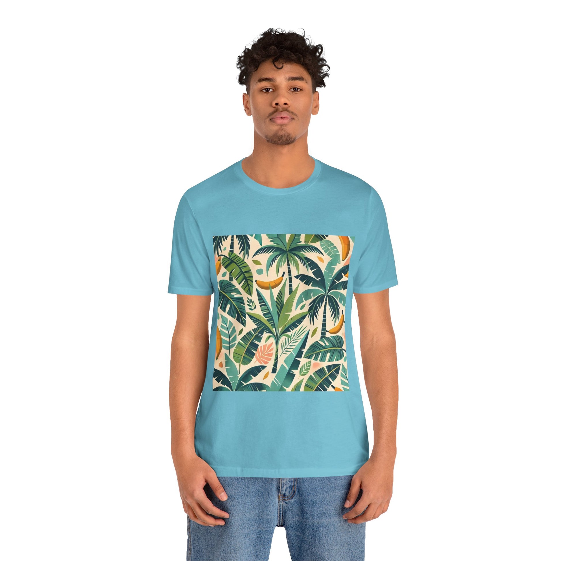 A vibrant pattern of stylized palm trees and banana leaves in bold shades of green, scattered across a soft pastel background, perfect for tropical clothing.