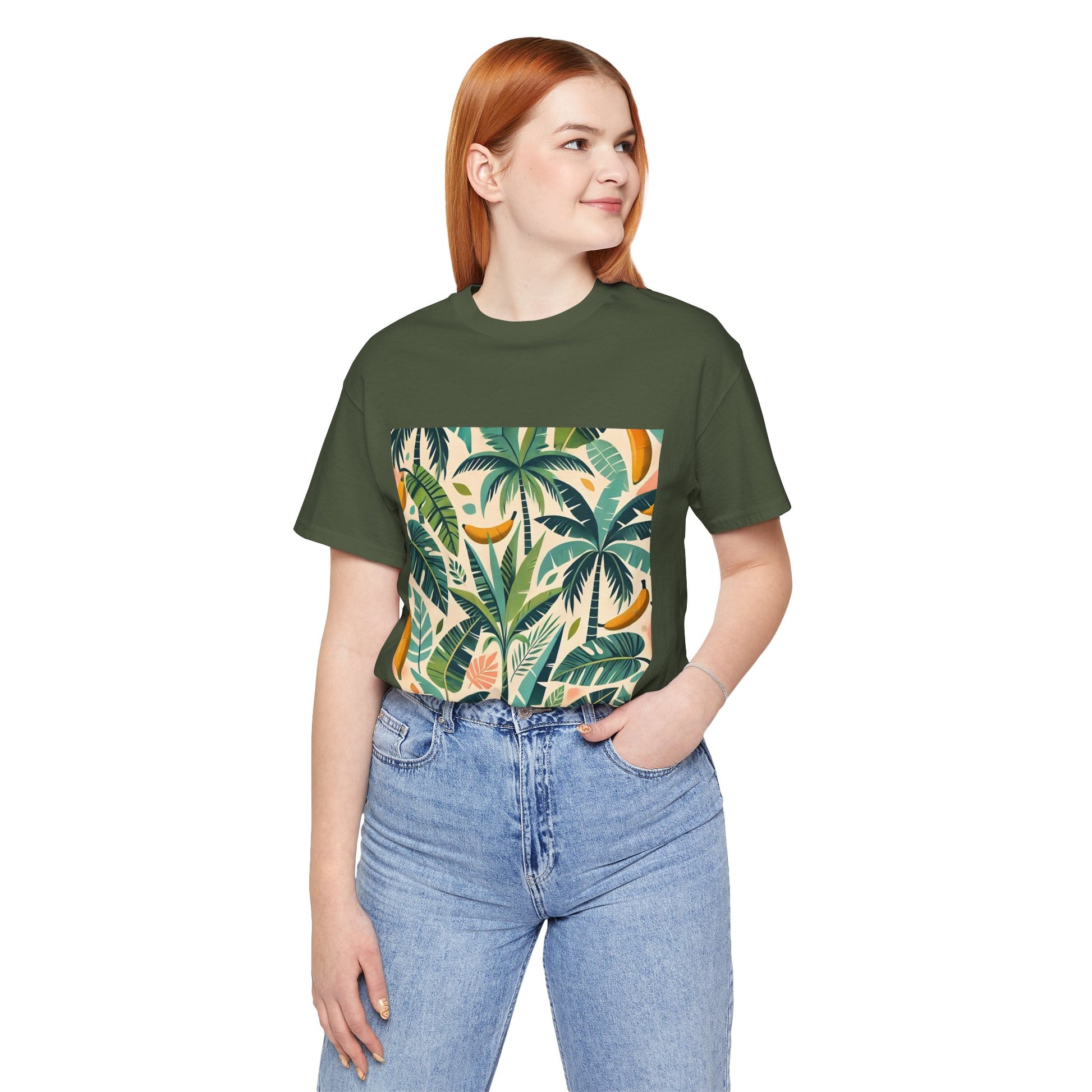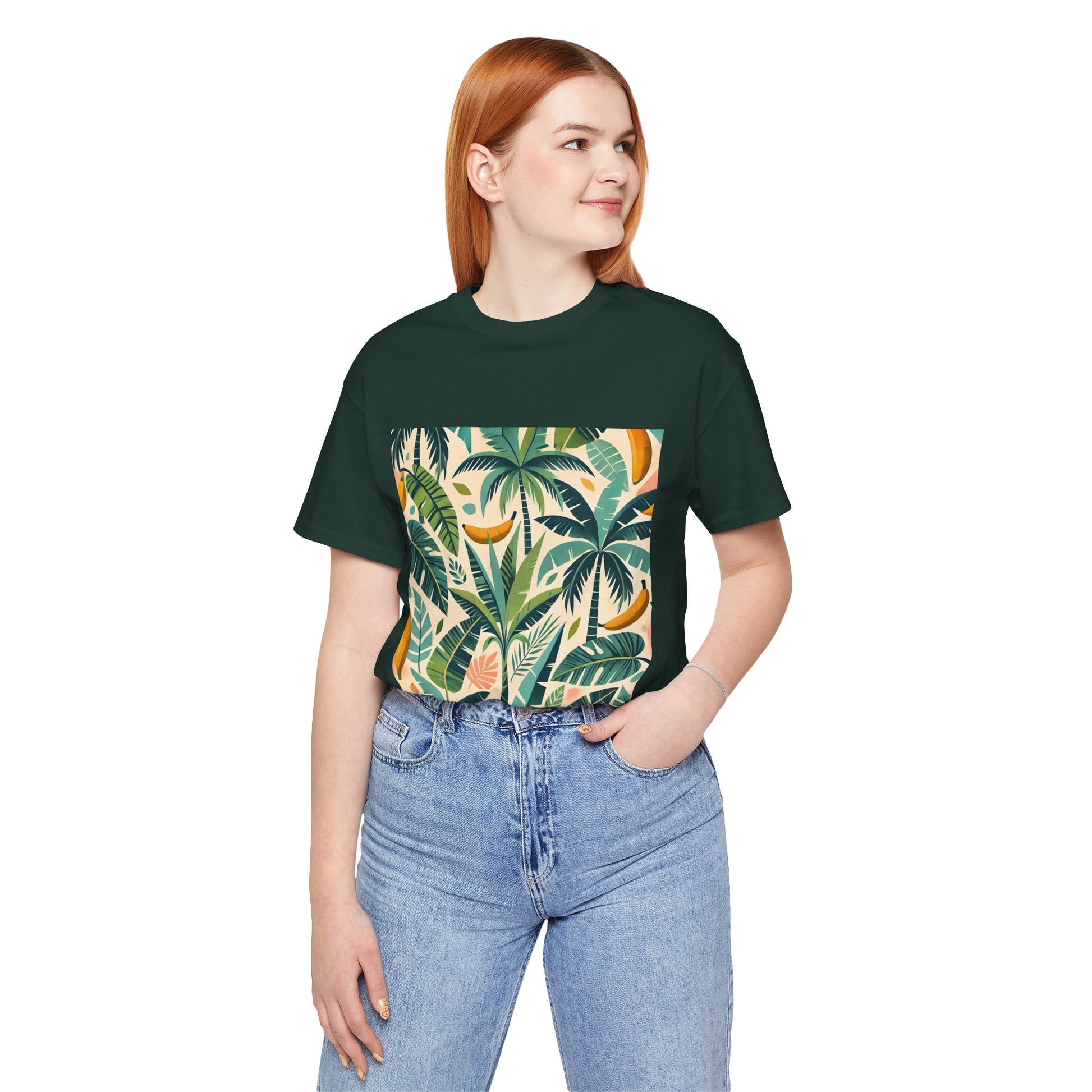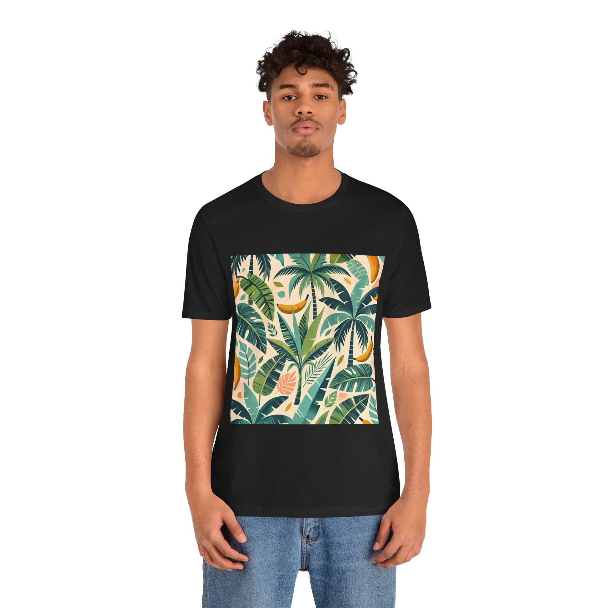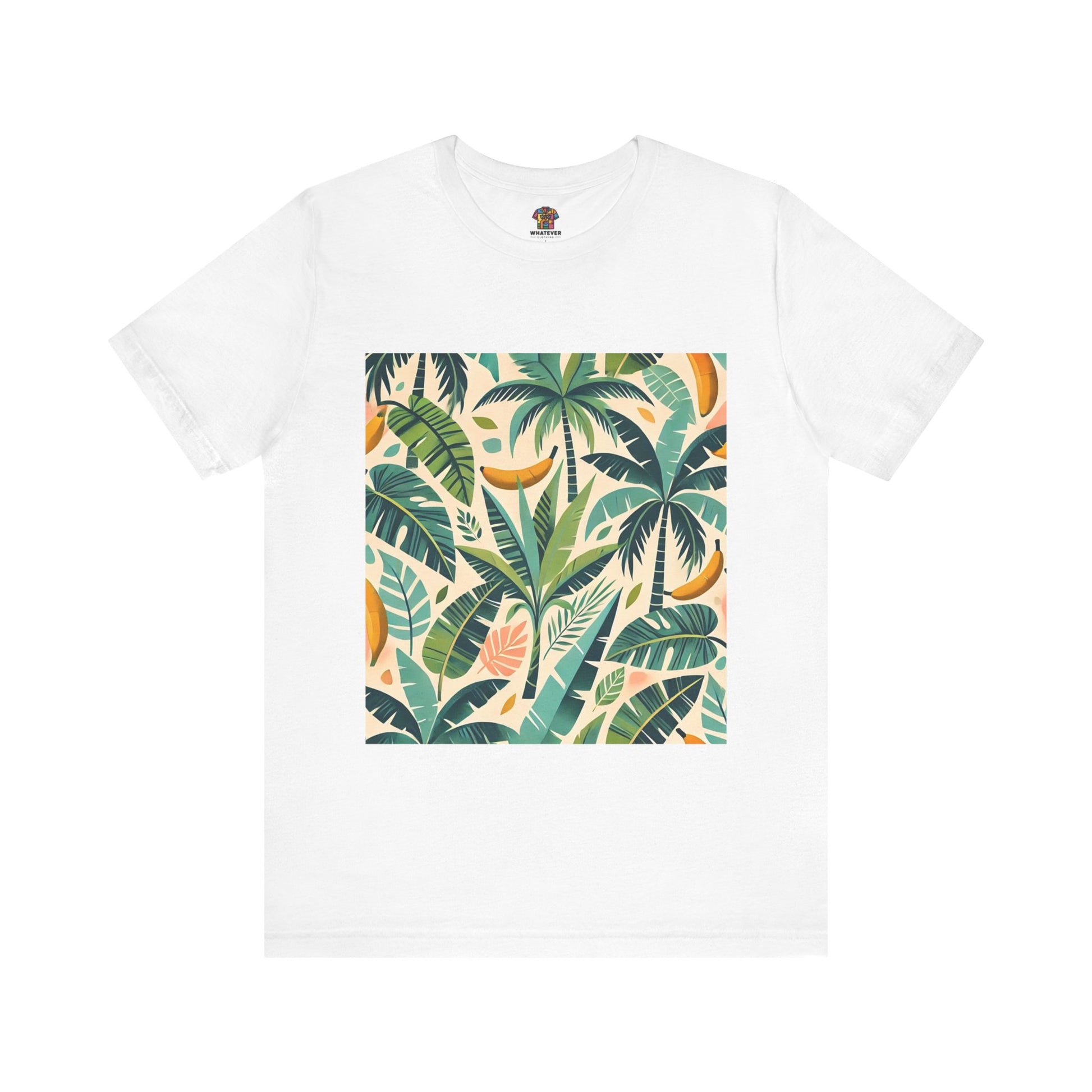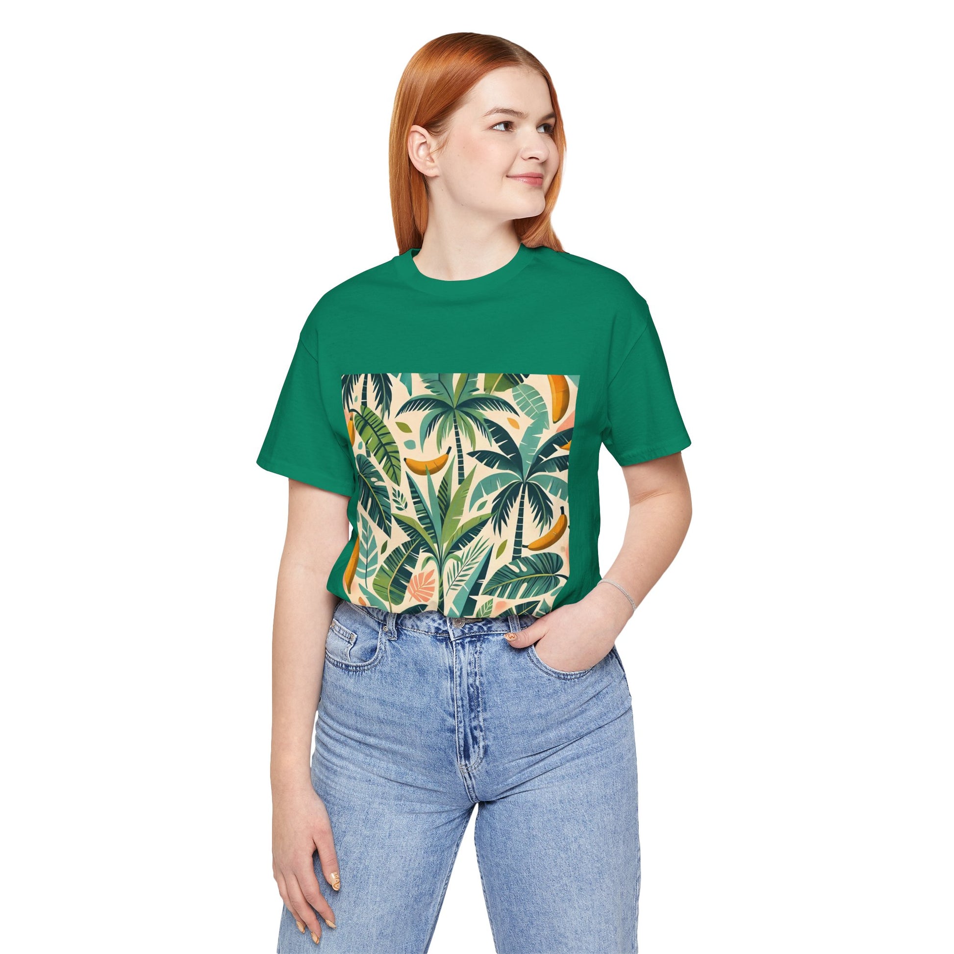 A vibrant pattern of stylized palm trees and banana leaves in bold shades of green, scattered across a soft pastel background, perfect for tropical clothing.