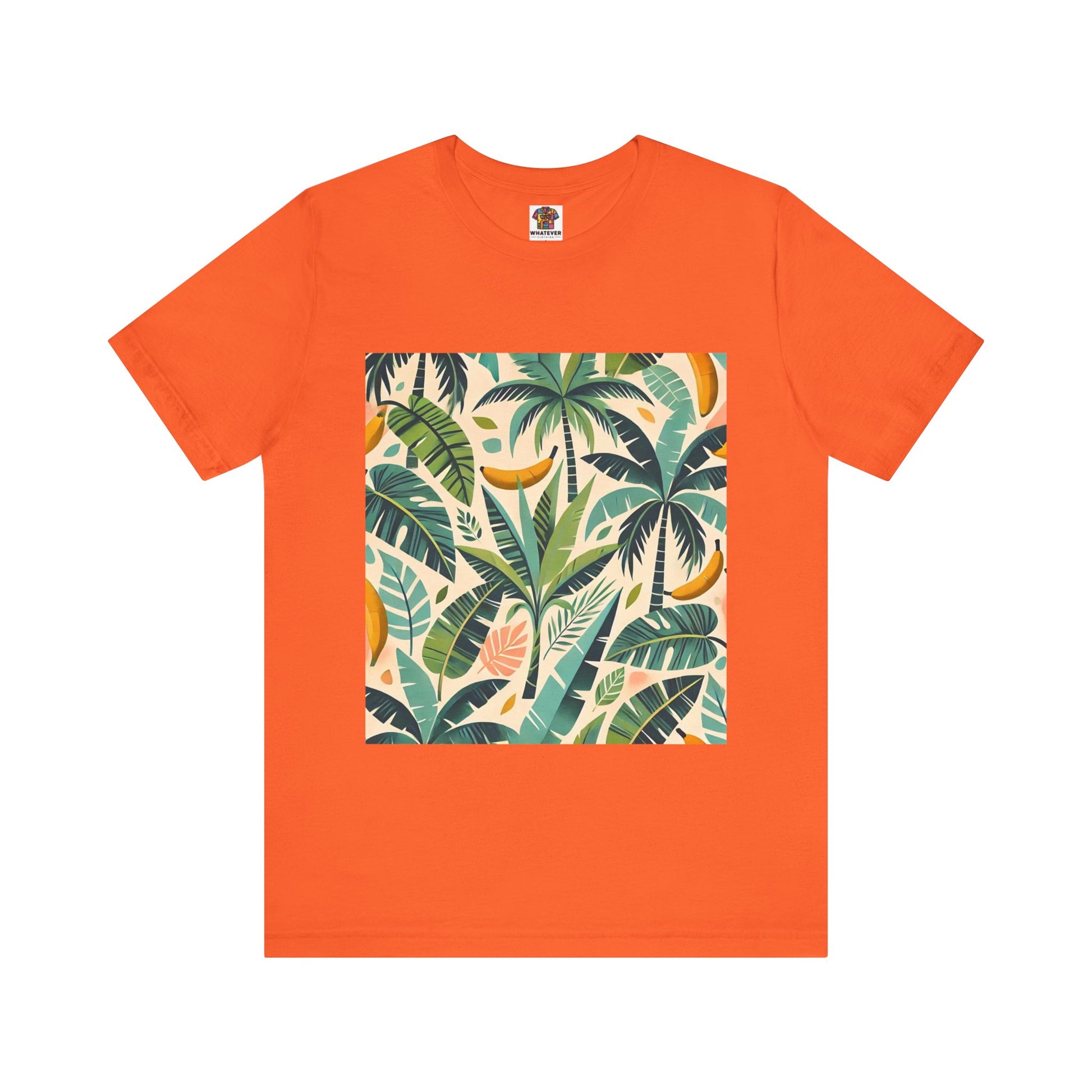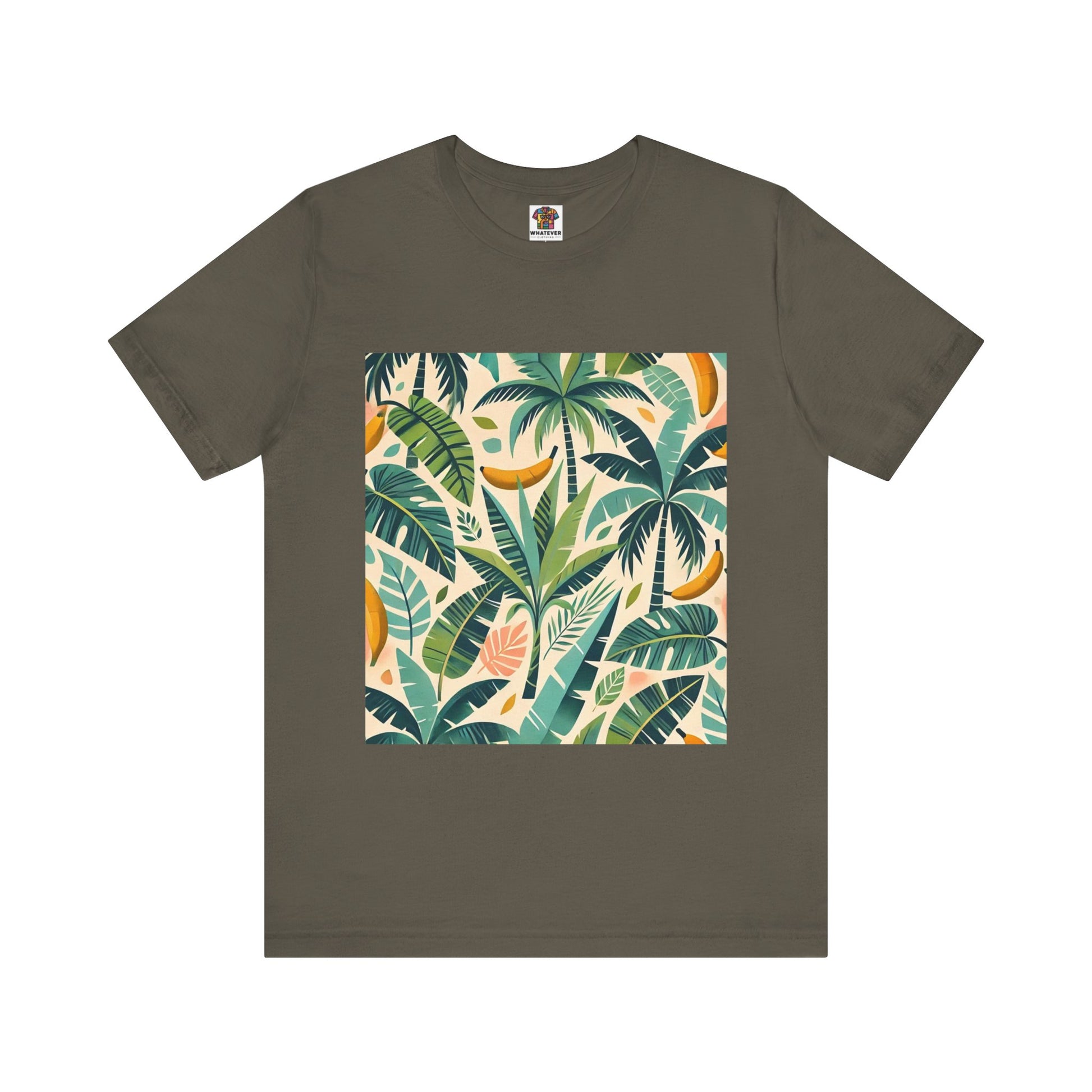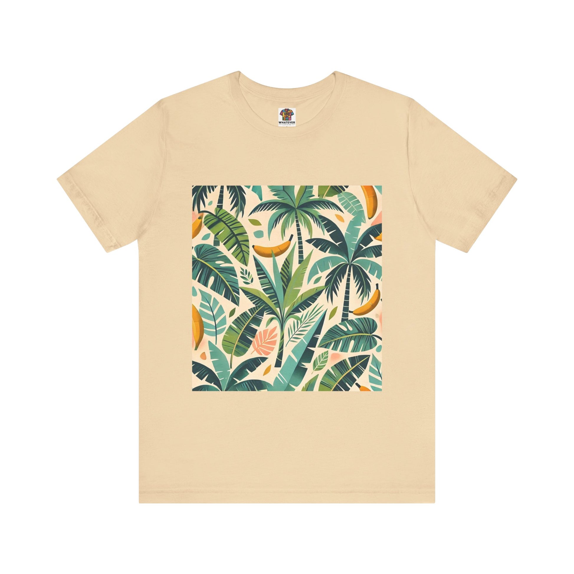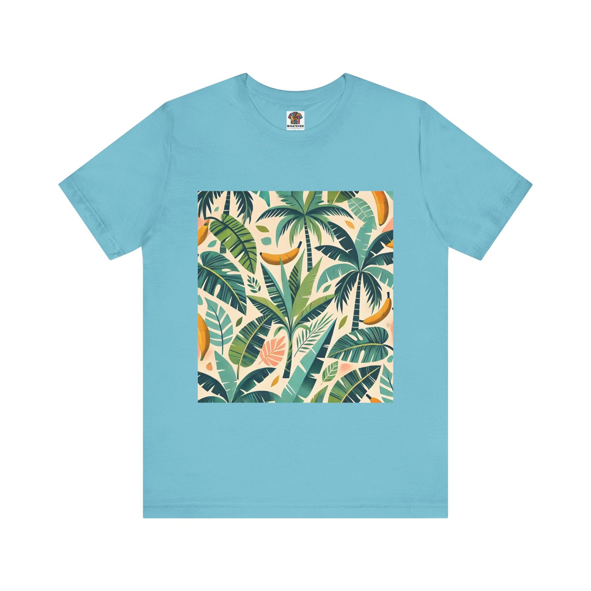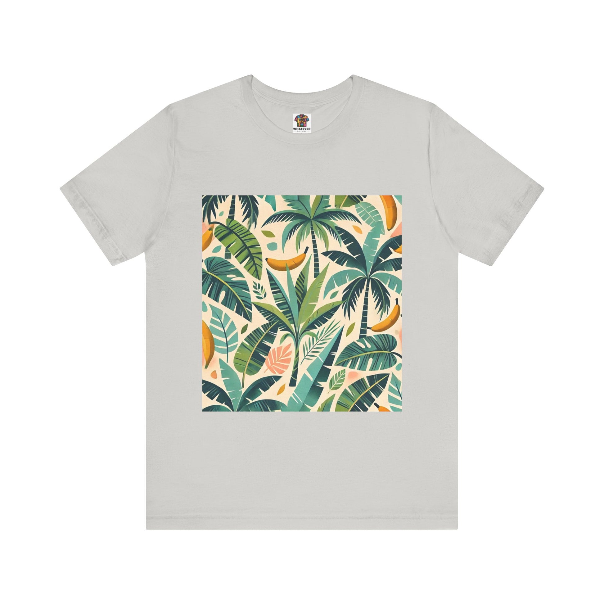 A vibrant pattern of stylized palm trees and banana leaves in bold shades of green, scattered across a soft pastel background, perfect for tropical clothing.