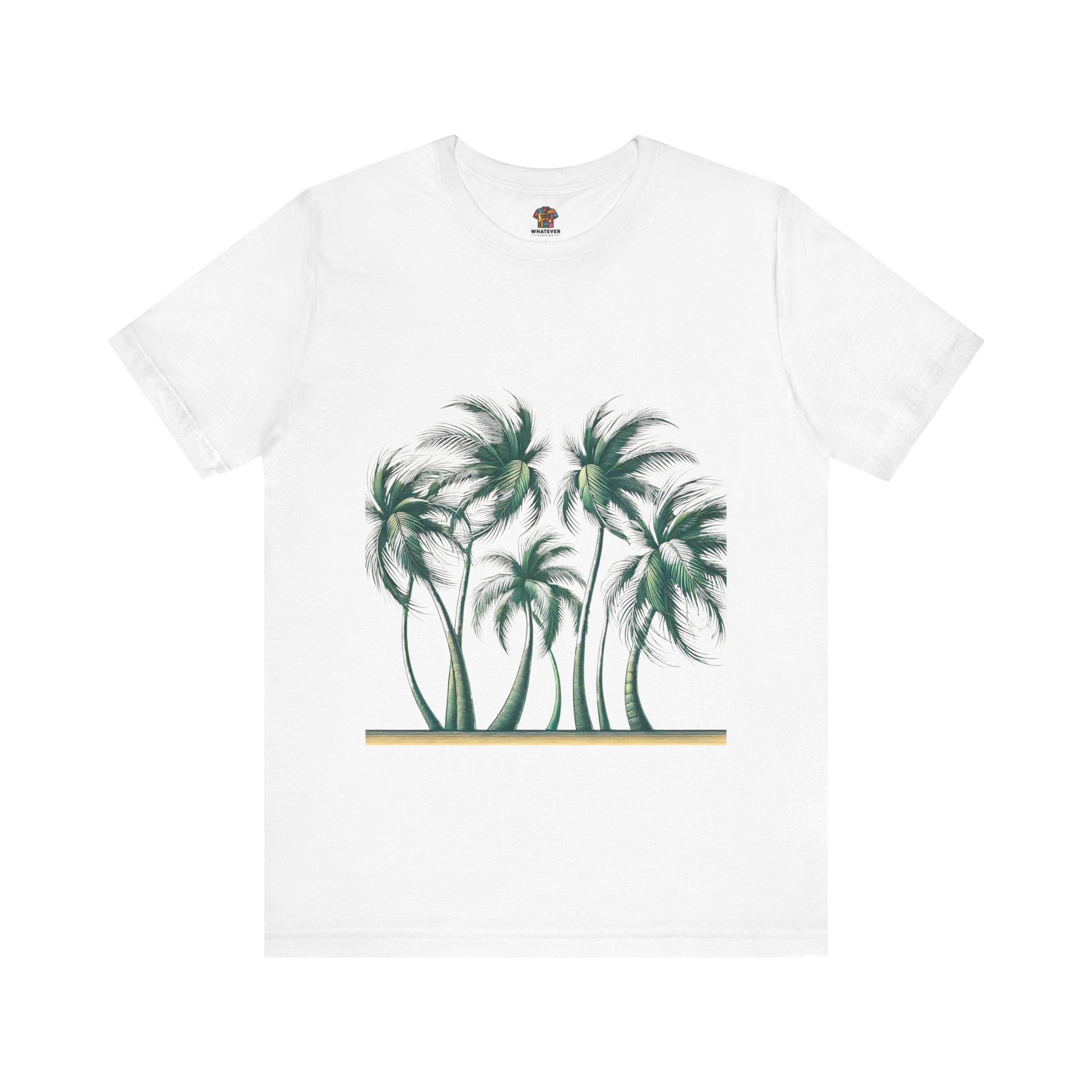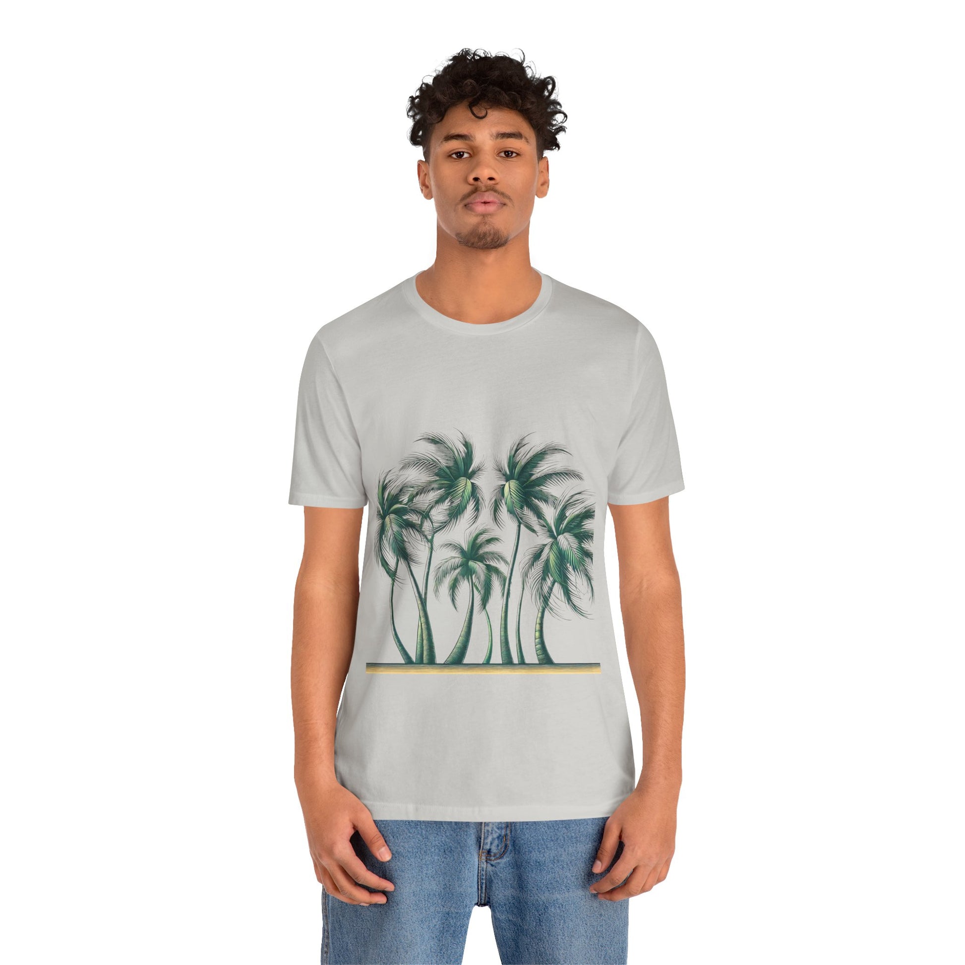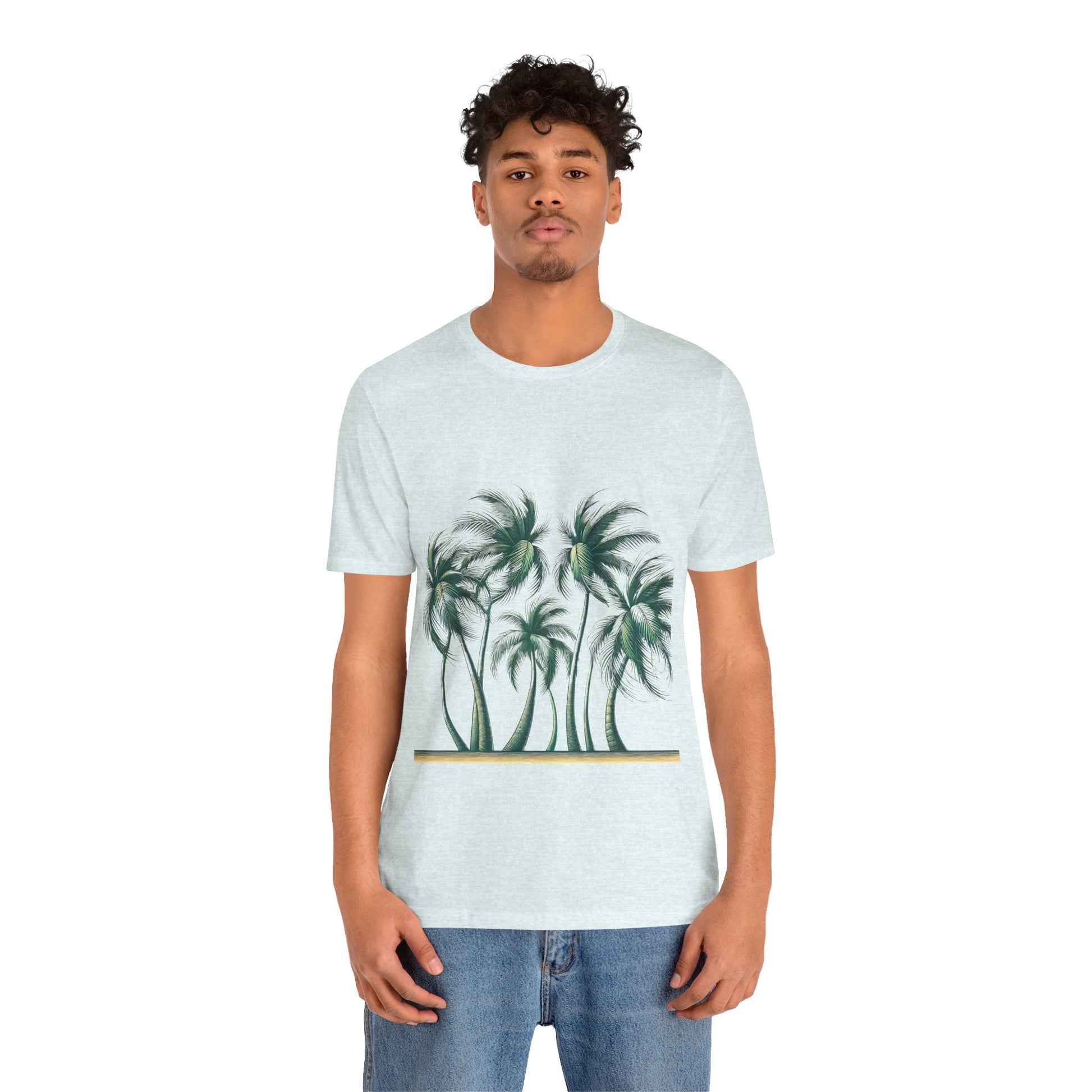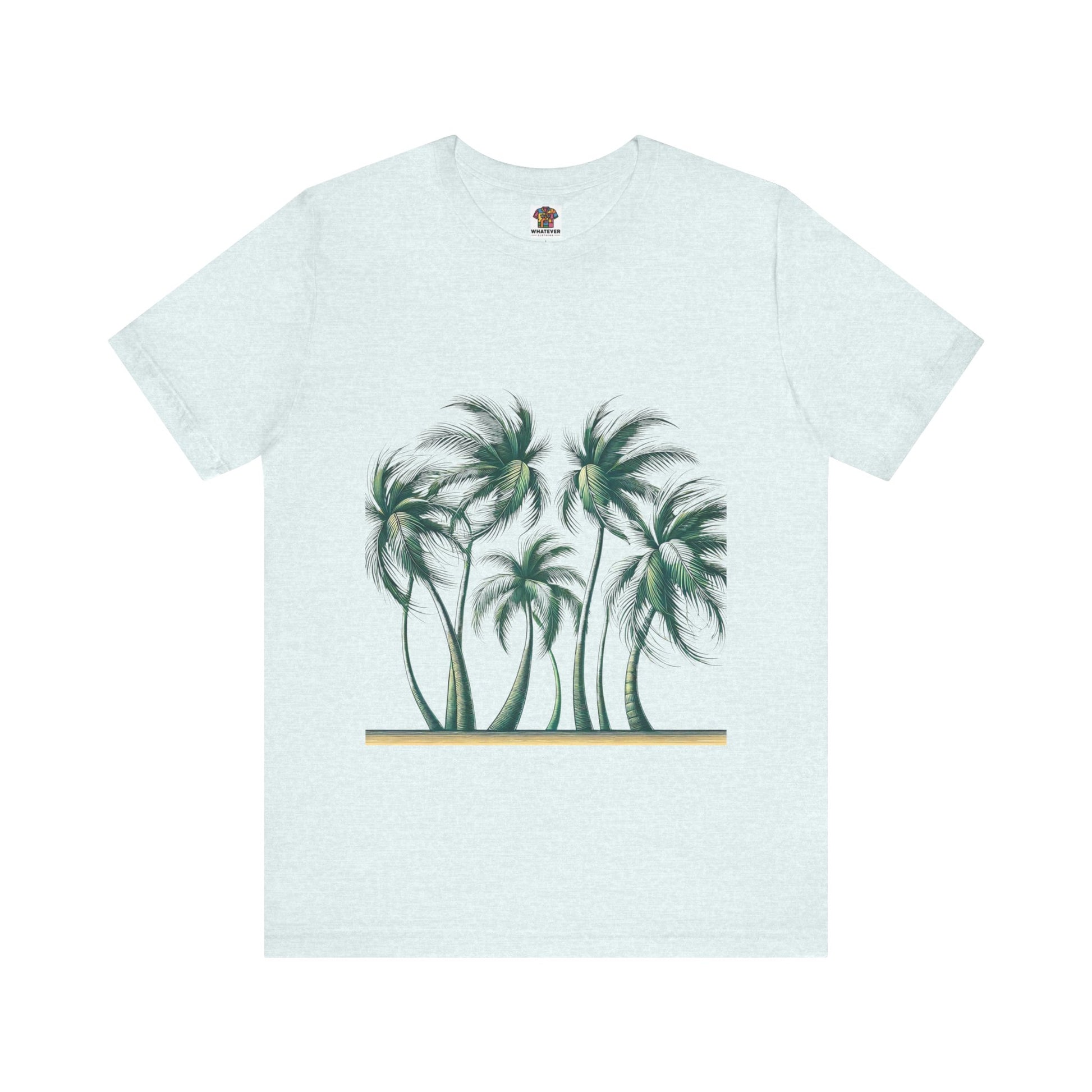 Tall, slender palm trees with intricate leaf patterns, swaying slightly in the wind.