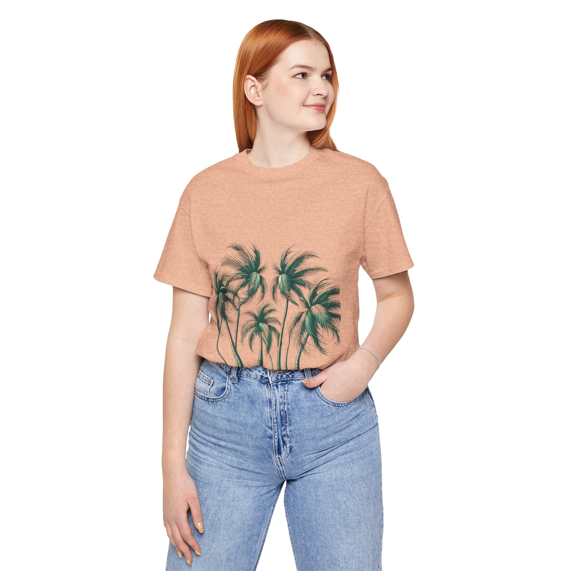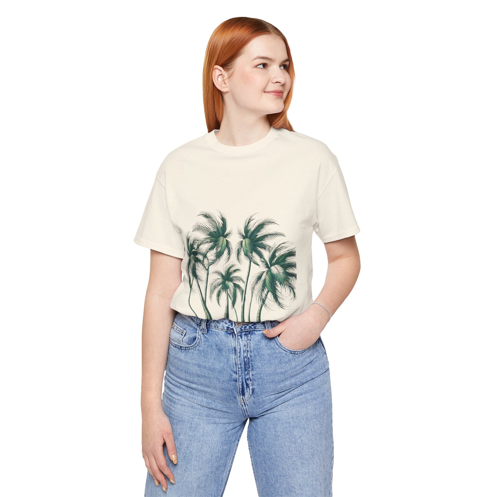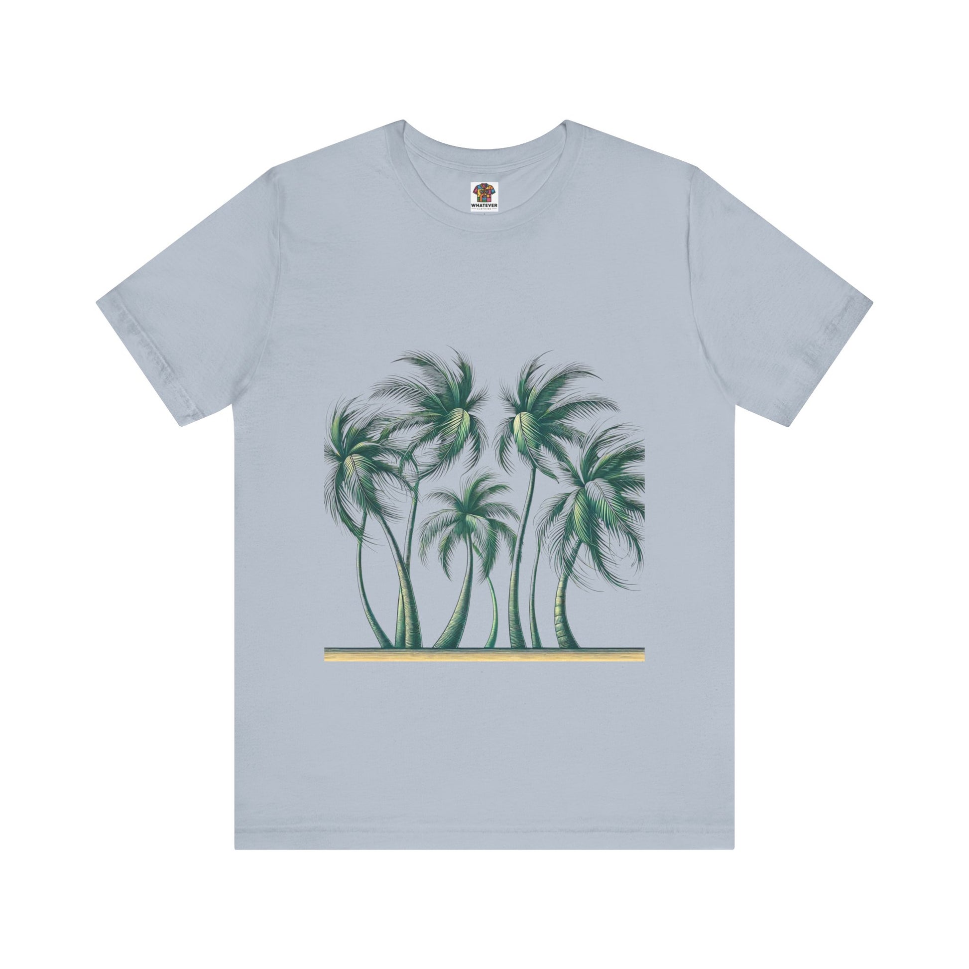 Tall, slender palm trees with intricate leaf patterns, swaying slightly in the wind.