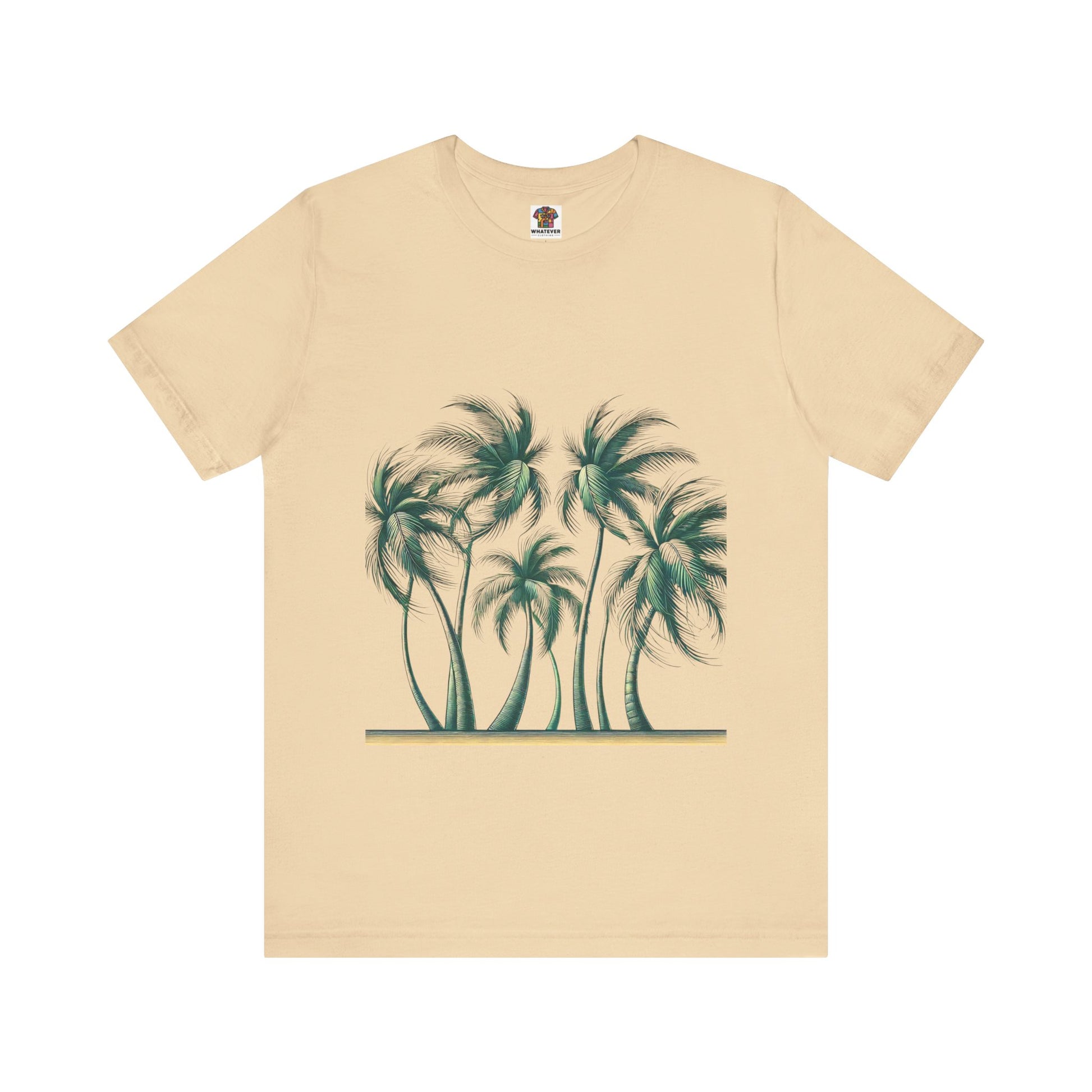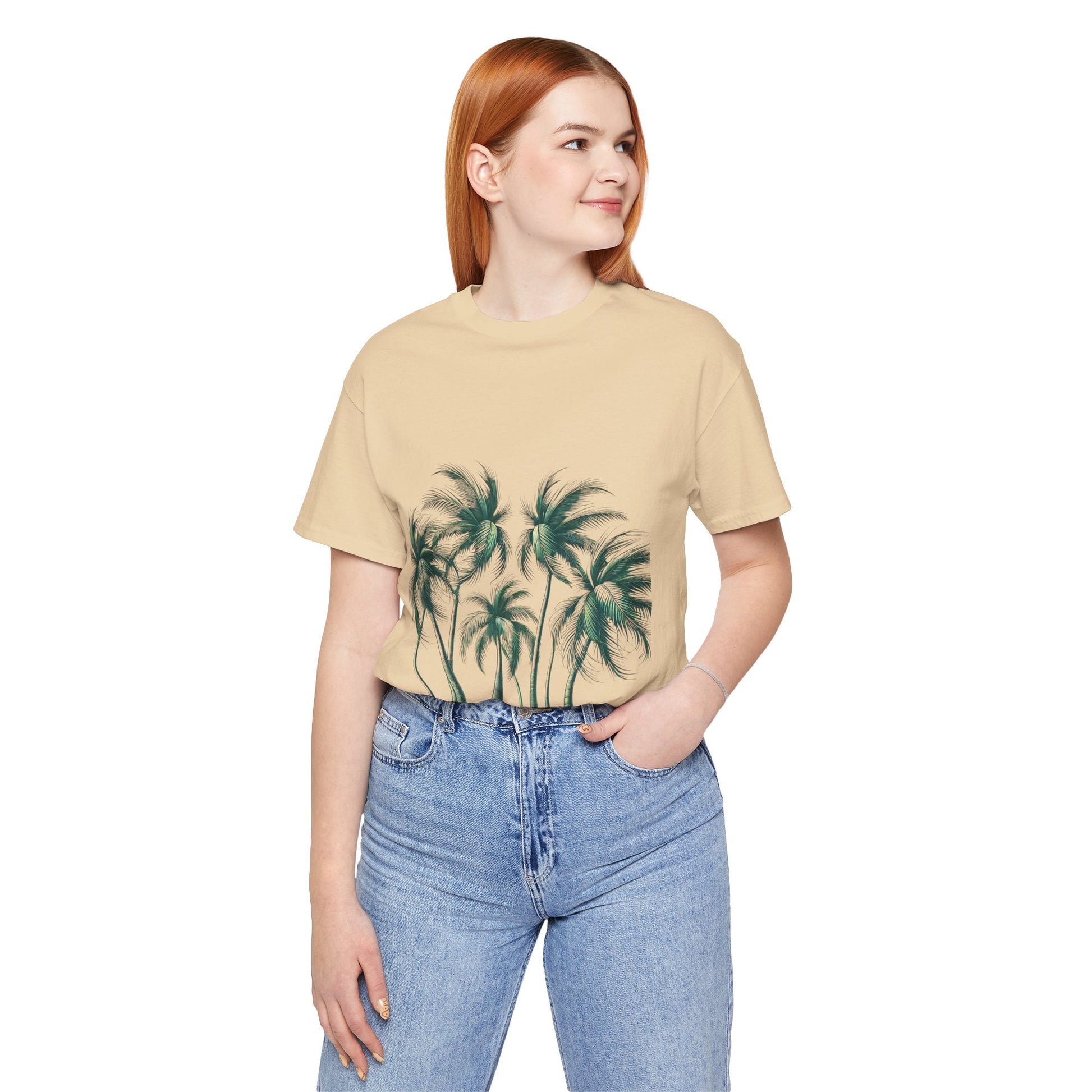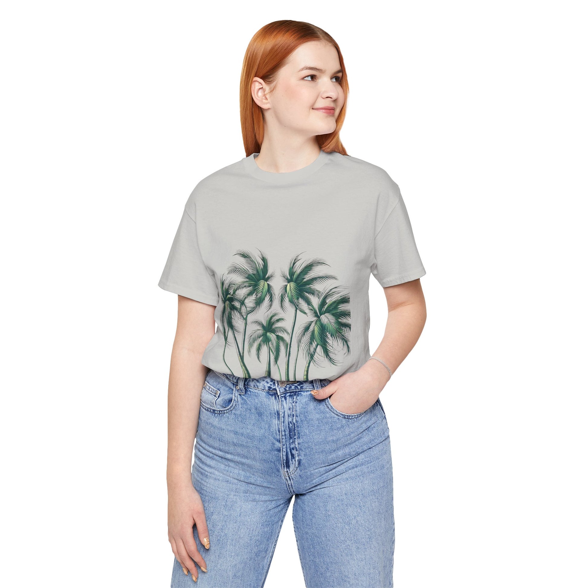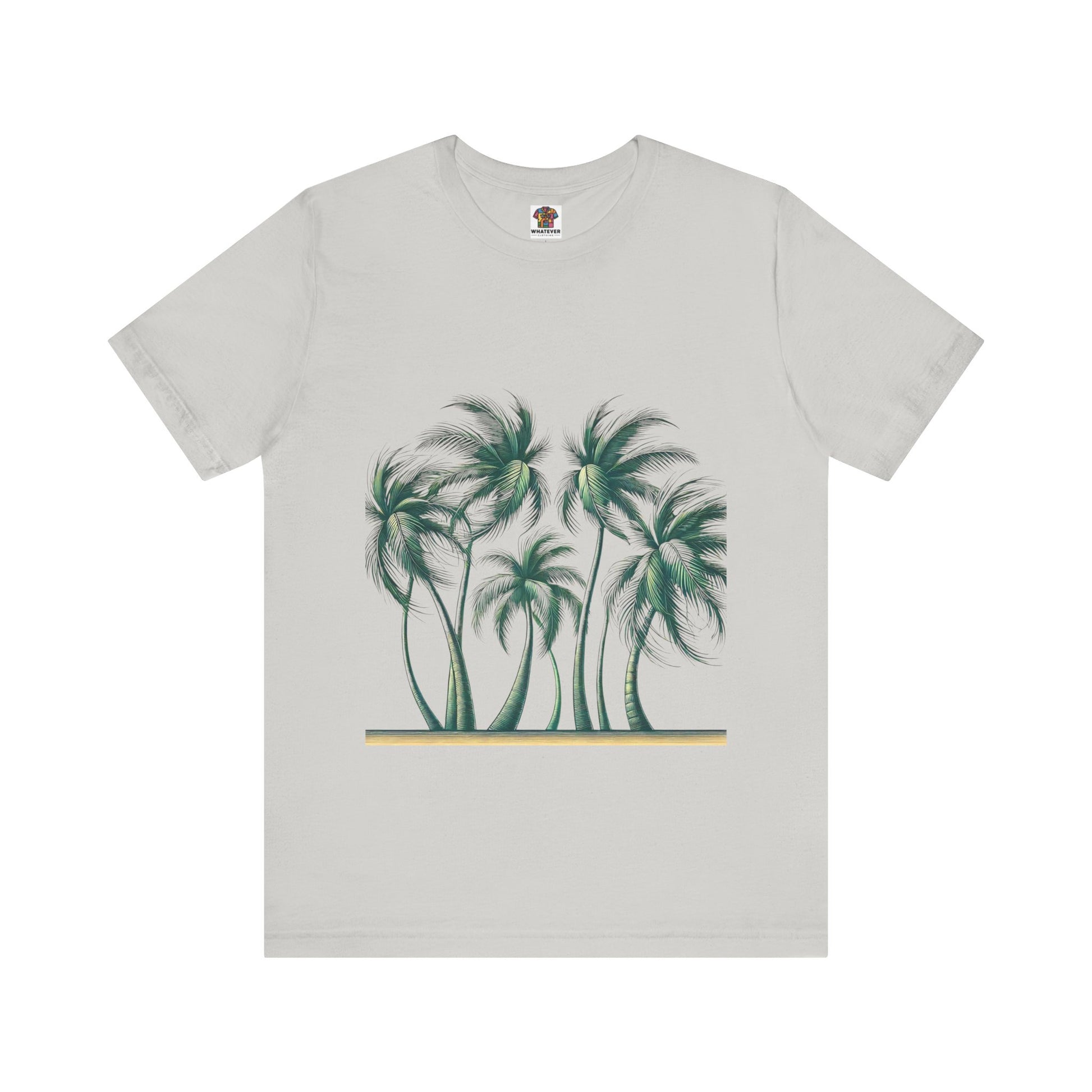 Tall, slender palm trees with intricate leaf patterns, swaying slightly in the wind.