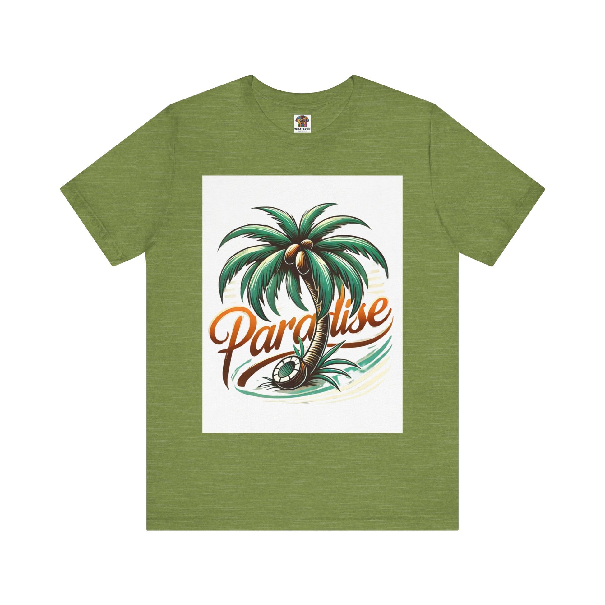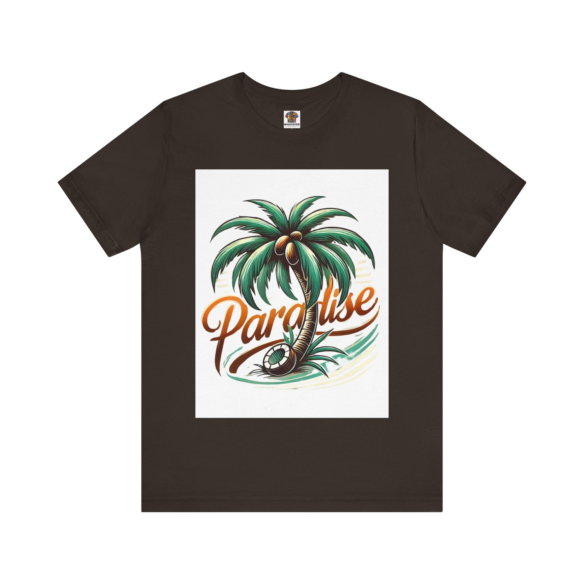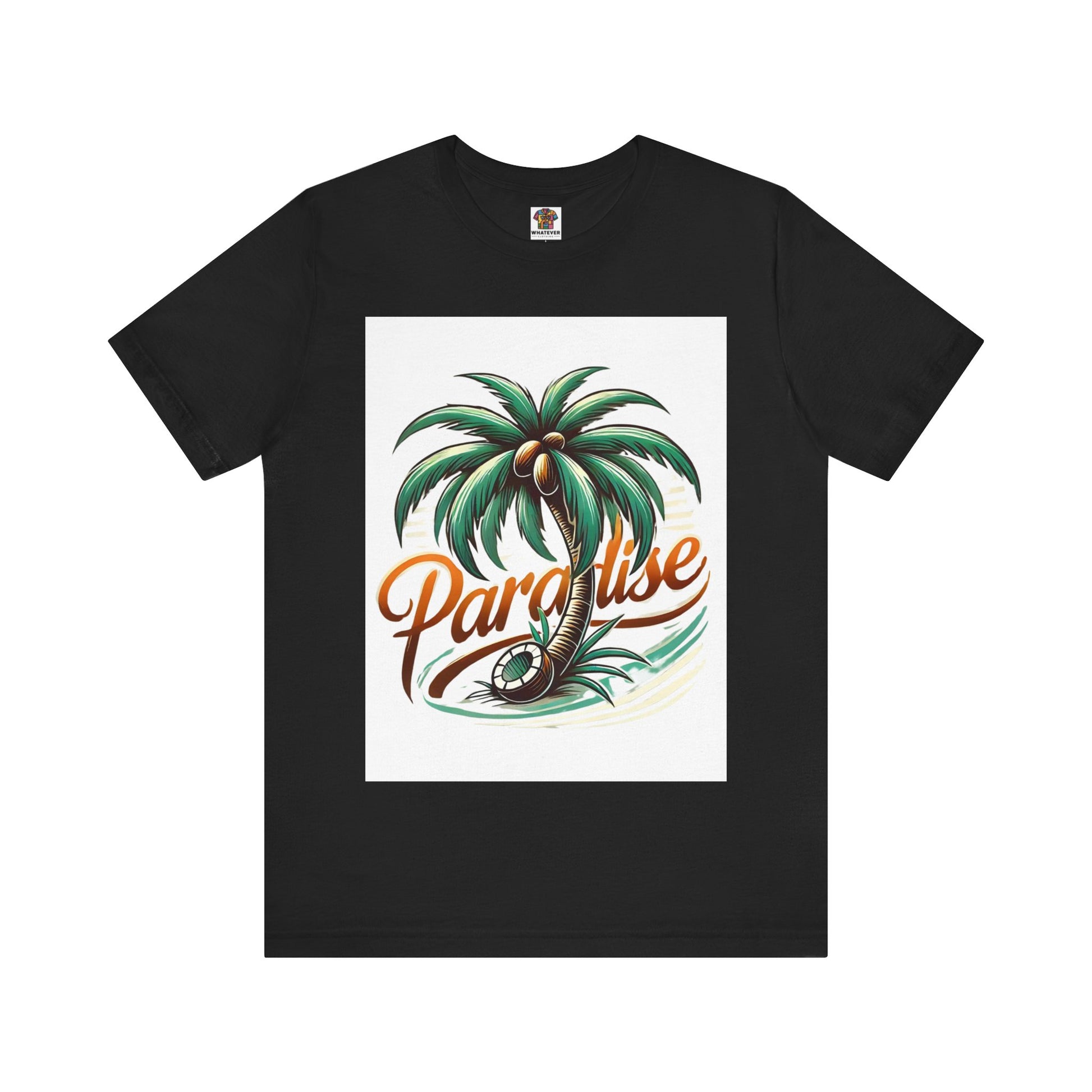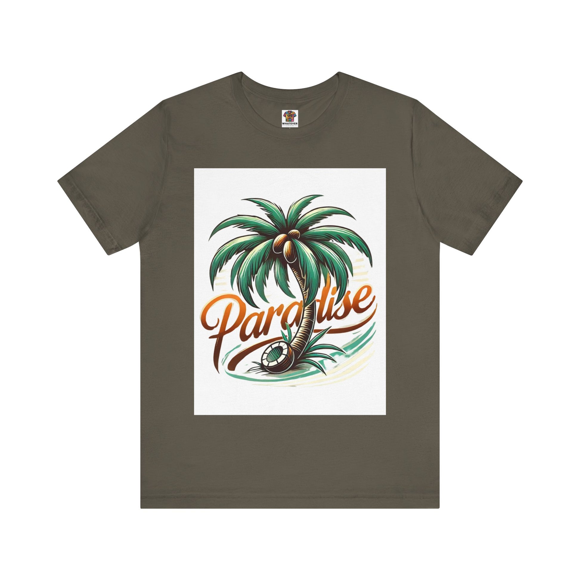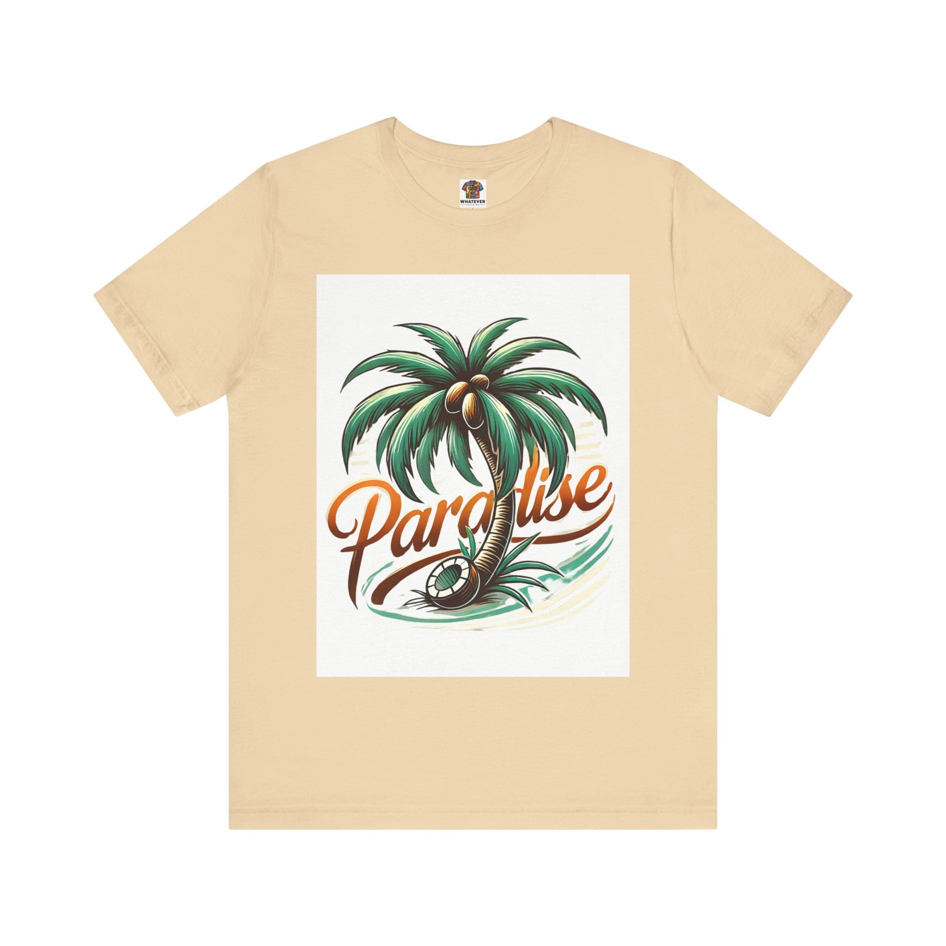 A tropical palm tree with coconuts and graffiti-style "Paradise" text in warm sandy hues. Serene and inviting, ideal for tropical escapes.