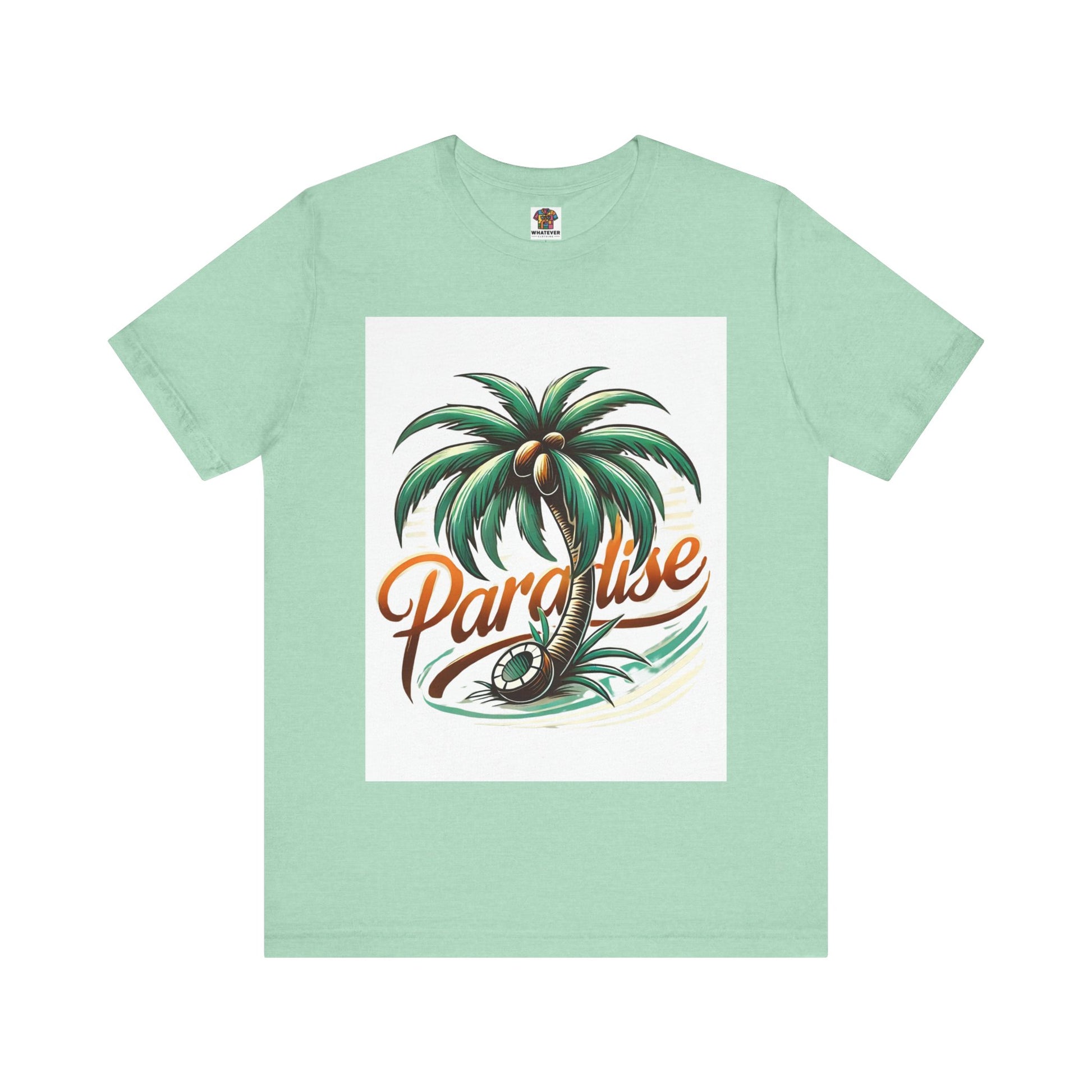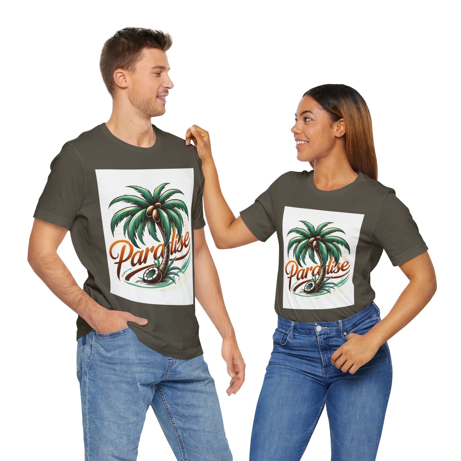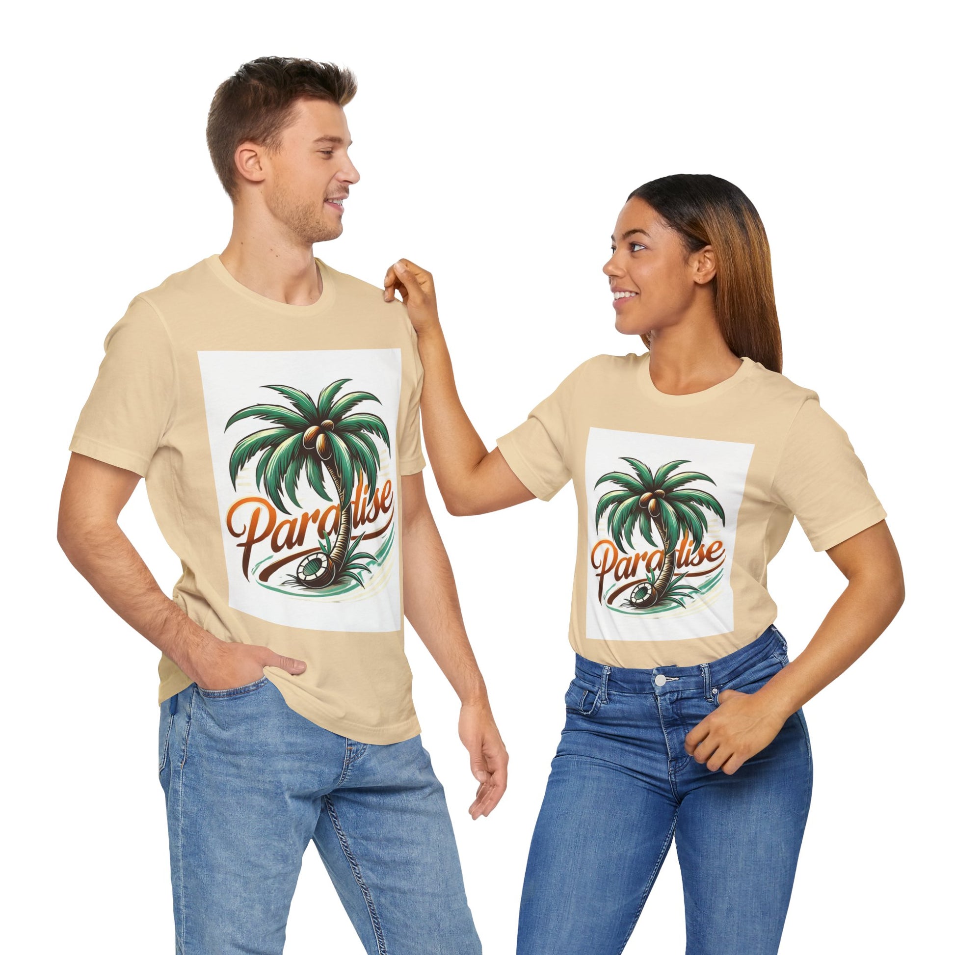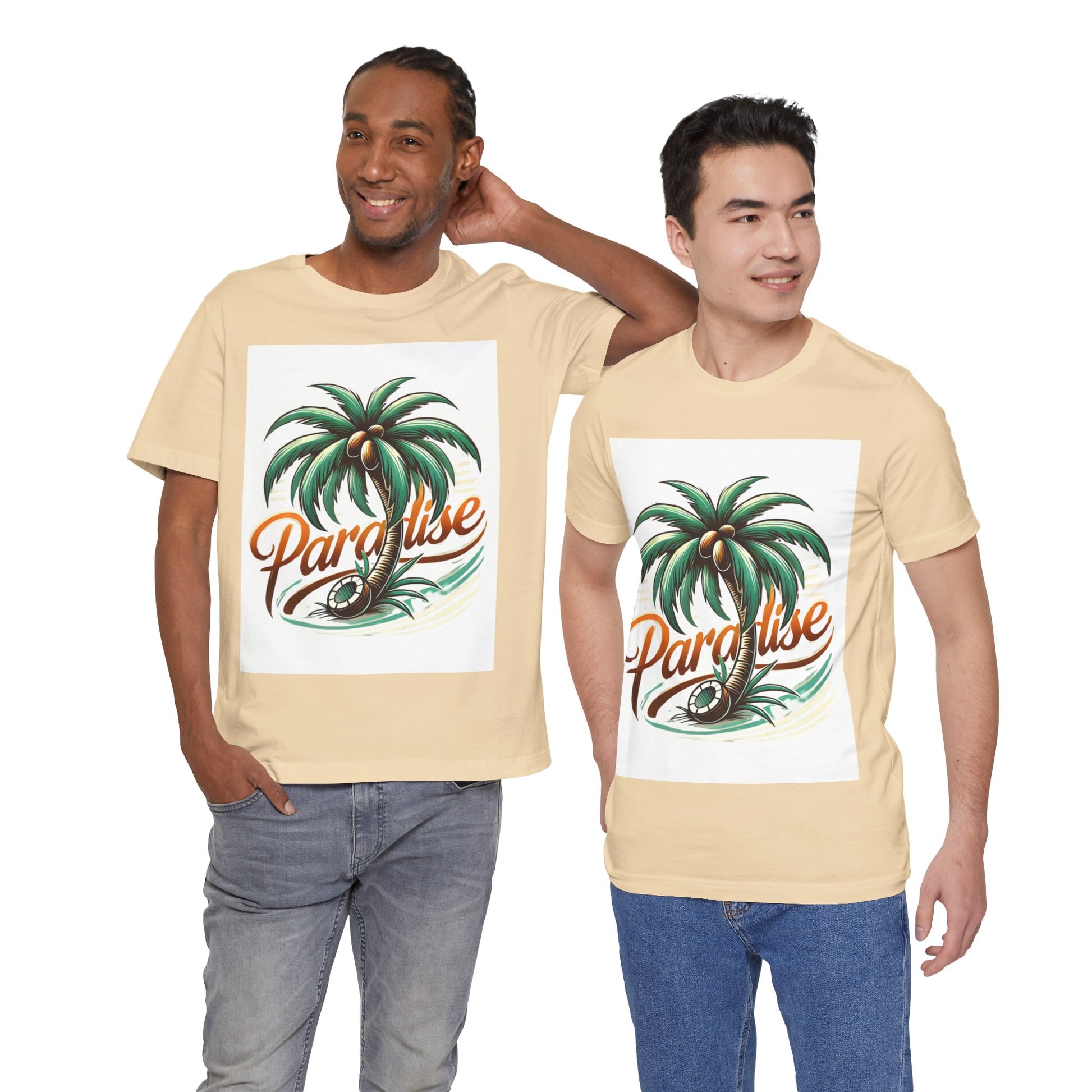 A tropical palm tree with coconuts and graffiti-style "Paradise" text in warm sandy hues. Serene and inviting, ideal for tropical escapes.