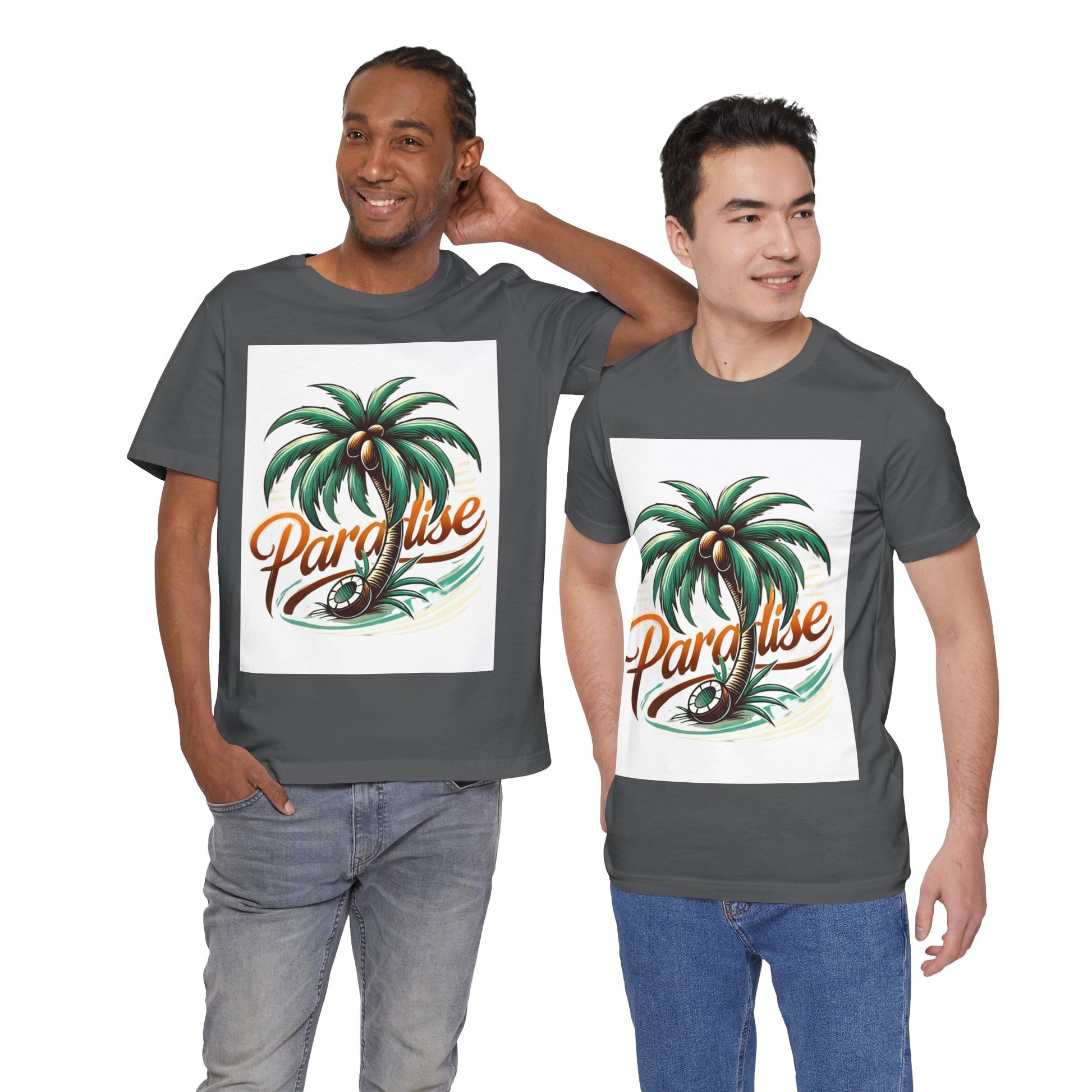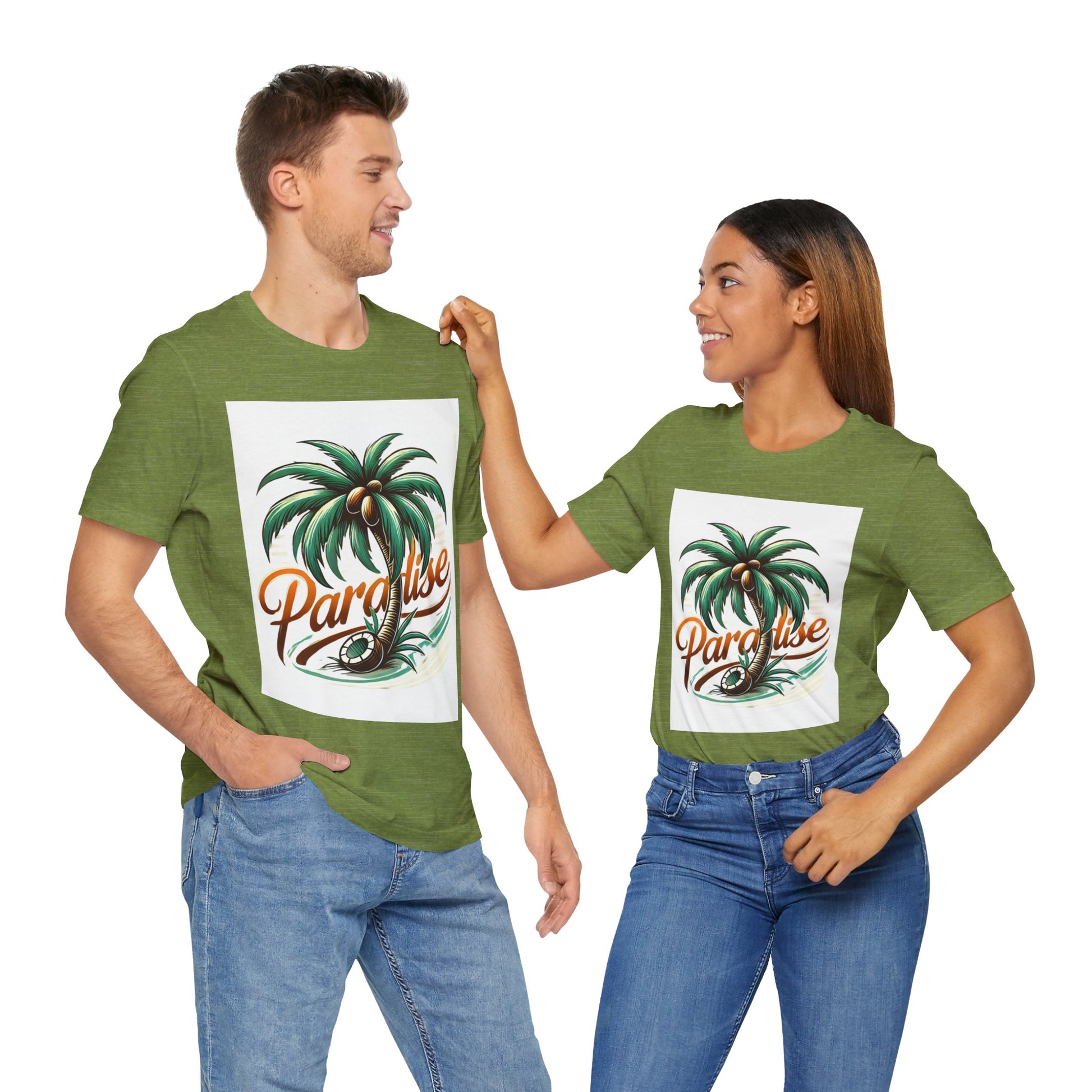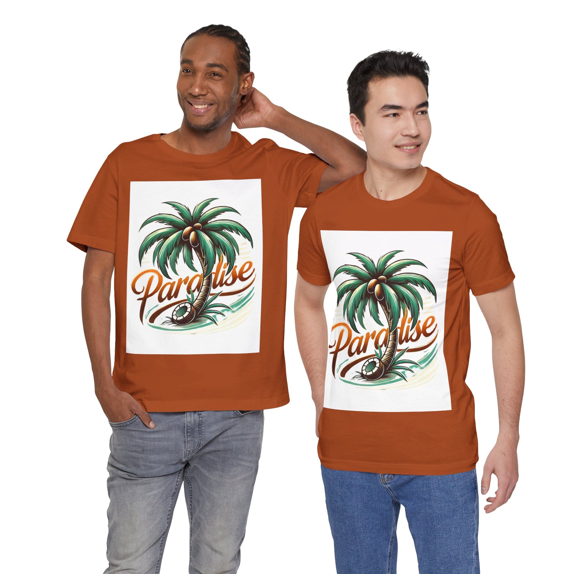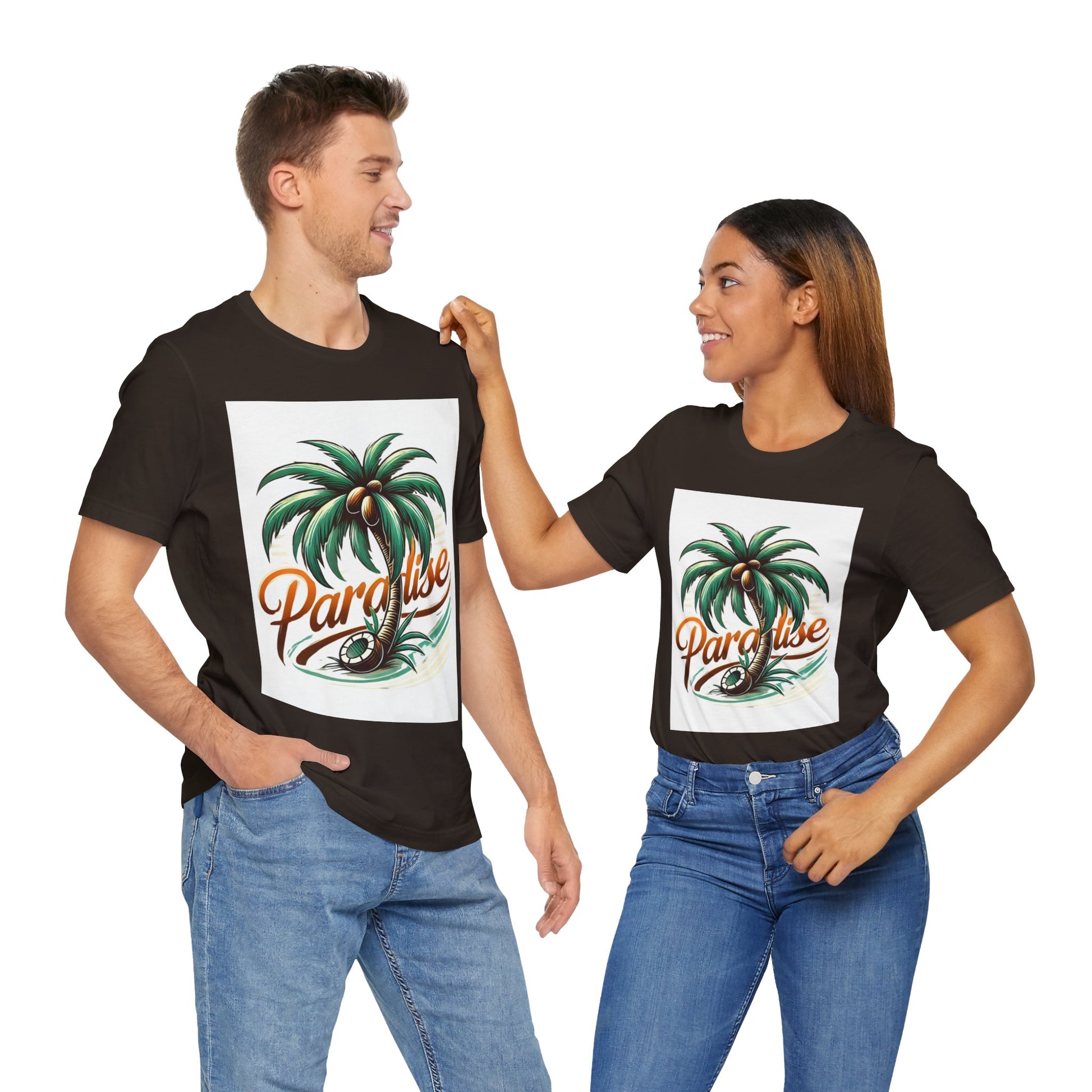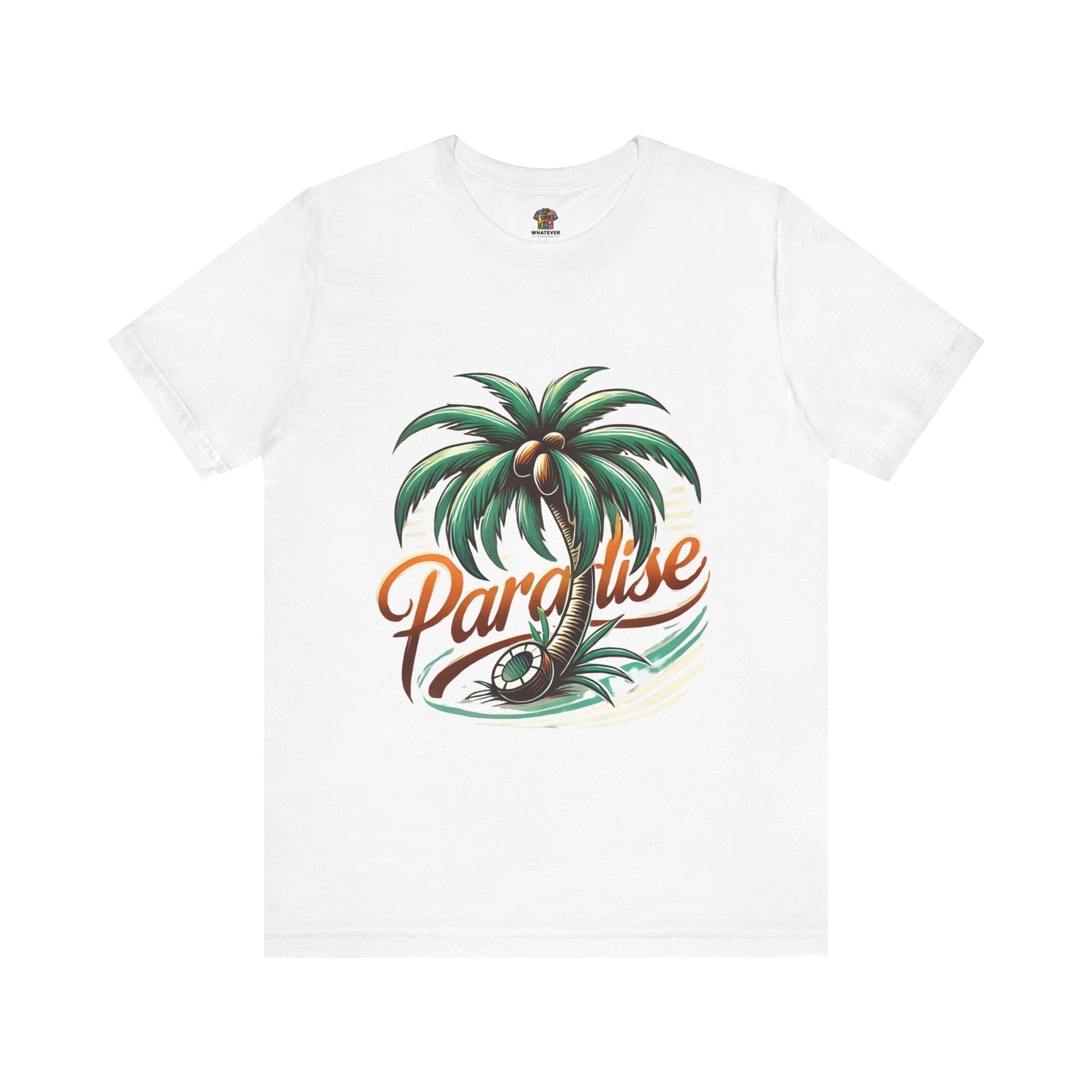 A tropical palm tree with coconuts and graffiti-style "Paradise" text in warm sandy hues. Serene and inviting, ideal for tropical escapes.