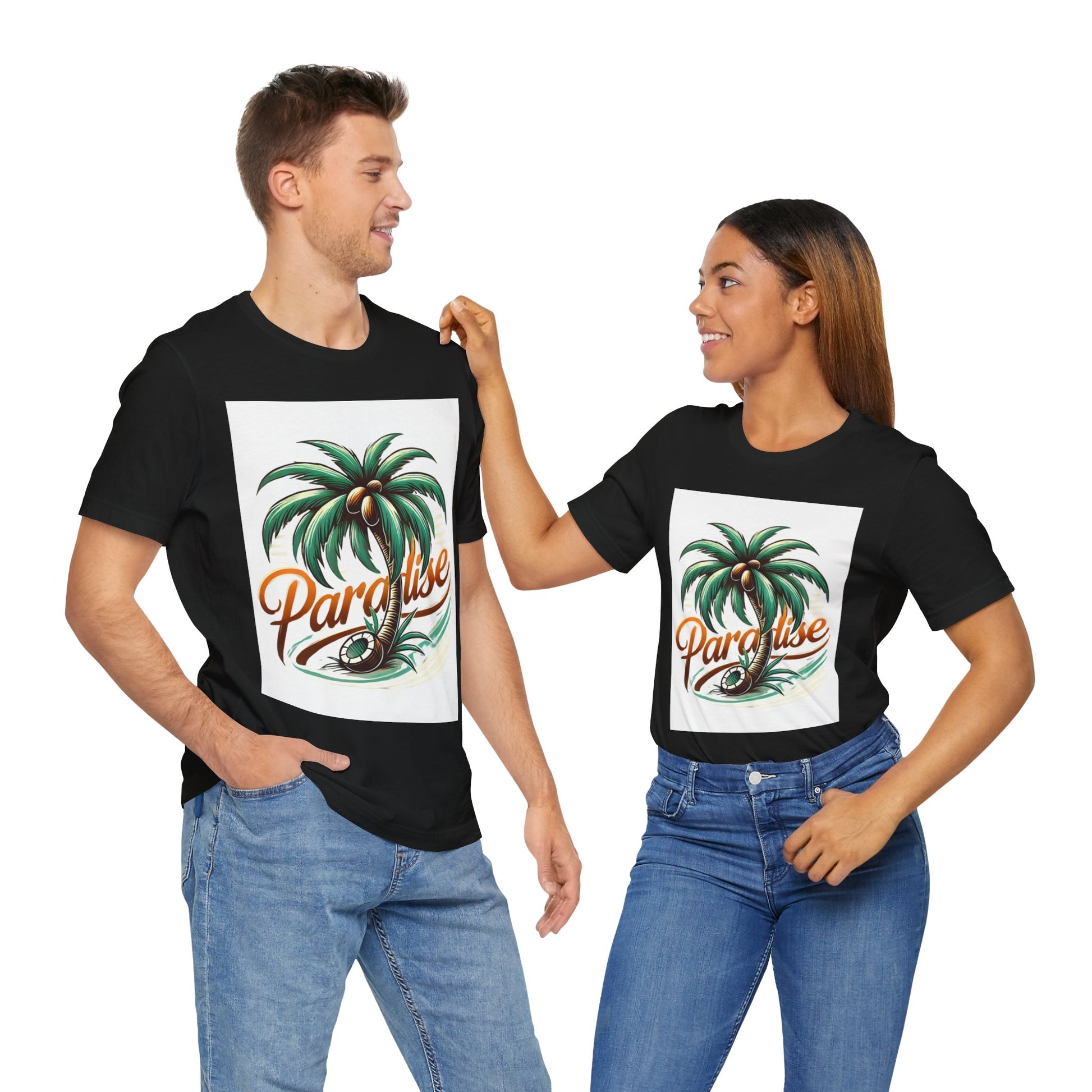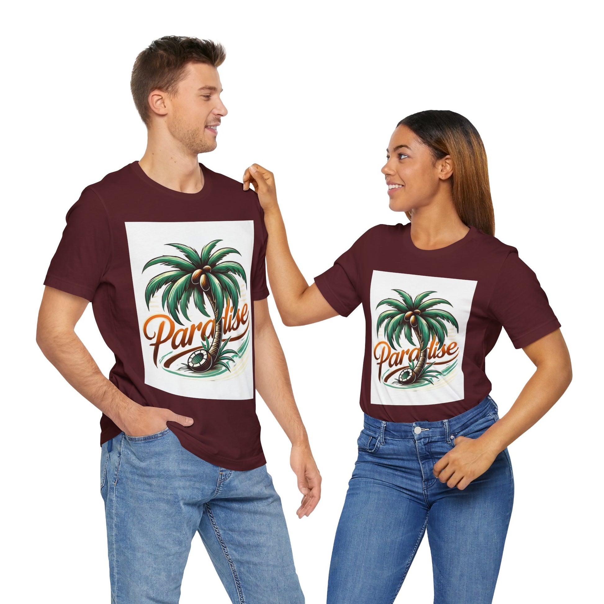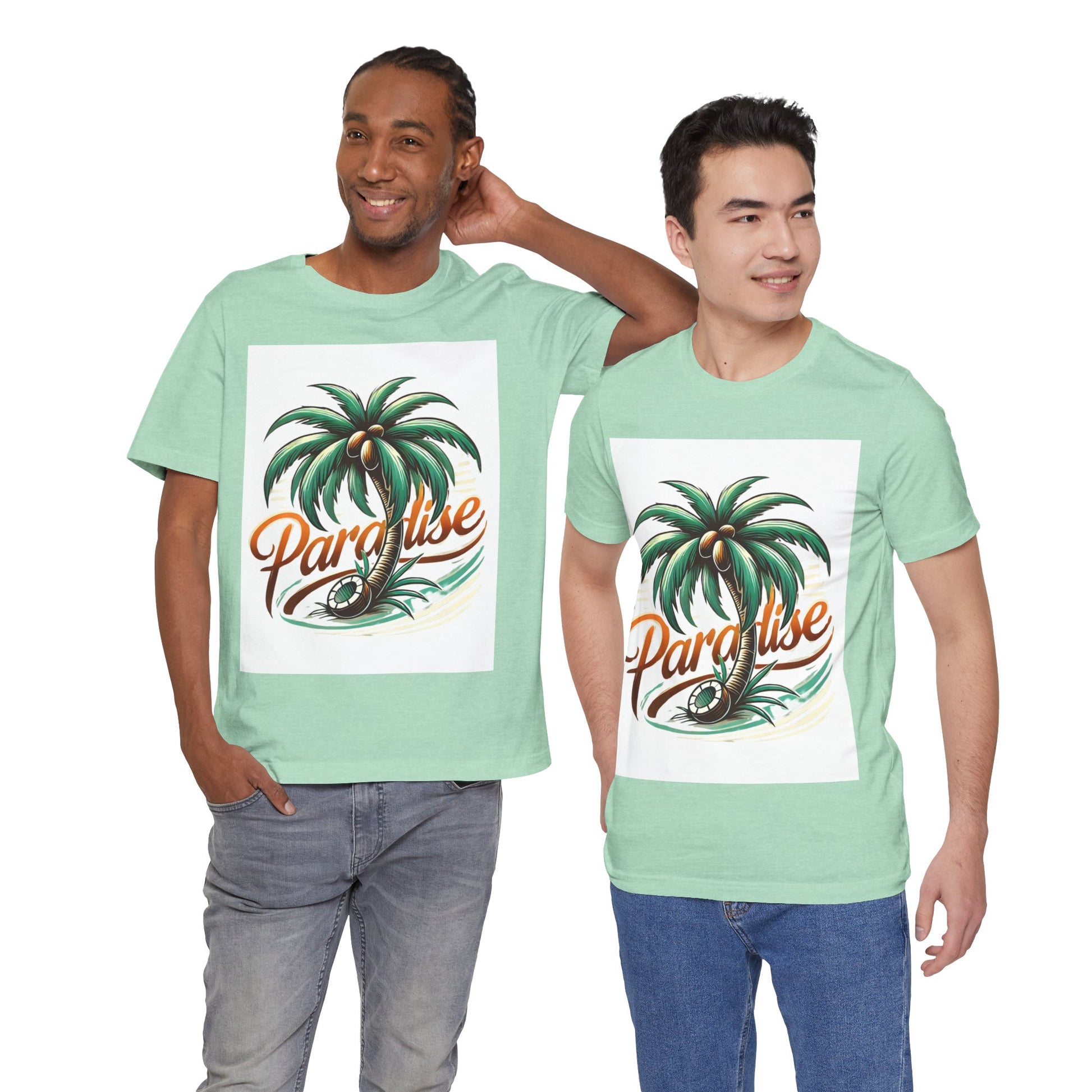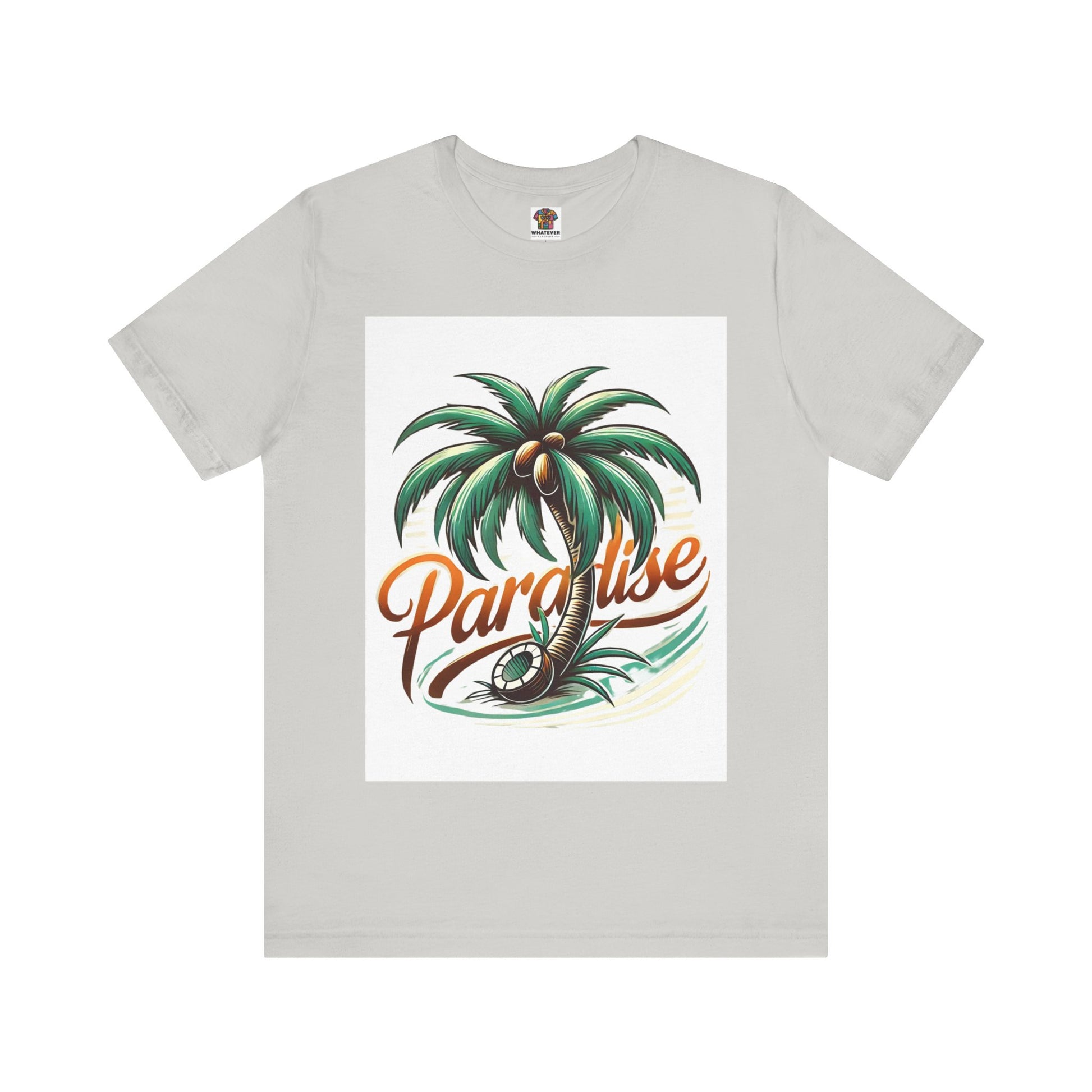 A tropical palm tree with coconuts and graffiti-style "Paradise" text in warm sandy hues. Serene and inviting, ideal for tropical escapes.