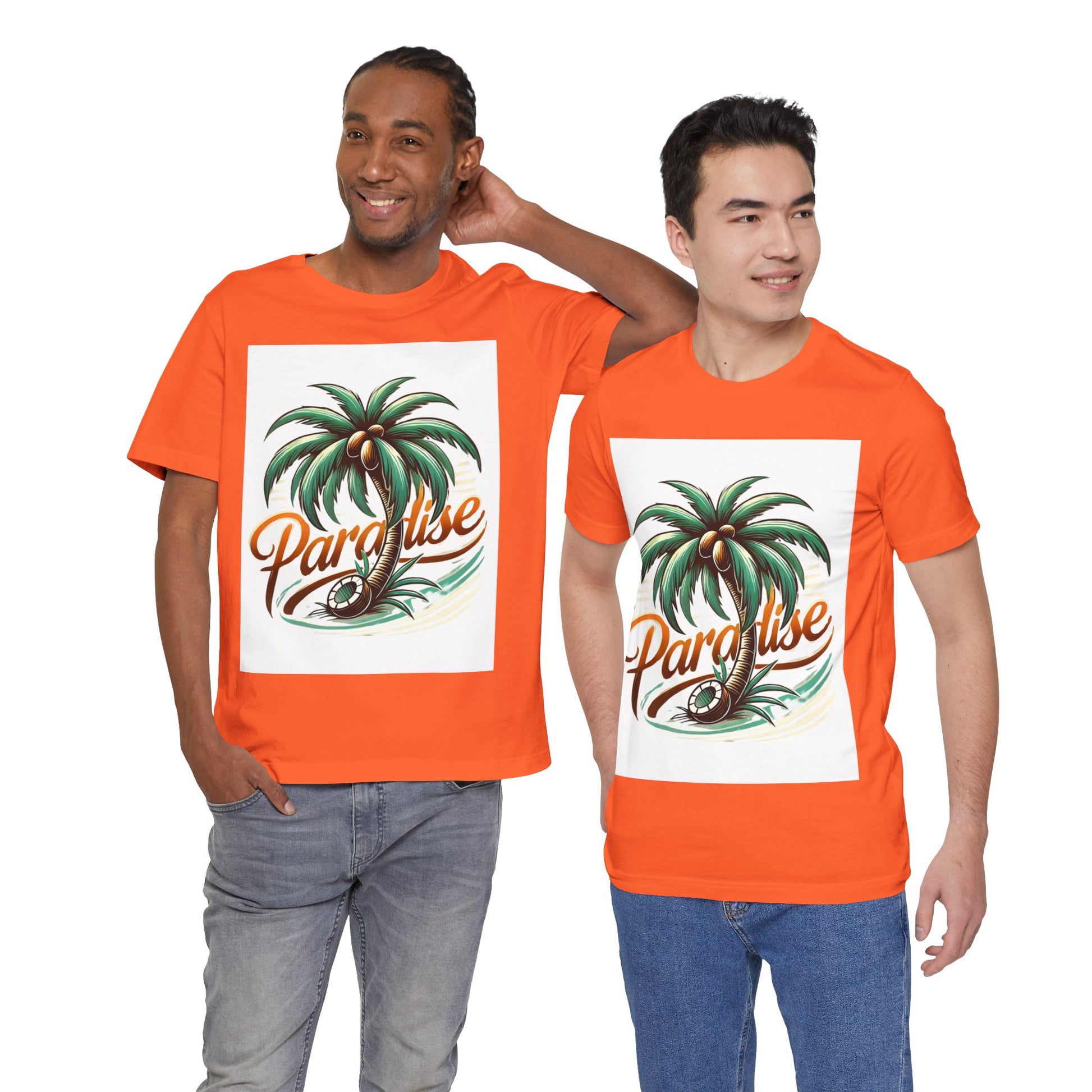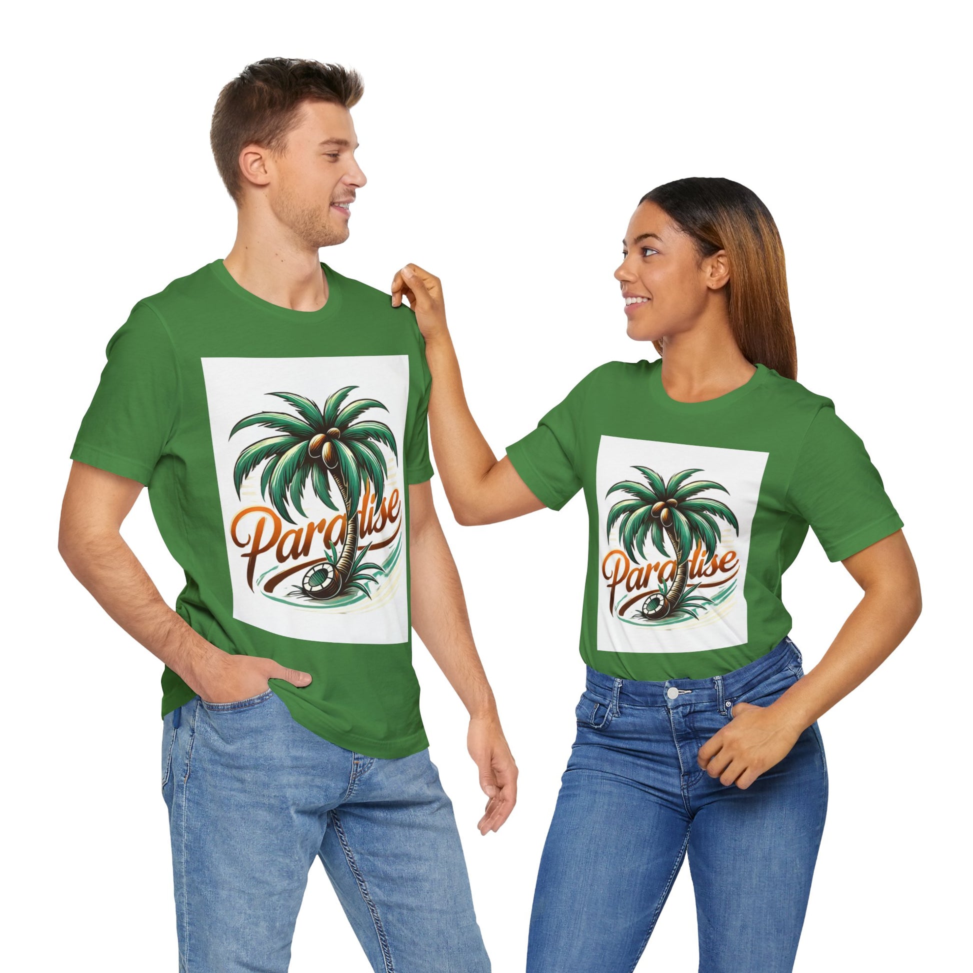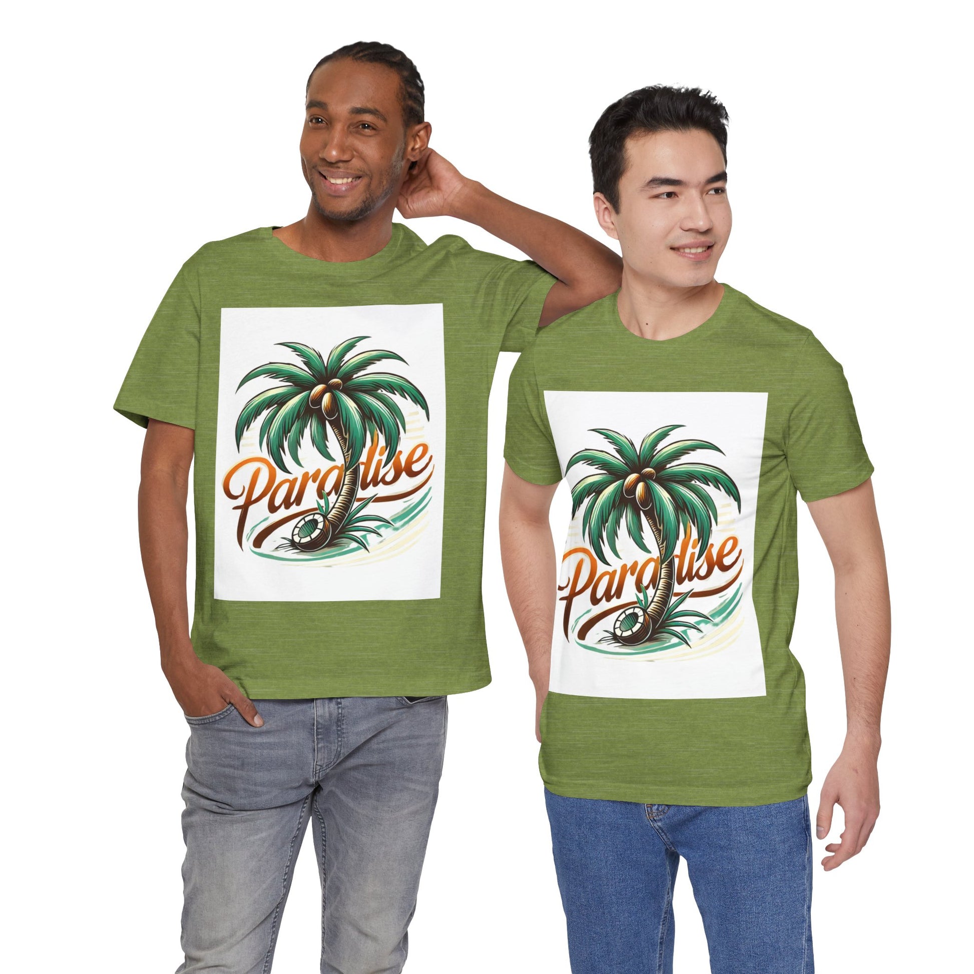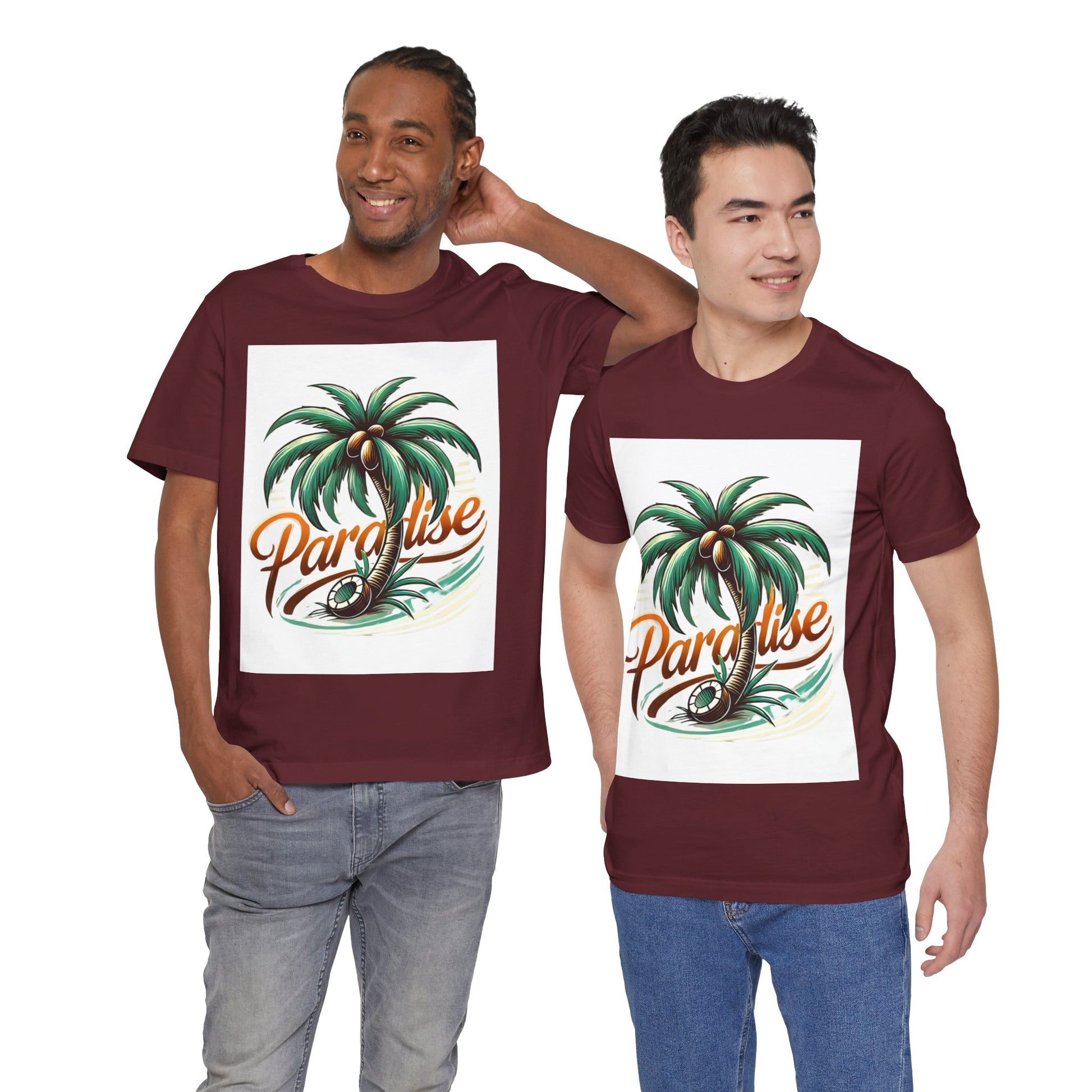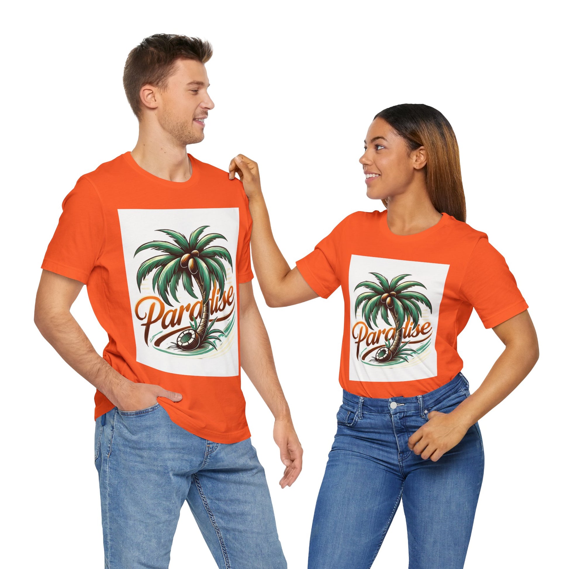 A tropical palm tree with coconuts and graffiti-style "Paradise" text in warm sandy hues. Serene and inviting, ideal for tropical escapes.