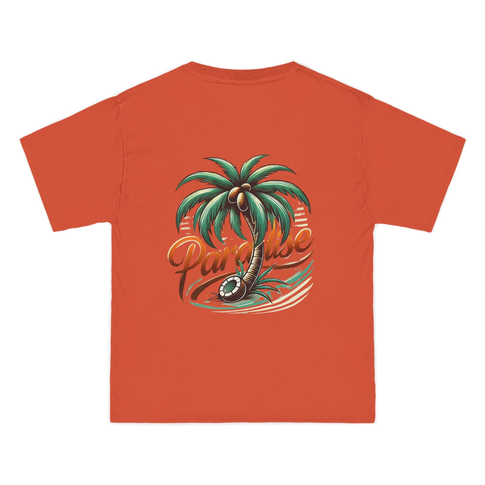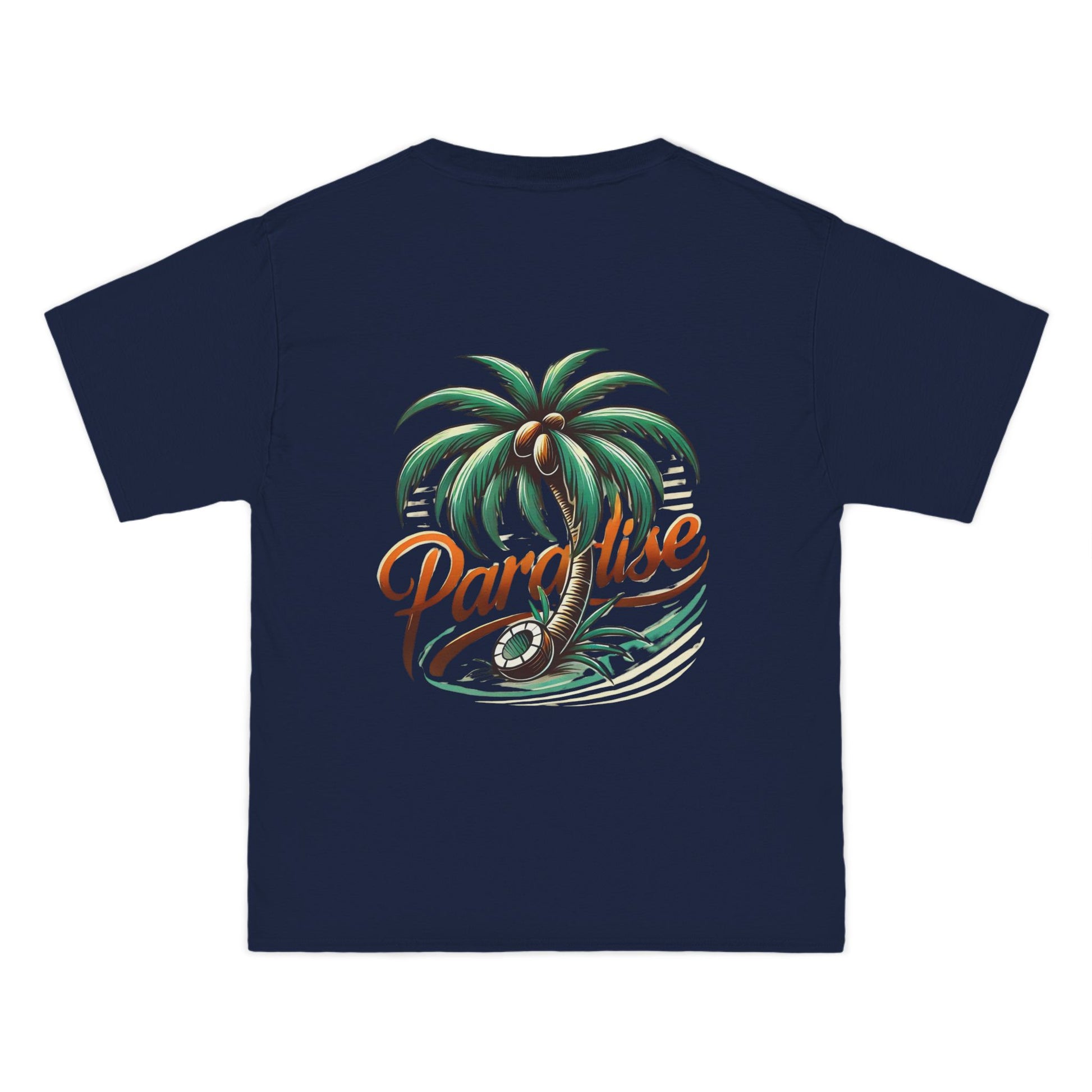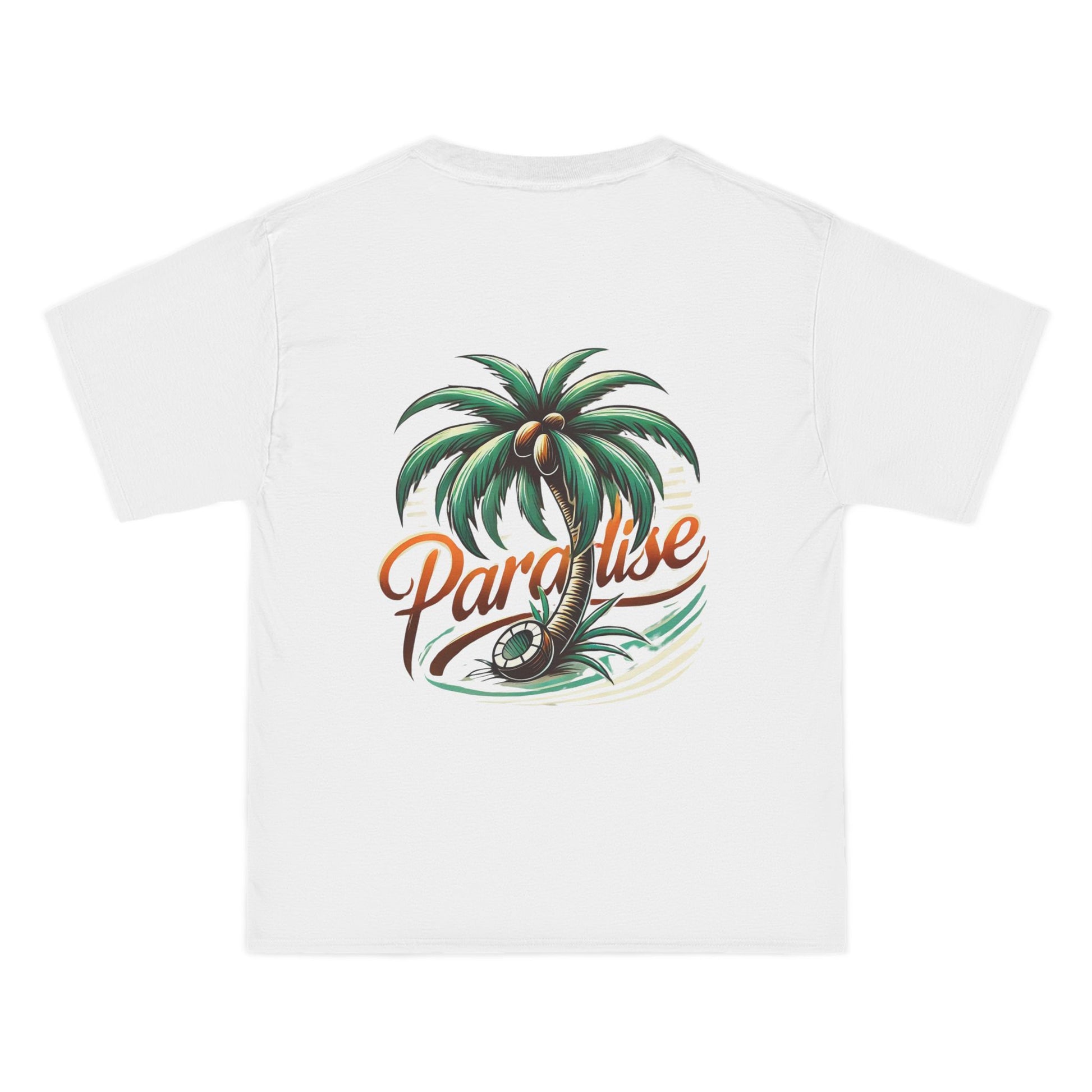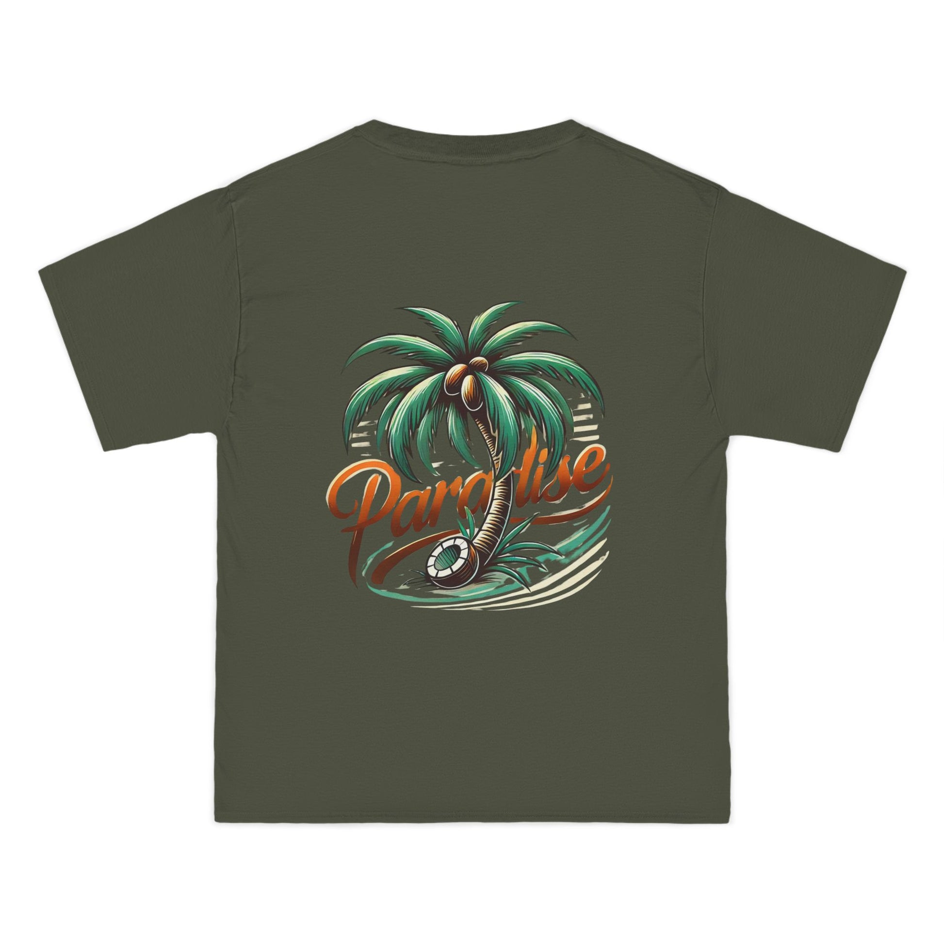Introducing our Paradise Palm Tree: Urban Graffiti! Wear your world on your chest with this unique fusion of tropical tranquility and urban edge. This shirt features a stunning AI-generated design of a majestic palm tree, complete with coconuts, set against a backdrop of graffiti-style text spelling out "Paradise". Warm sandy hues conspire to create a scene that's both serene and inviting, perfect for those who yearn for tropical escapes.
