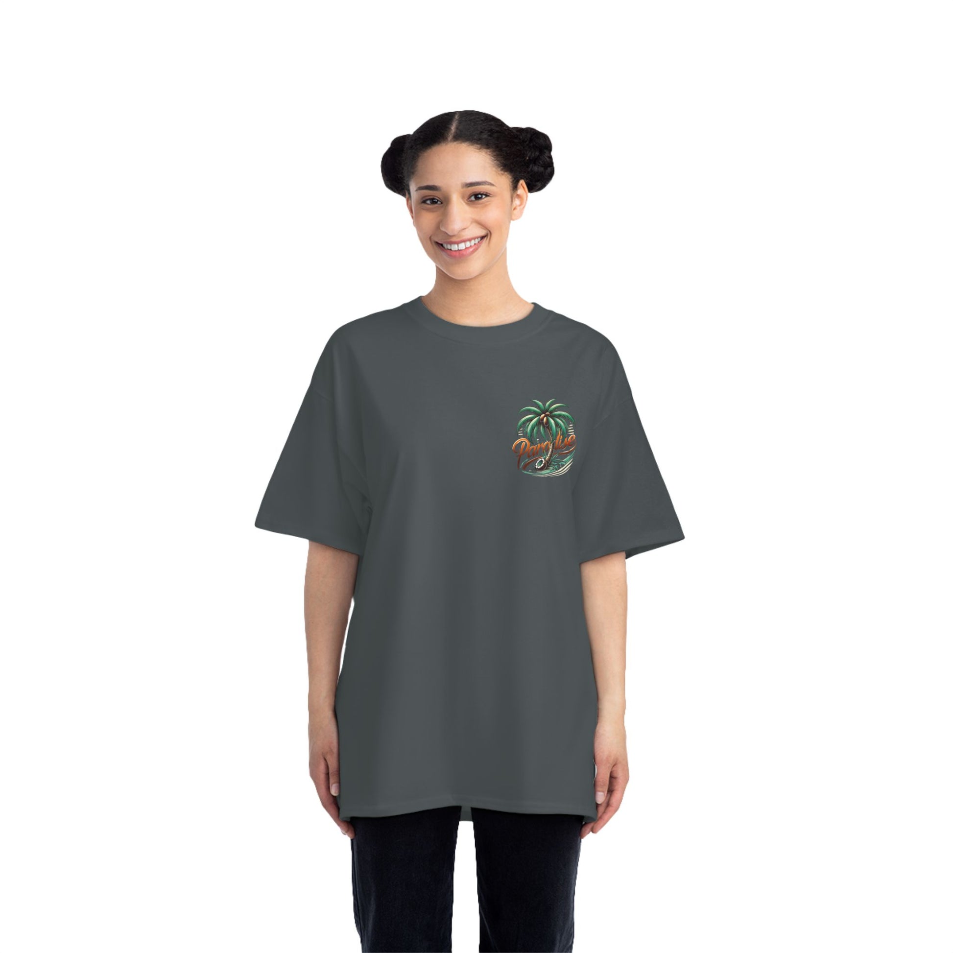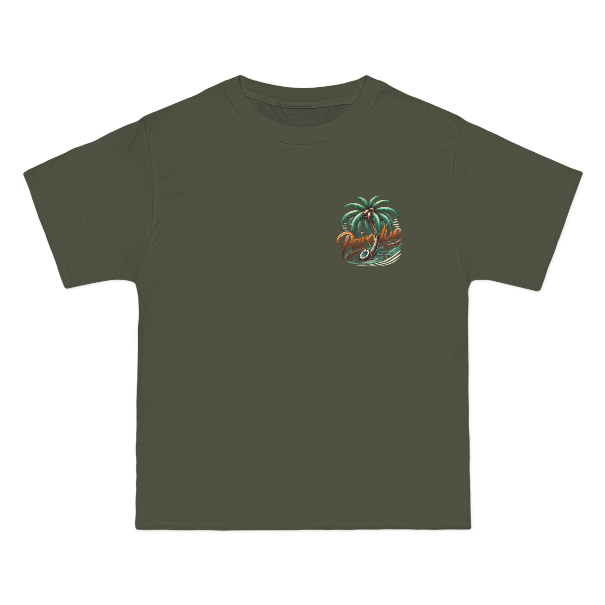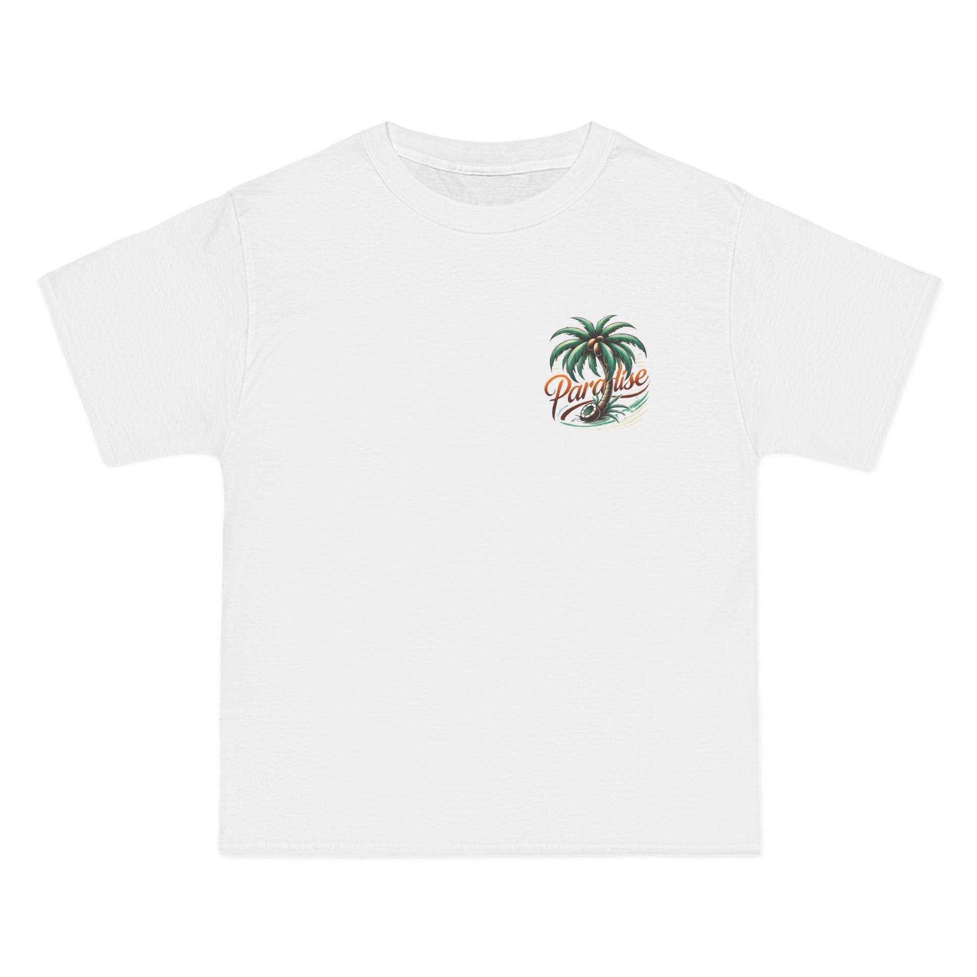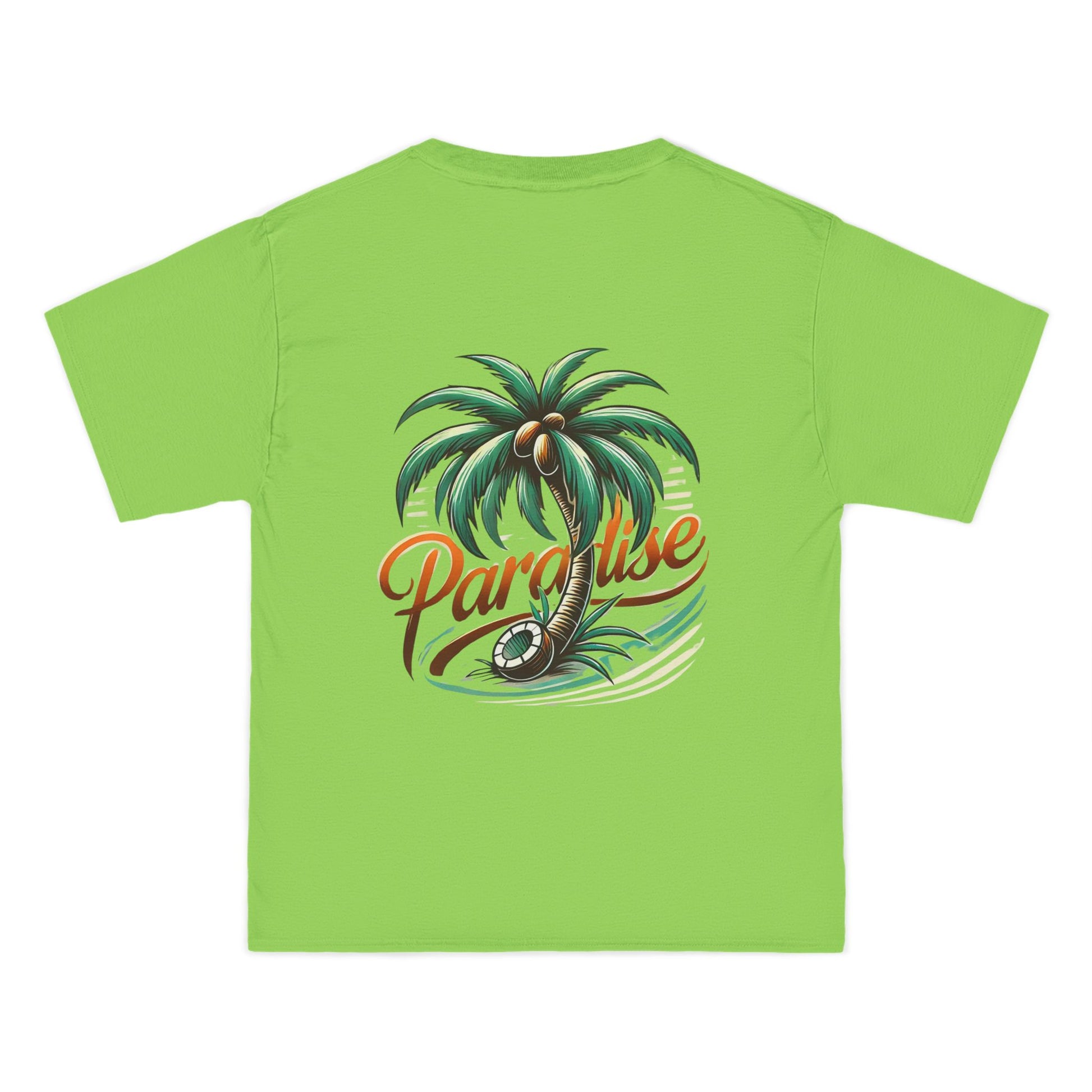 Introducing our Paradise Palm Tree: Urban Graffiti! Wear your world on your chest with this unique fusion of tropical tranquility and urban edge. This shirt features a stunning AI-generated design of a majestic palm tree, complete with coconuts, set against a backdrop of graffiti-style text spelling out "Paradise". Warm sandy hues conspire to create a scene that's both serene and inviting, perfect for those who yearn for tropical escapes.