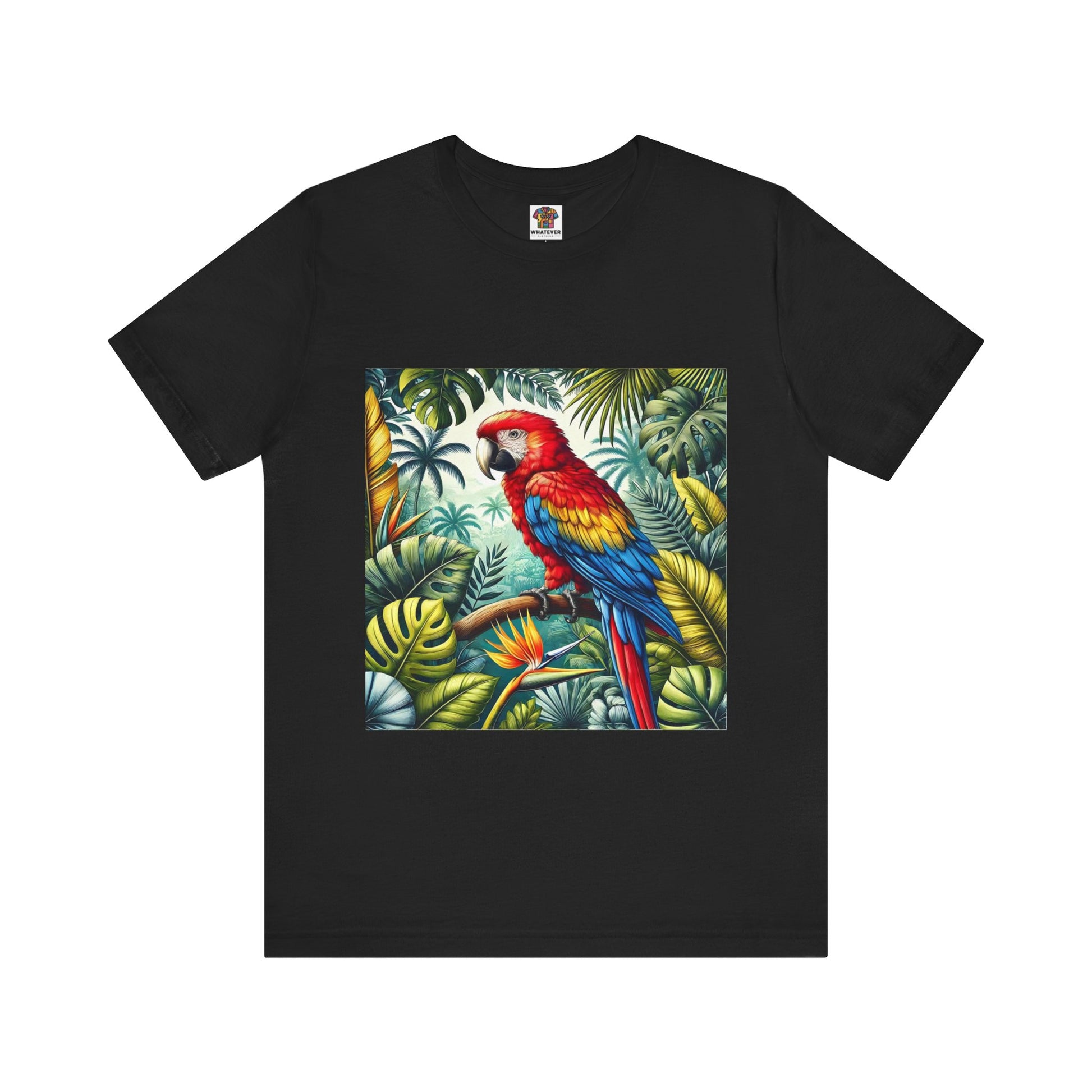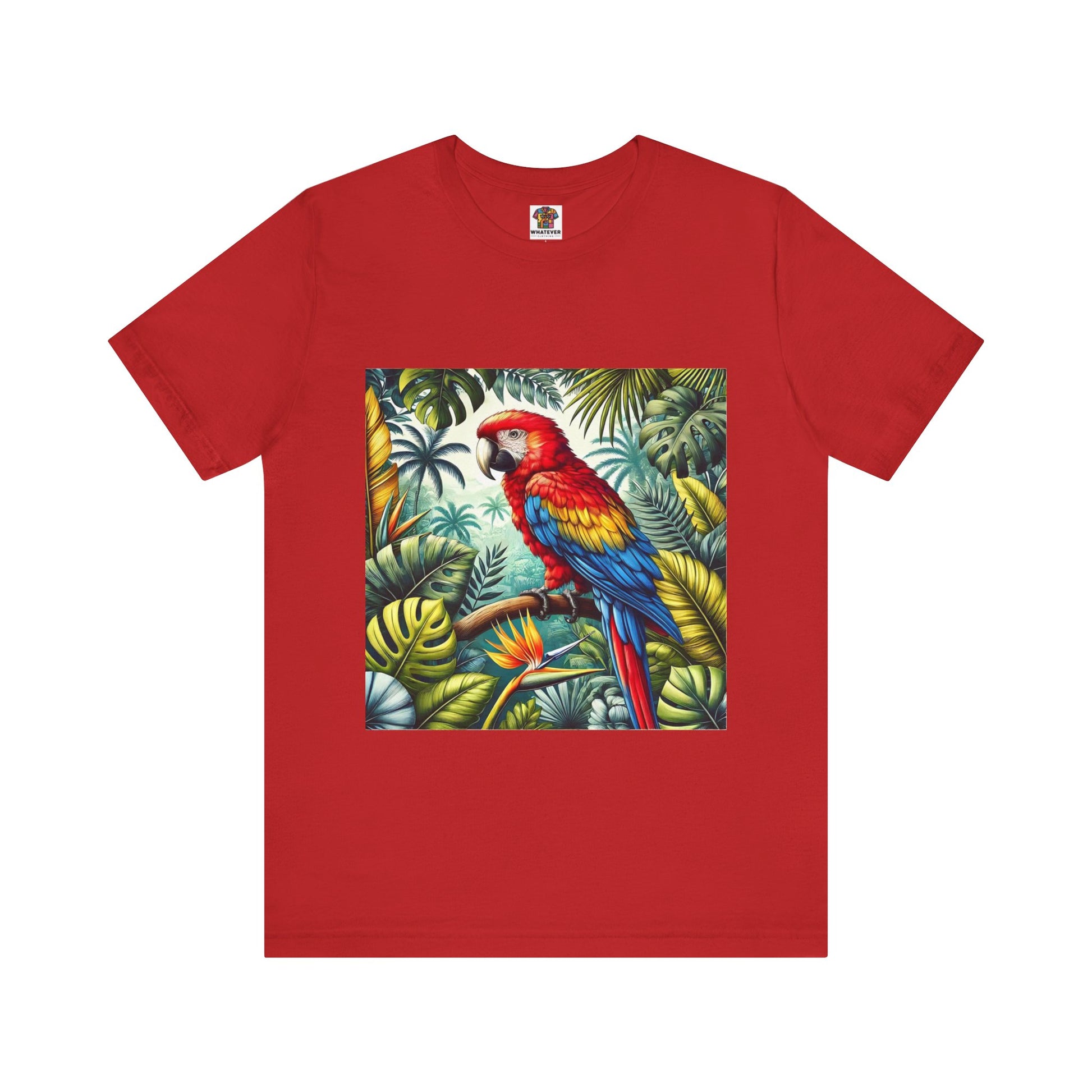 A brightly colored parrot perched on a branch, with lush jungle foliage in the background.