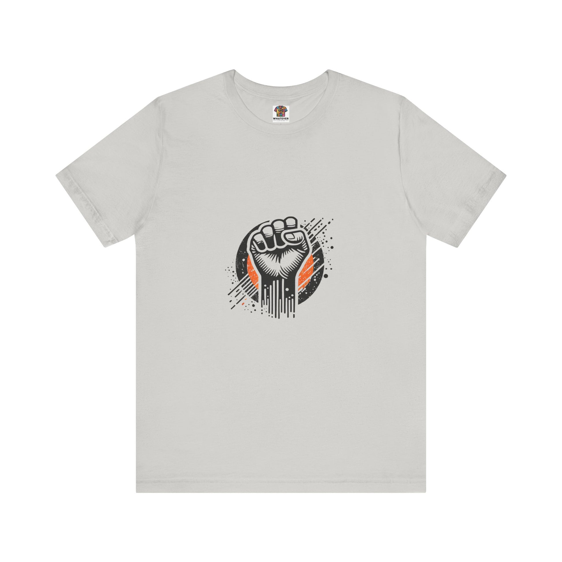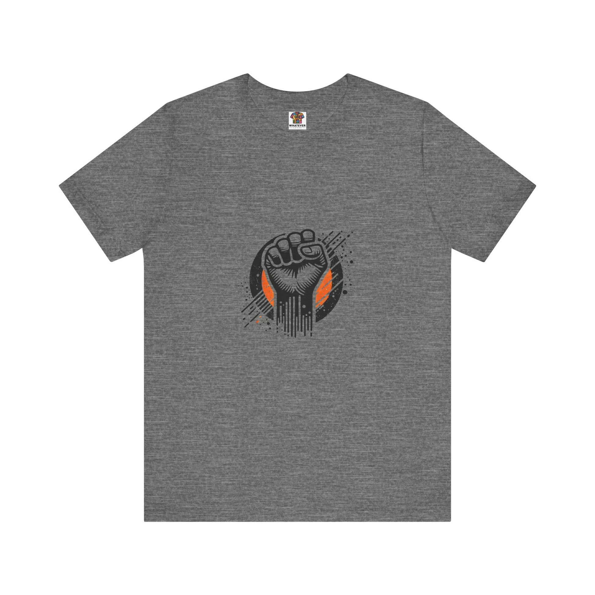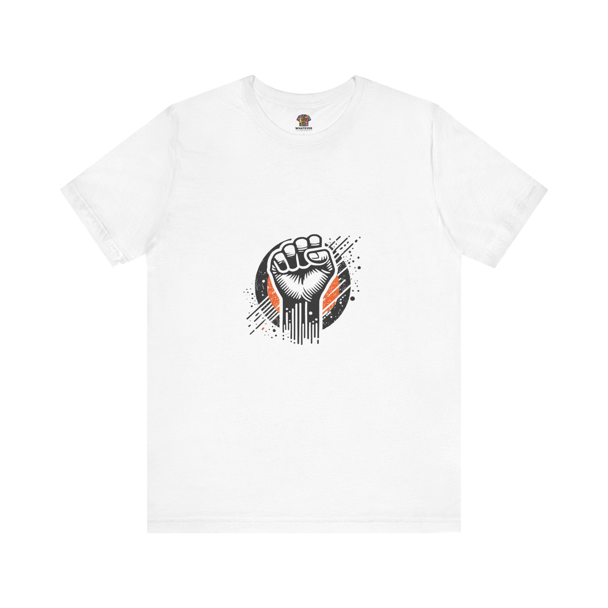 A raised fist outlined in bold black lines with orange splatter adding a rebellious touch.