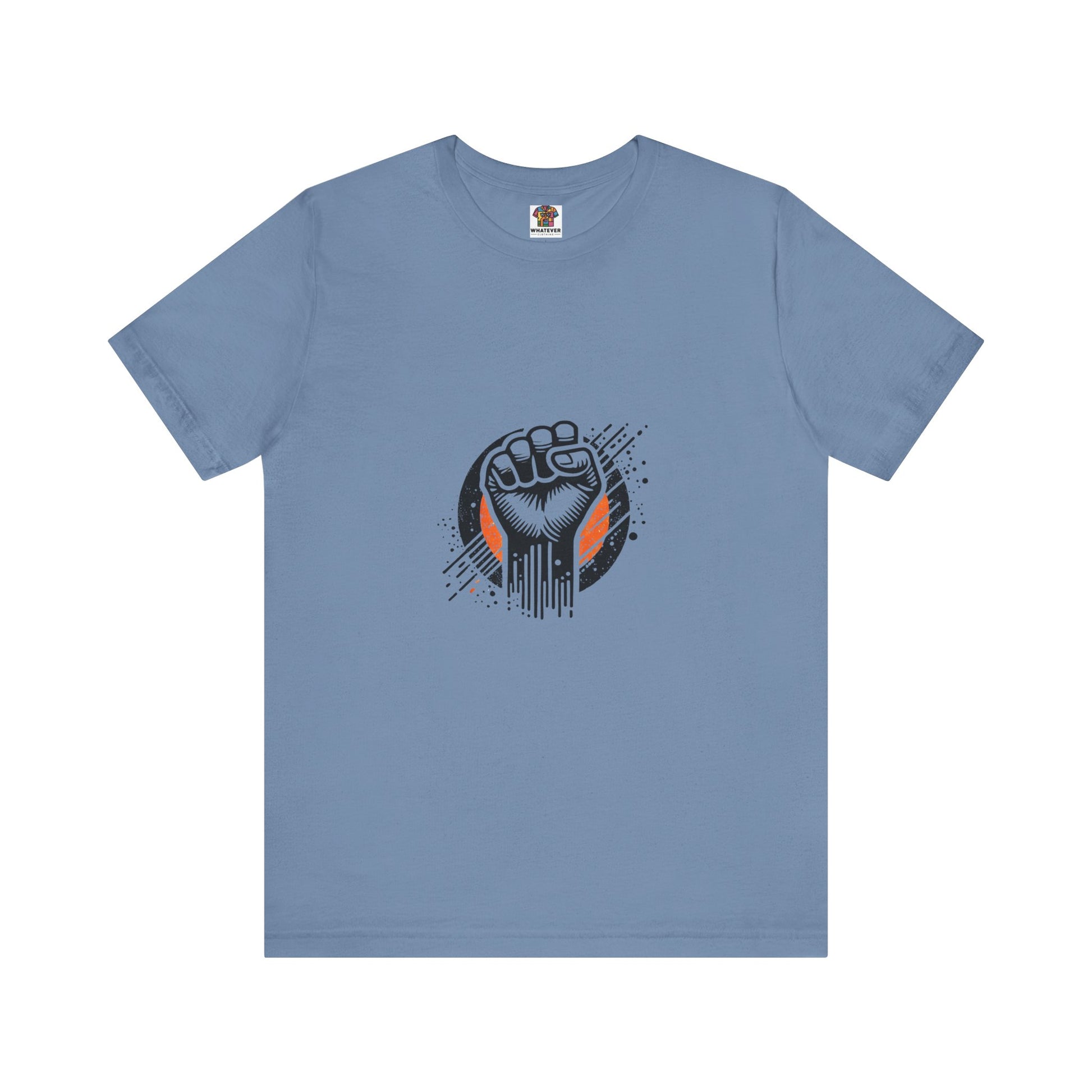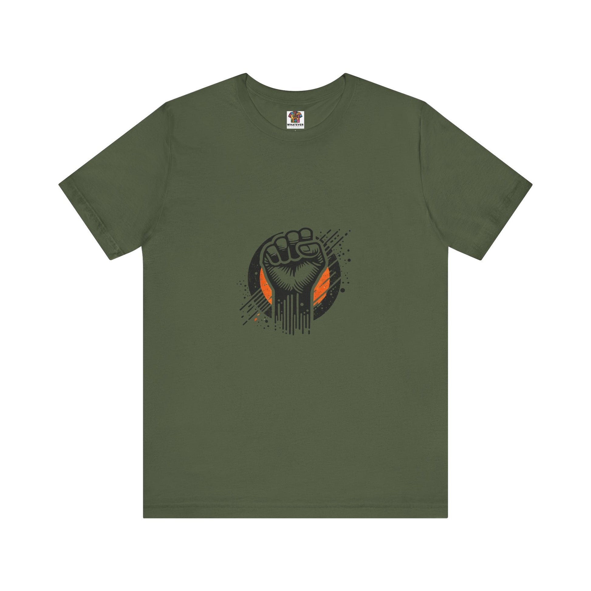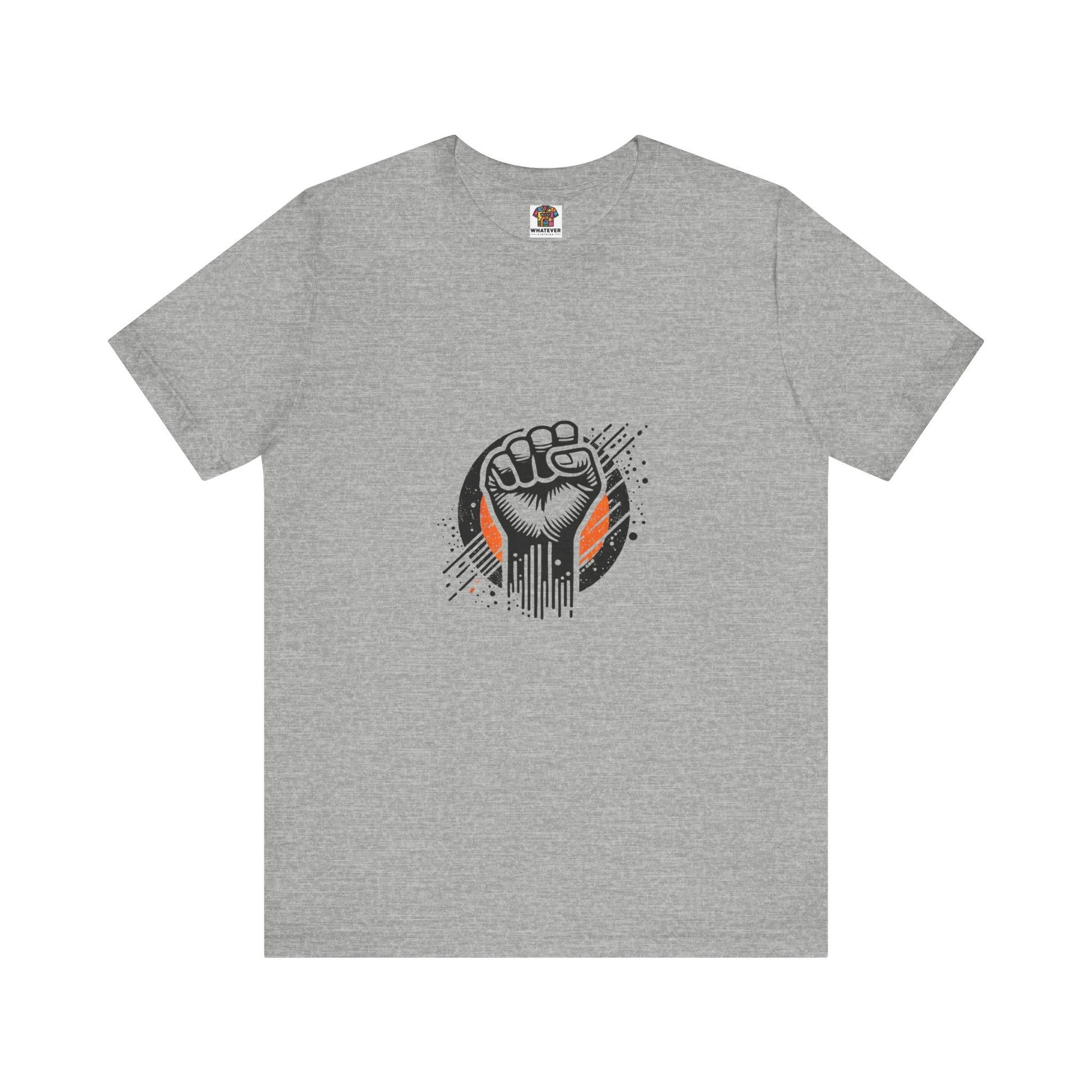 A raised fist outlined in bold black lines with orange splatter adding a rebellious touch.