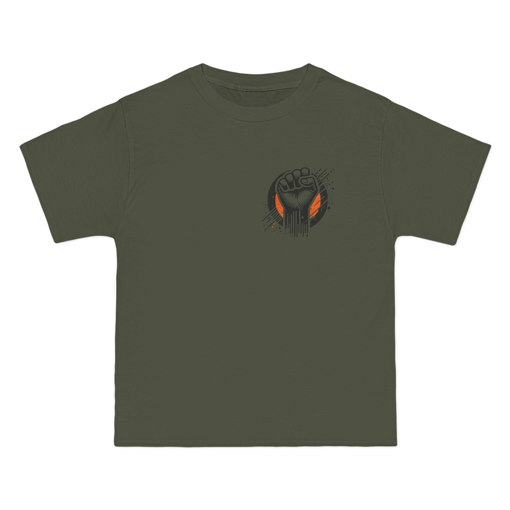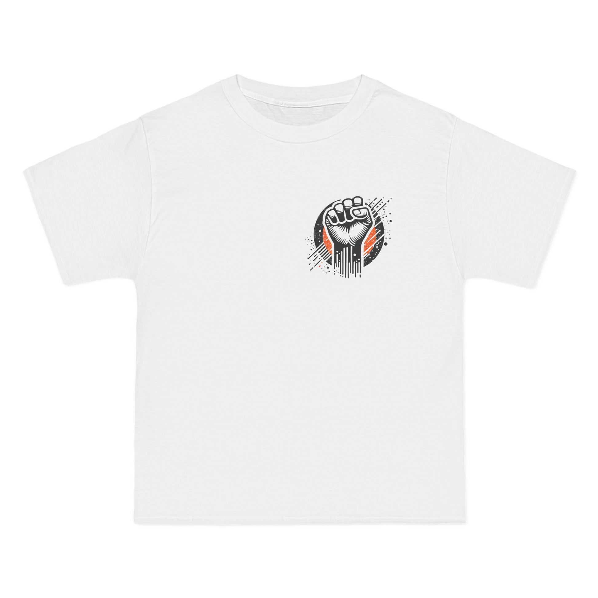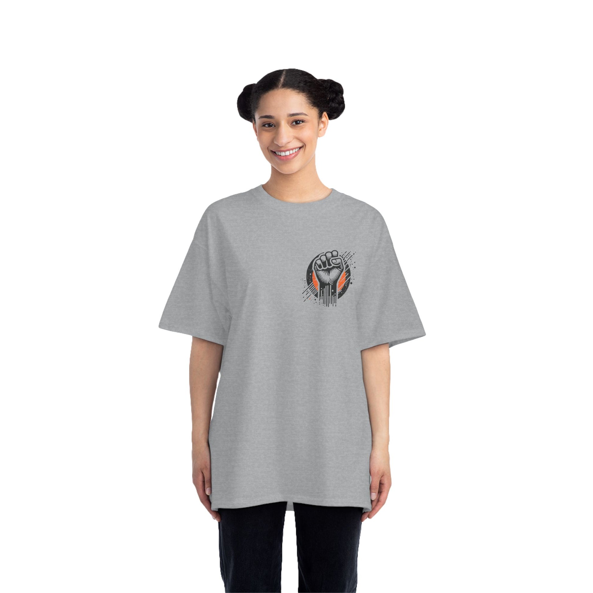 Crafted from the most comfortable cotton blends, this tee boasts of a raised fist outlined in bold black lines. The orange splatter finish adds a touch of rebellion, making it a perfect emblem of individuality. Thanks to our innovative AI technology, we've transformed this powerful idea into a wearable masterpiece.
