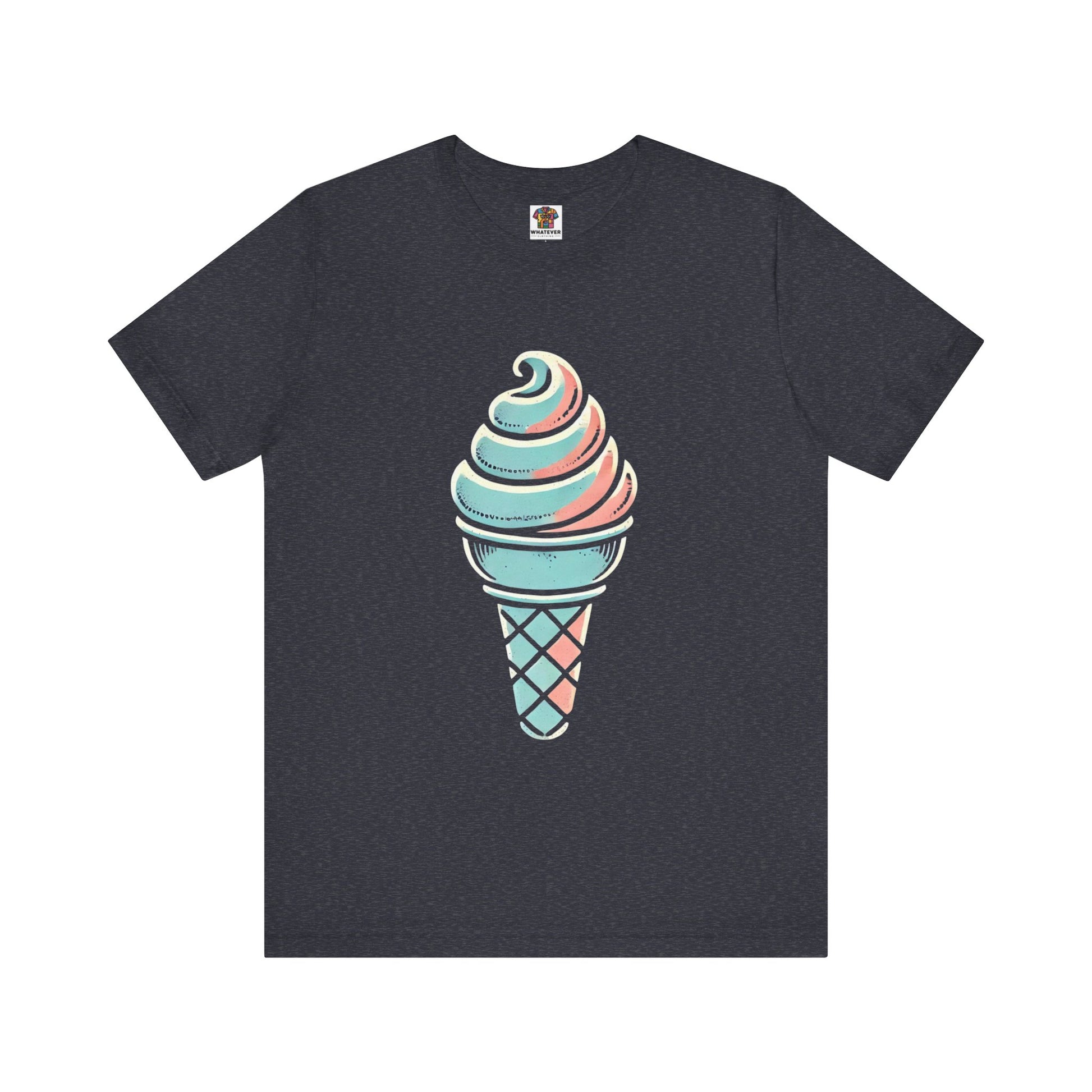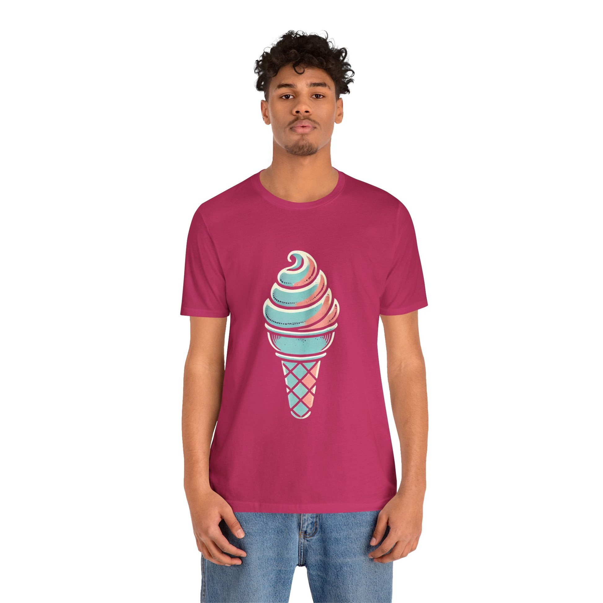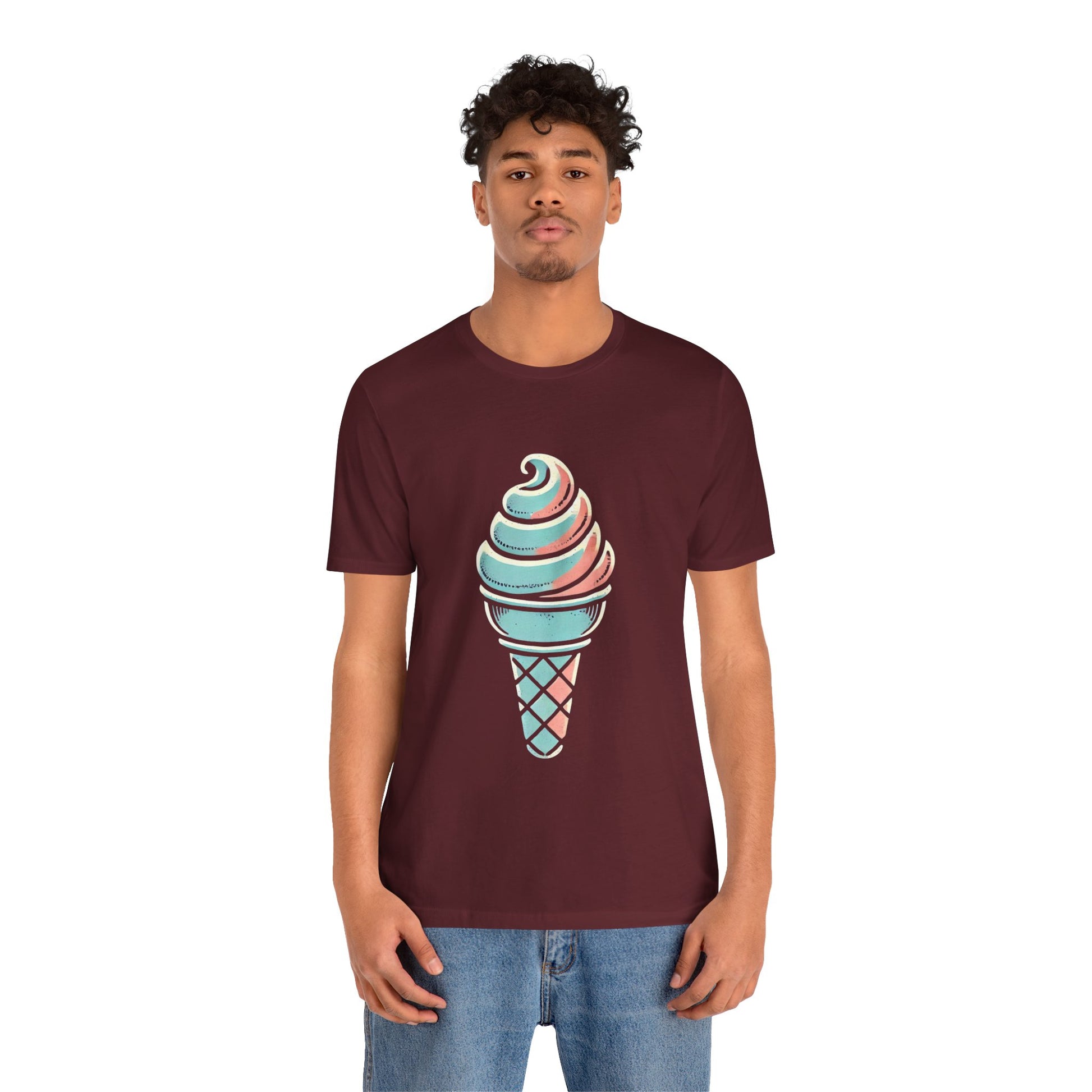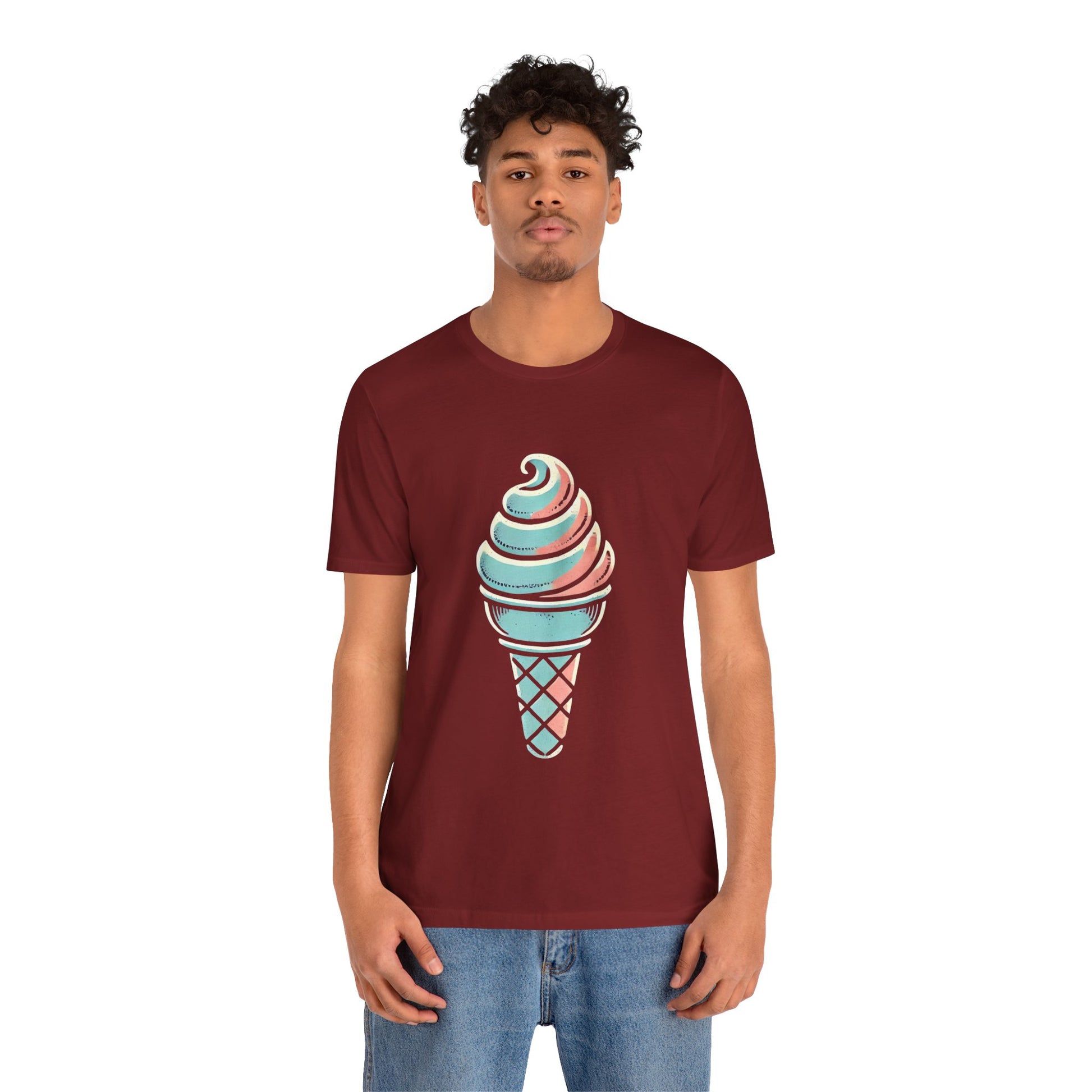 A stylized ice cream cone with a swirled top, depicted in pastel colors and hand-drawn, distressed textures to evoke a playful vintage style.