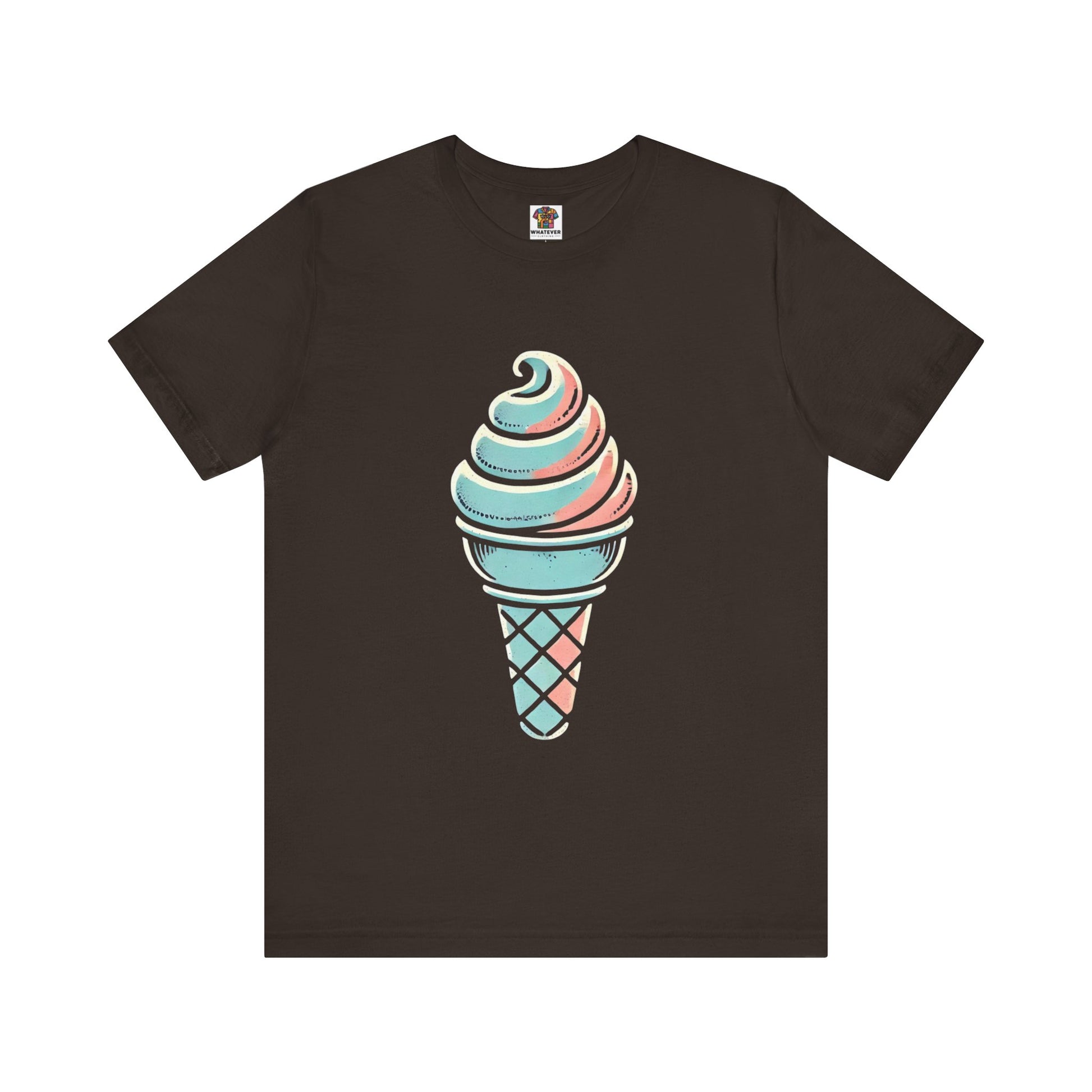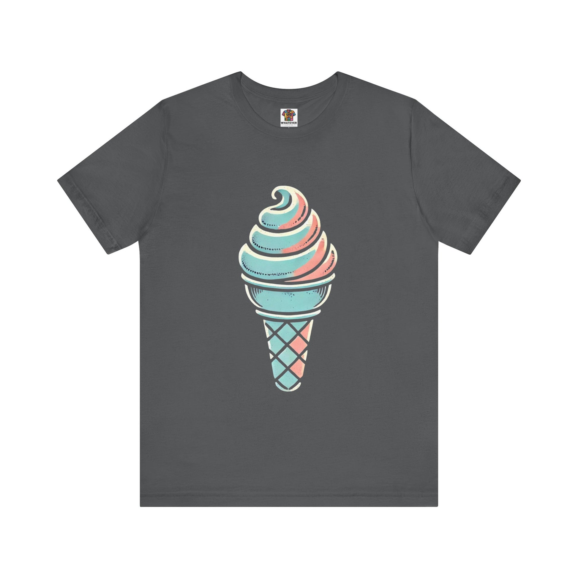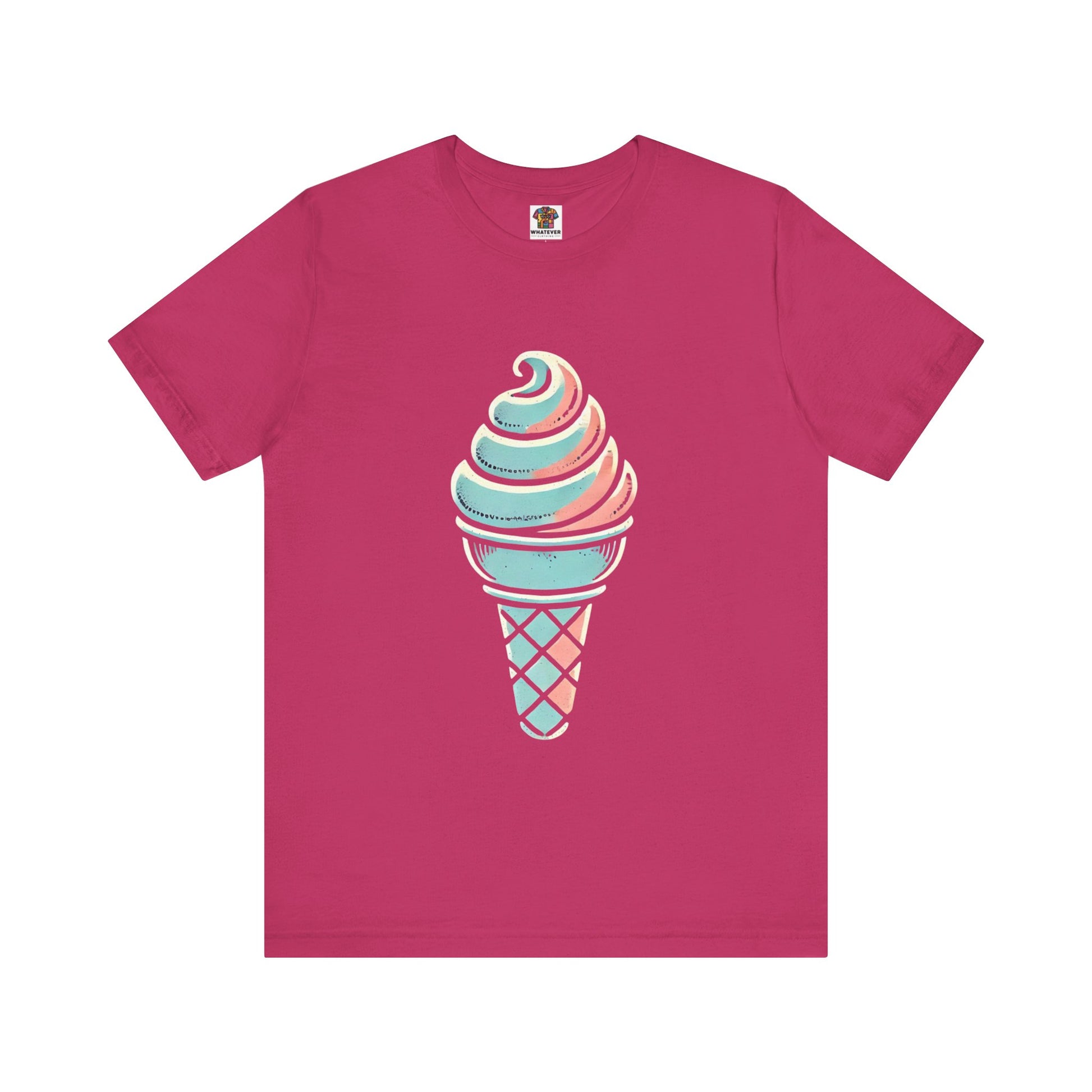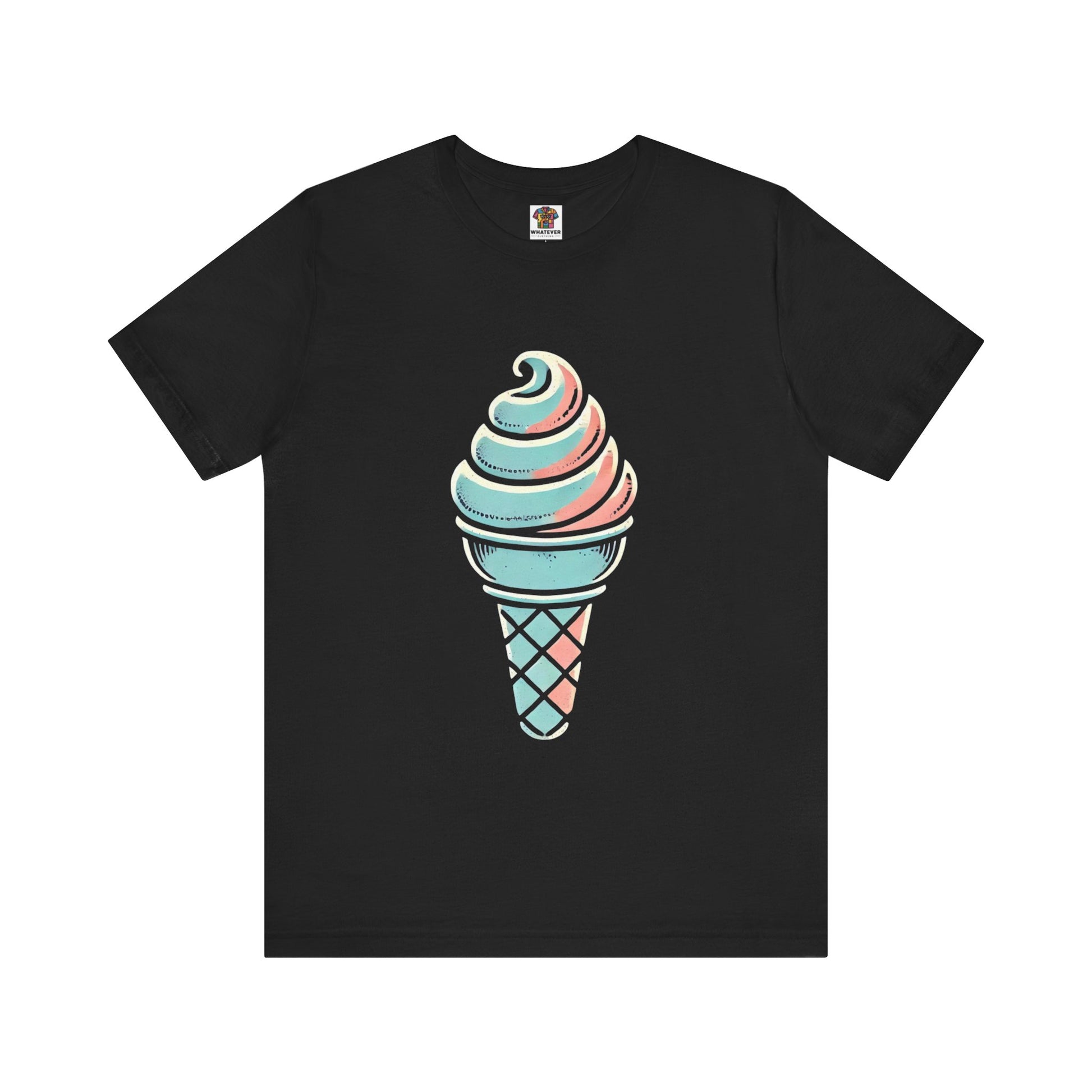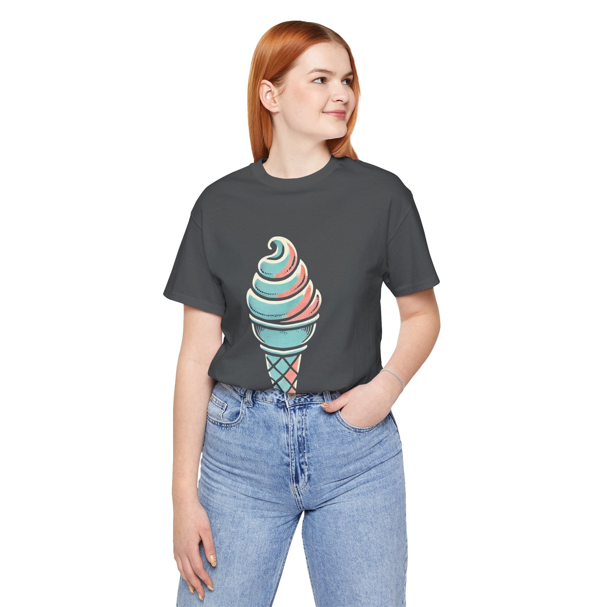 A stylized ice cream cone with a swirled top, depicted in pastel colors and hand-drawn, distressed textures to evoke a playful vintage style.