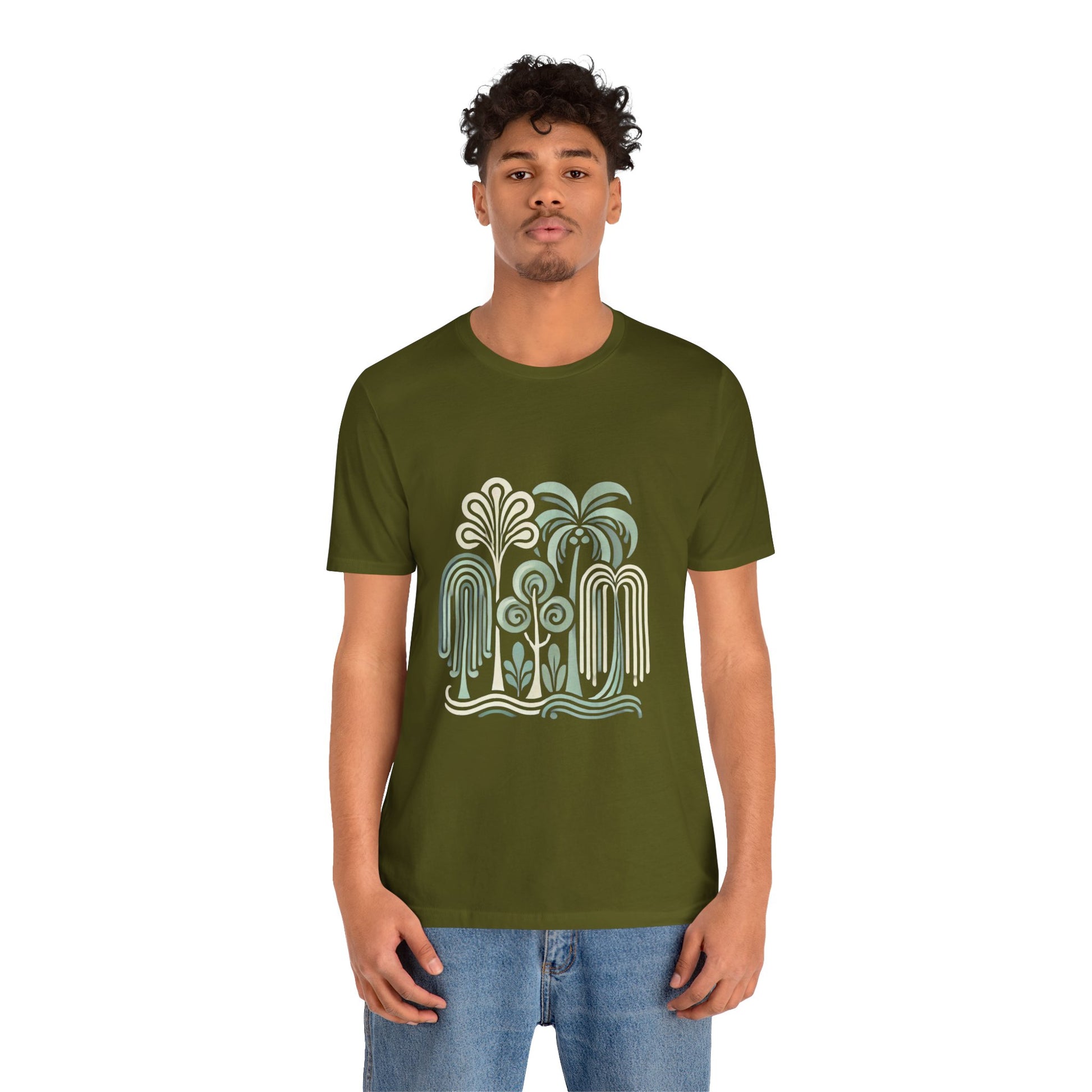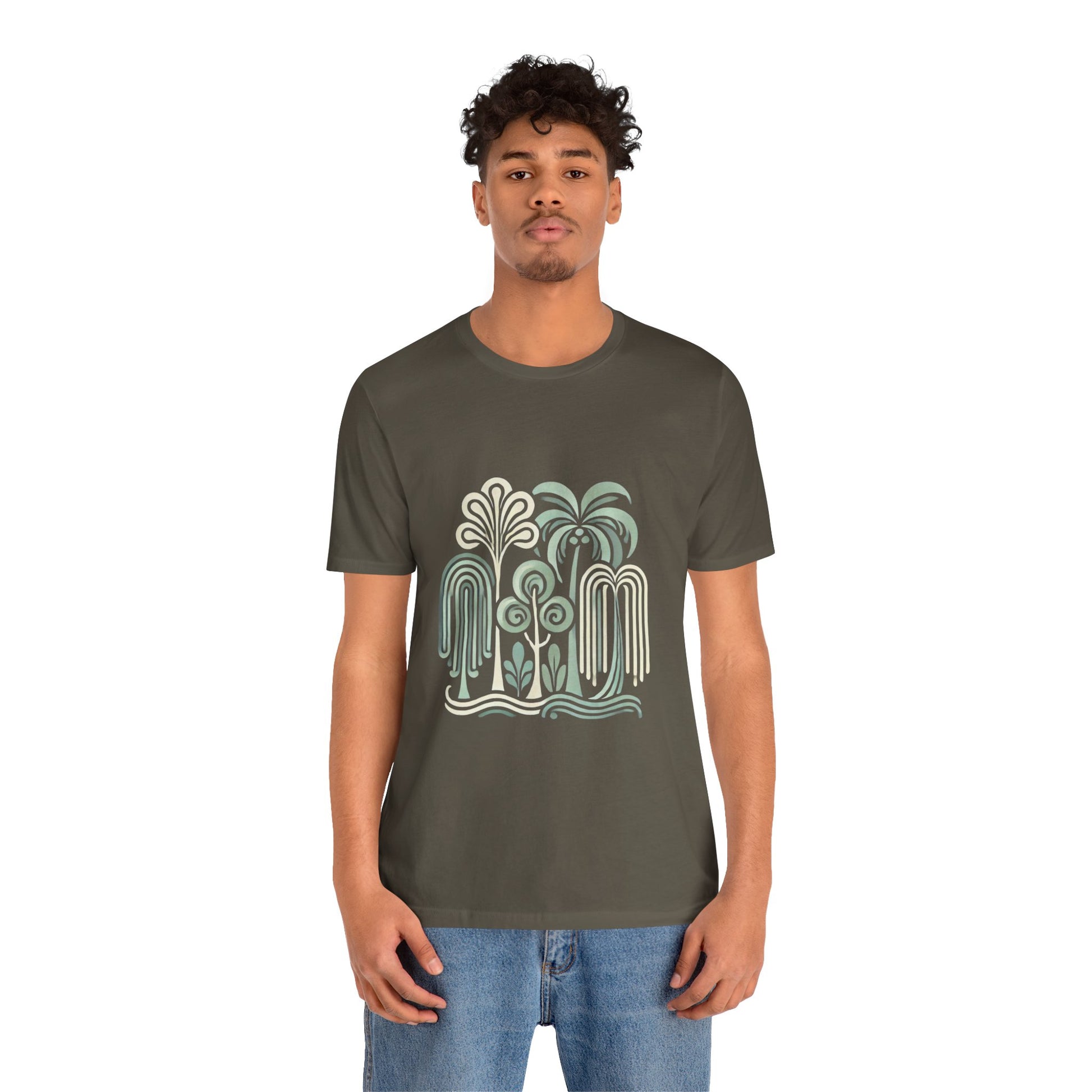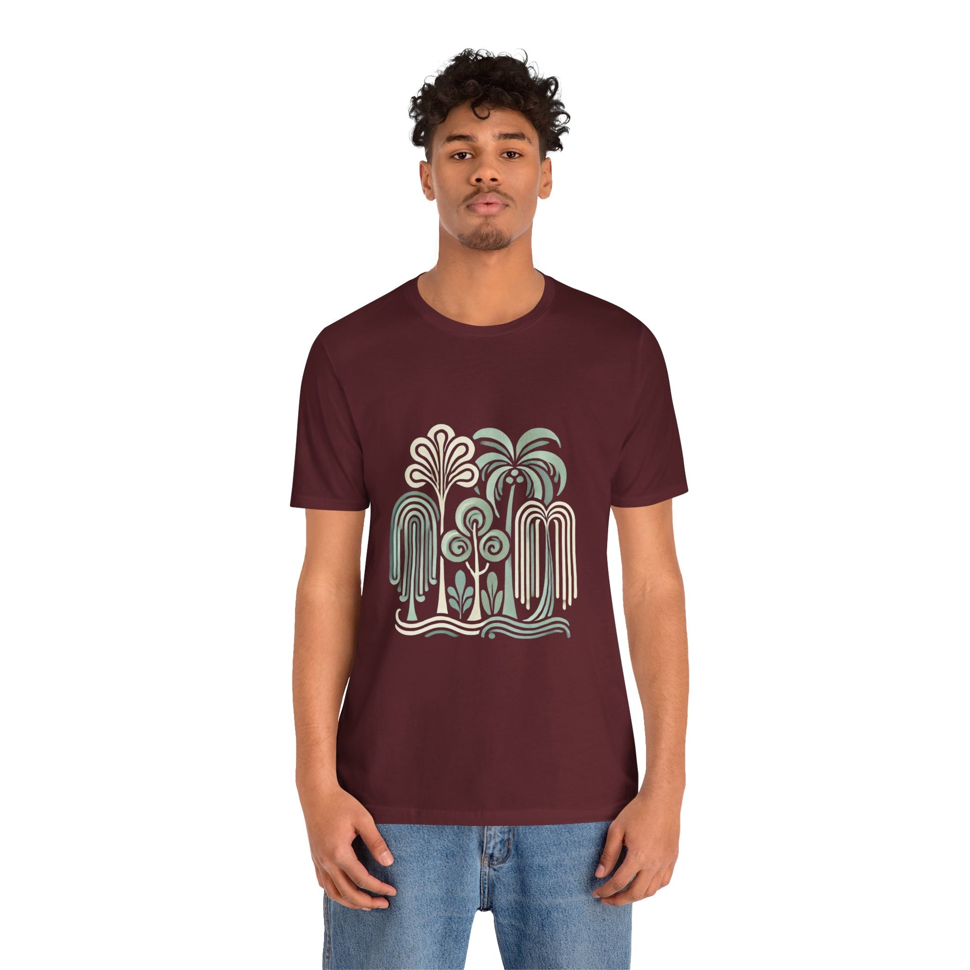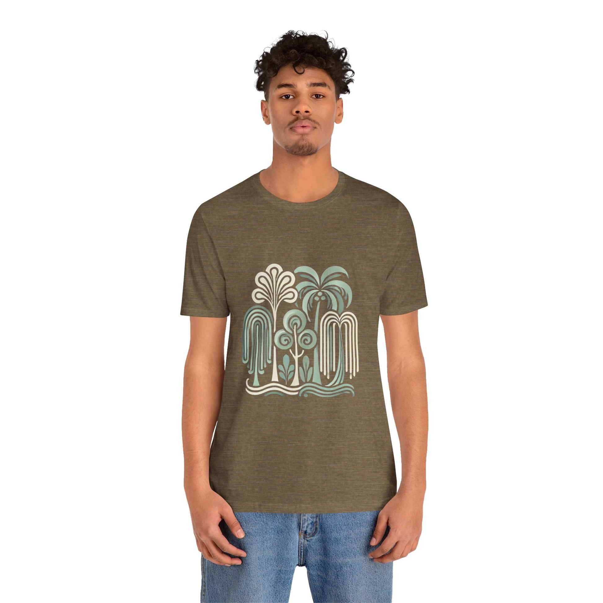 Stylized palm and willow trees with flowing, wavy lines, illustrated in soft pastel tones with a distressed, groovy look.