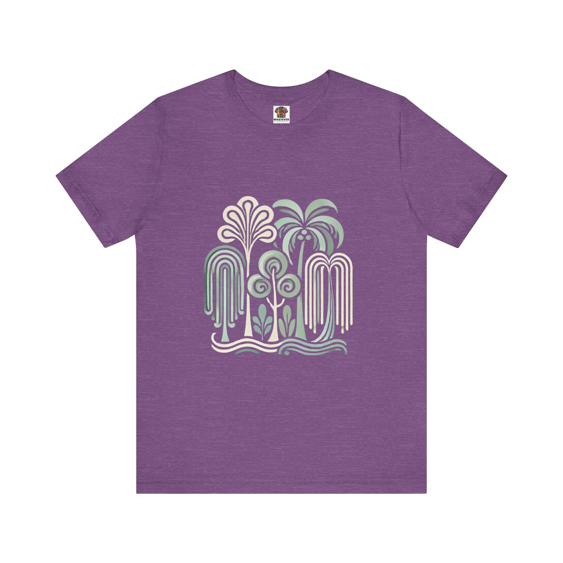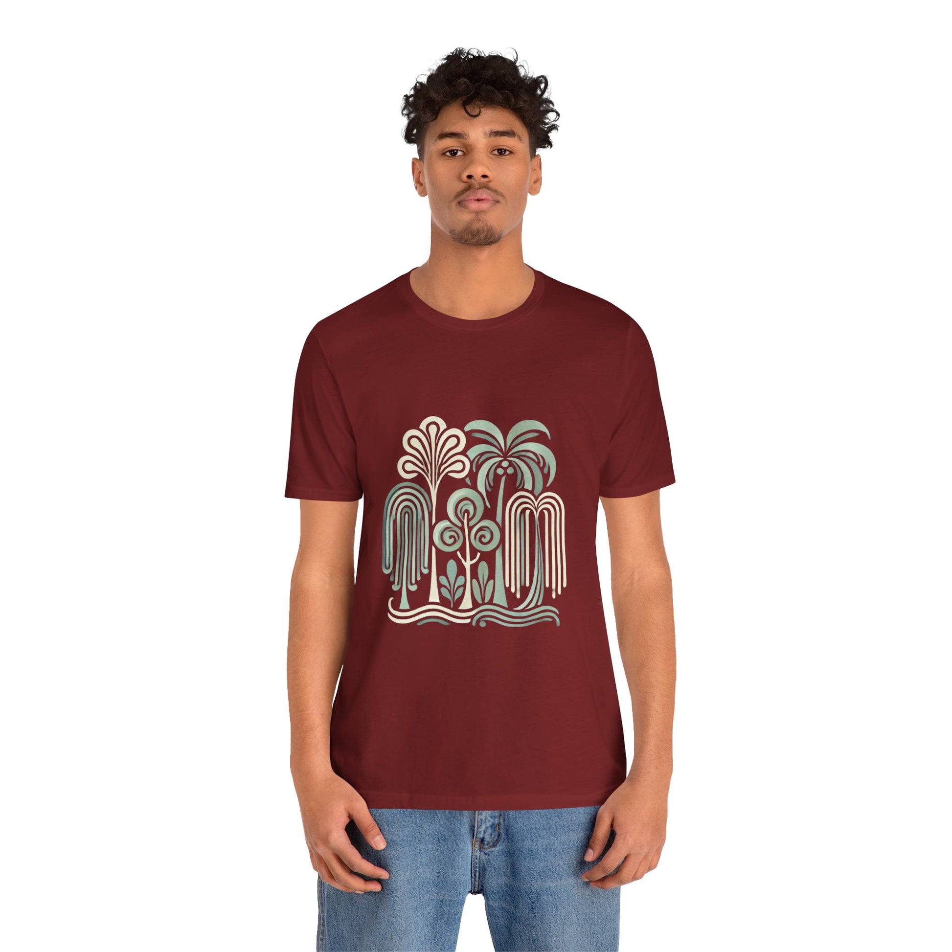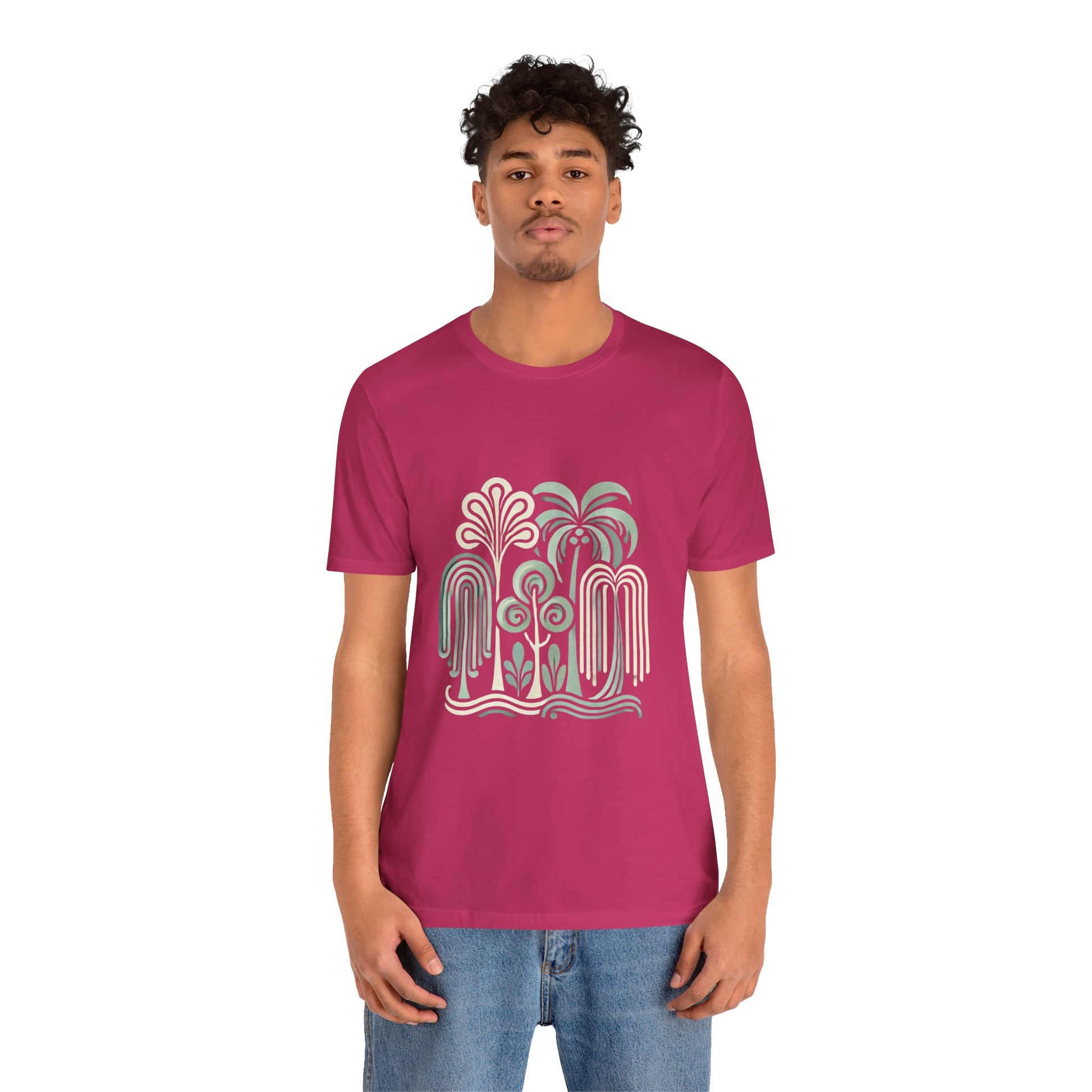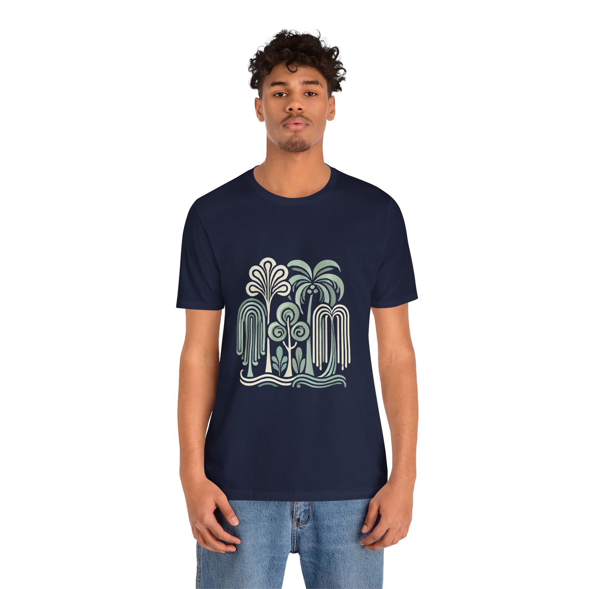 Stylized palm and willow trees with flowing, wavy lines, illustrated in soft pastel tones with a distressed, groovy look.