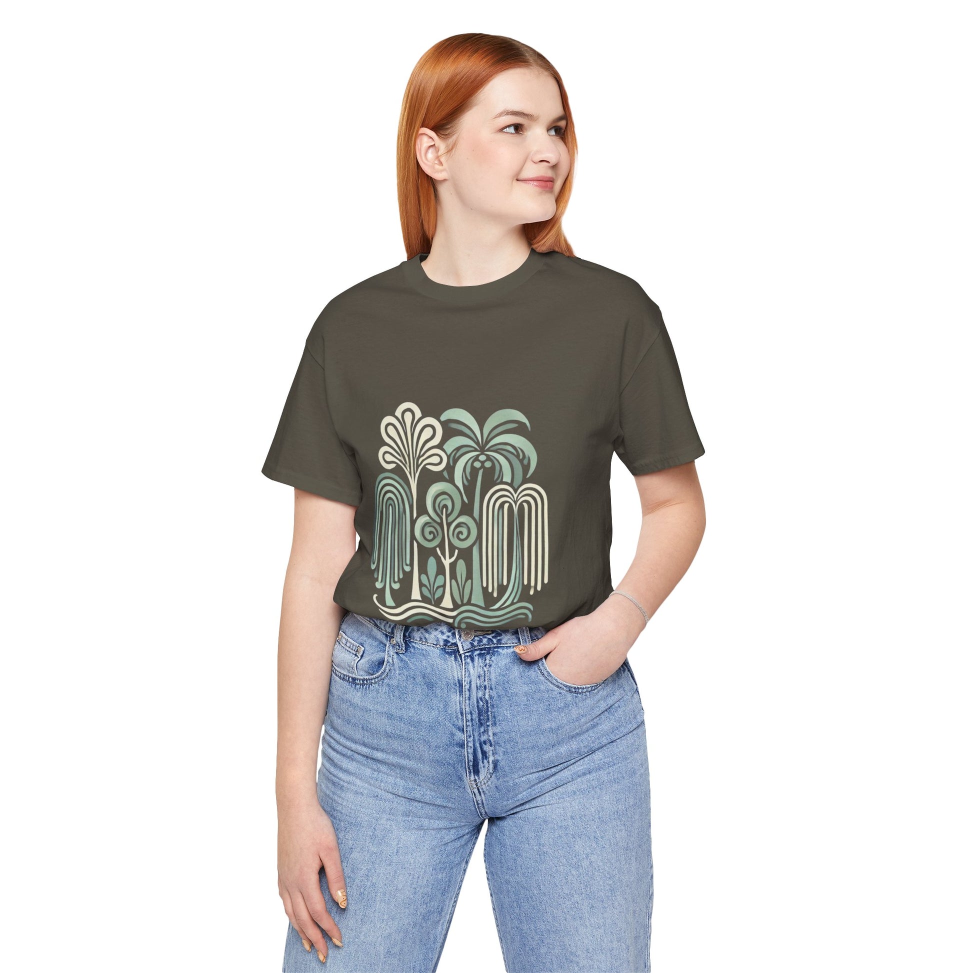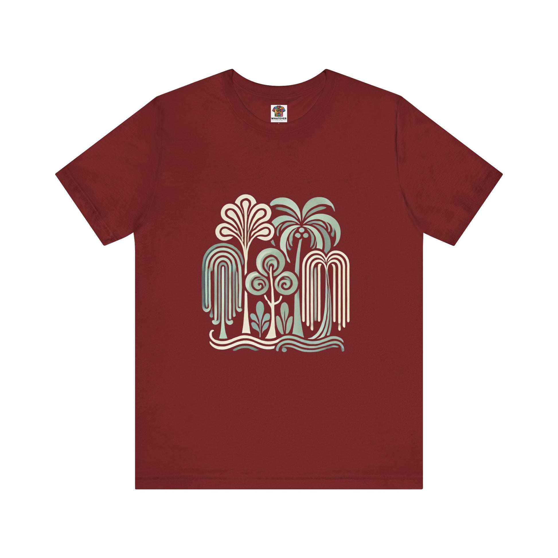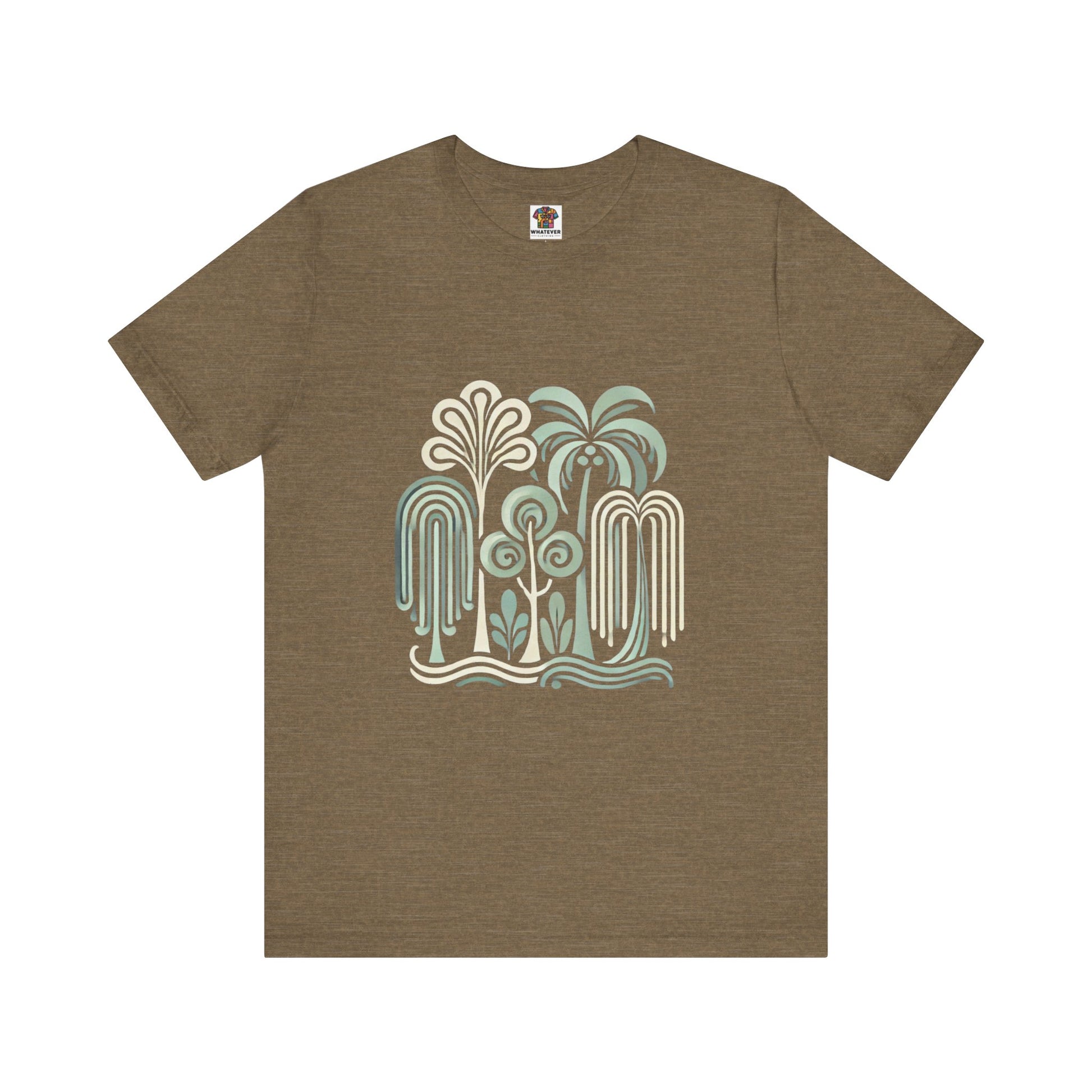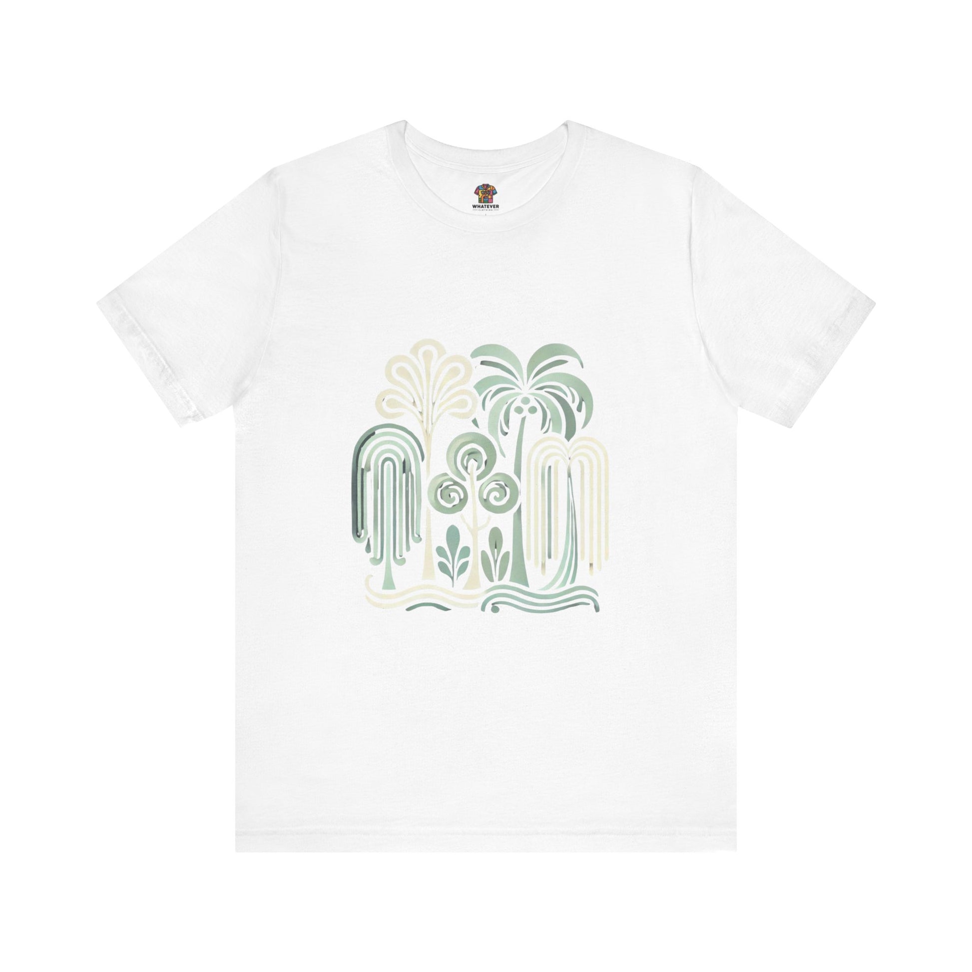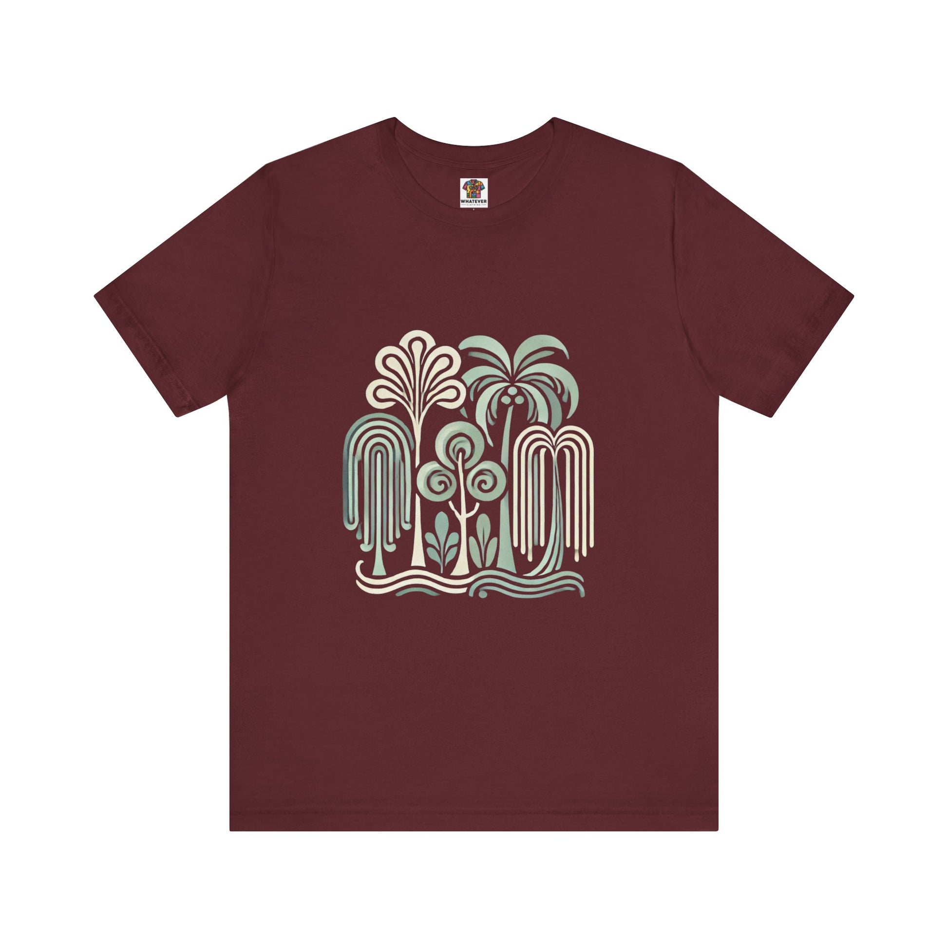Stylized palm and willow trees with flowing, wavy lines, illustrated in soft pastel tones with a distressed, groovy look.