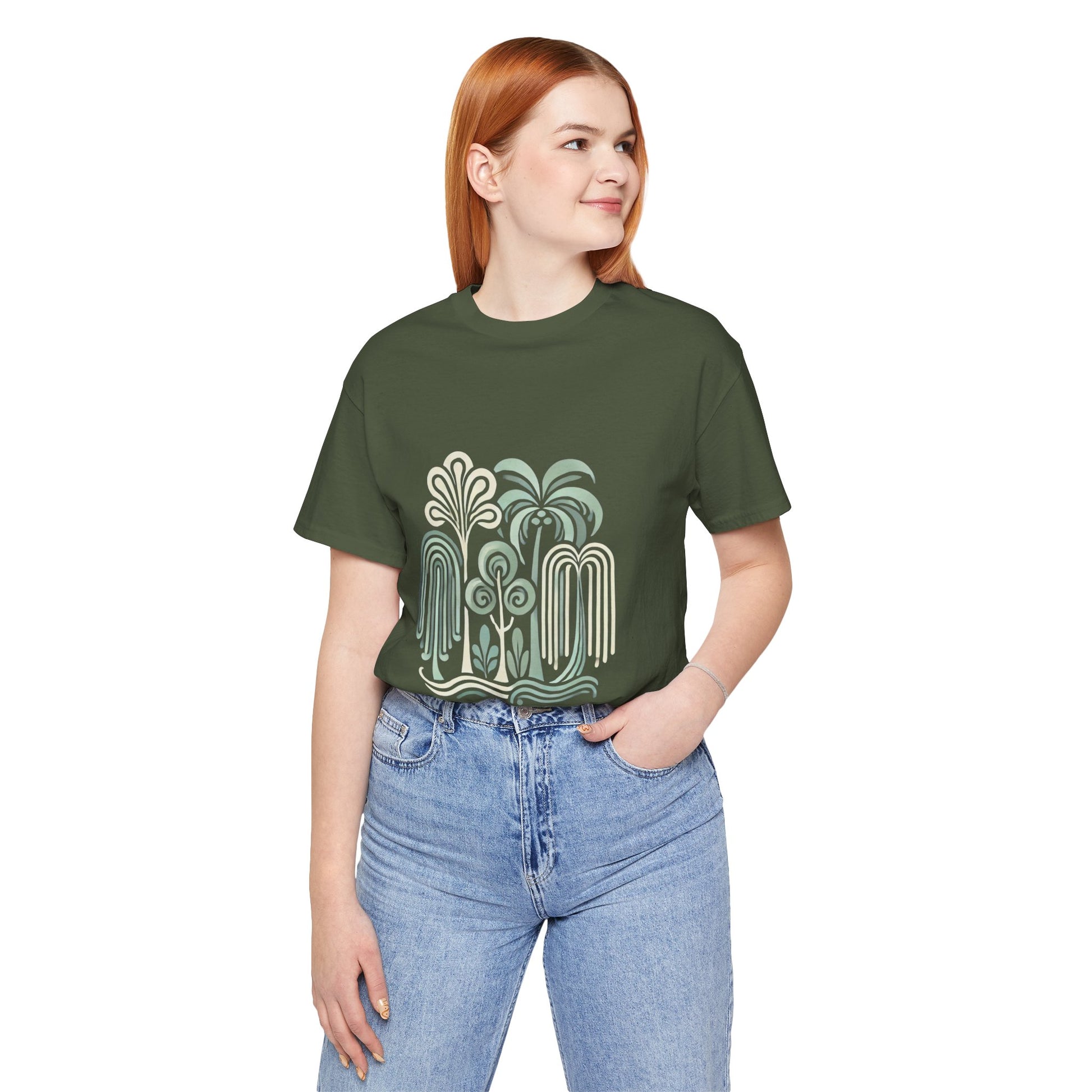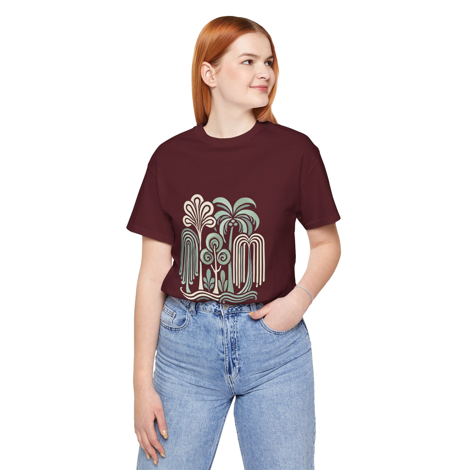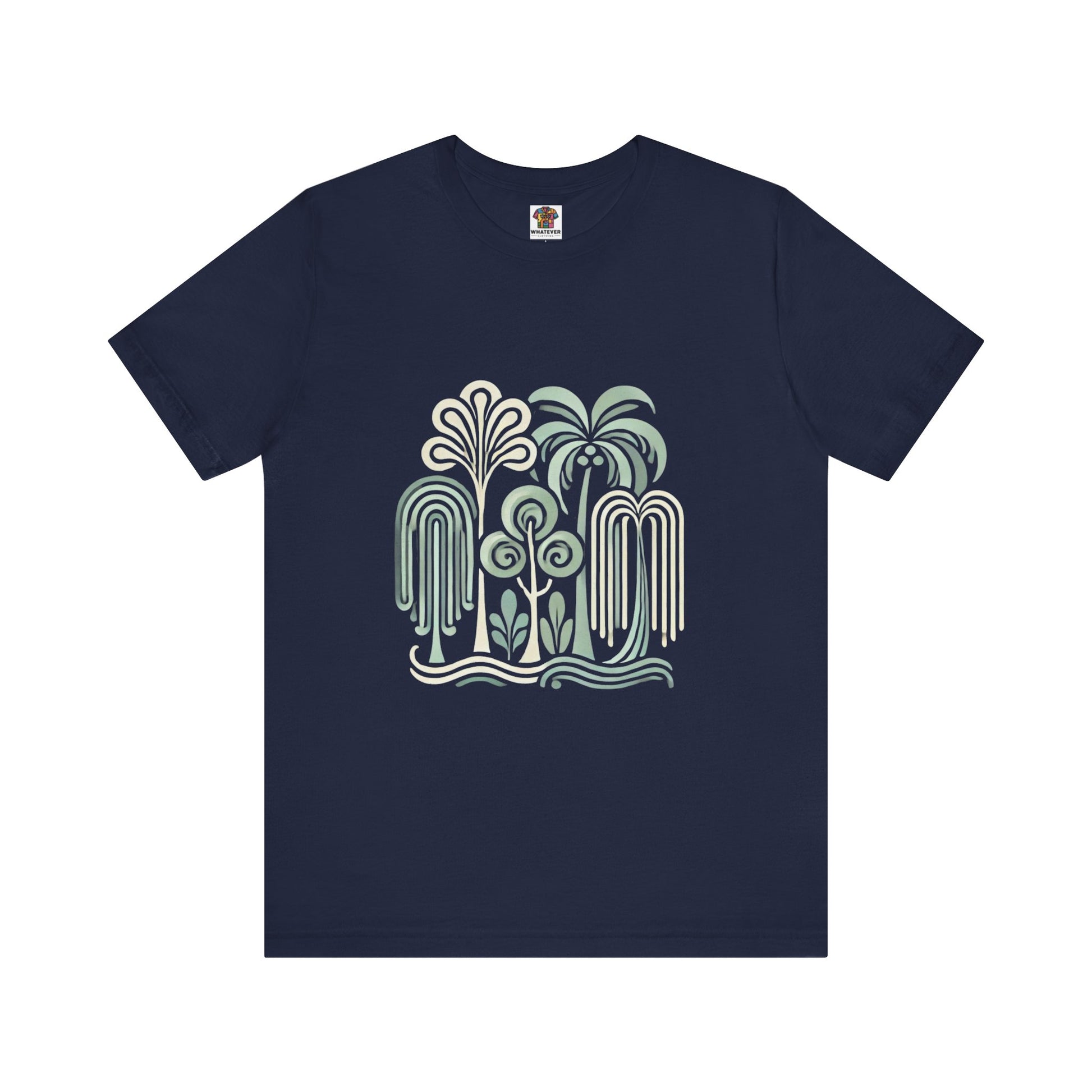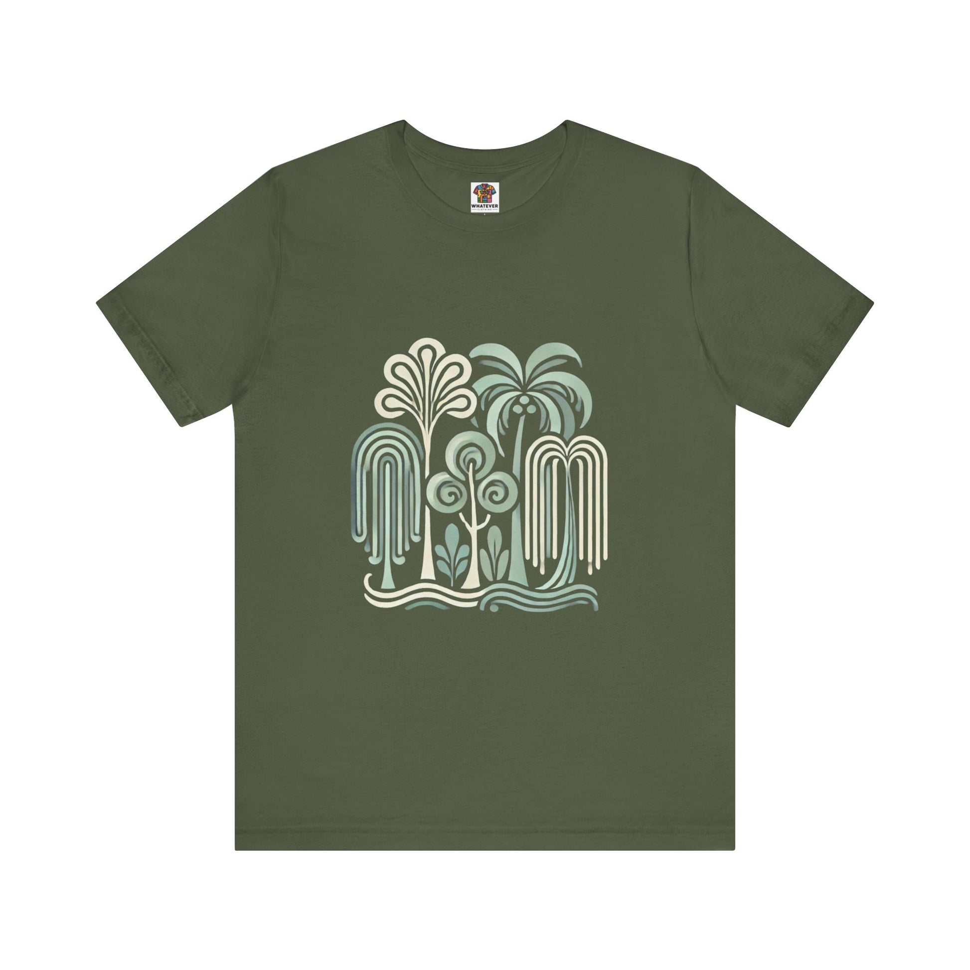 Stylized palm and willow trees with flowing, wavy lines, illustrated in soft pastel tones with a distressed, groovy look.