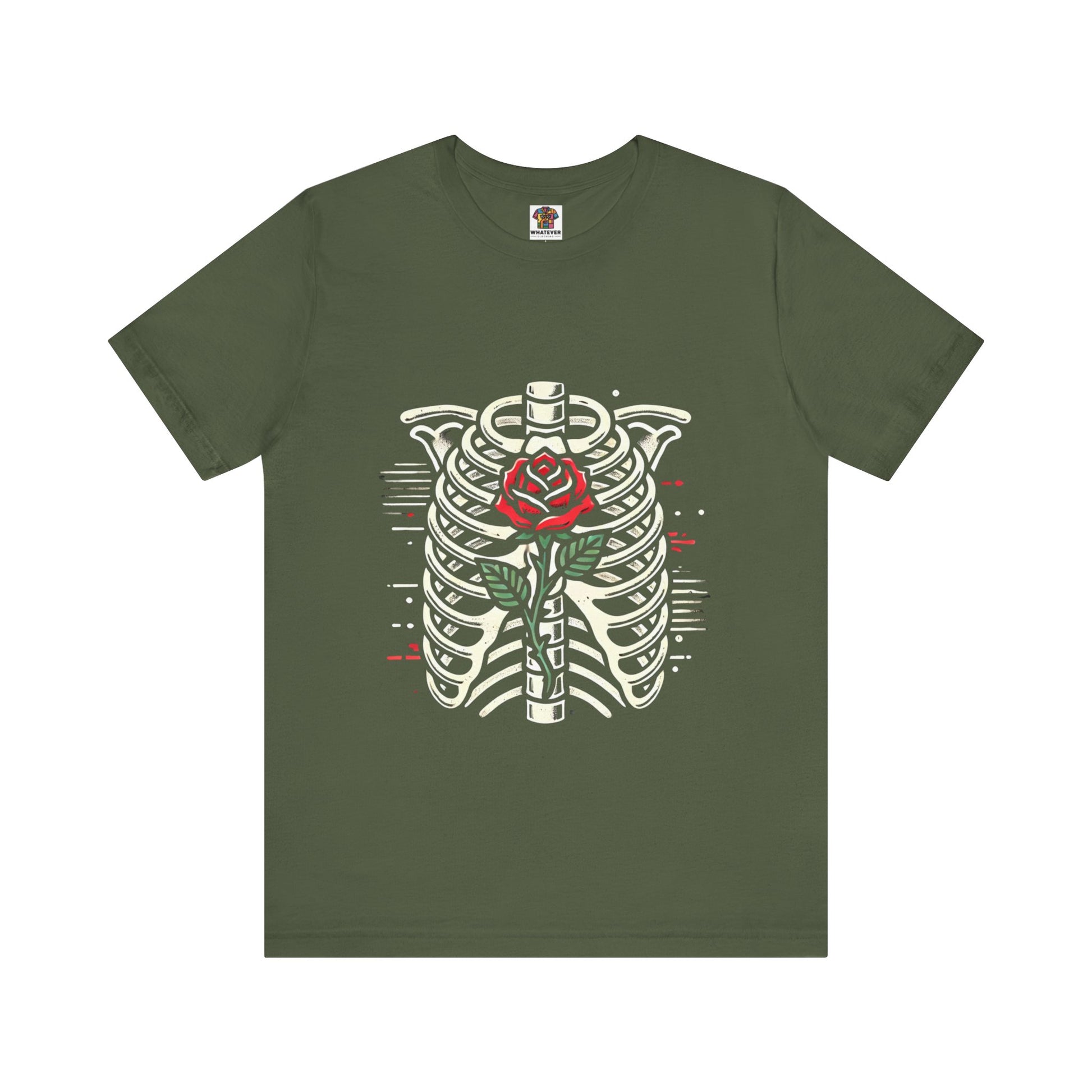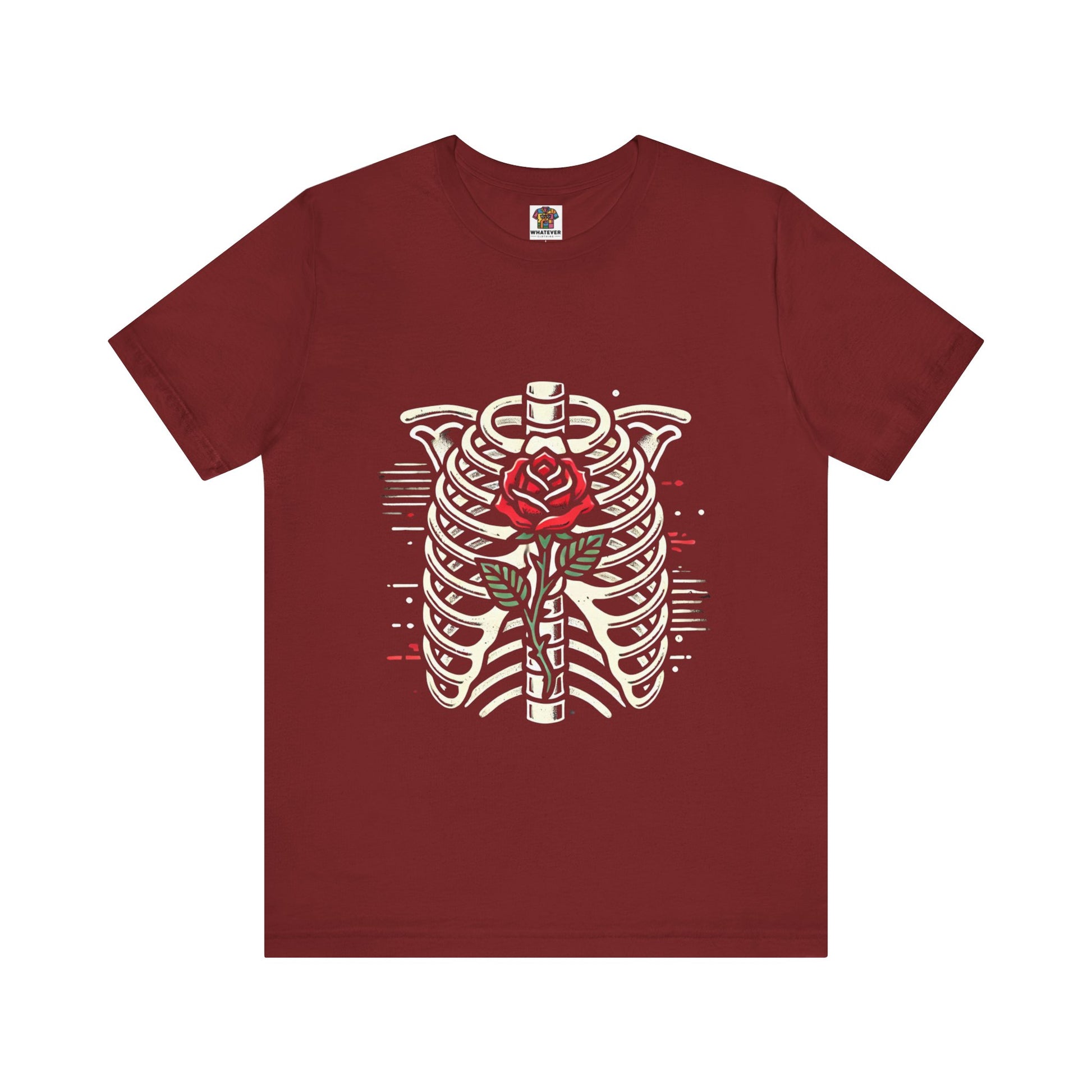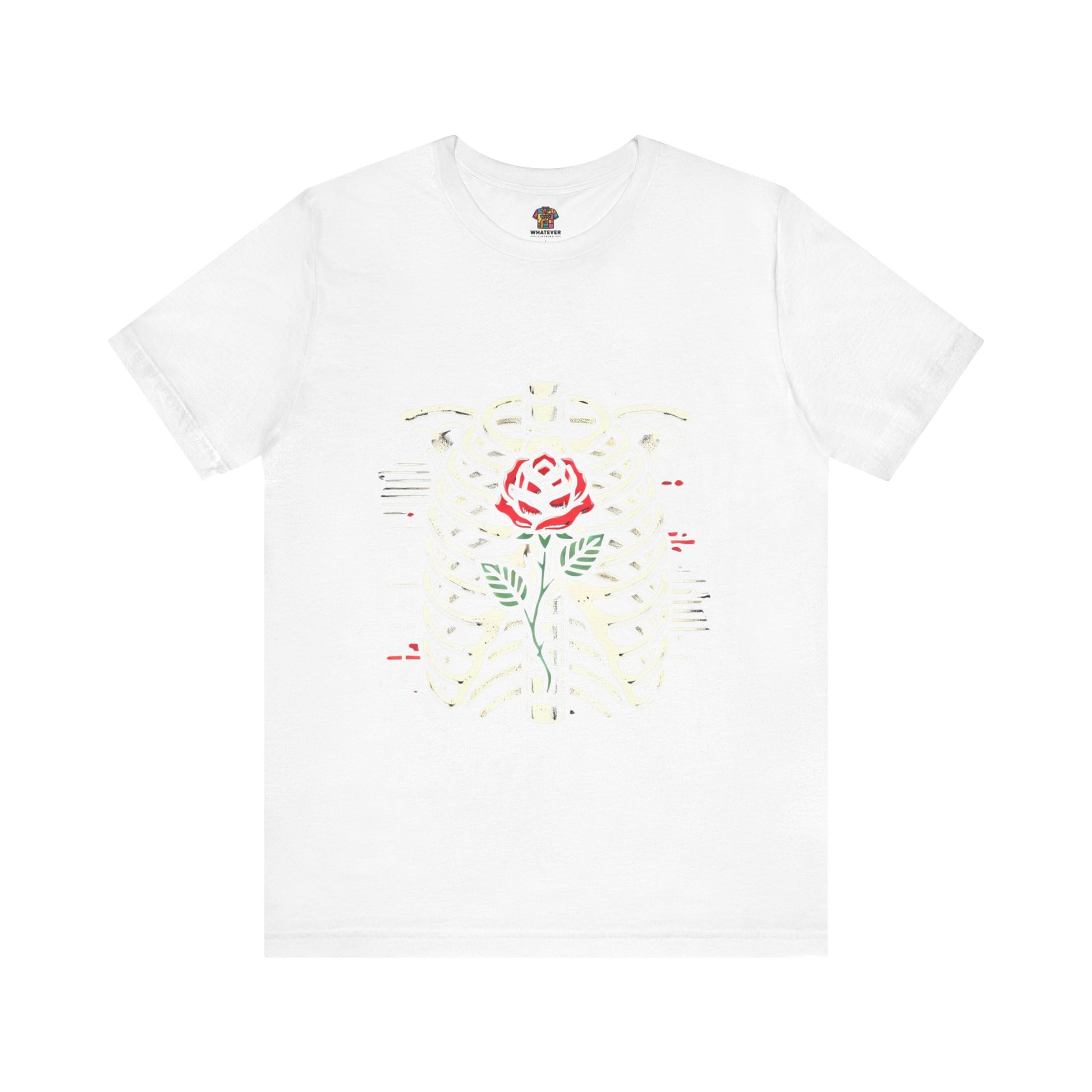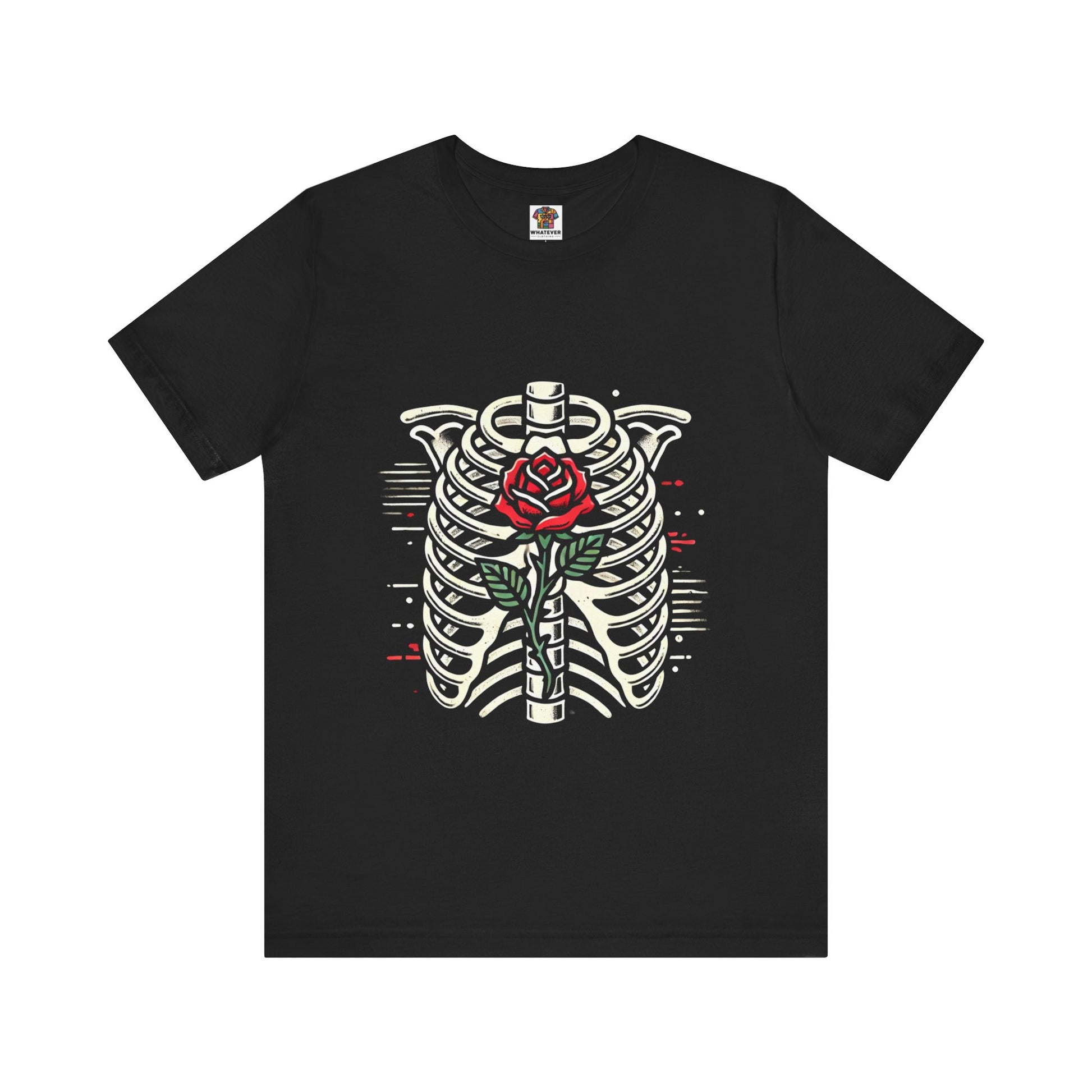 A human ribcage with a blooming red rose in the center, rendered in bold black and white.