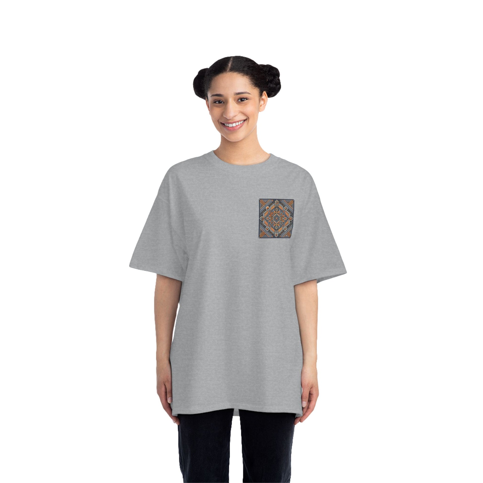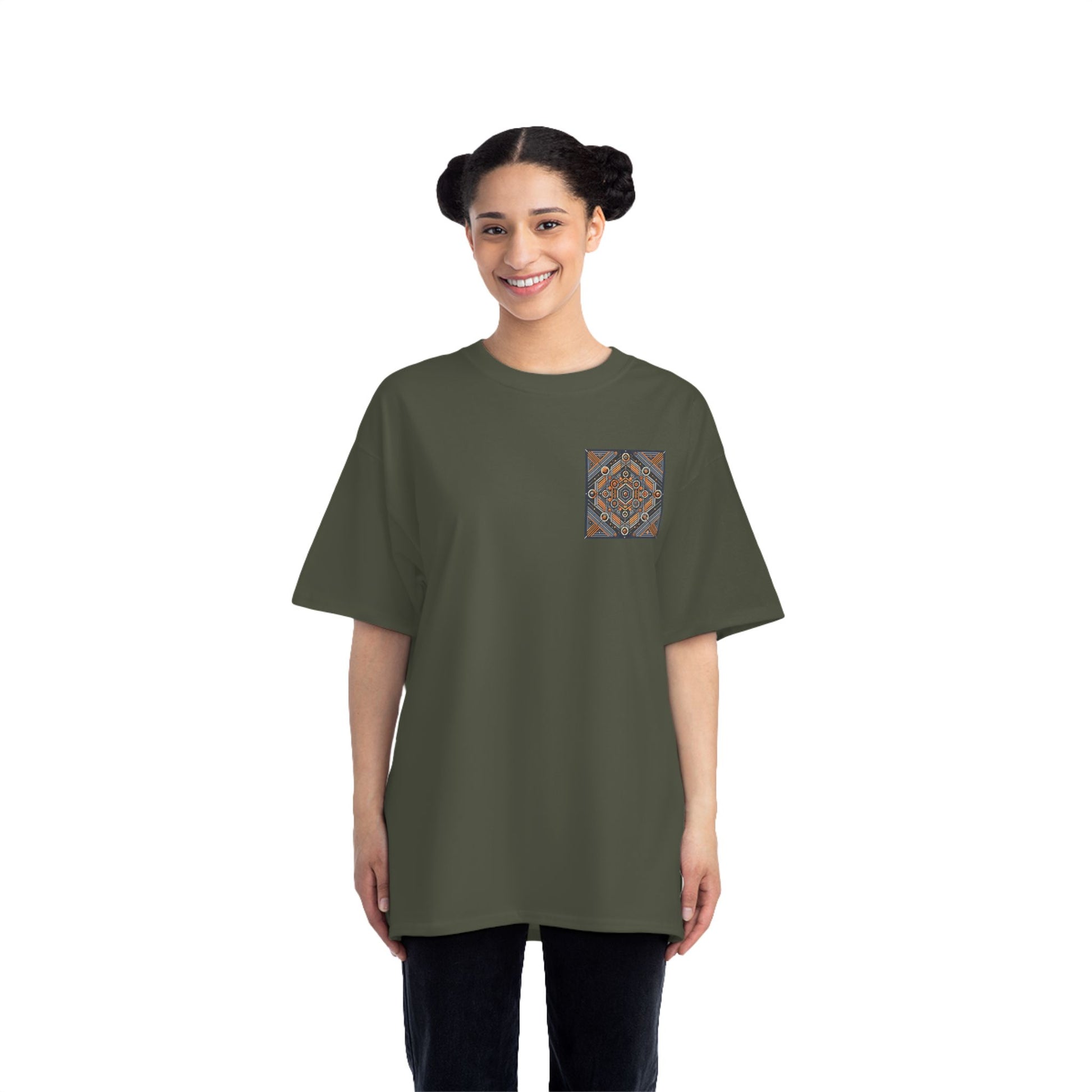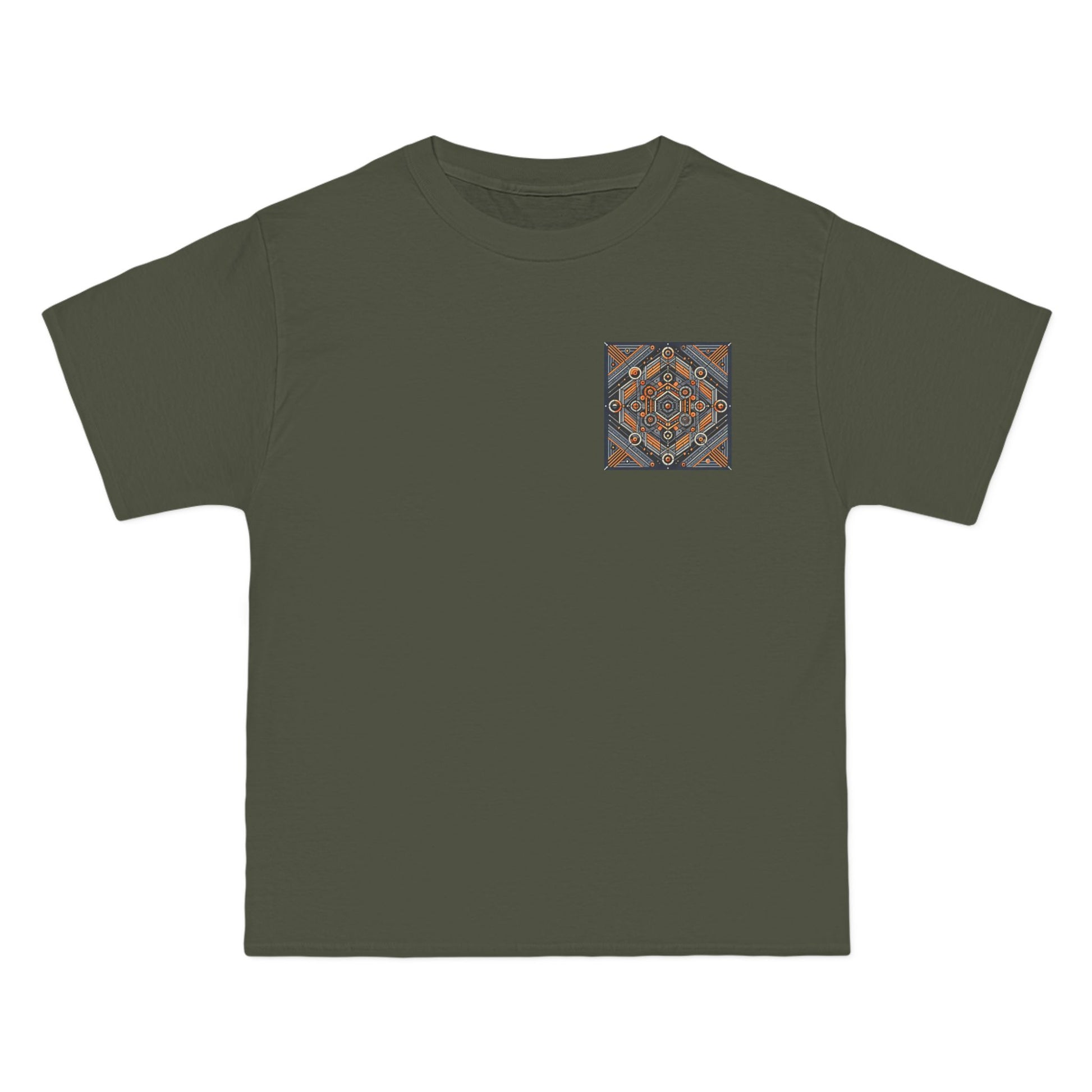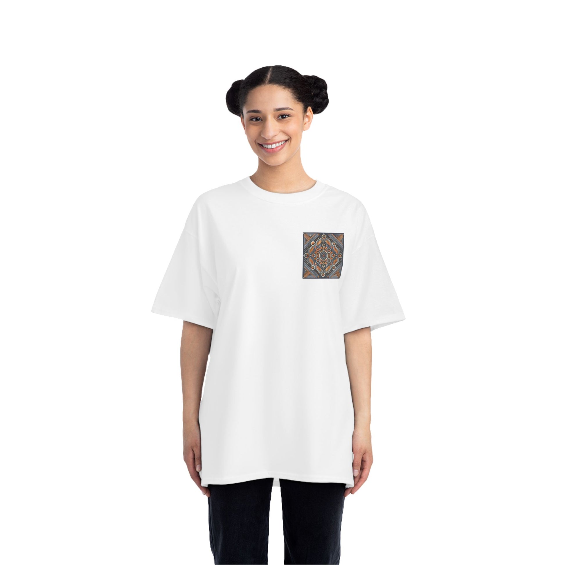 The complex geometric patterns, drawn from sacred geometry and arranged symmetrically, are a testament to the power of AI in transforming ideas into wearable art. This tee is more than just clothing – it's a canvas for your individuality.