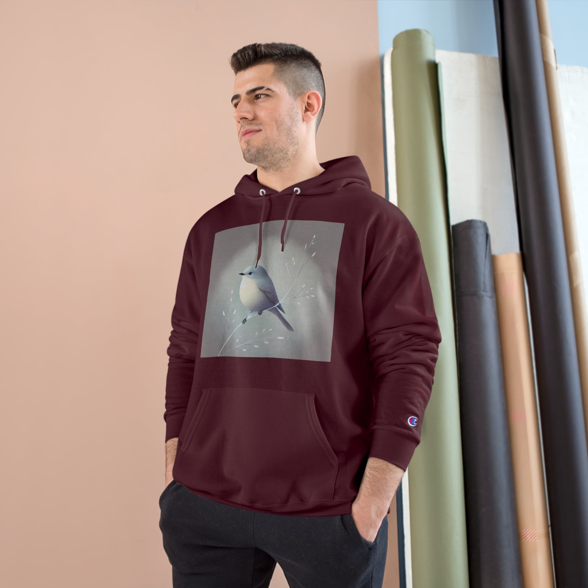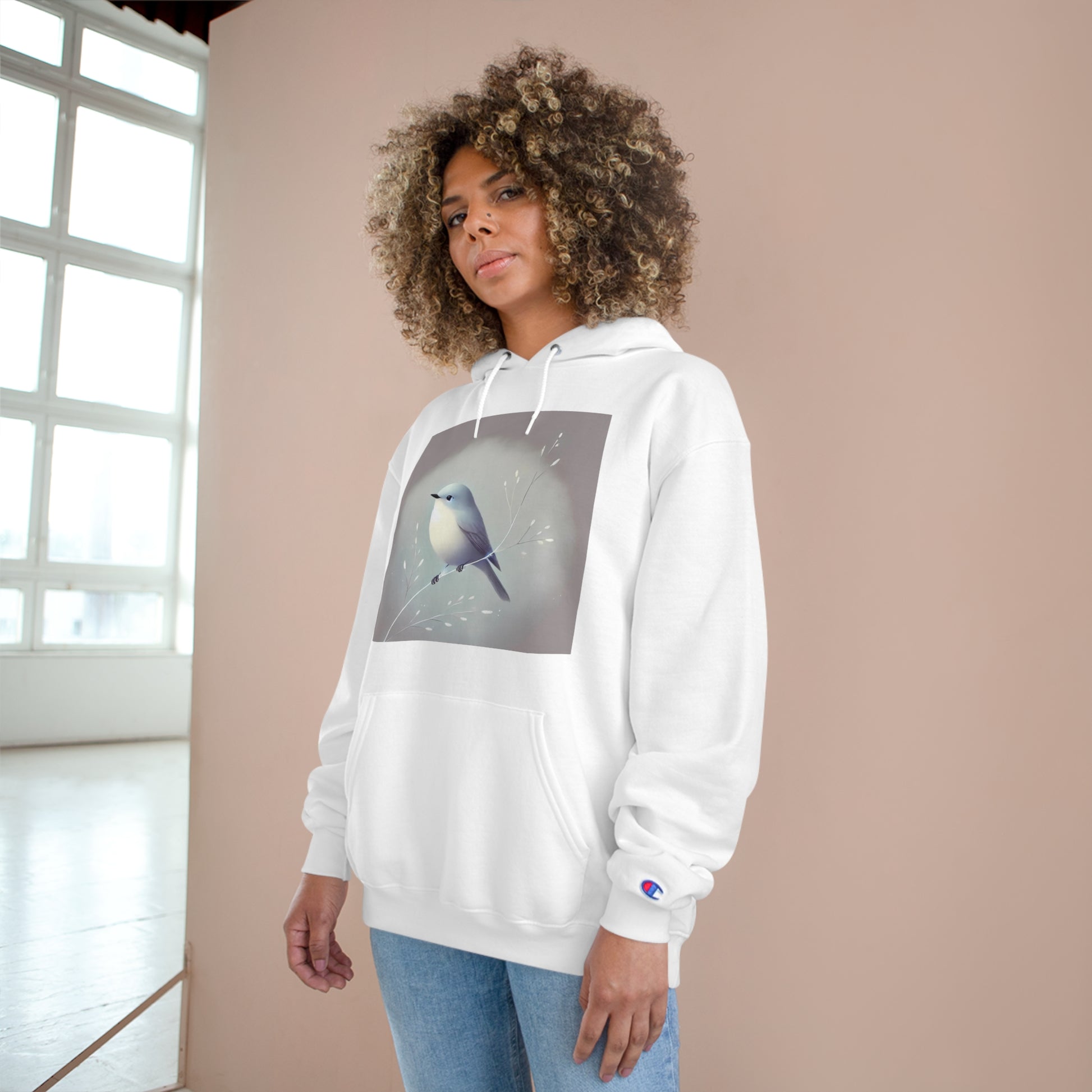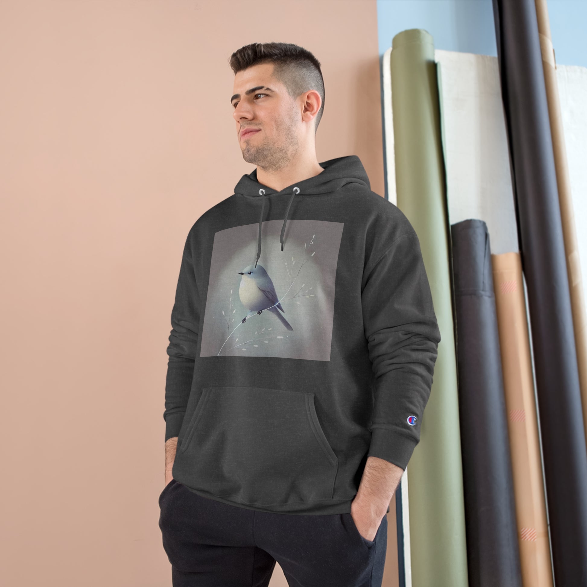 Crafted from a comfy blend of cotton and recycled polyester, this hoodie features a tranquil bird perched on a delicate branch. The soft pastel tones set against a minimalist gray background evoke a sense of peace and nostalgia.