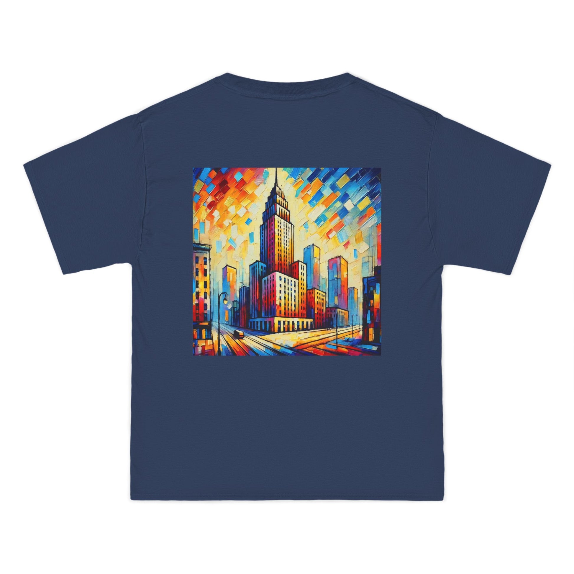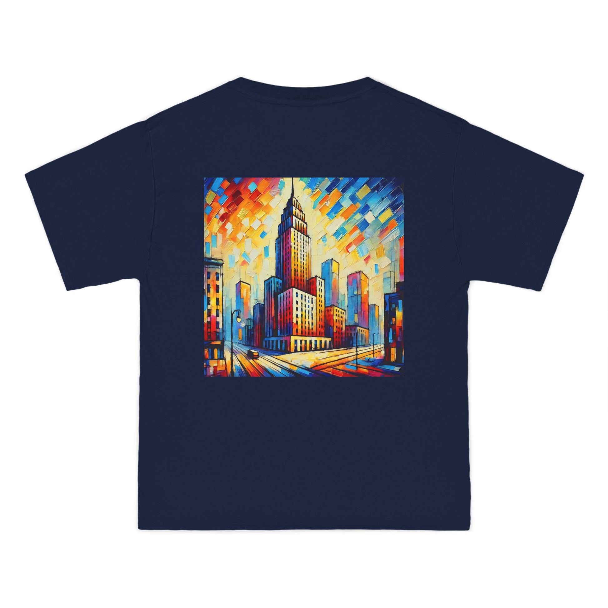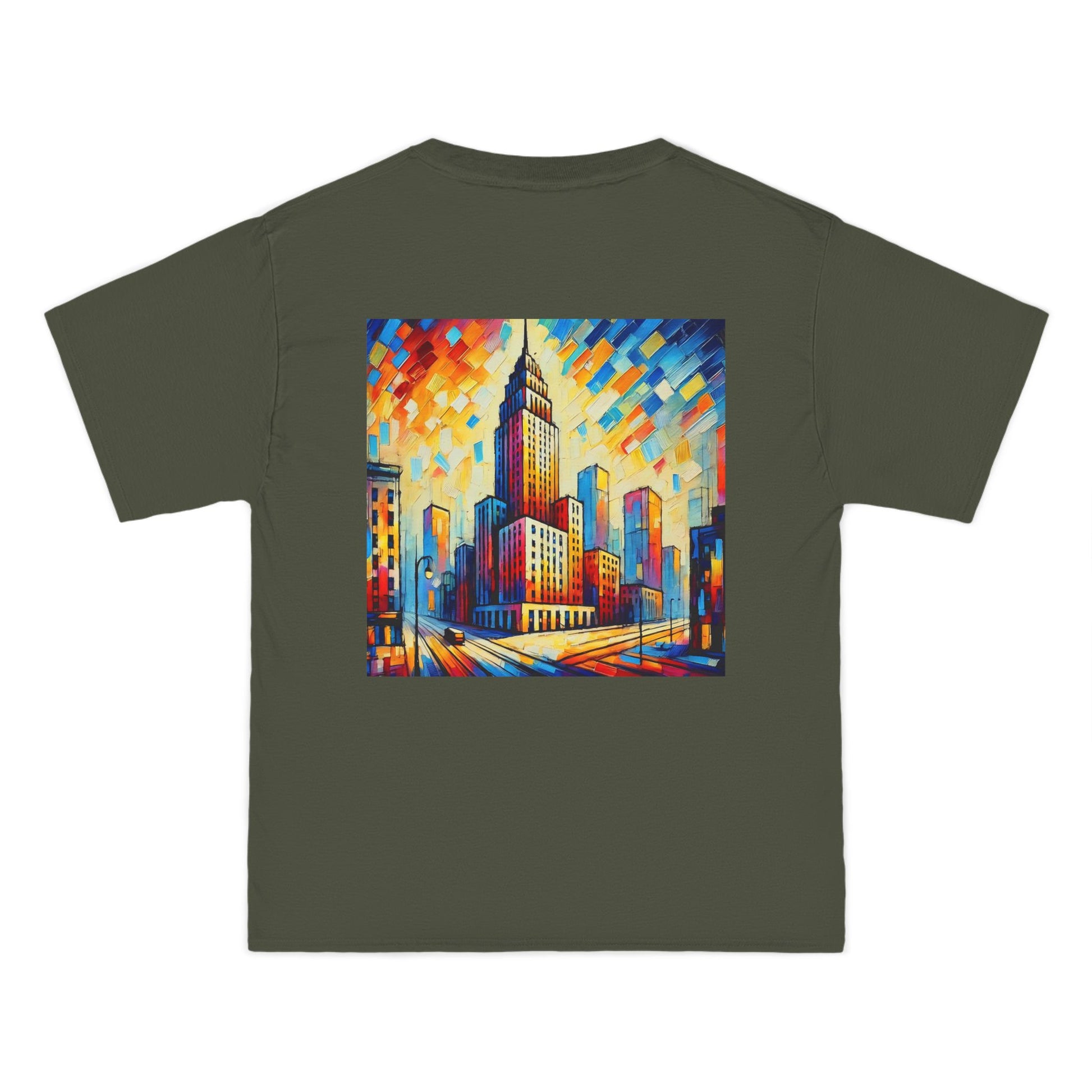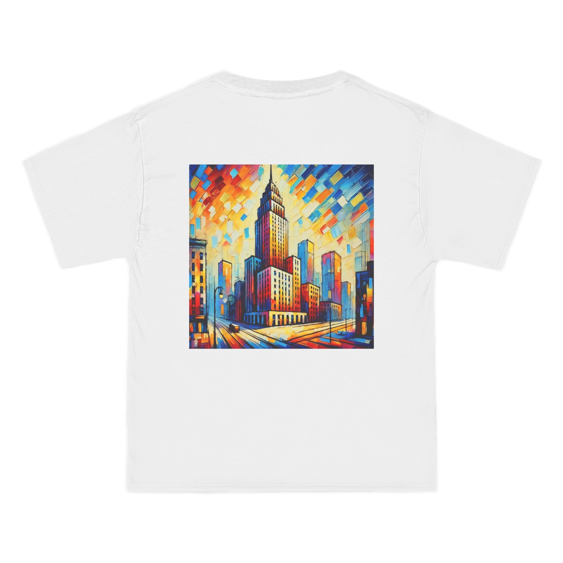 The design? A vibrant, AI-generated painting of a cityscape skyscraper, alive with abstract details and bursting with color. Reminiscent of a world seen through the lens of Fauvism, this shirt is all about expressing your unique perspective. It's more than just a skyline - it's a canvas where the concrete jungle meets the abstract wilderness.