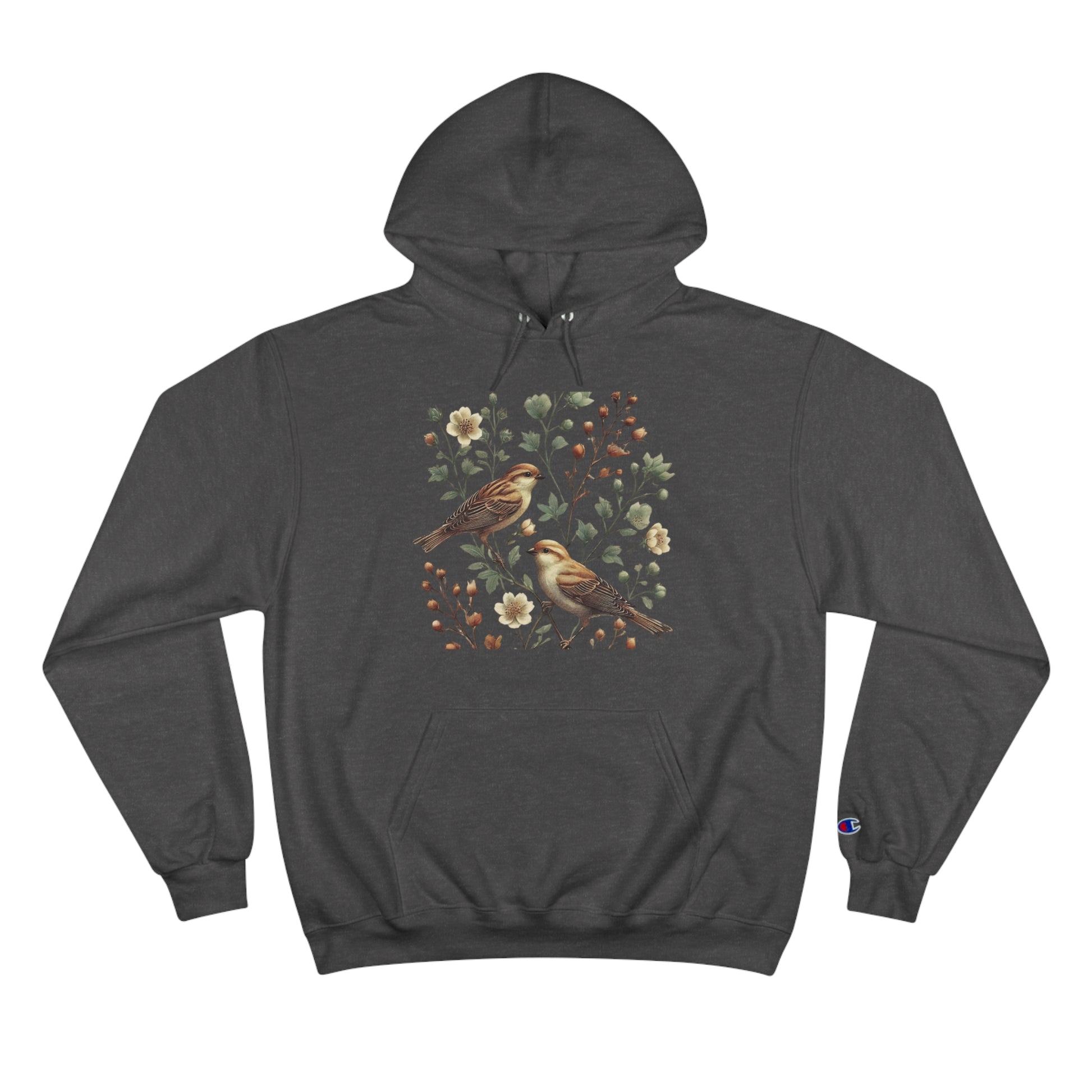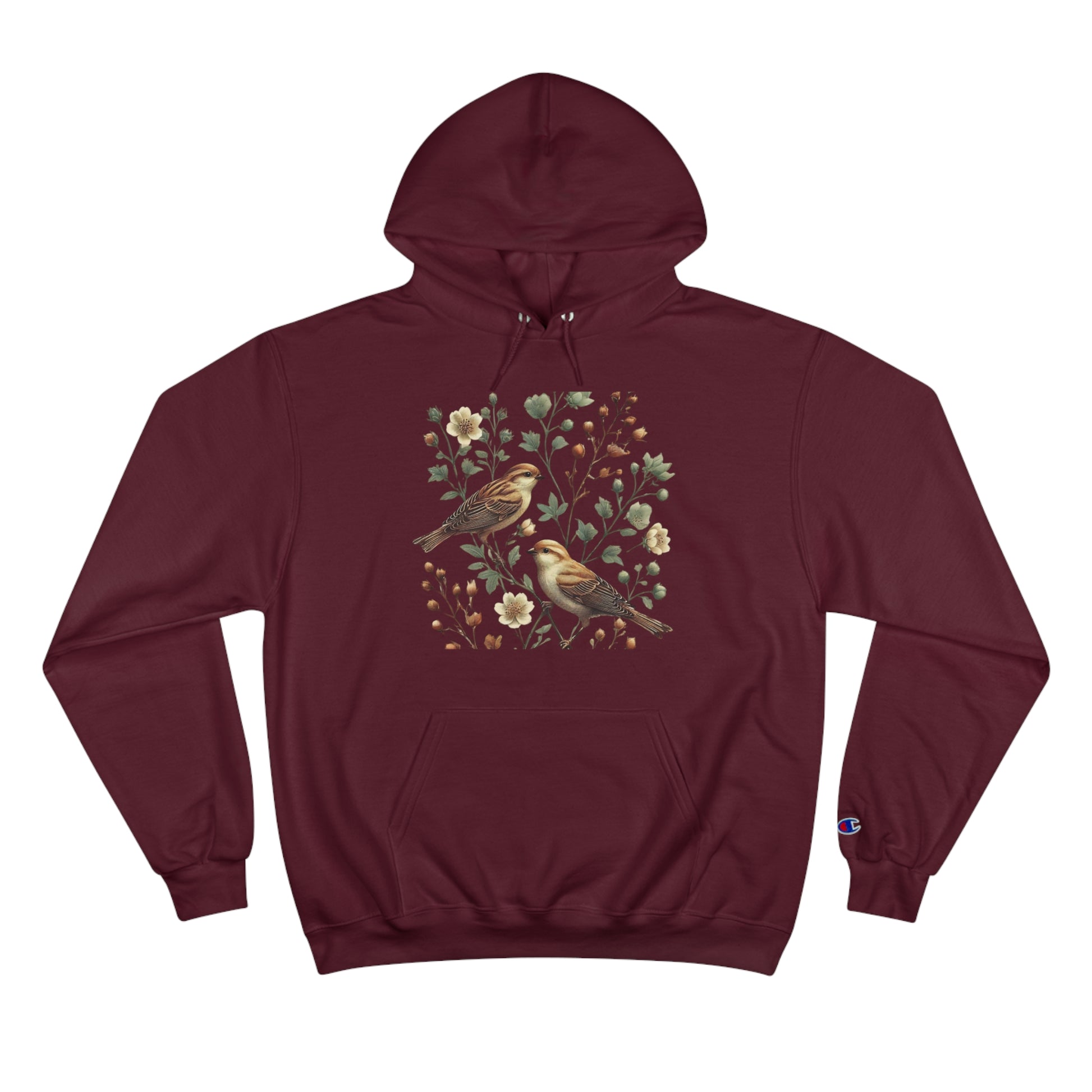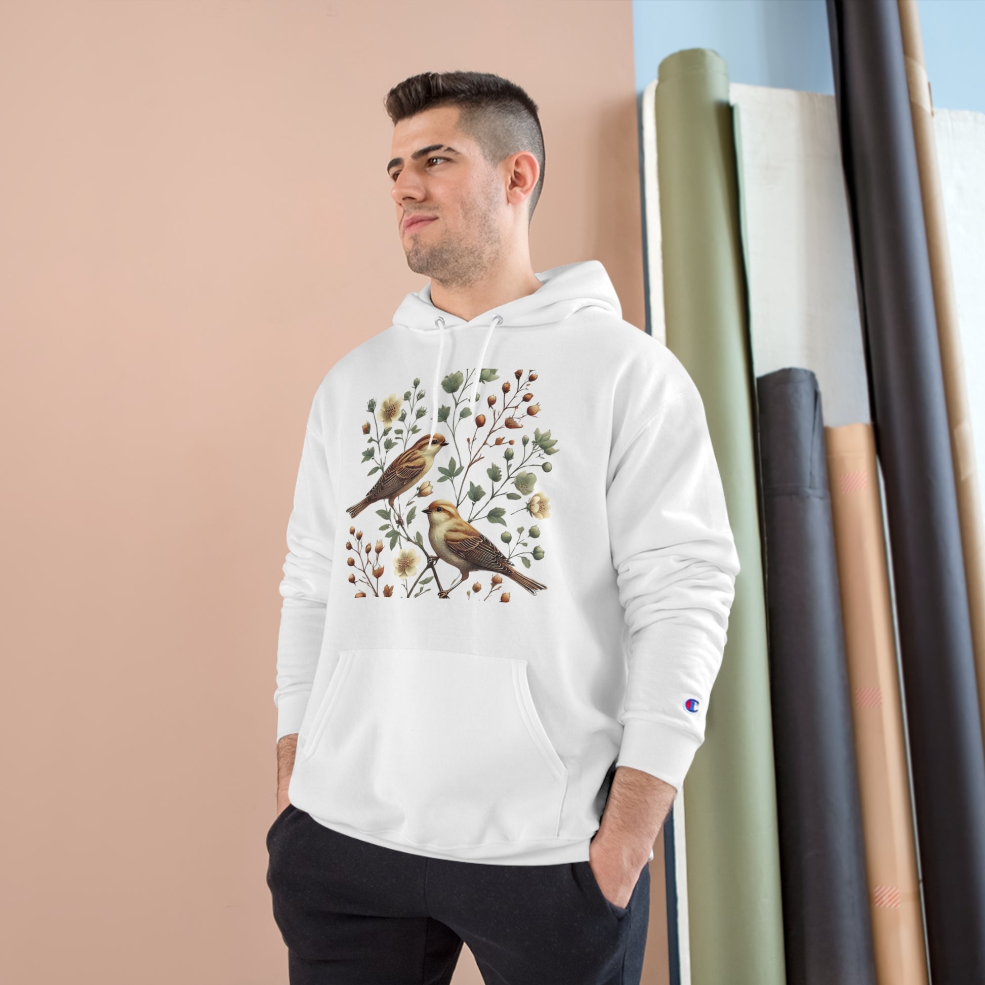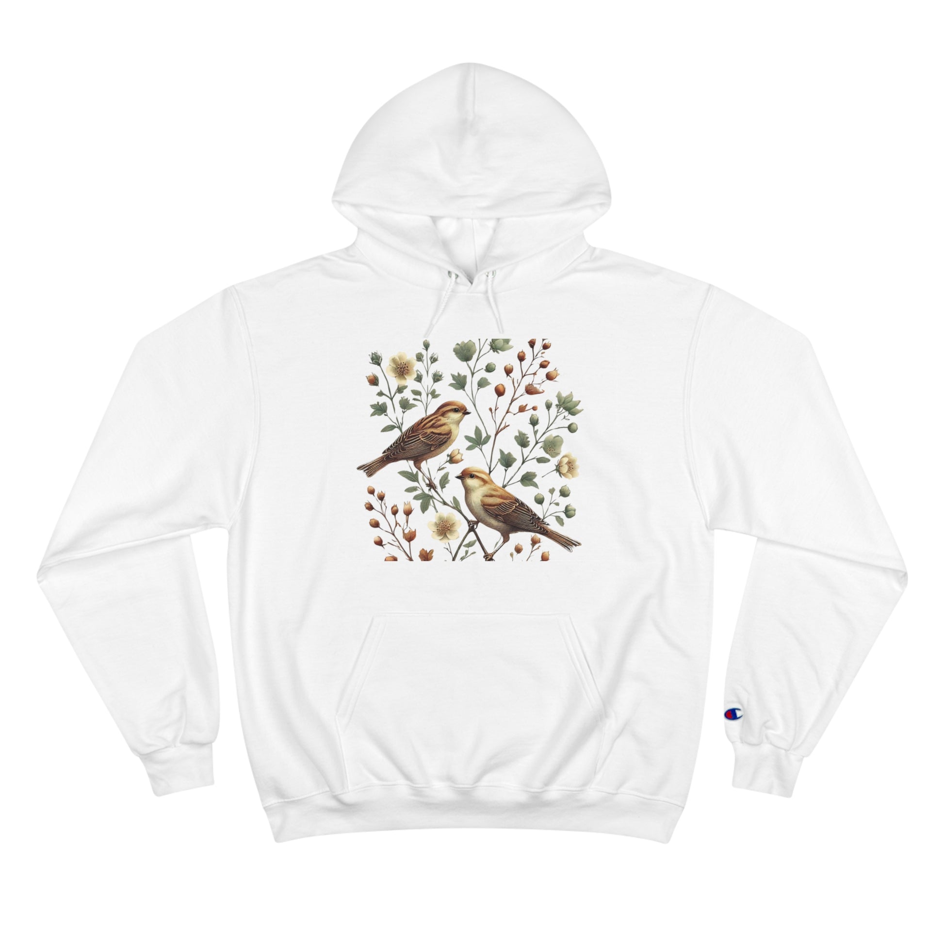 The hoodie features a delightful AI-generated design of small songbirds perched on branches, their soft green tones and orange highlights harmonizing with the floral elements. A blend of technology and art, this design captures the essence of our brand - innovative, playful and empowering.