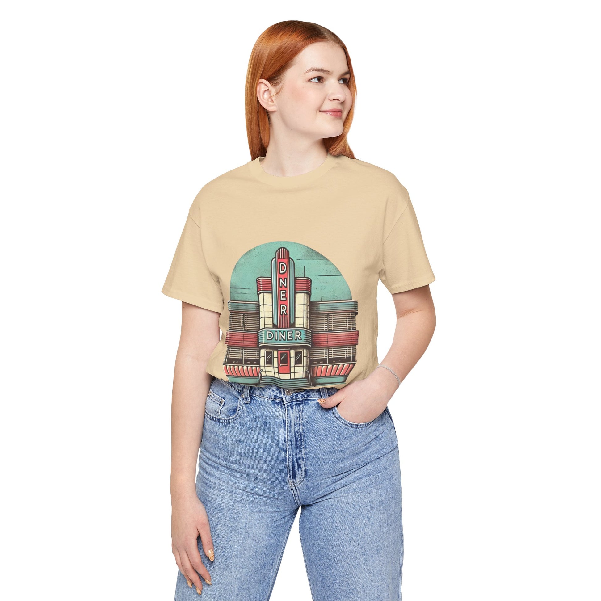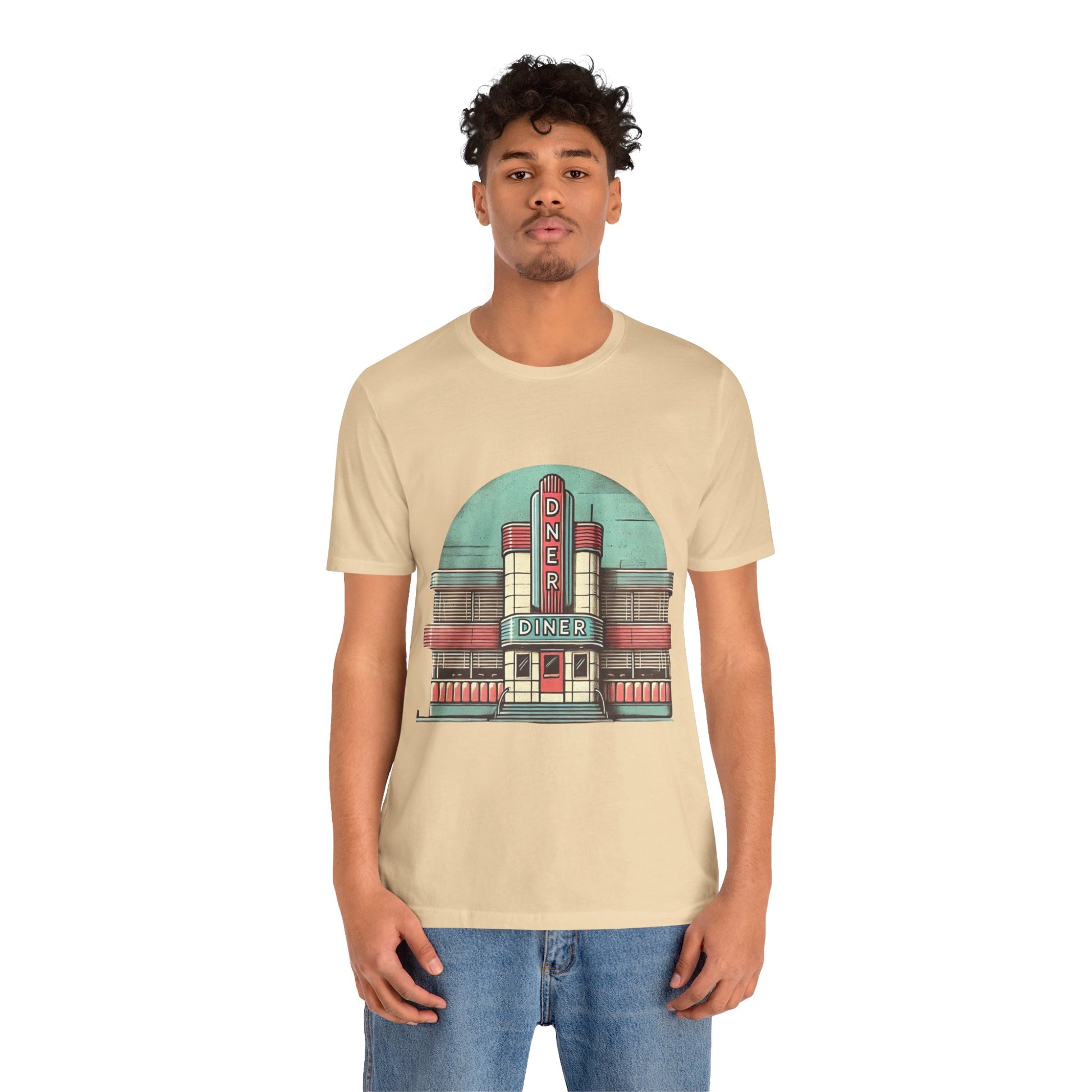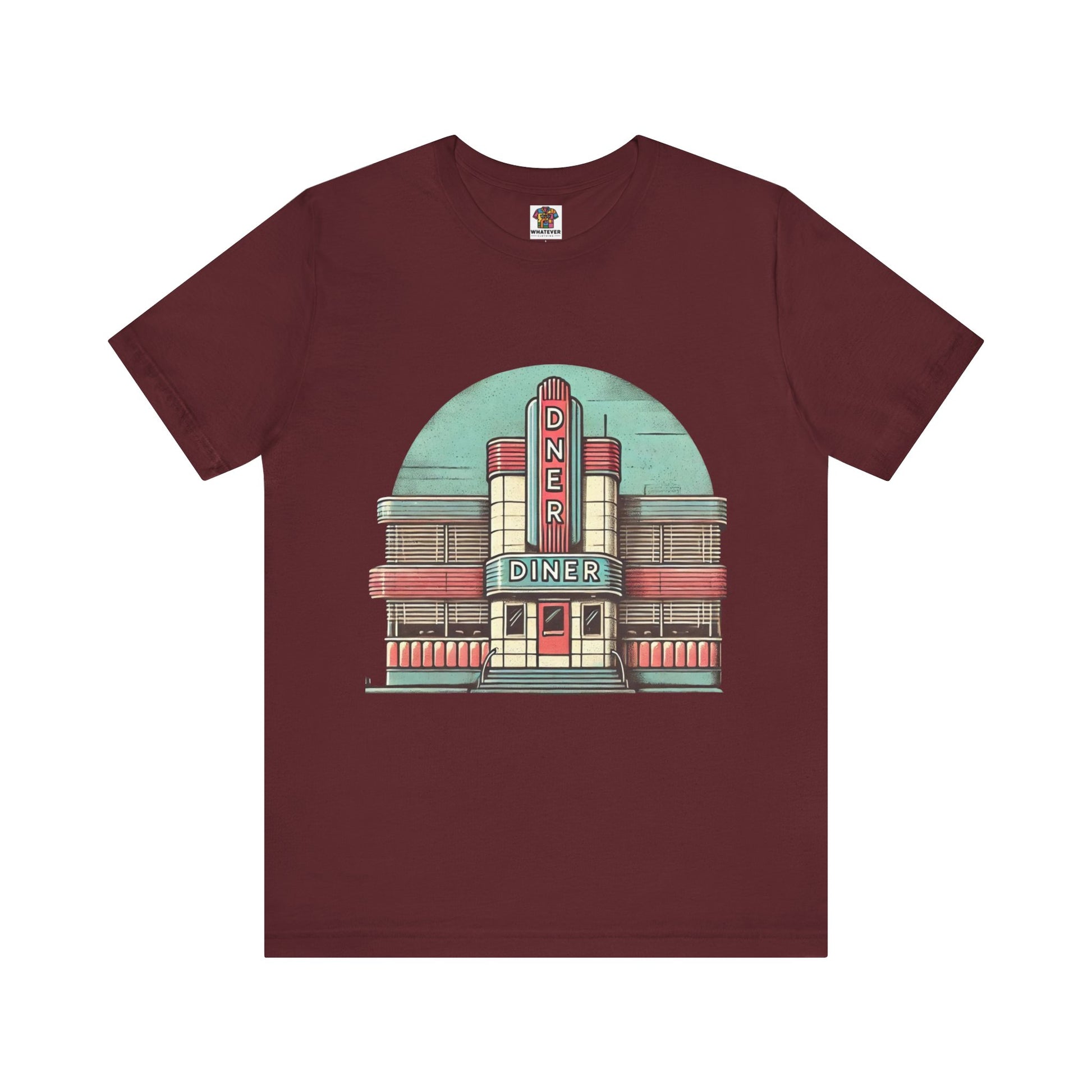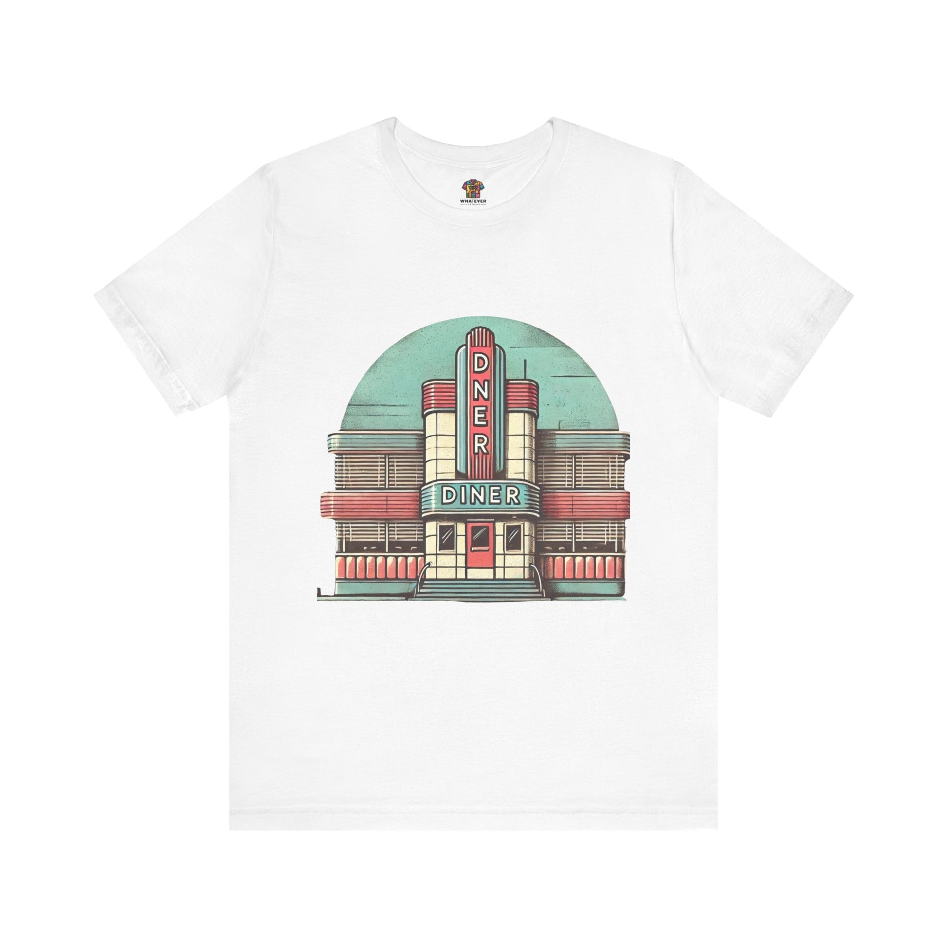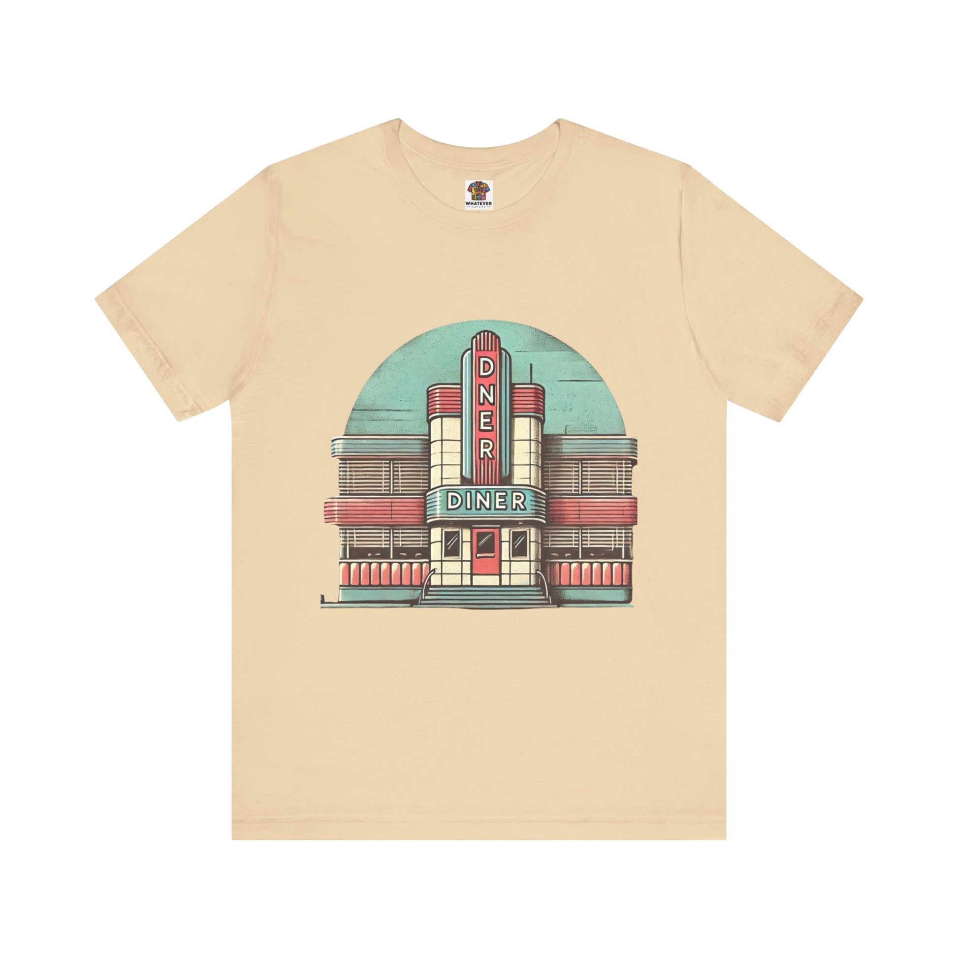 A stylized 1970s diner with bold outlines, colorful facades, and rounded edges, illustrated in pastel hues and a distressed, vintage look.