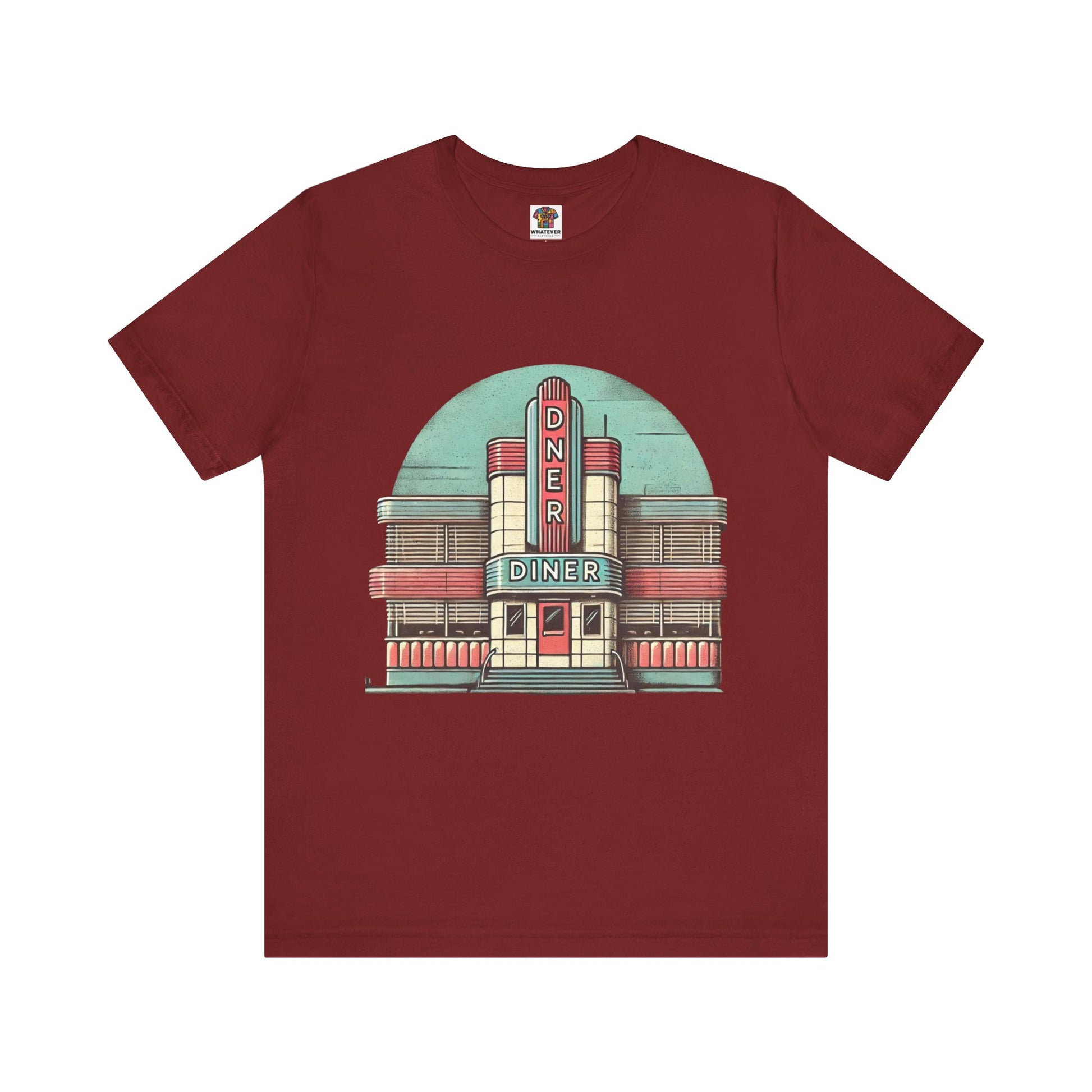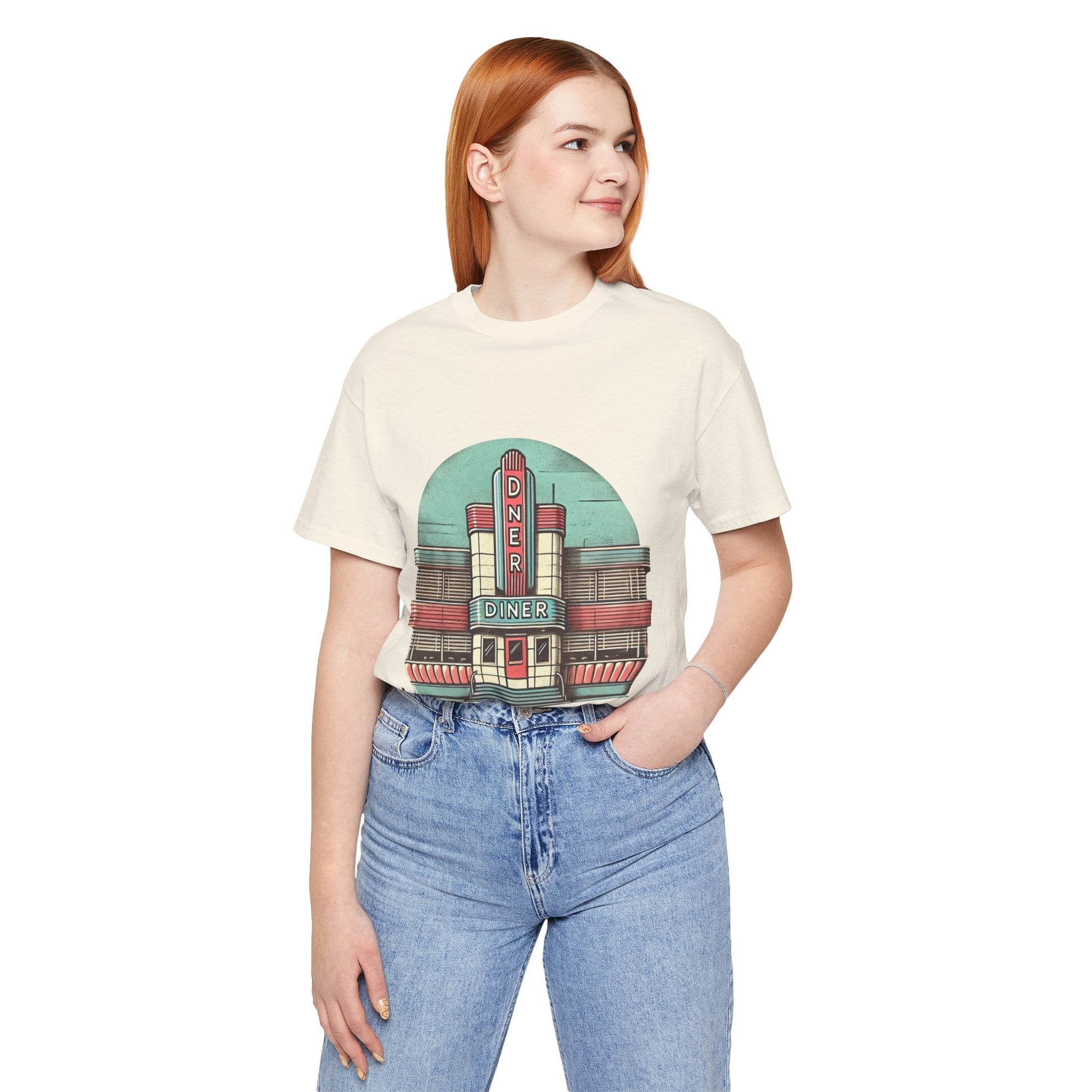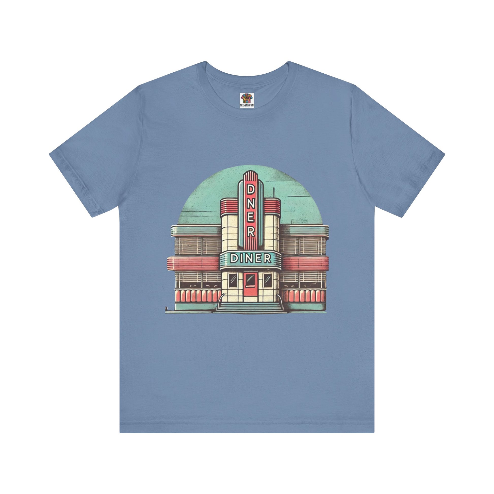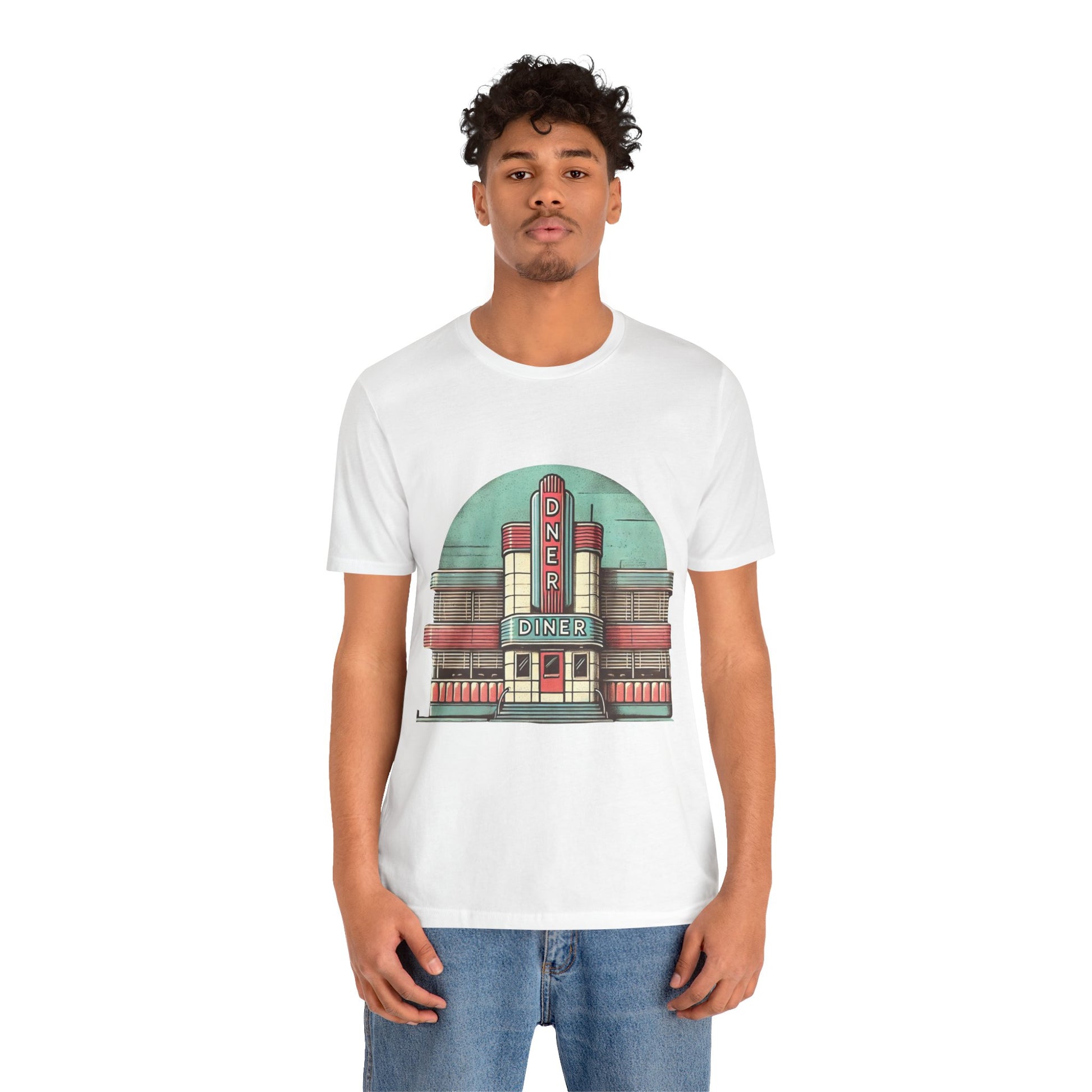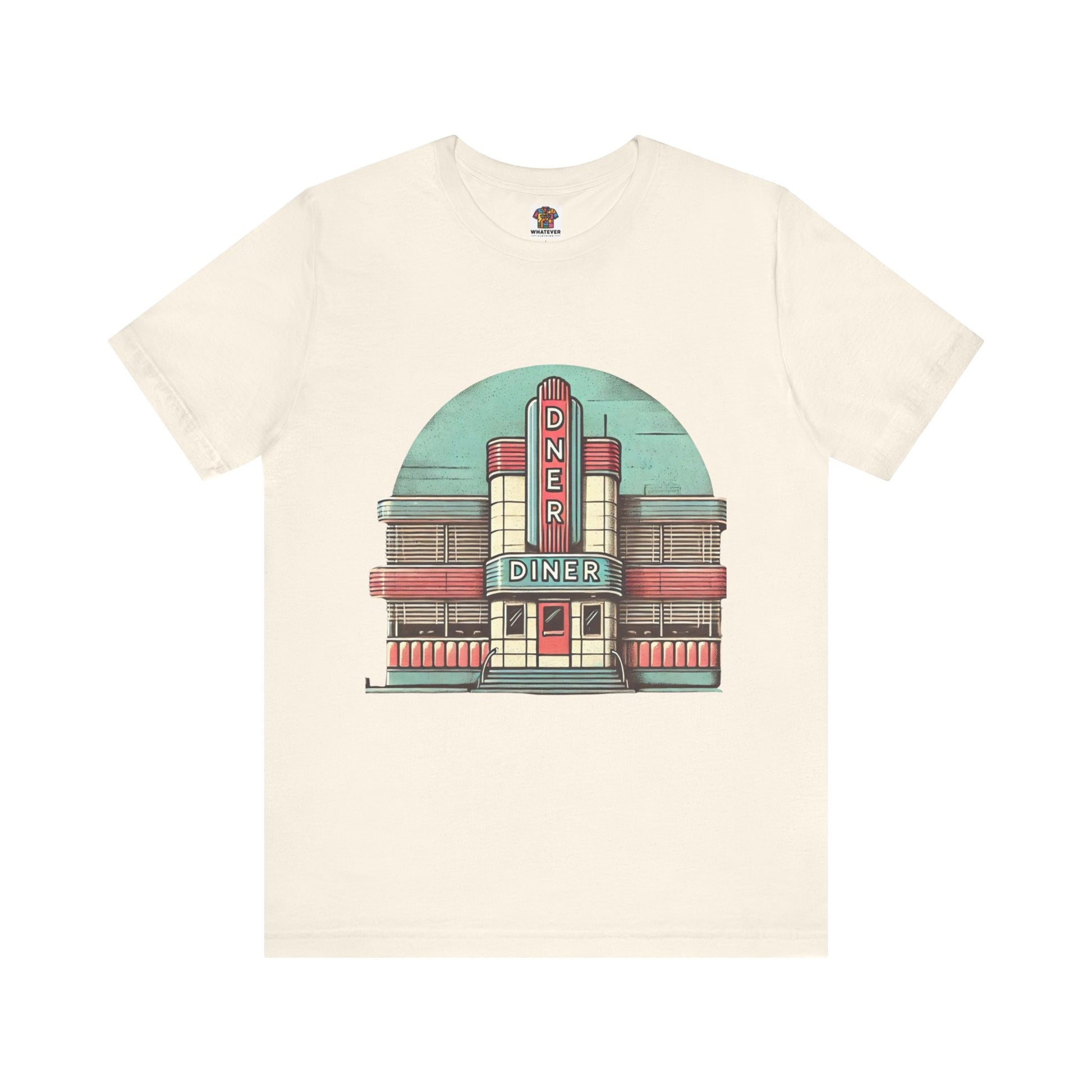 A stylized 1970s diner with bold outlines, colorful facades, and rounded edges, illustrated in pastel hues and a distressed, vintage look.