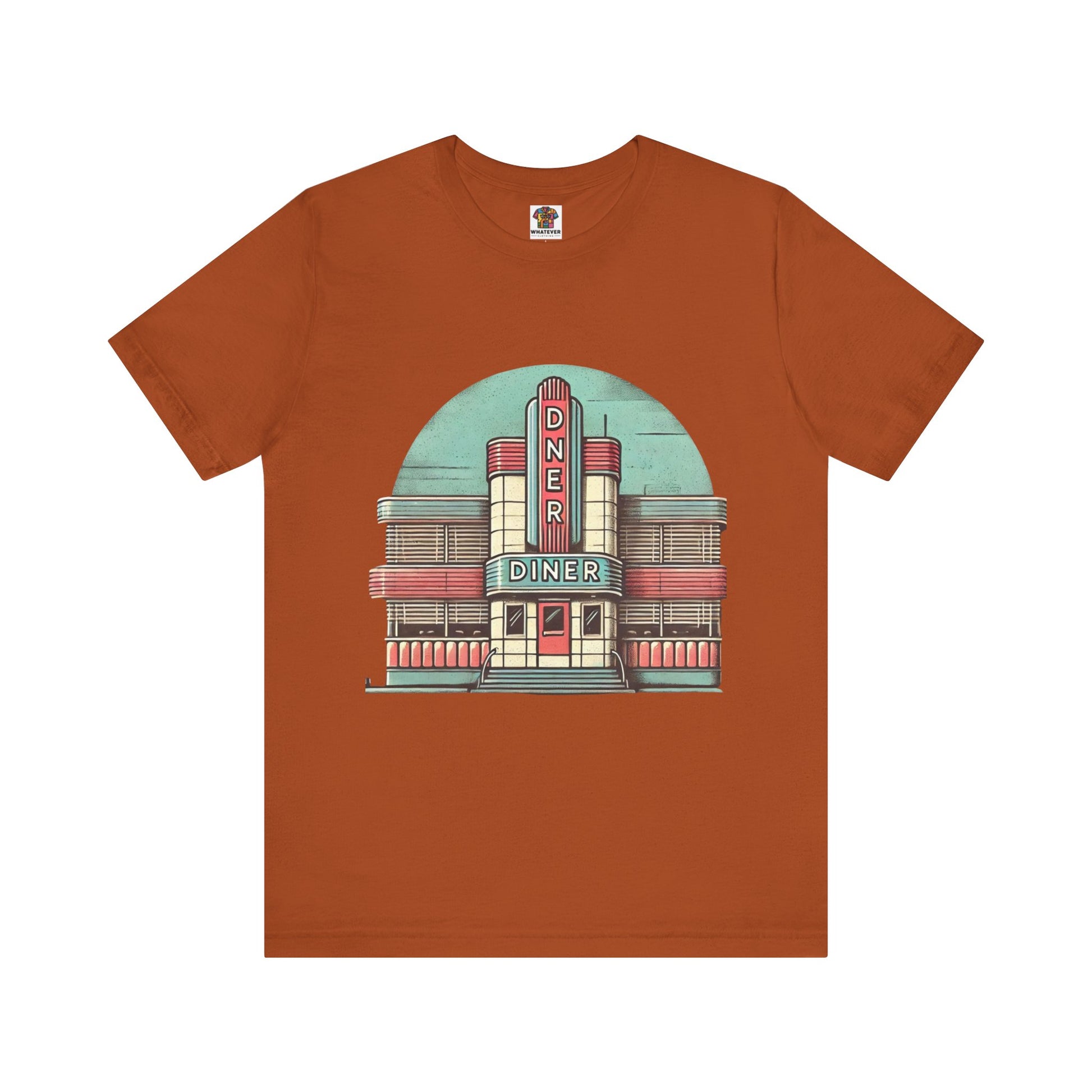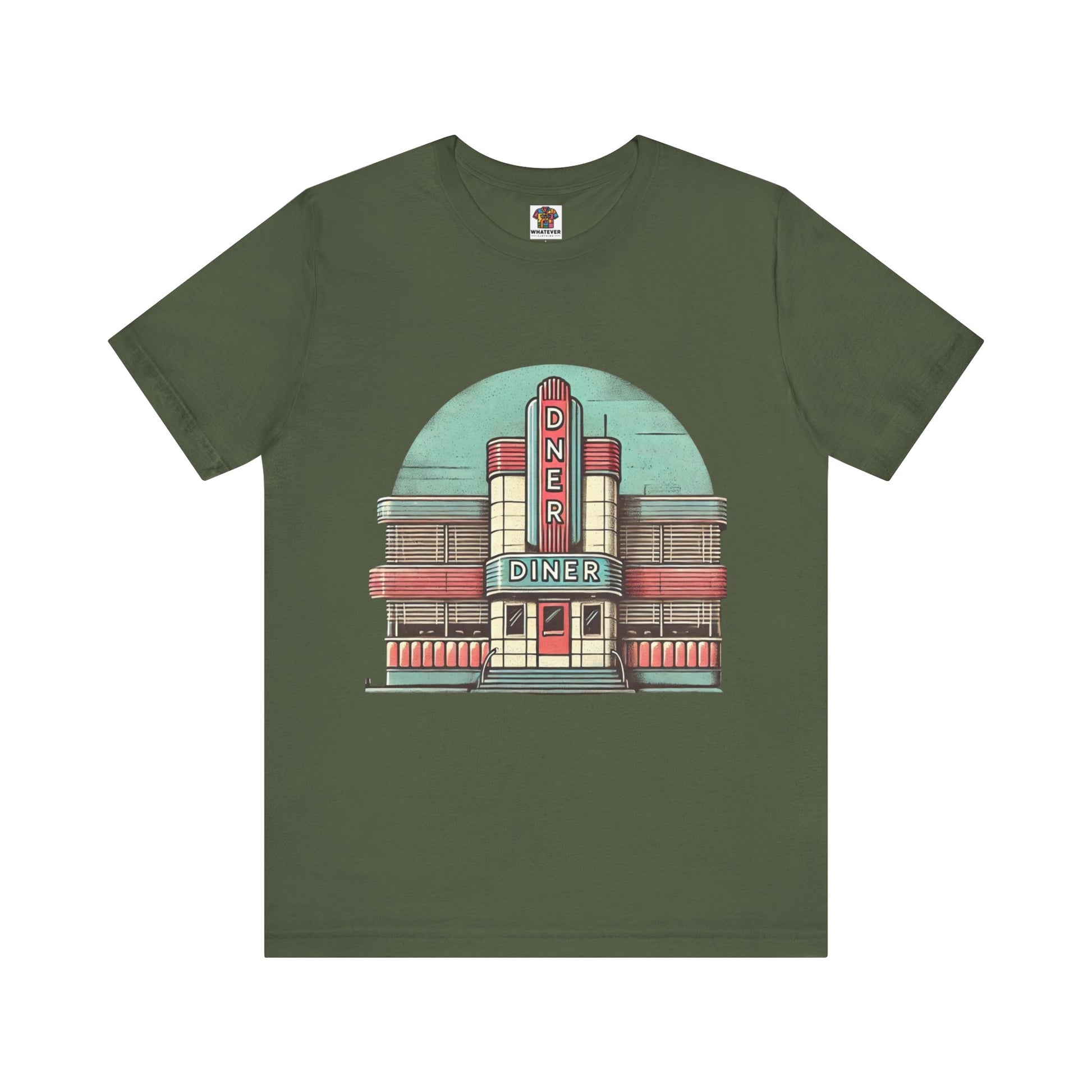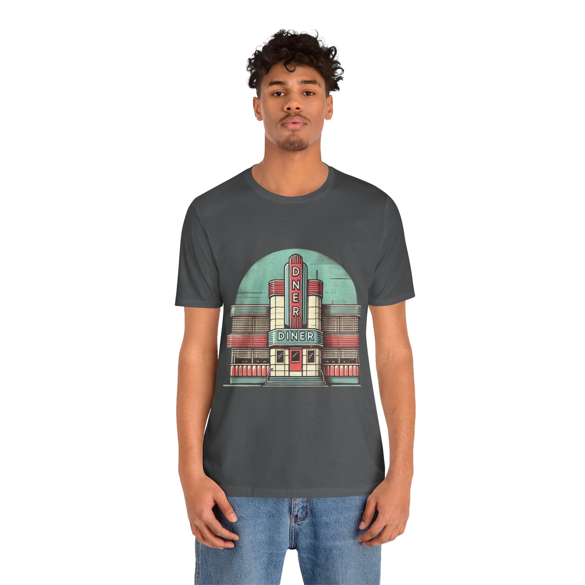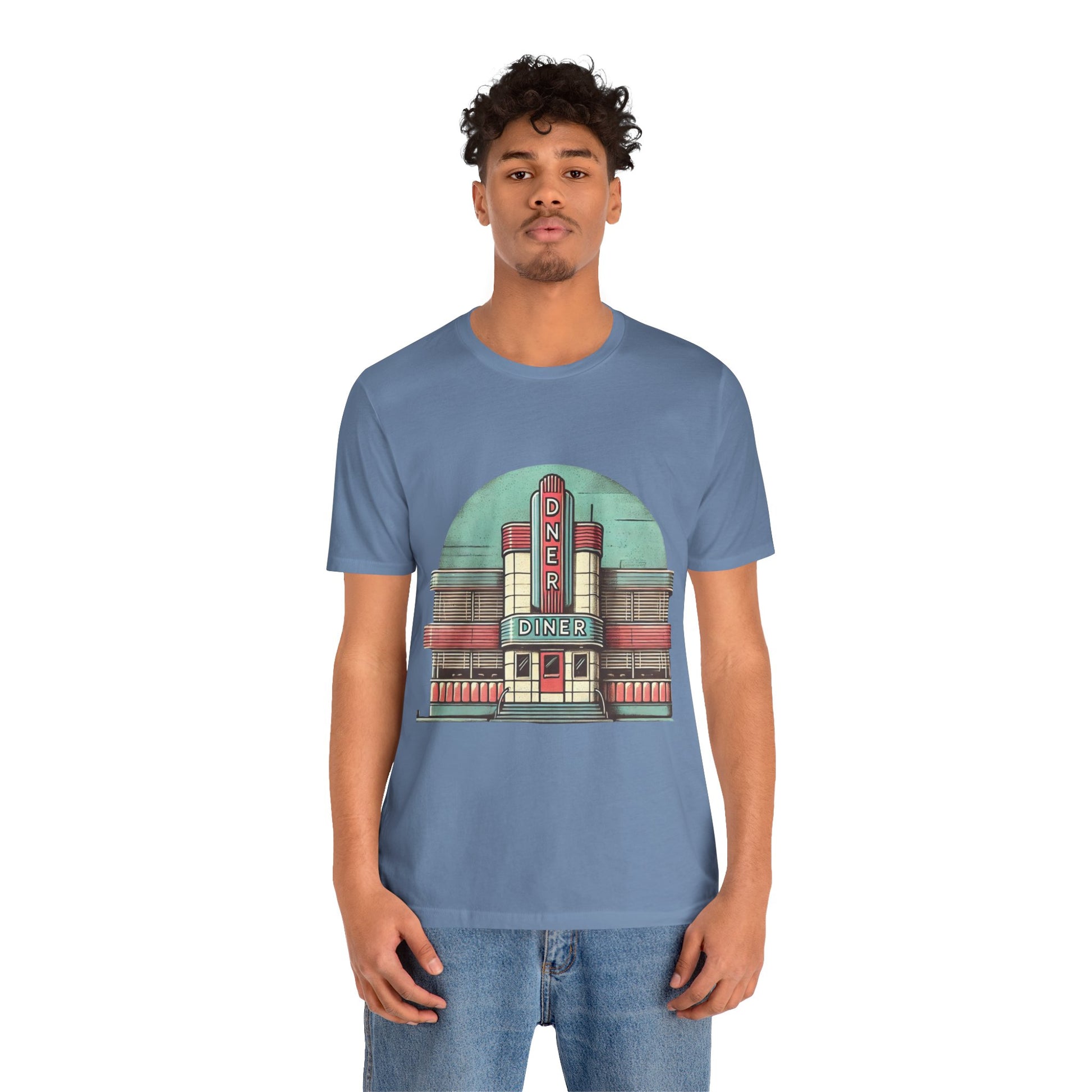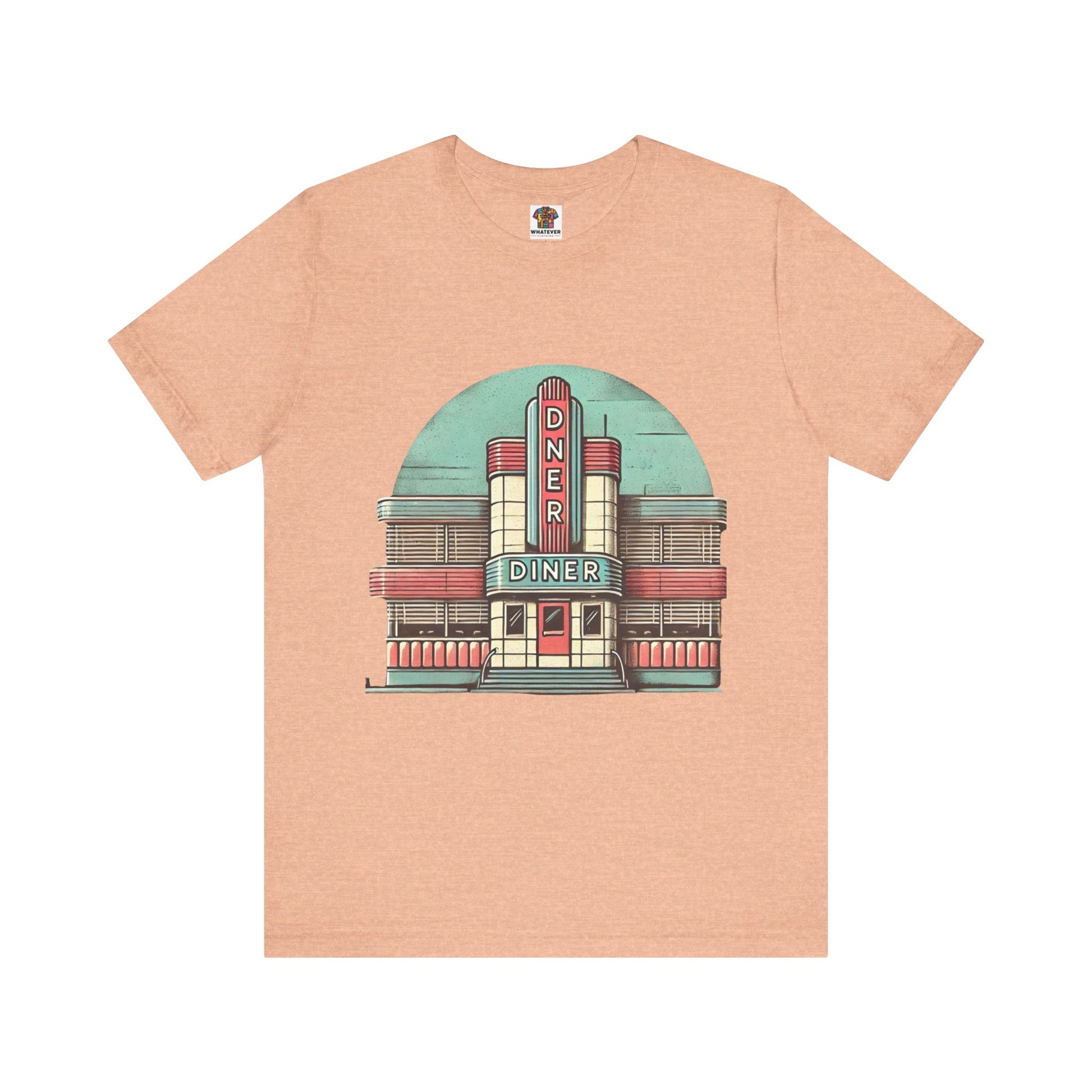 A stylized 1970s diner with bold outlines, colorful facades, and rounded edges, illustrated in pastel hues and a distressed, vintage look.