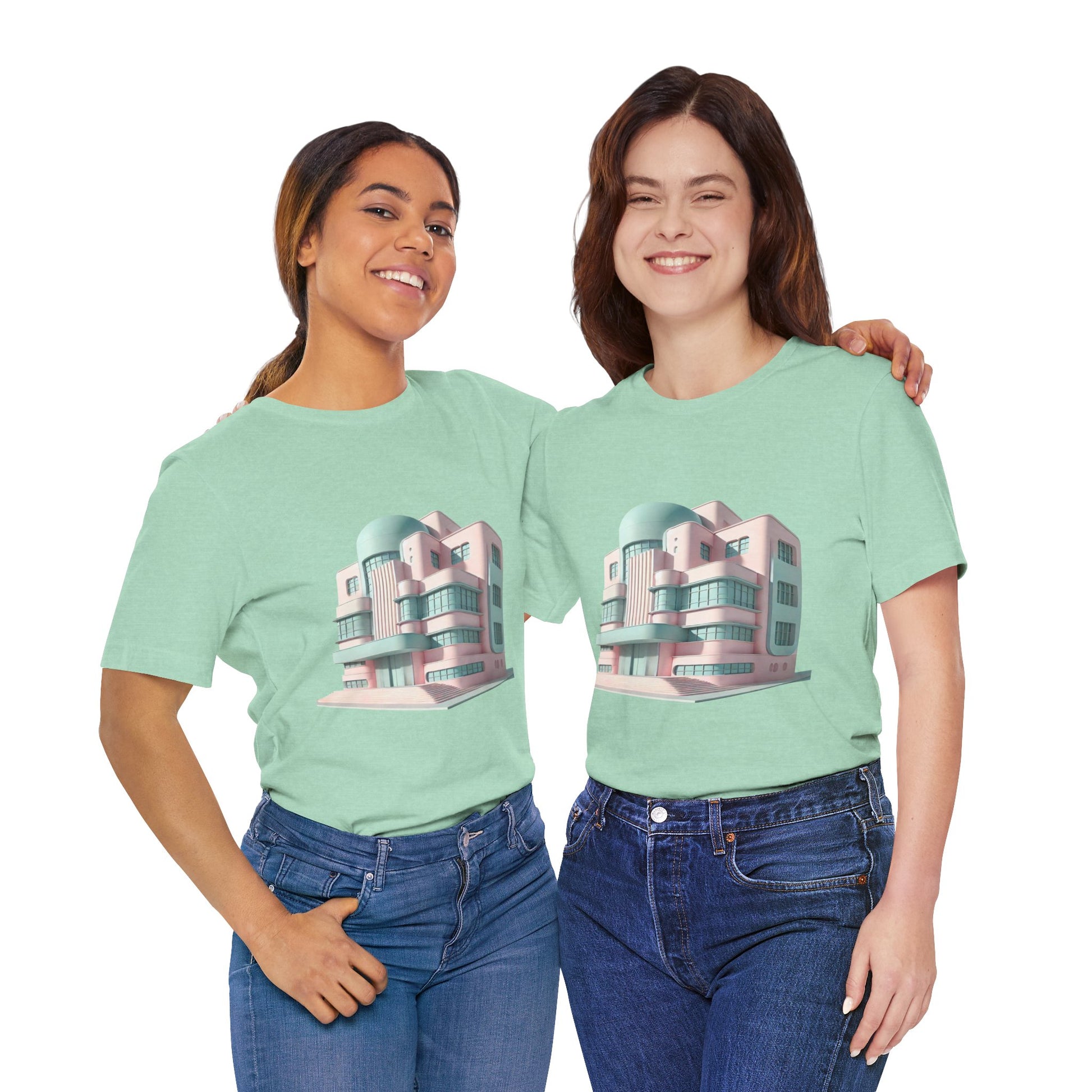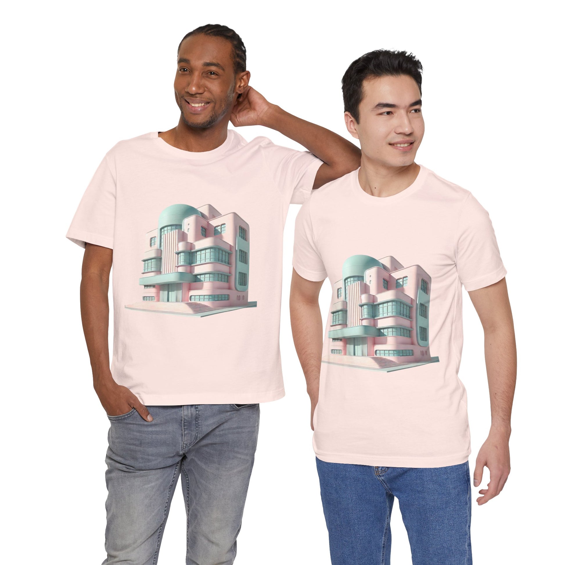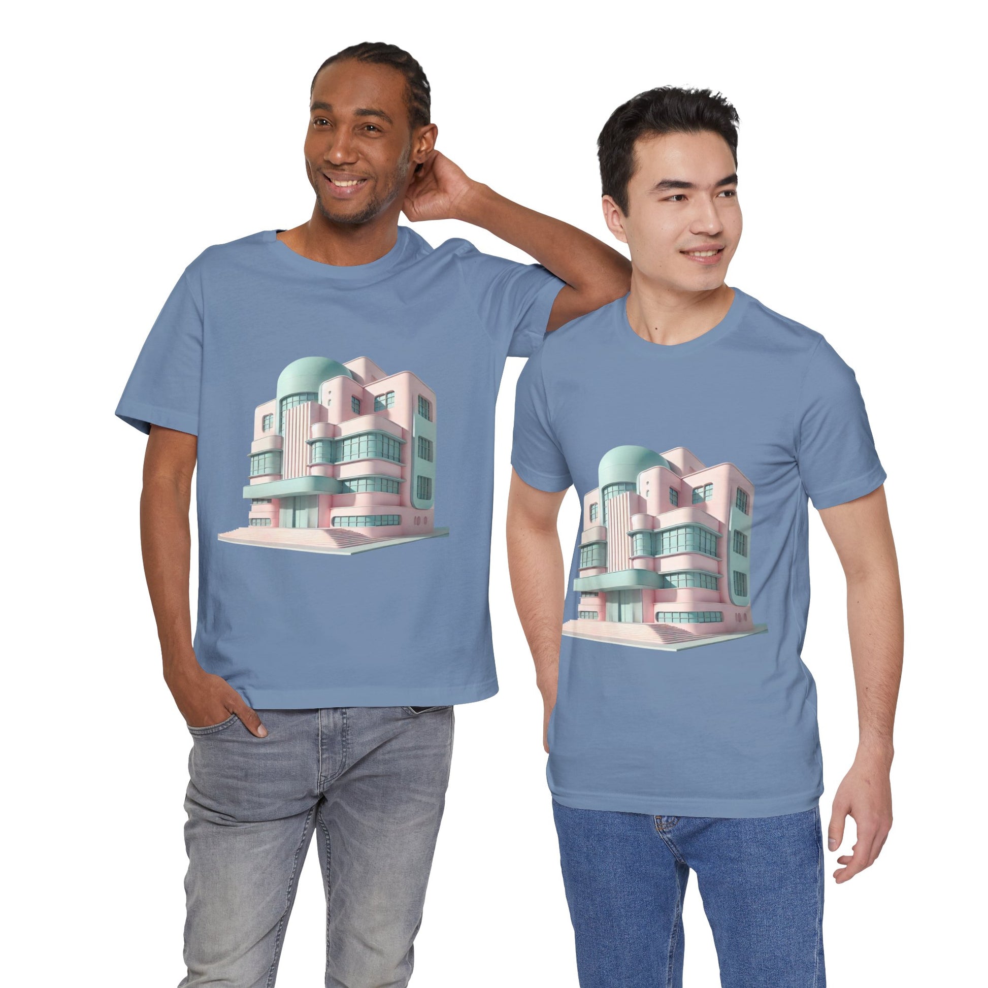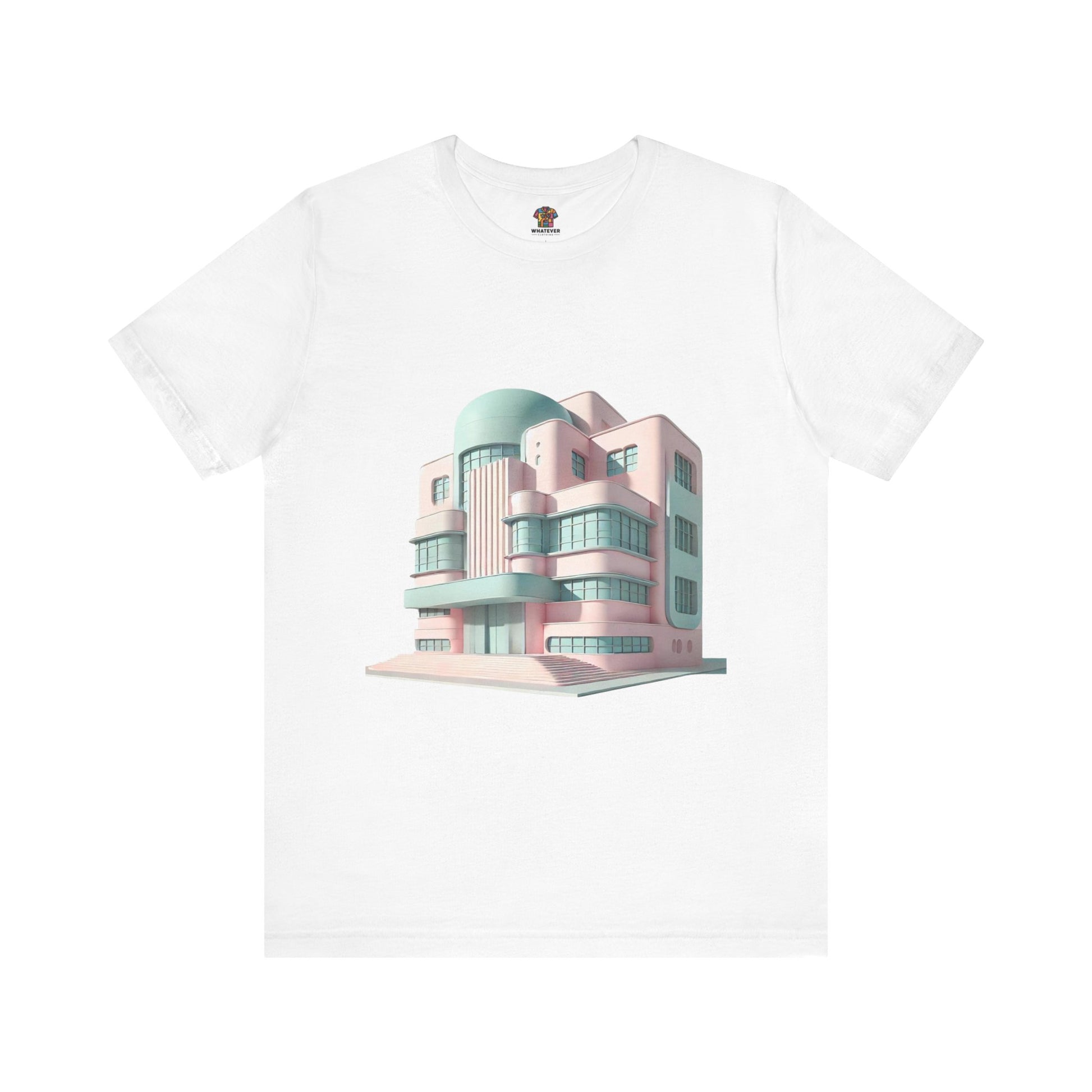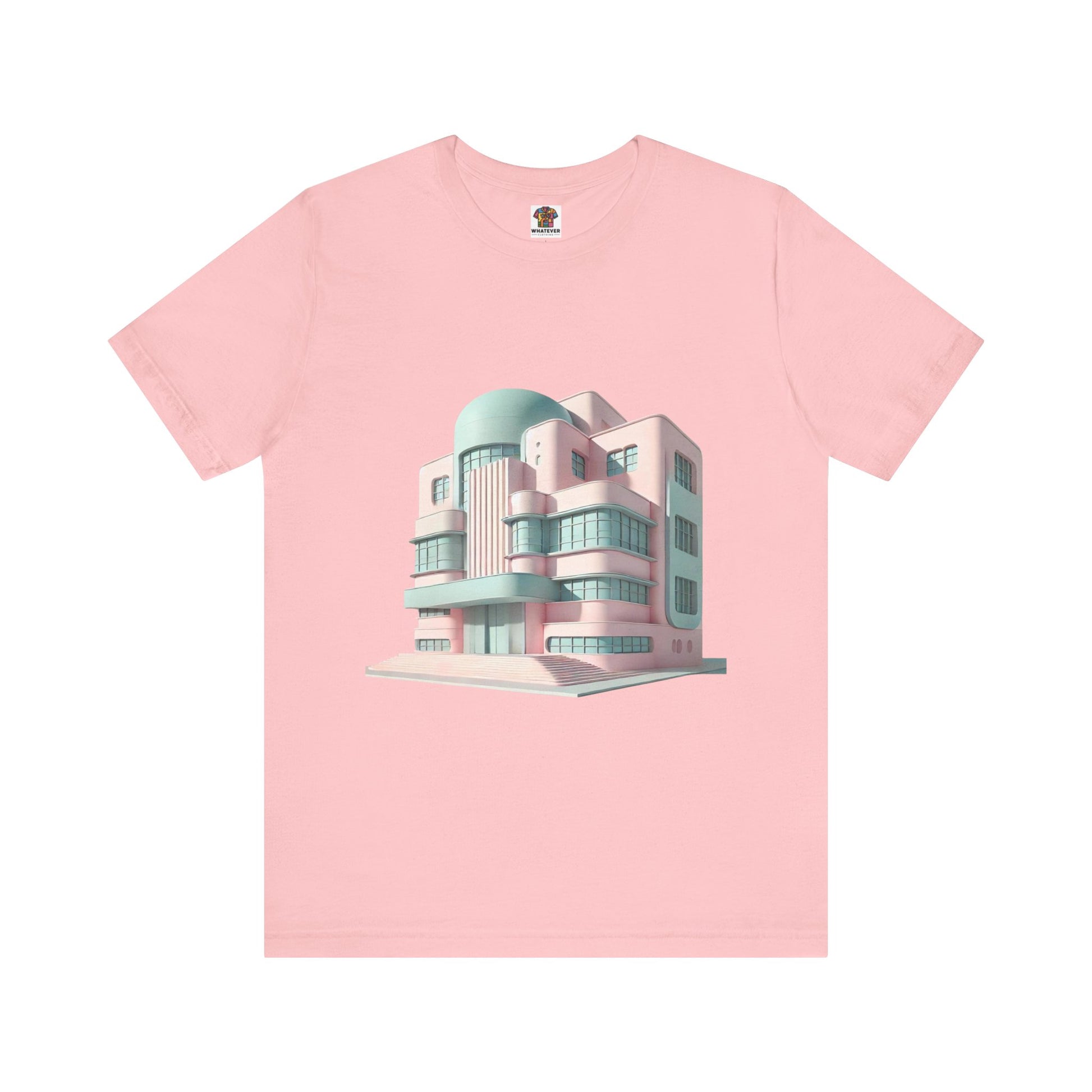 A geometric, futuristic building in soft pastel colors with bold lines and smooth surfaces, evoking a retro-futuristic vibe for art prints.