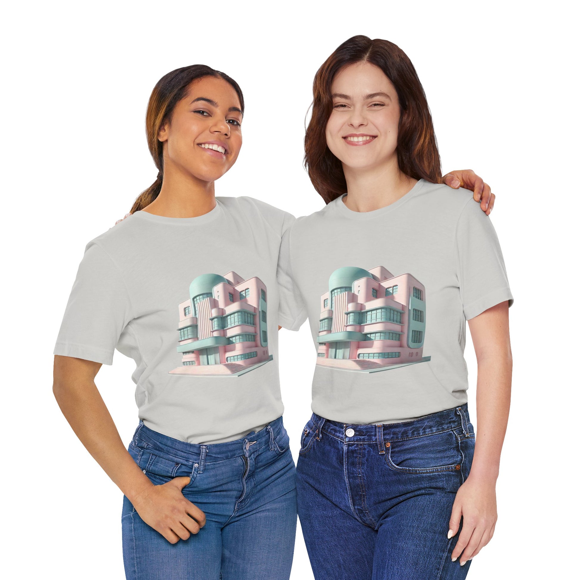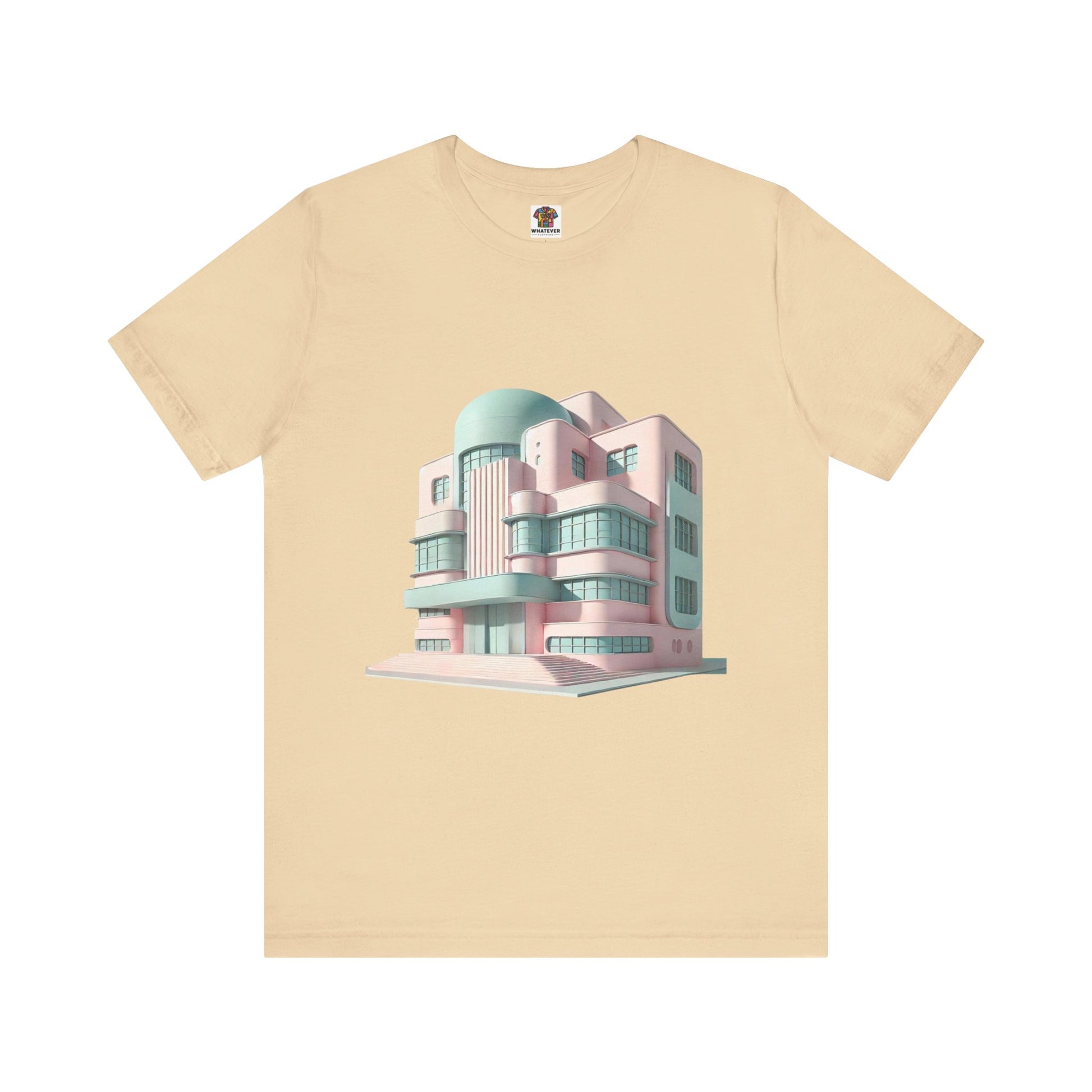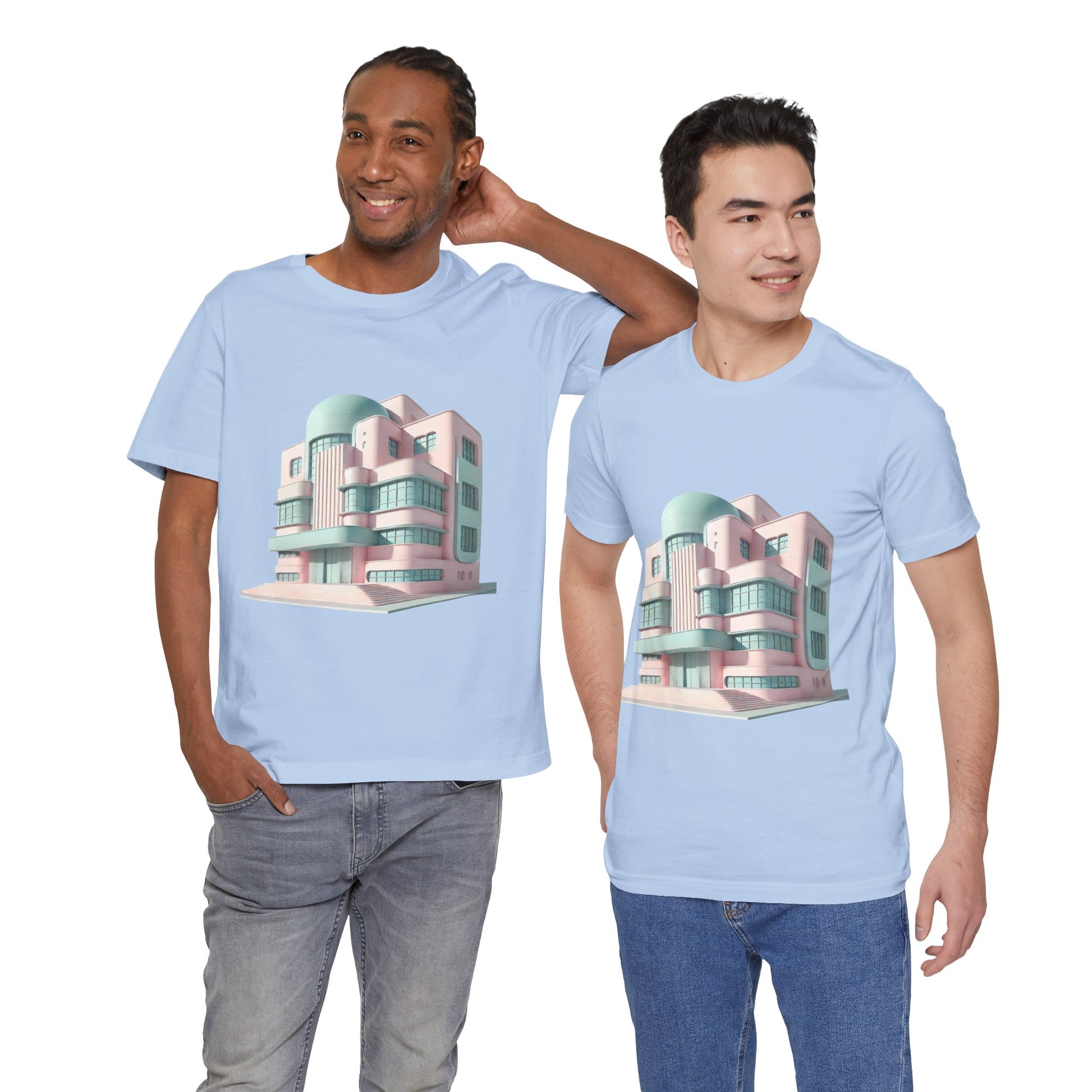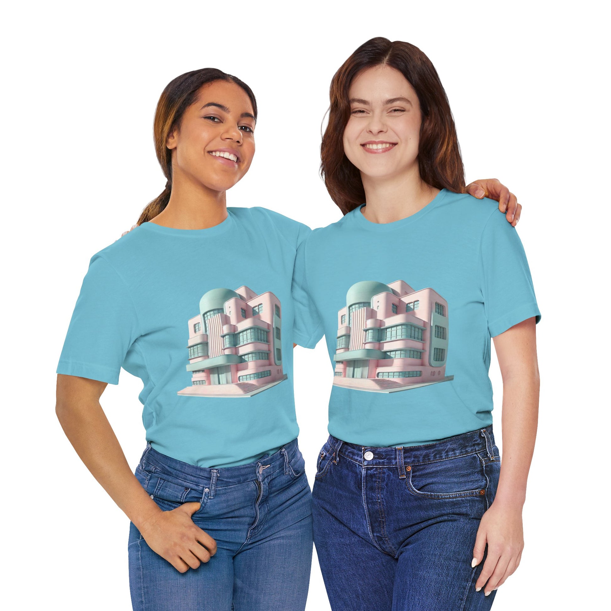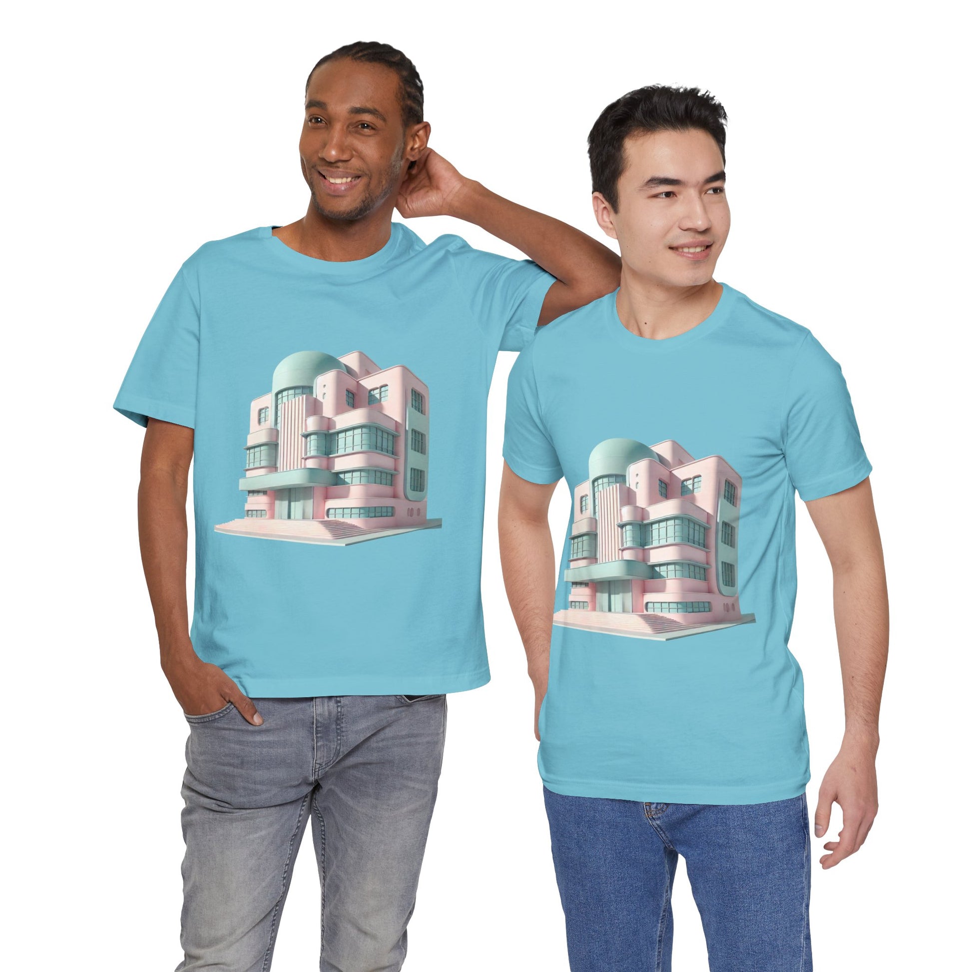 A geometric, futuristic building in soft pastel colors with bold lines and smooth surfaces, evoking a retro-futuristic vibe for art prints.